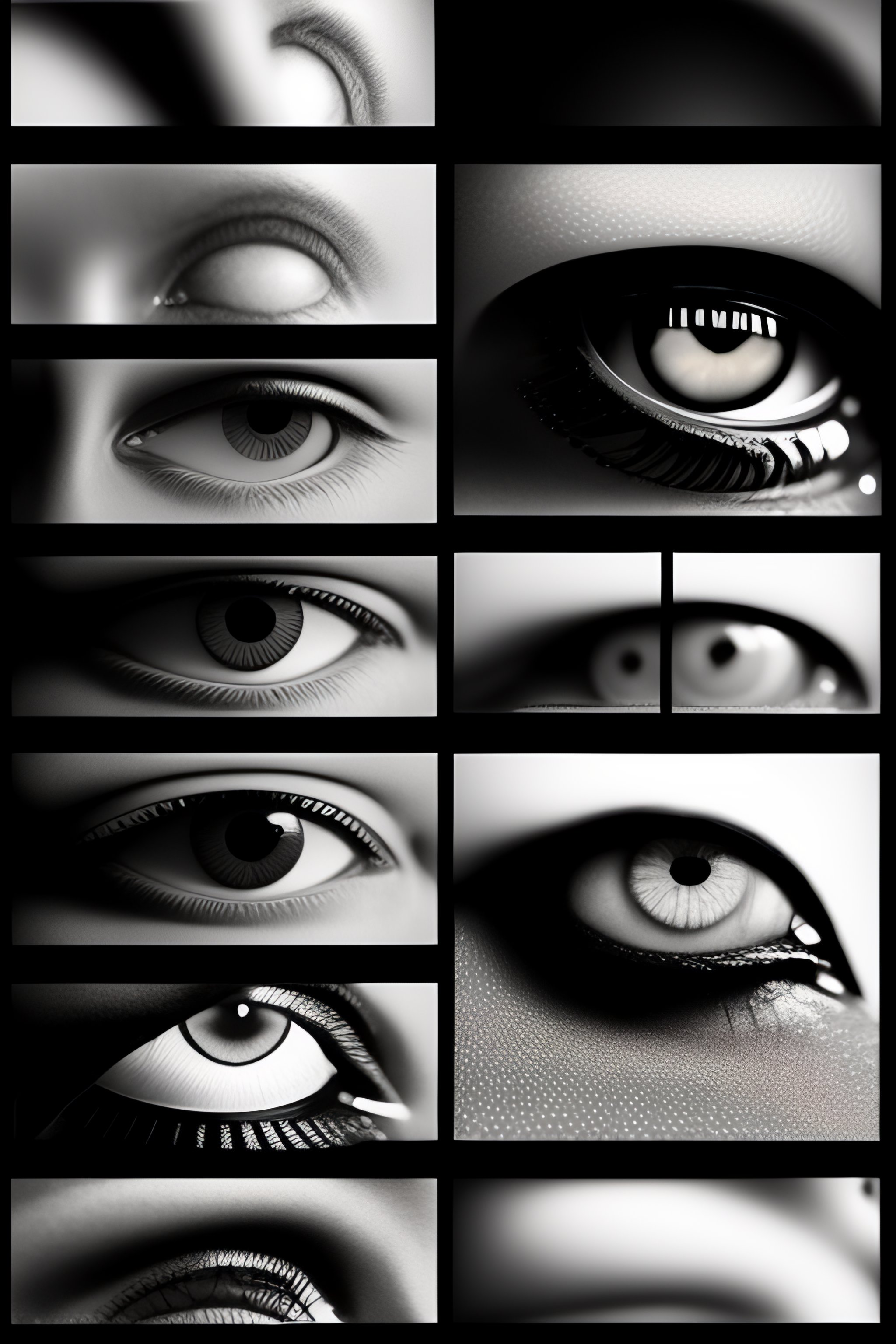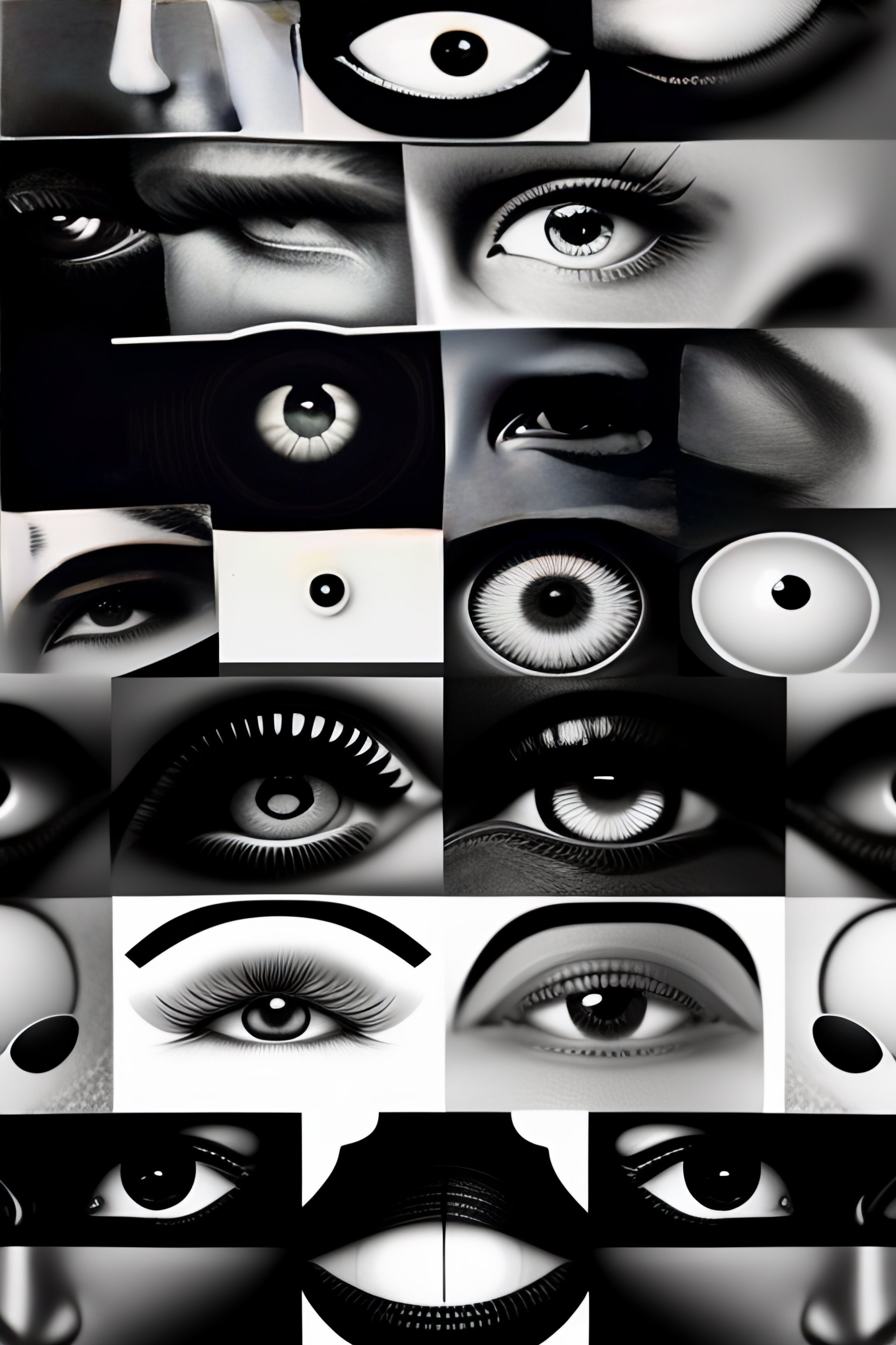 A high quality black-and-white digital collage of 25-40realistic eyes looking in different directions cut out from vintage magazines, repeating pattern, hd