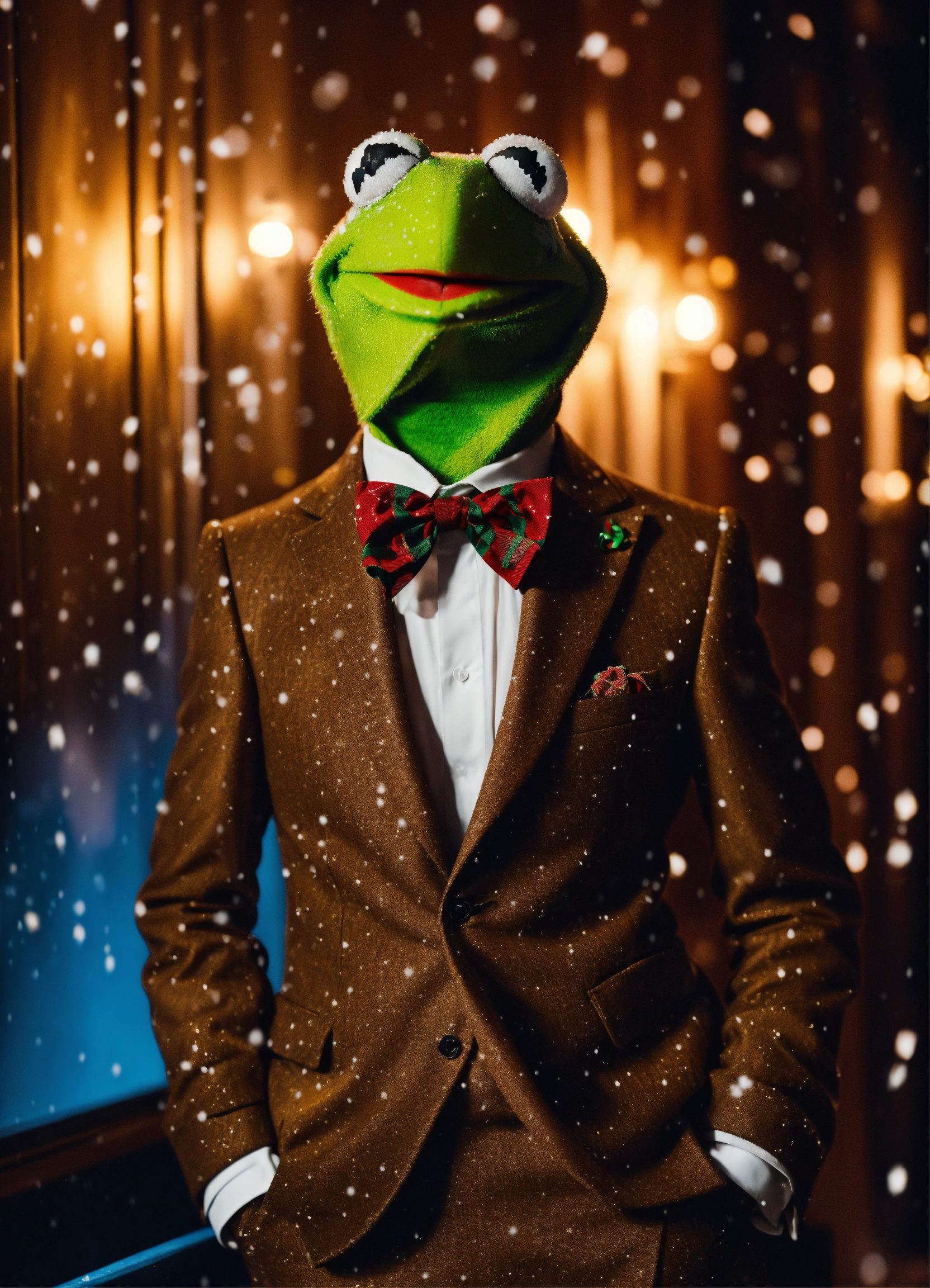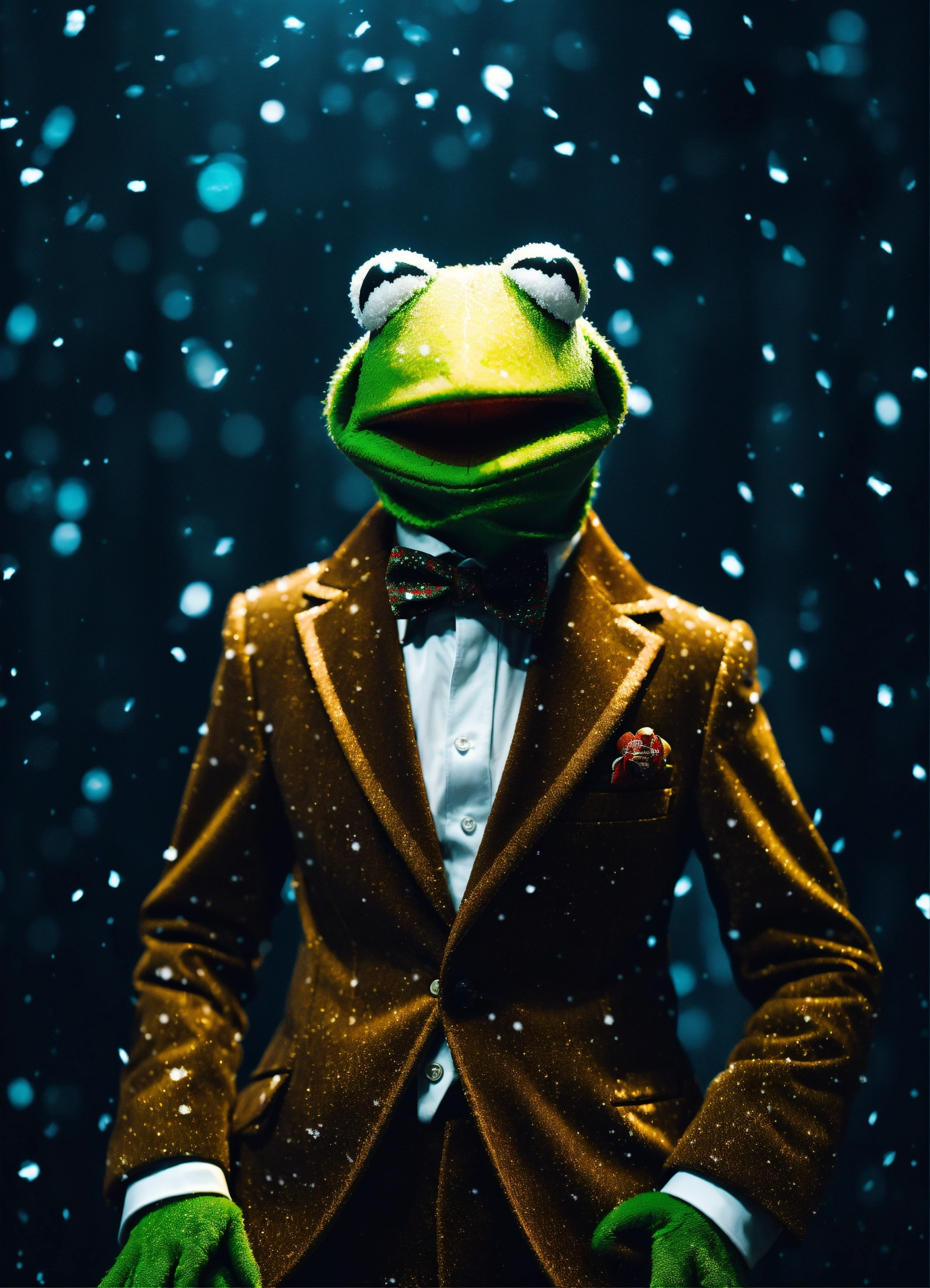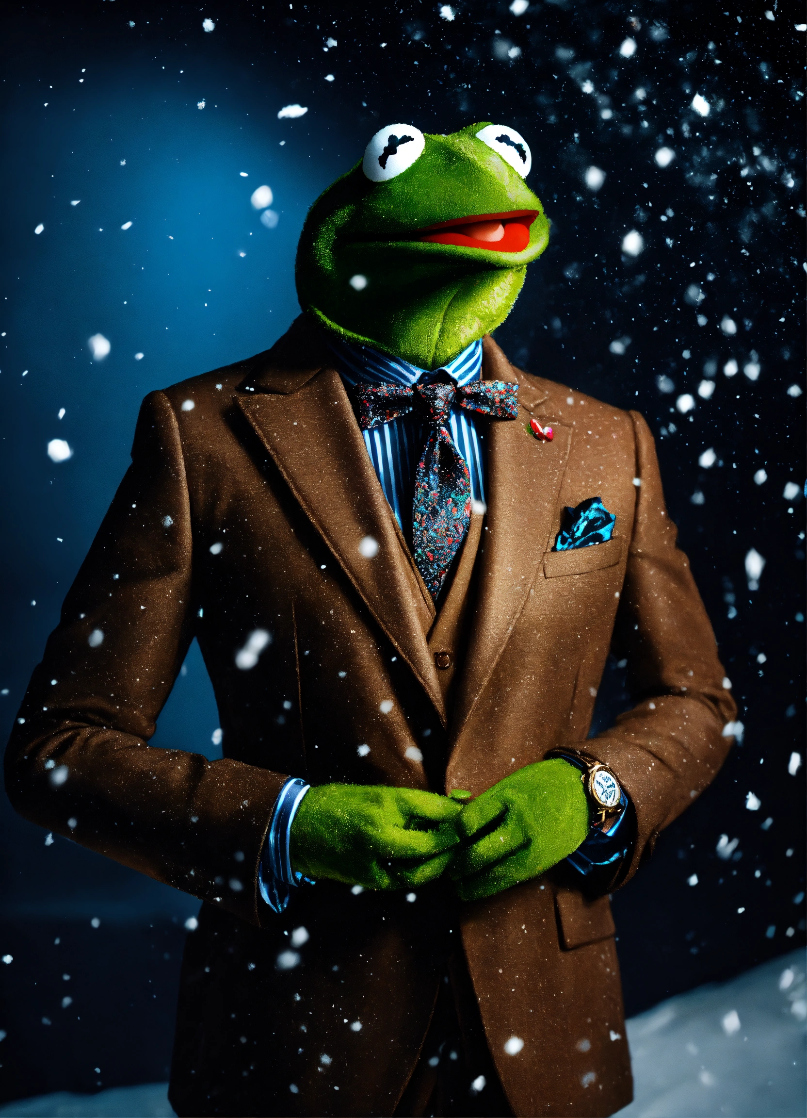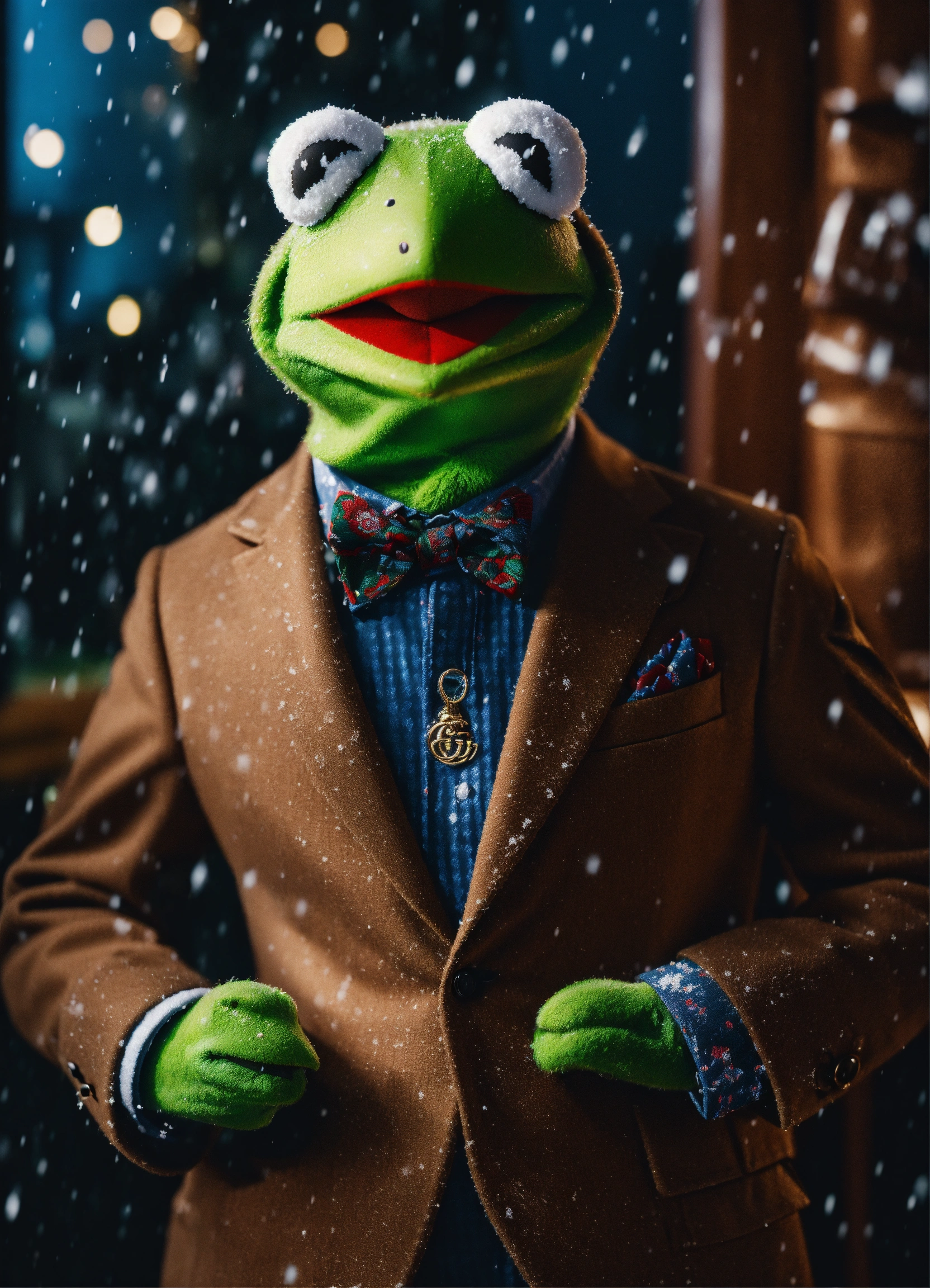 Kermit the frog wearing a brown gucci suit, gucci promo photo, 8k photo, snowing outside, dark hues, 8k photography, studio lighting, promo