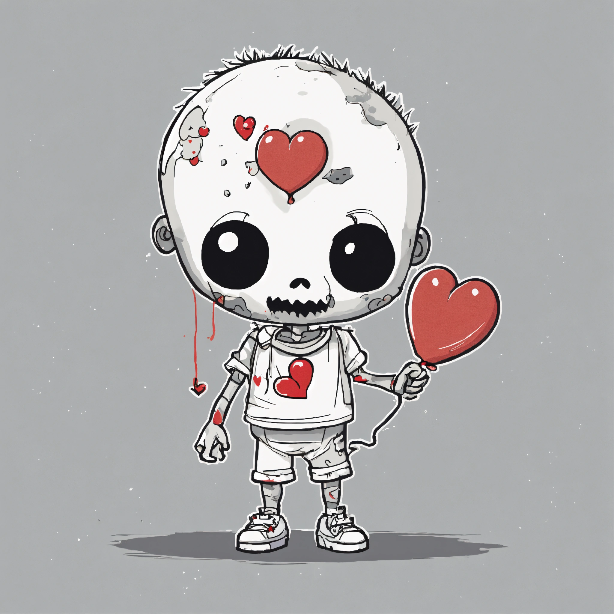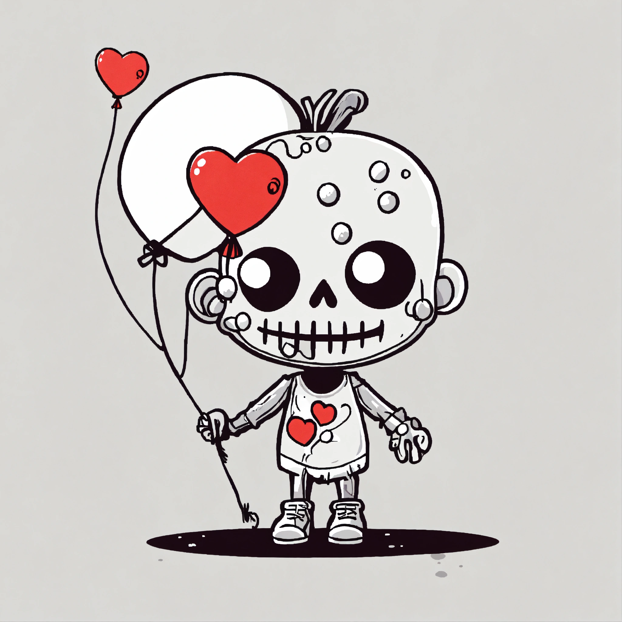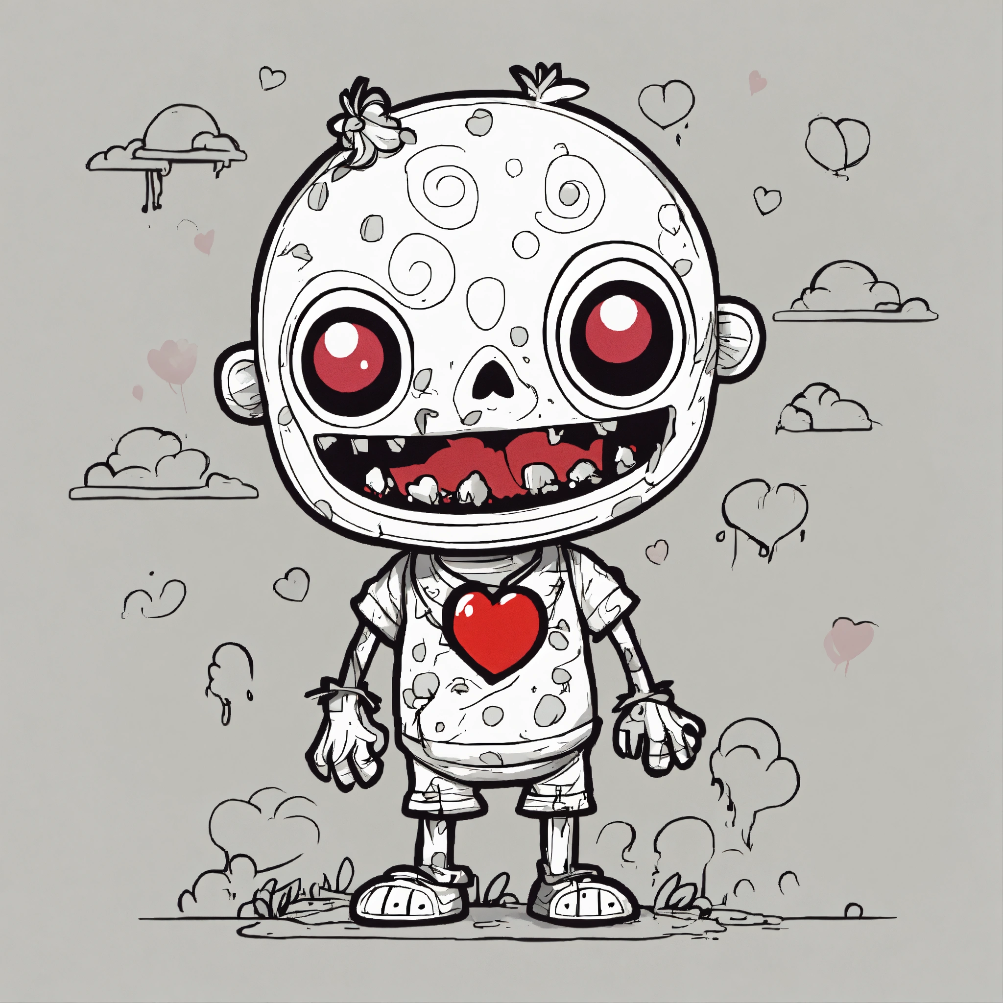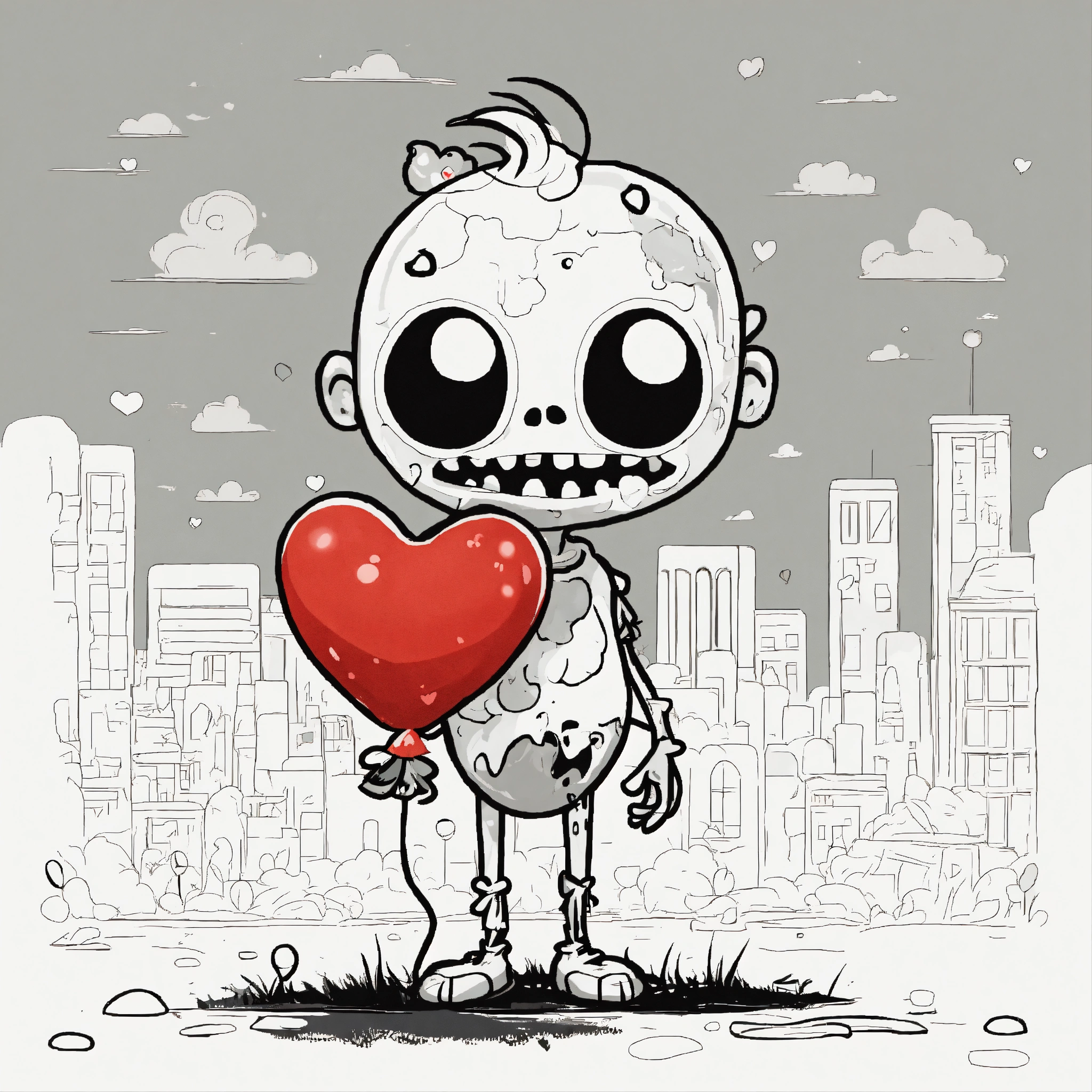 Cute zombie friend zombie with a heart-shaped balloon. for a toddler's, pixar style, simple outline and shapes, black and white coloring book, flat vector, white background, clean line art, studio ghibli studio
