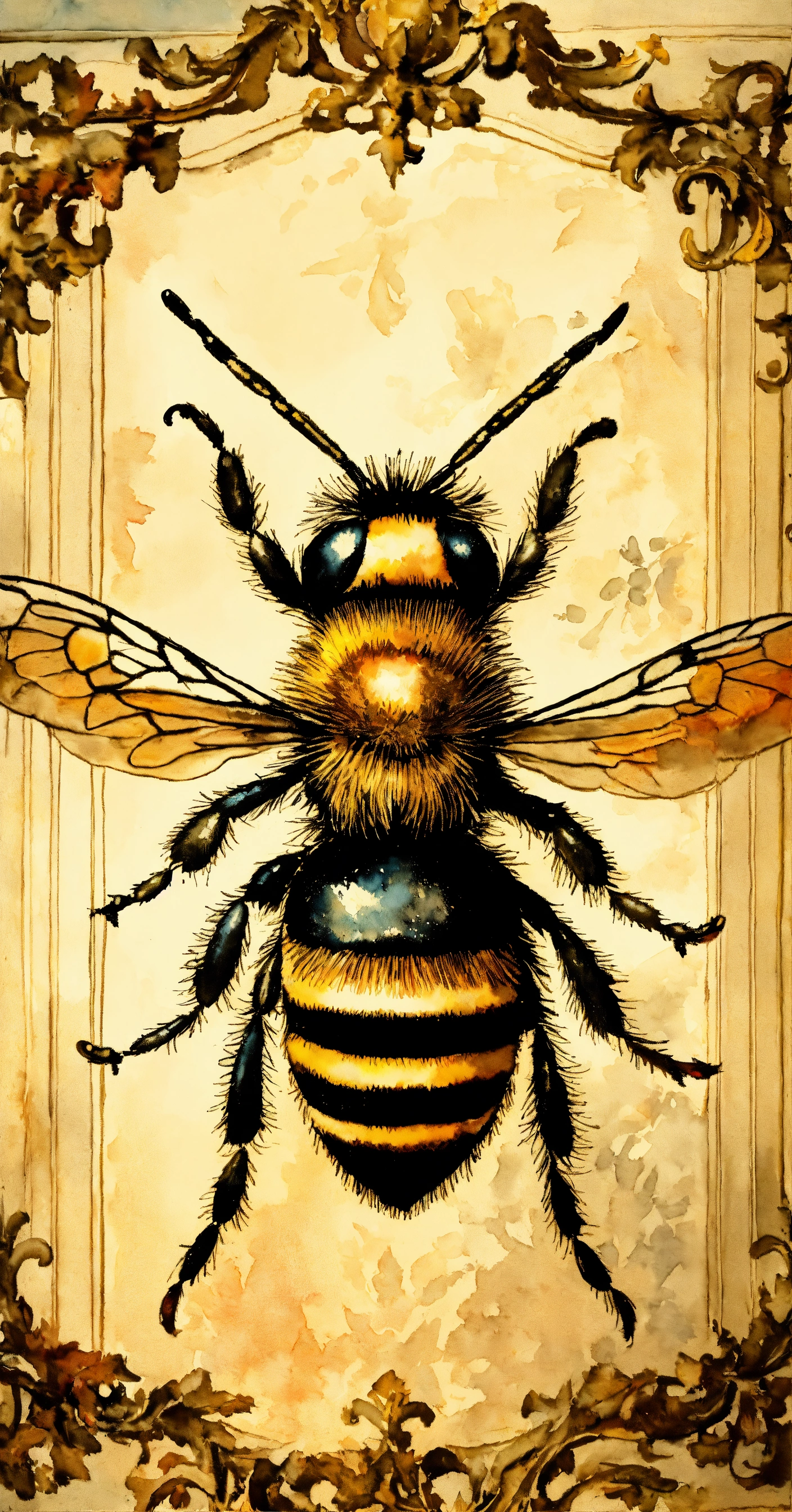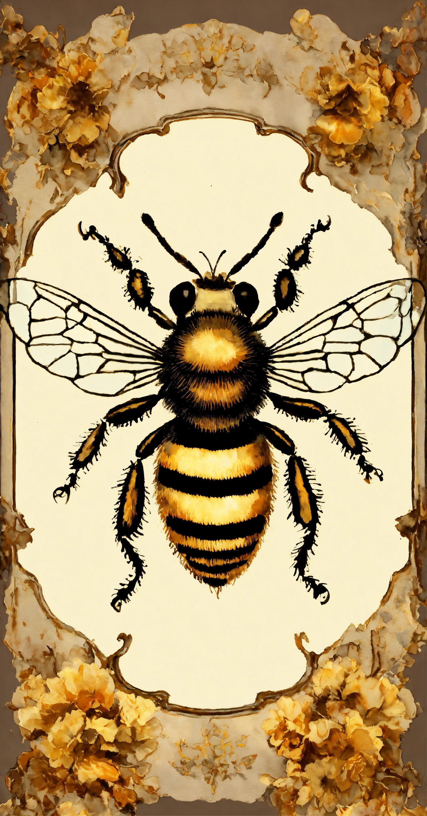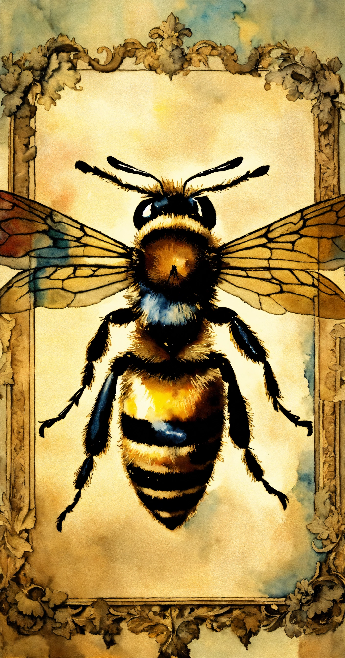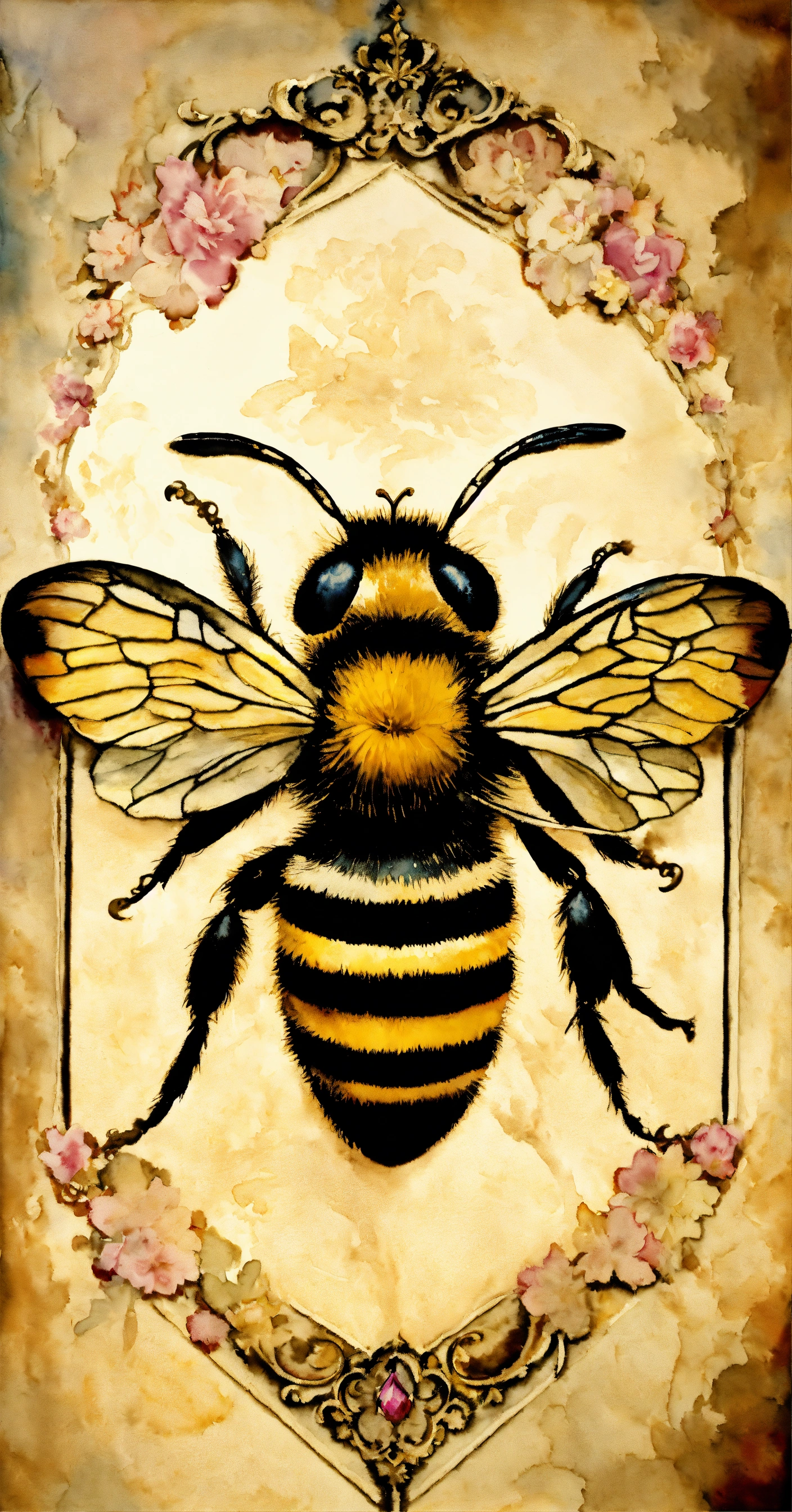 Watercolor, highly detailed, an image of a bee with a crown above it, on a faint damask background, rococo frame, aged and worn, in the style of edouard bisson