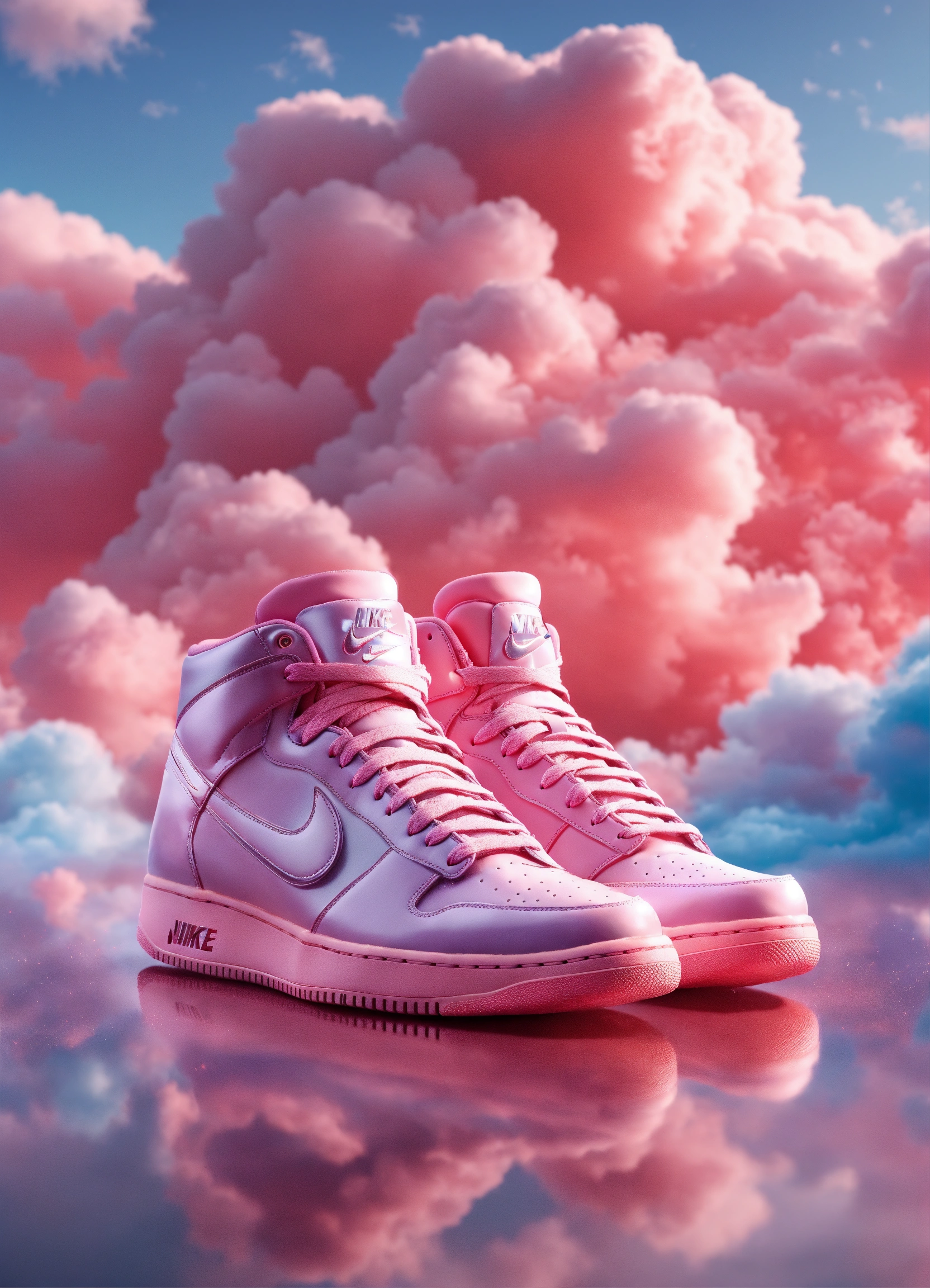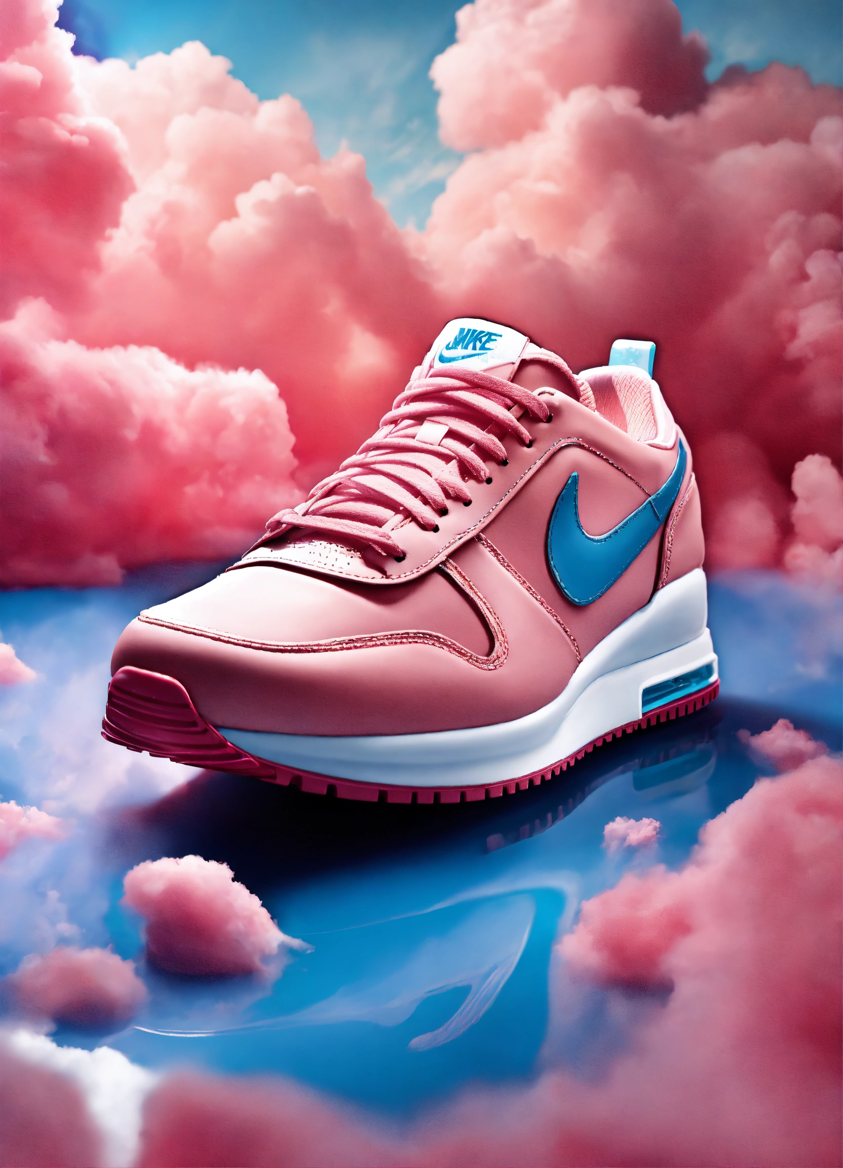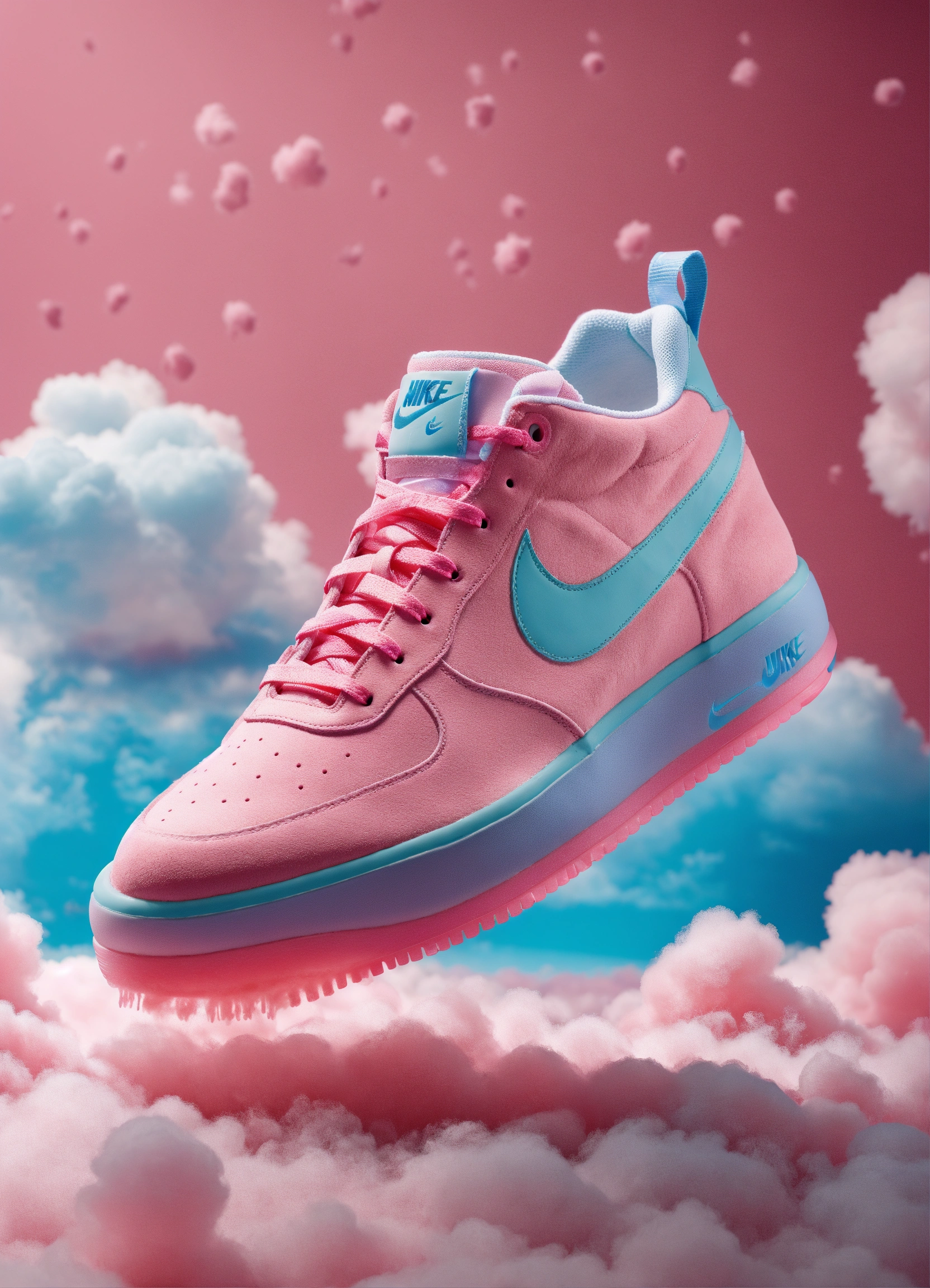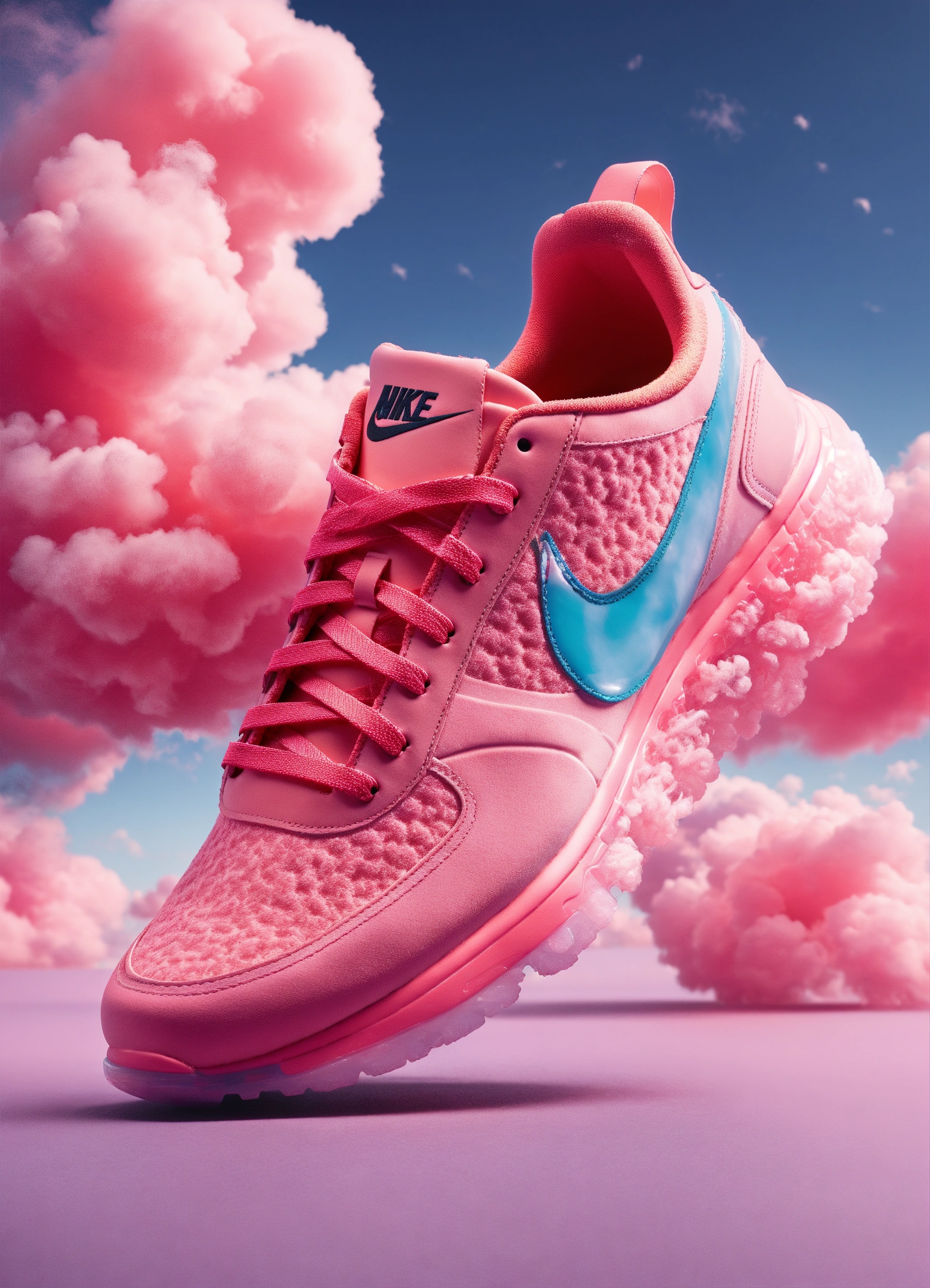 Nike sneaker concept, made out of cotton candy clouds, luxury, futurist, stunning unreal engine render, product photography, 8k, hyper-realistic. surrealism