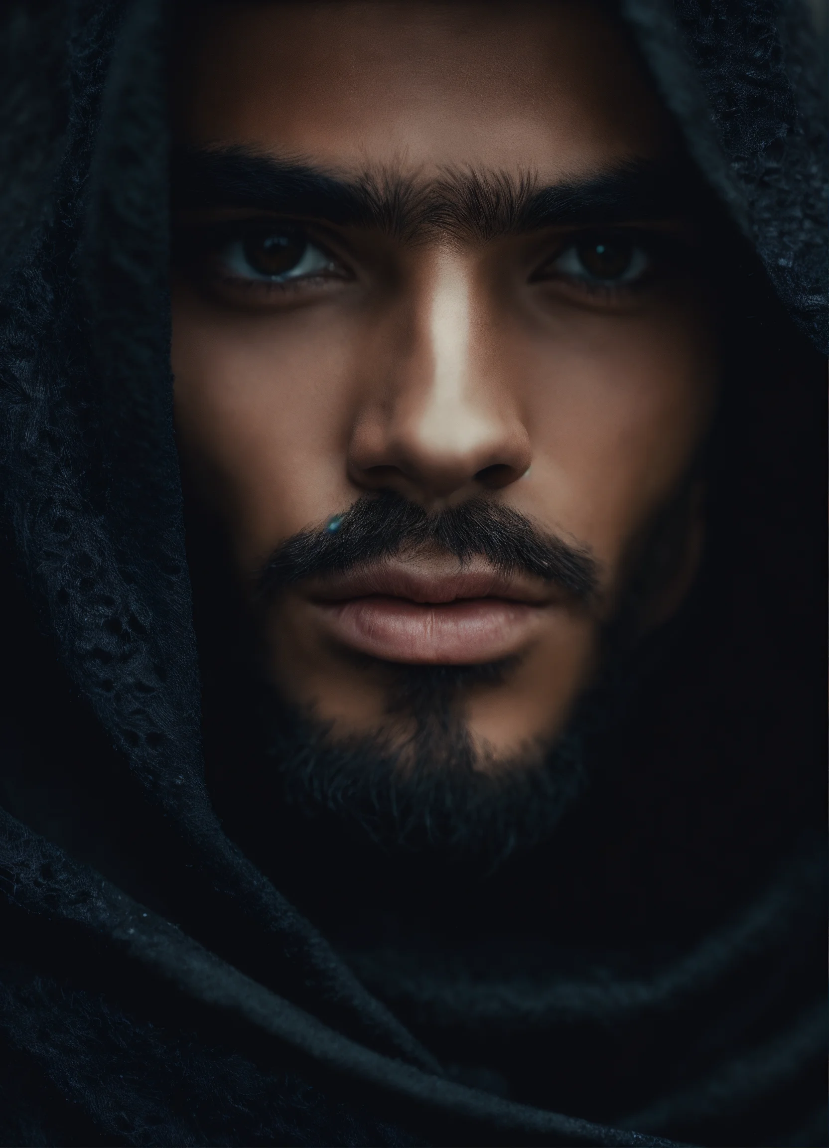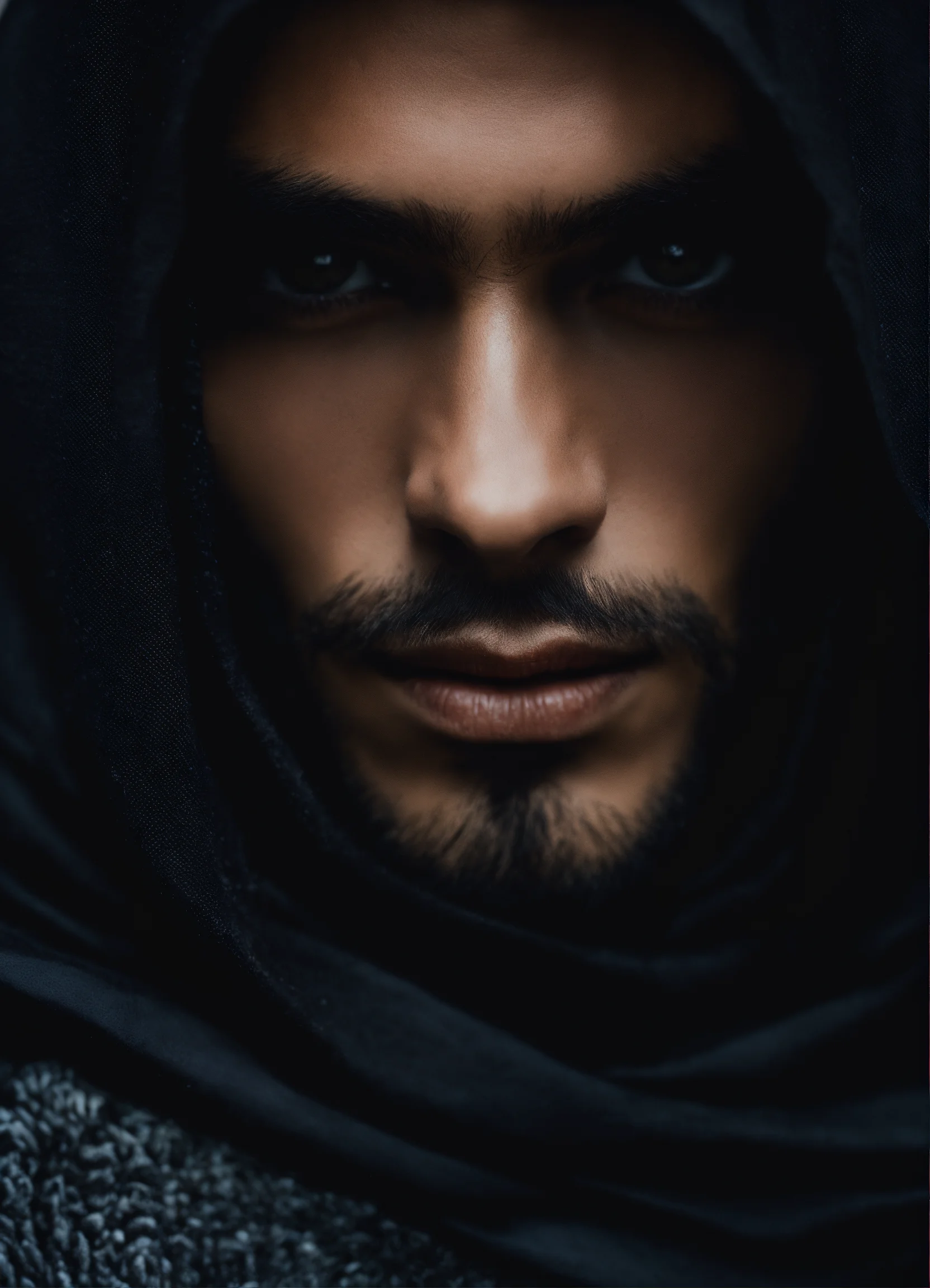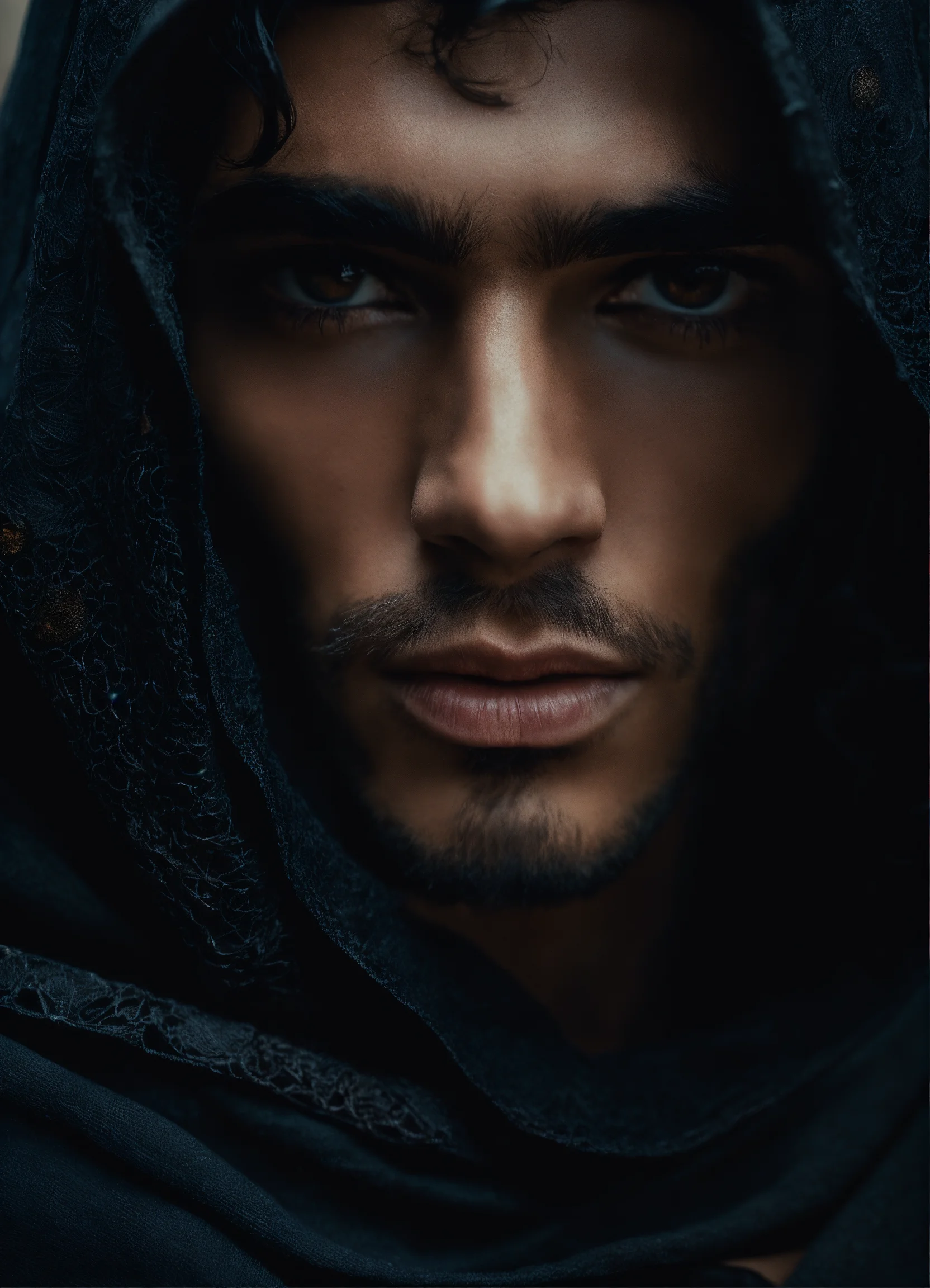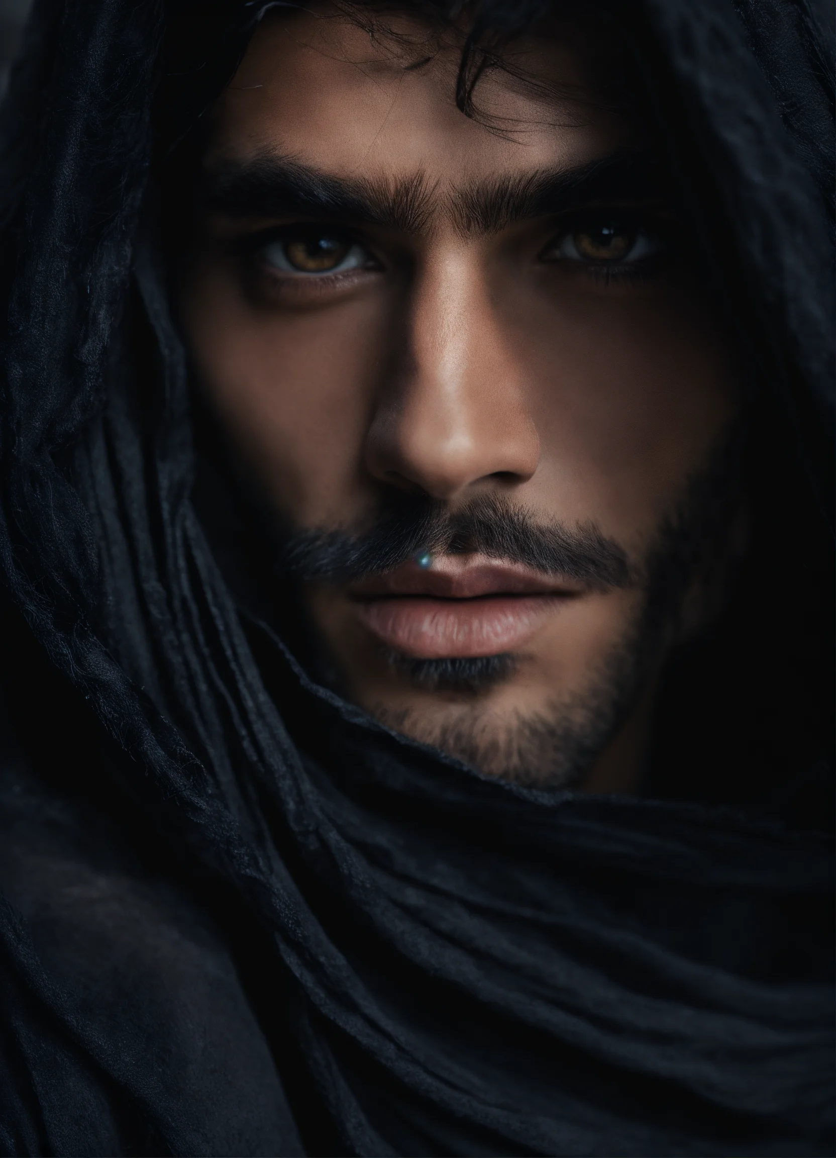 Close-up fantasy-inspired portrait of haute couture hauntingly handsome 19 year old persian male fashion model looking directly into camera, warm brown eyes, roguish black hair, wearing black assassin robes and billowing black cape, background is desert at night, ethereal dreamy foggy, photoshoot by alessio albi, editorial fashion magazine photoshoot, fashion poses, . kinfolk magazine. film grain.