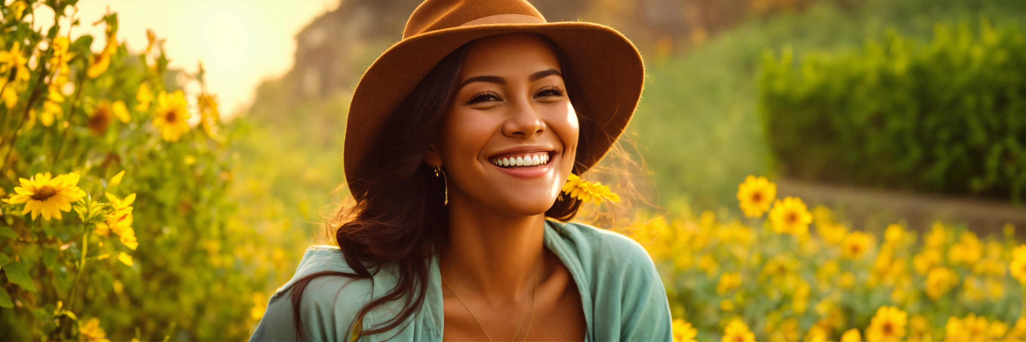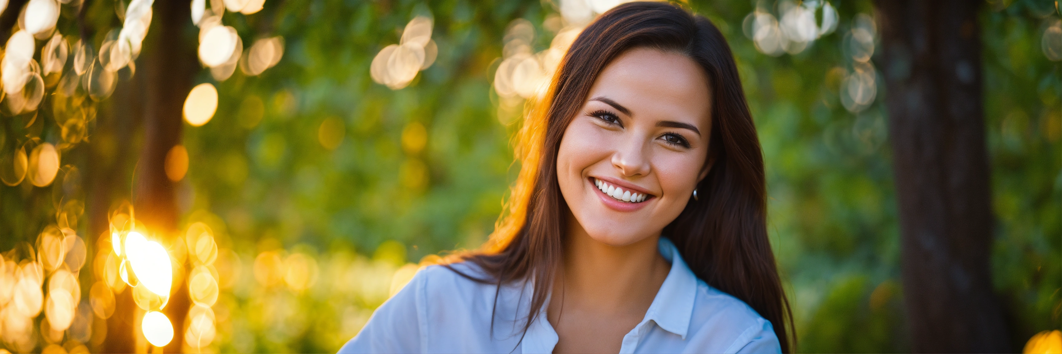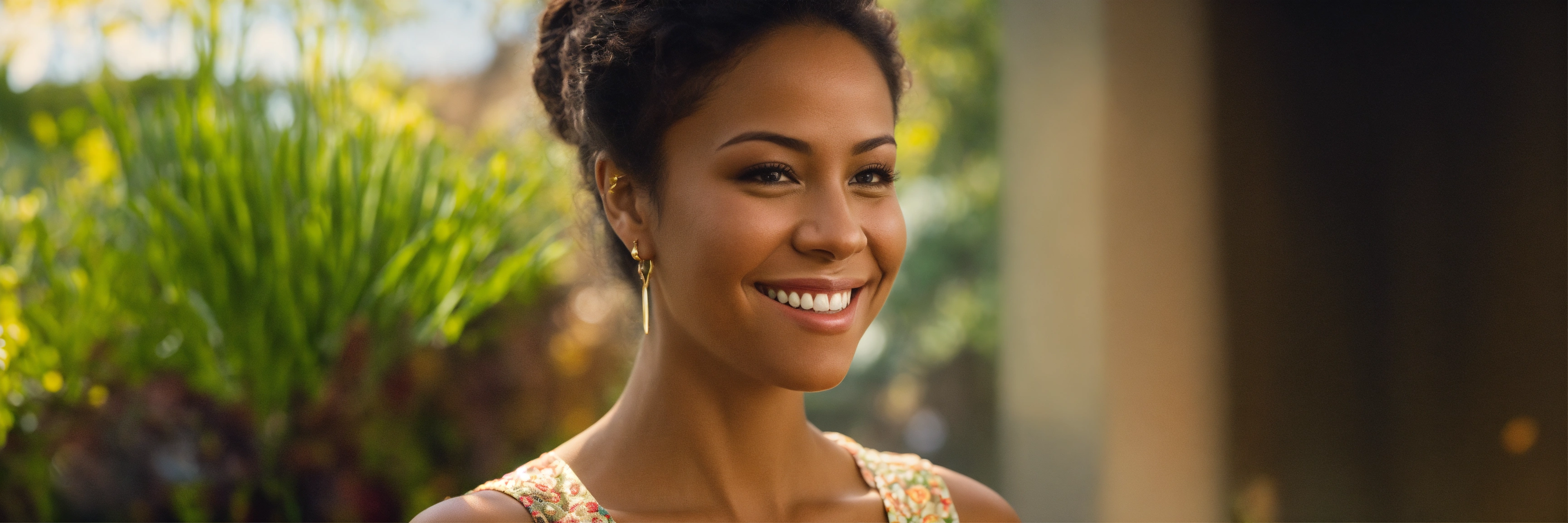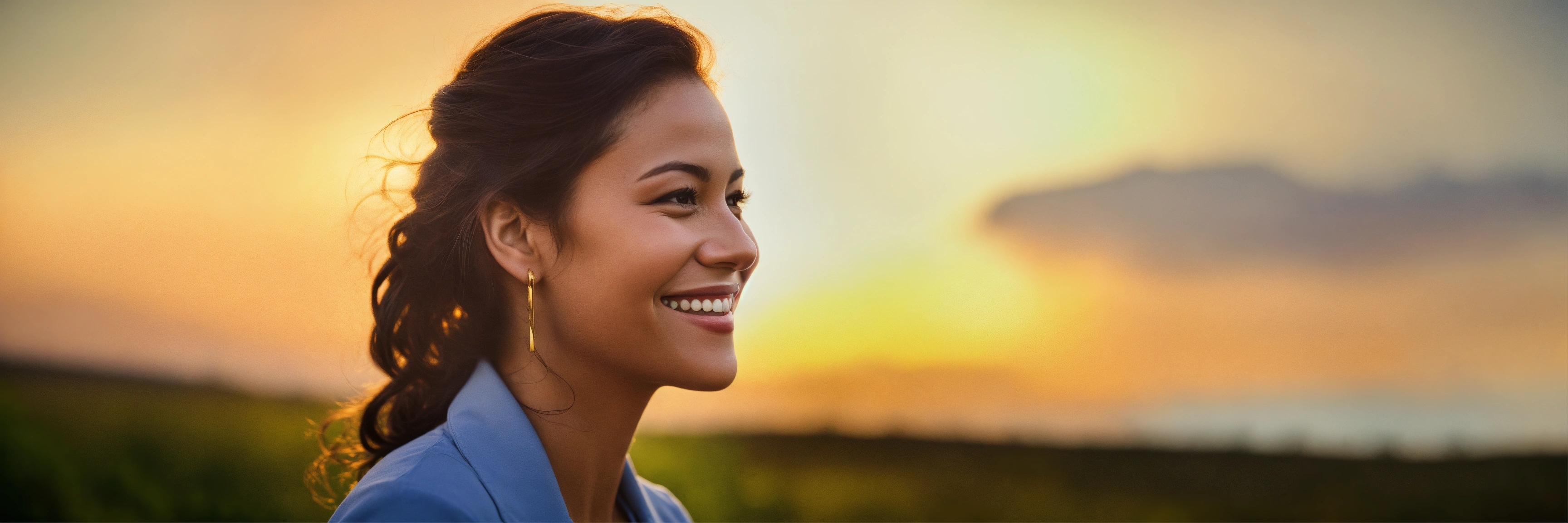 Image prompt of a woman with a radiant smile, discusses conflict resolution strategies that promote growth and strengthen the relationship rather than cause harm