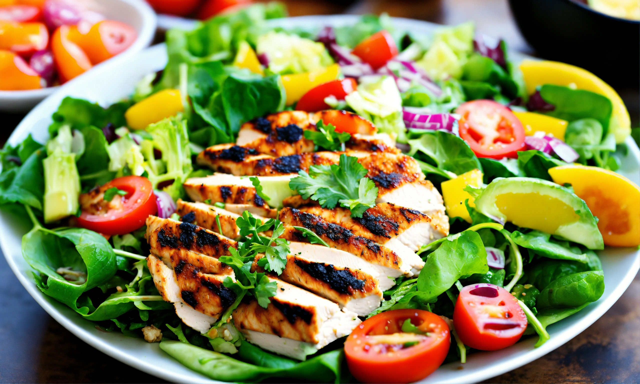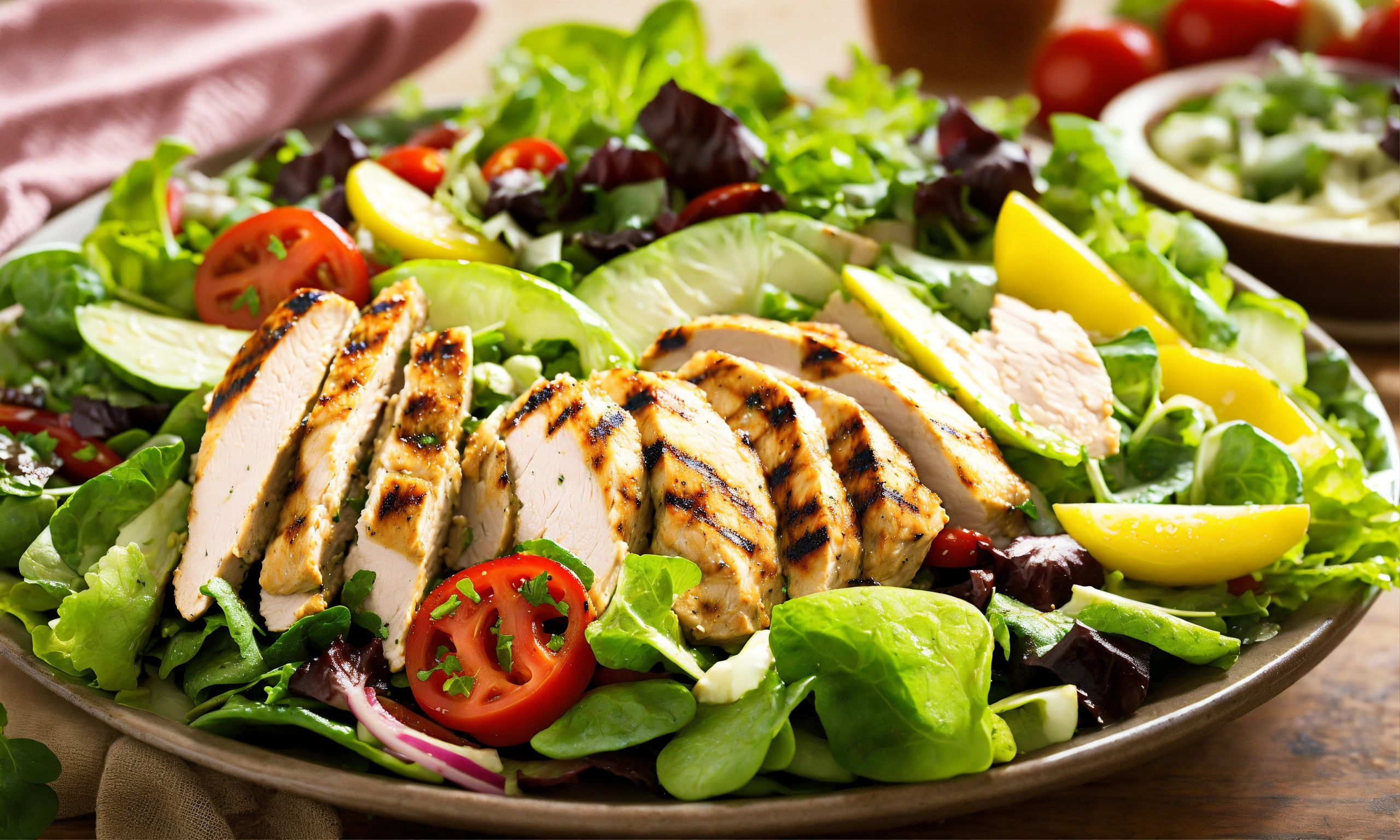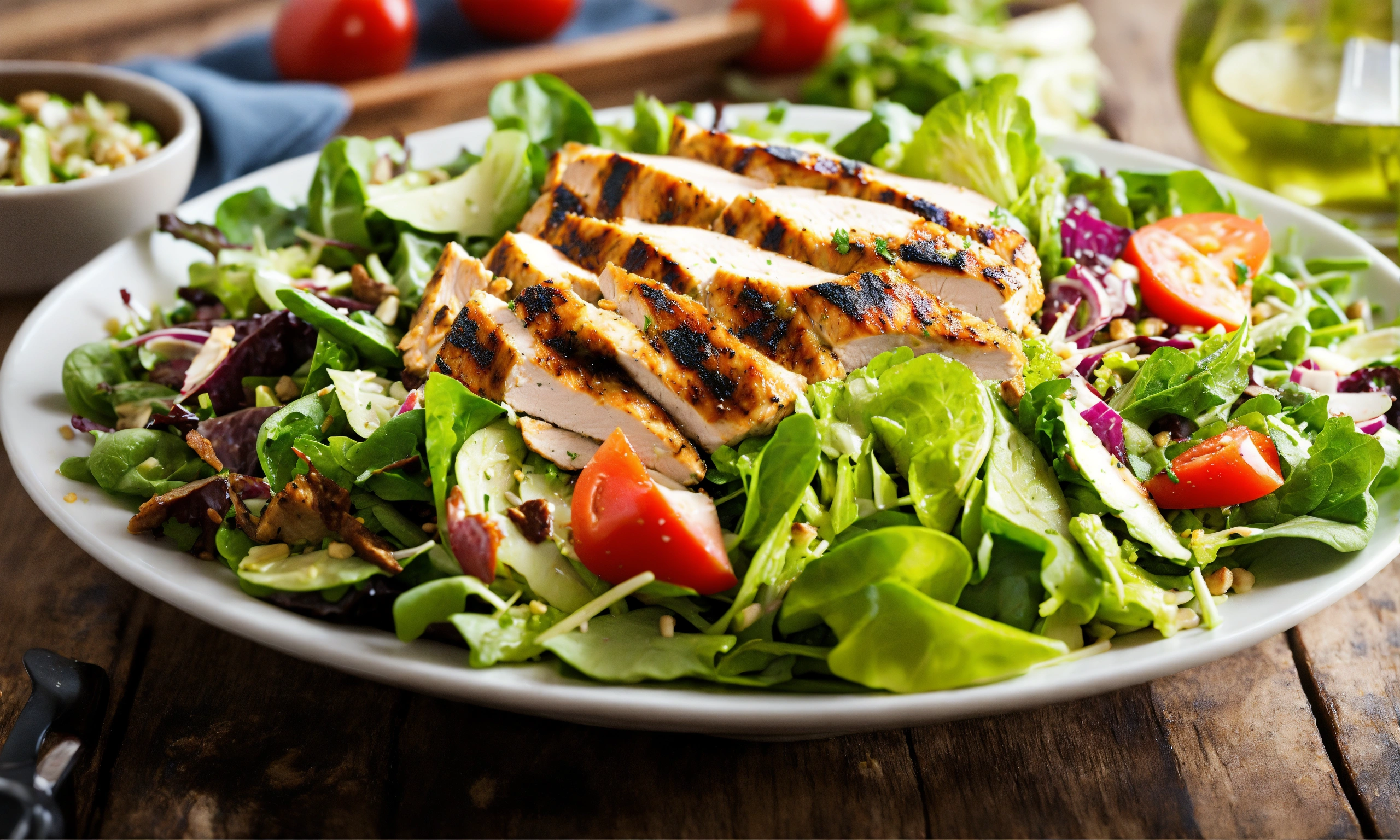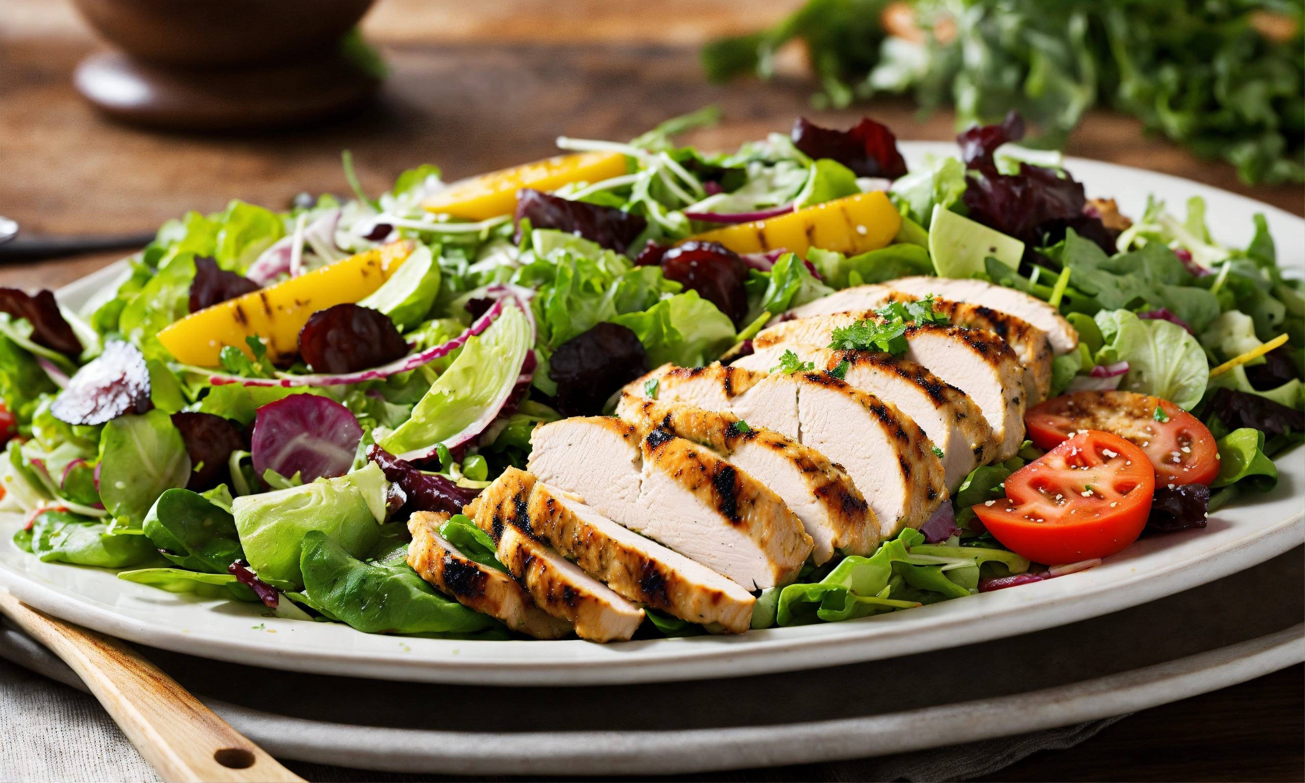 Grilled chicken salad a fresh salad with grilled chicken slices on top, alongside a variety of salad greens and veggies.