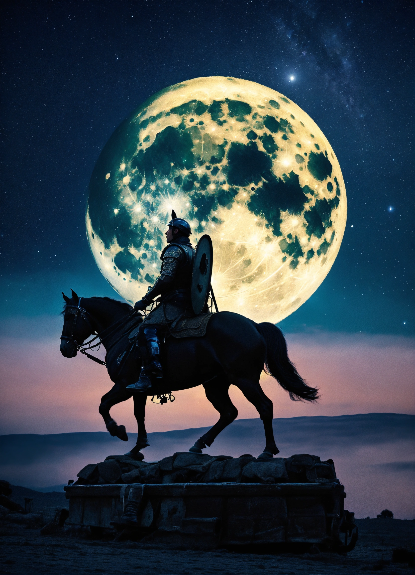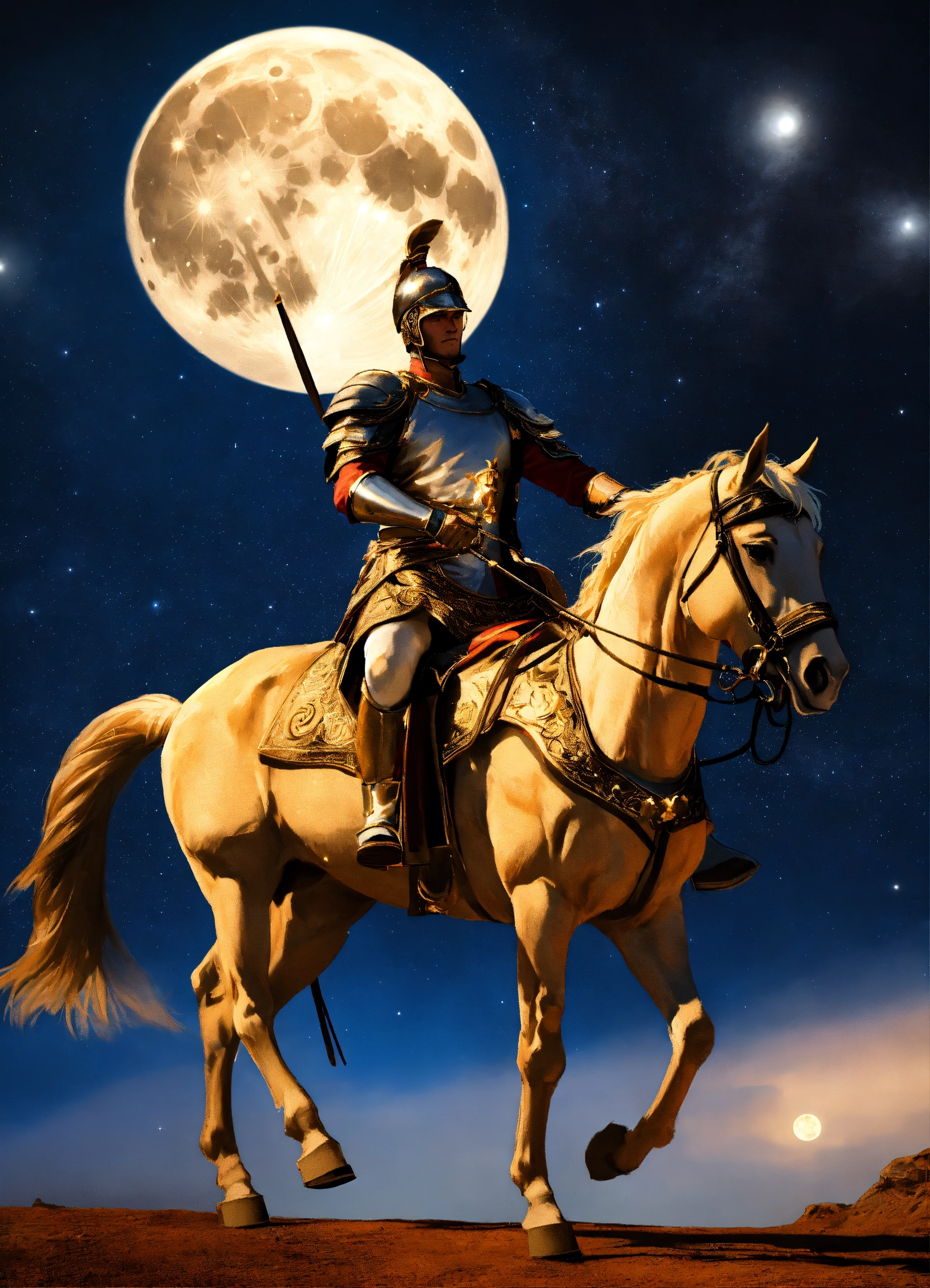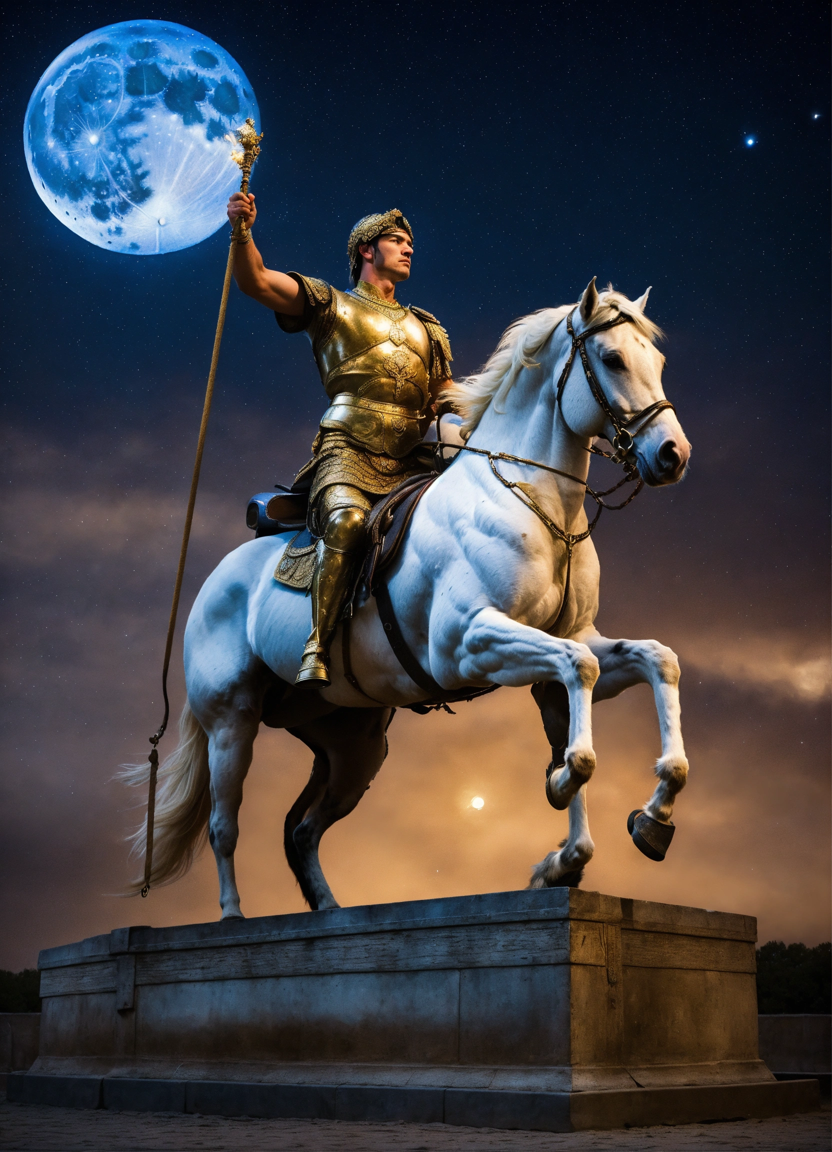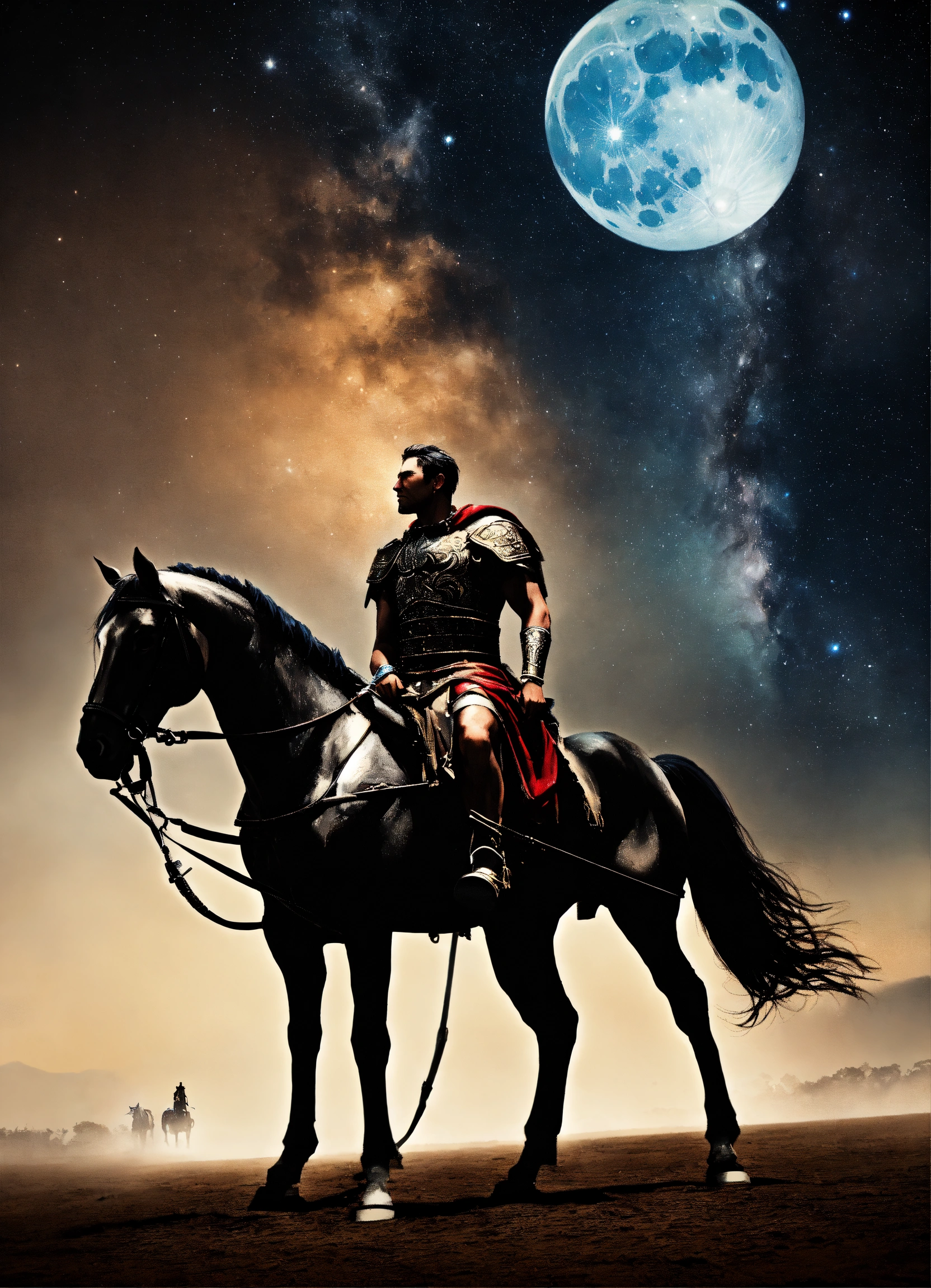 "capture a photo of a strong man, his torso clad yet powerful, commanding a roman chariot. he stands confidently on the cuadriga, guiding one white and one black horse without reins, a symbol of control and unity. they move with purpose under the night sky's vast expanse, with a brilliant full moon amplifying the scene's intensity. this image requires the authenticity of a real man, actual horses, and a tangible chariot, set against the true night sky, creating a scene of human courage intertwined with timeless cosmic energy."