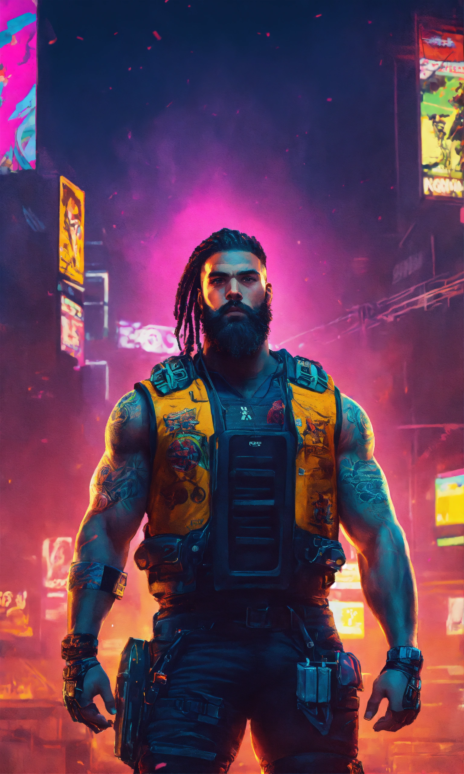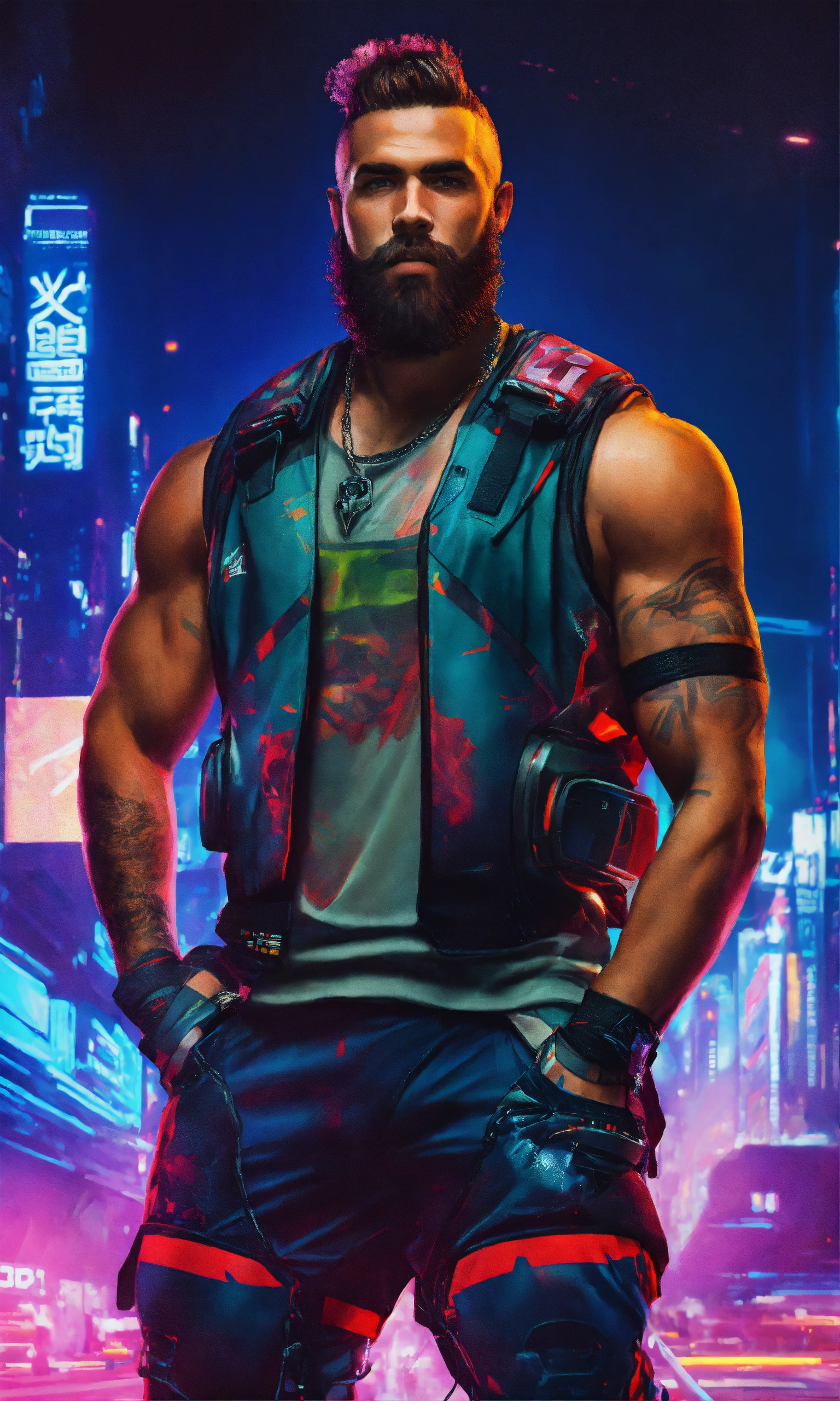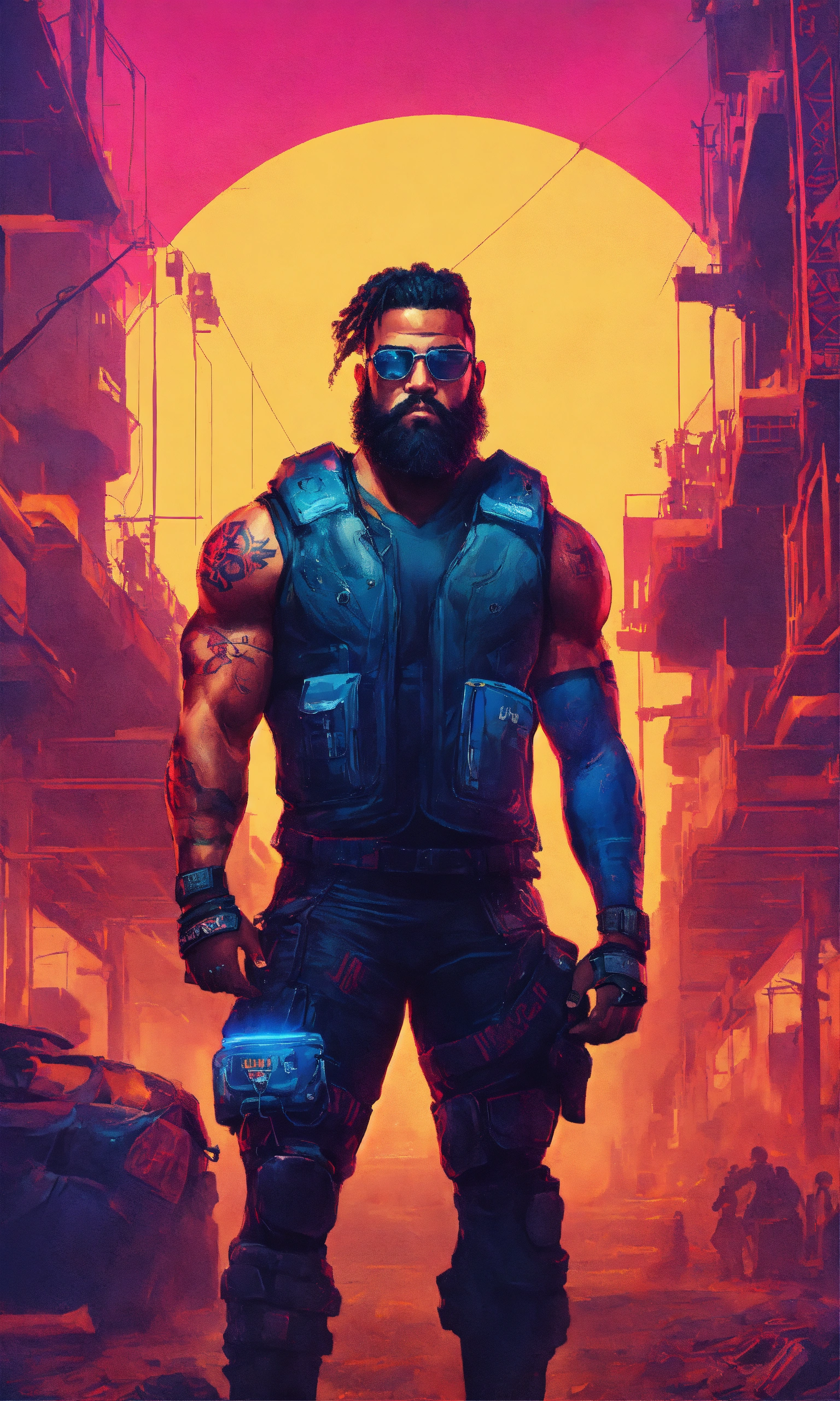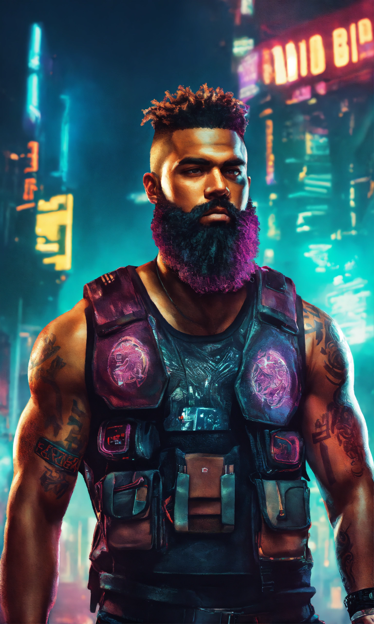 American football player with beard and bold, tough and big cyberpunk wearing a vest, voodoo boys in cyberpunk, cyberpunk art poster style, field as background