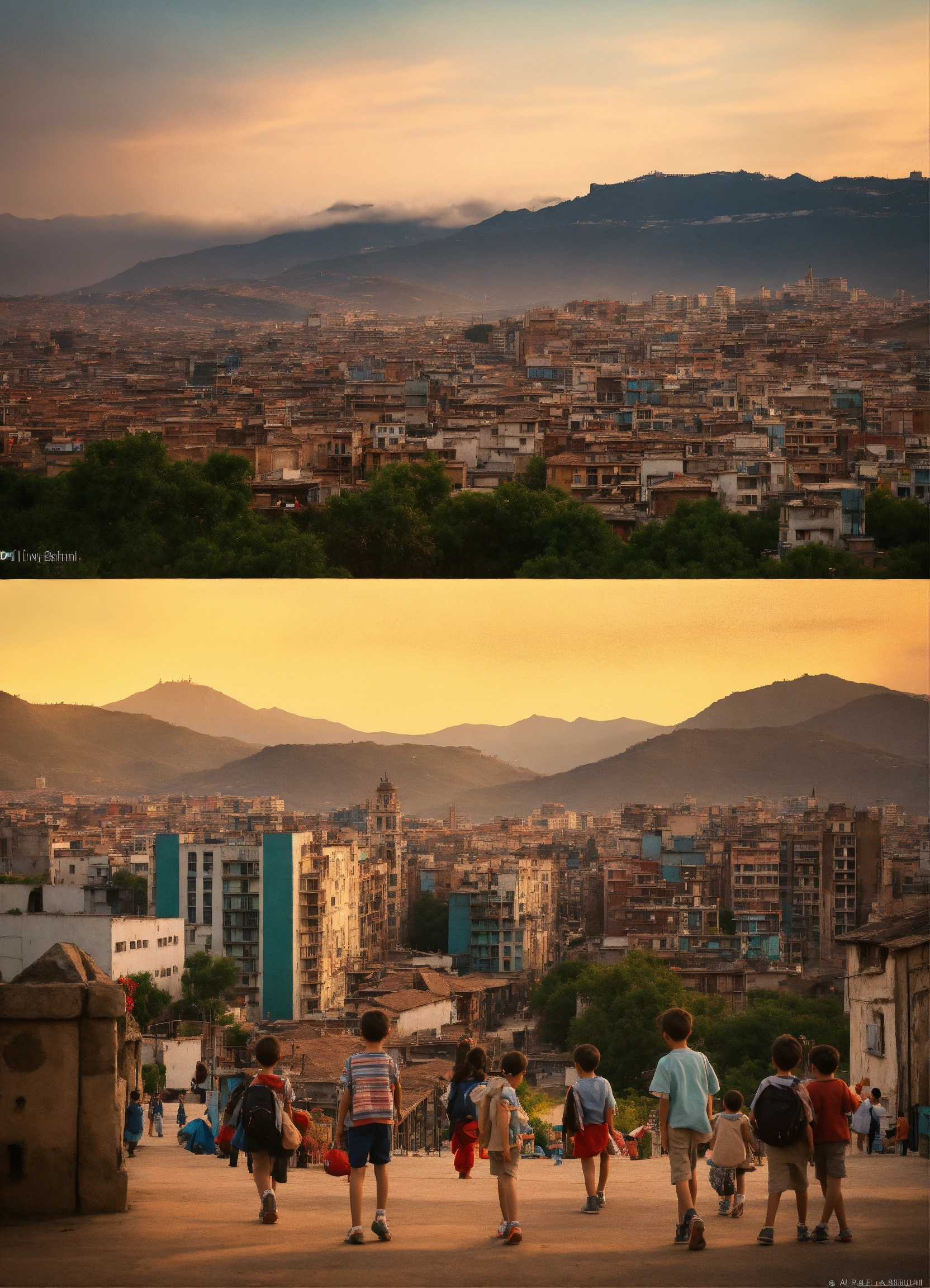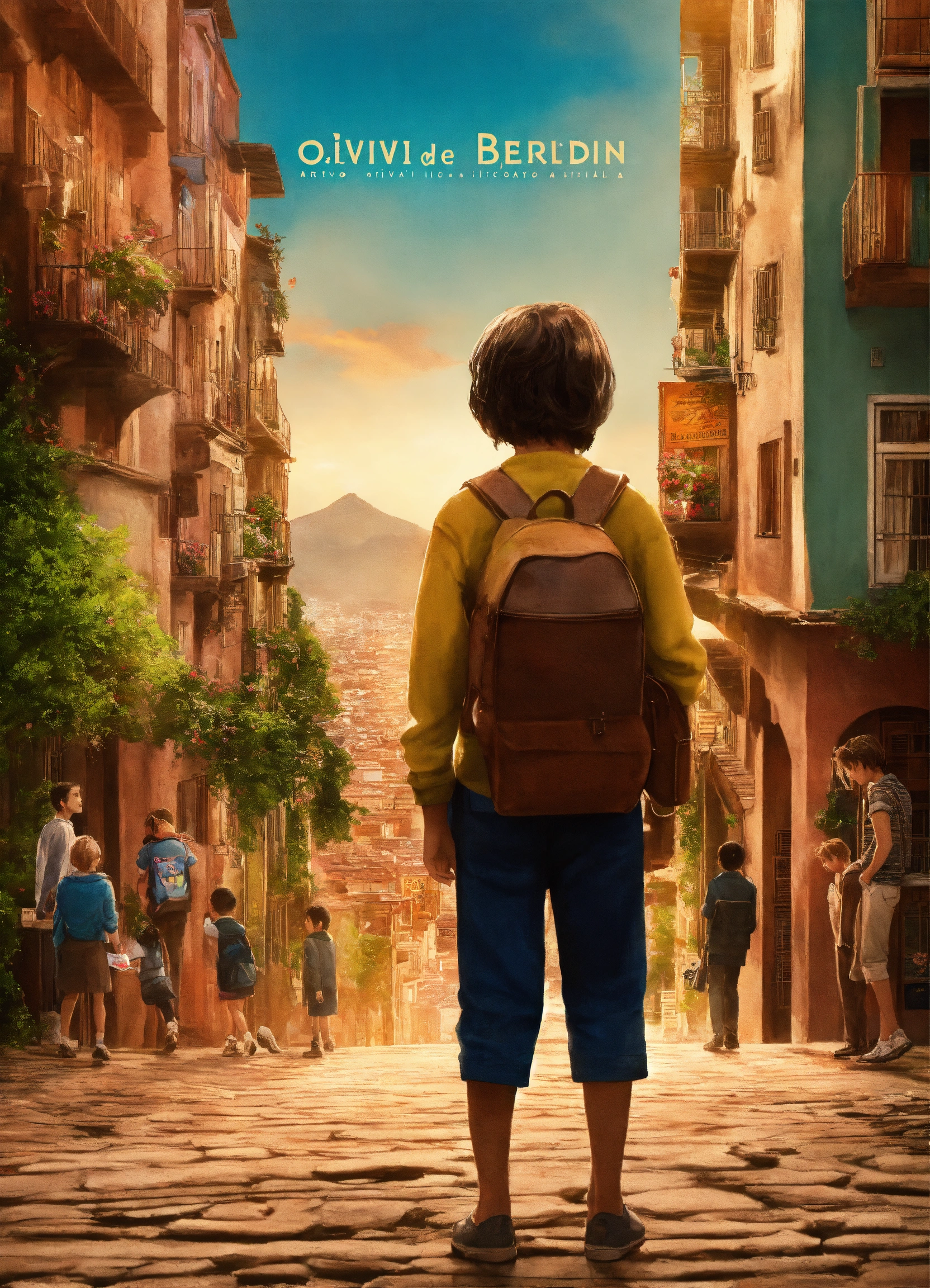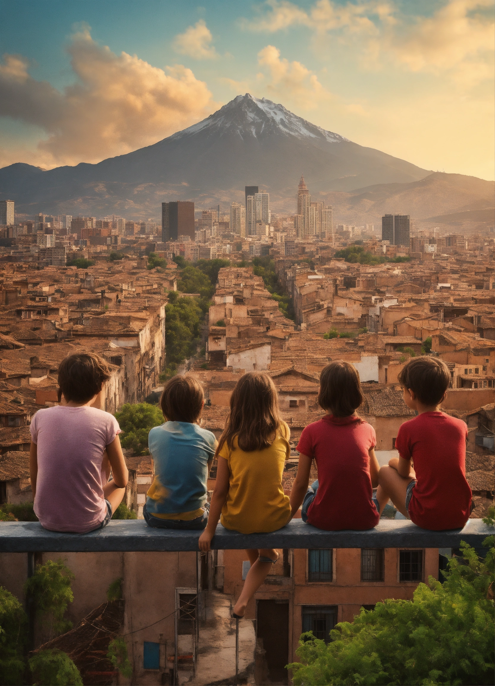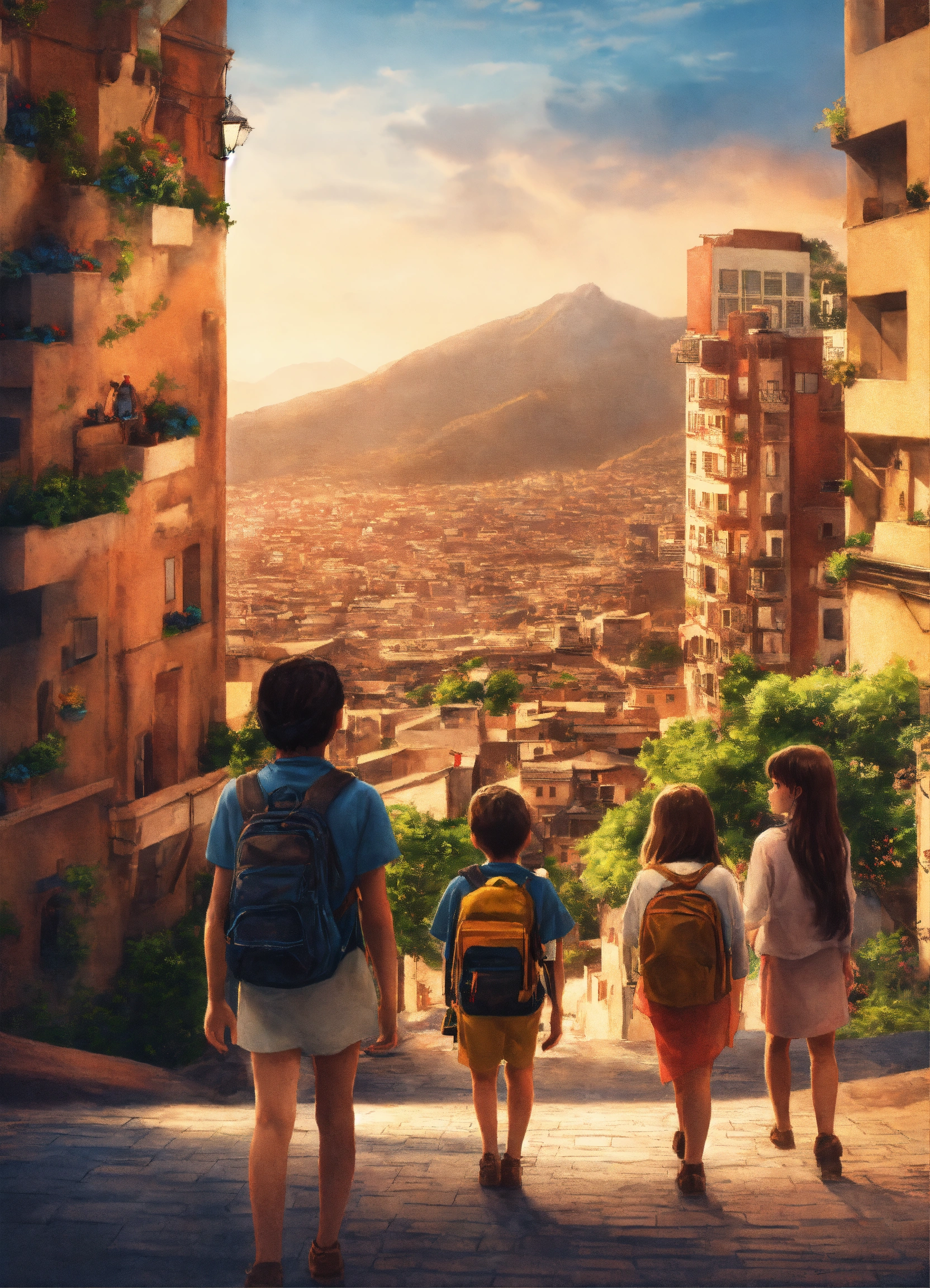 5 niños de 12 años de edad caminan en ciudad con edificios y montañas, al estilo artístico de olivia de berardini, se ve de pies a cabeza la imagen. estilo portada de película de espías.