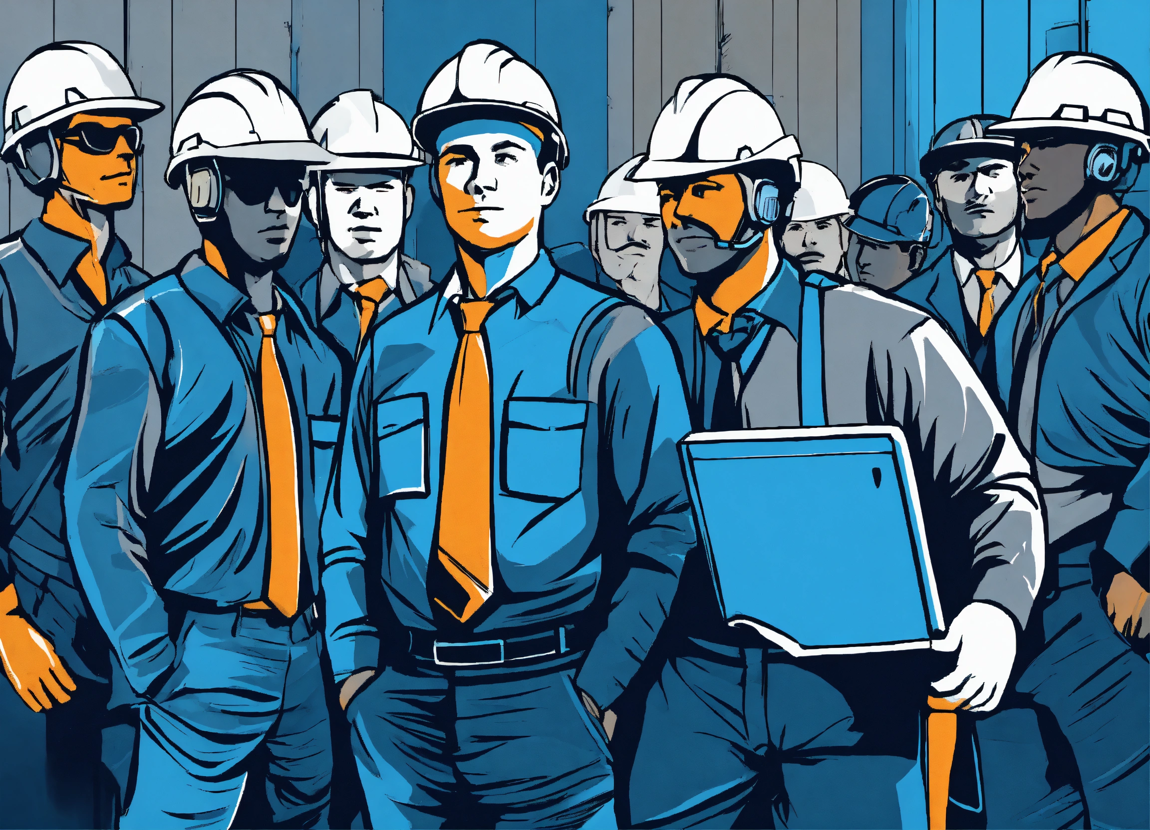 Business, construction, business relations, workers in helmets, in graphic style, colors blue and gray