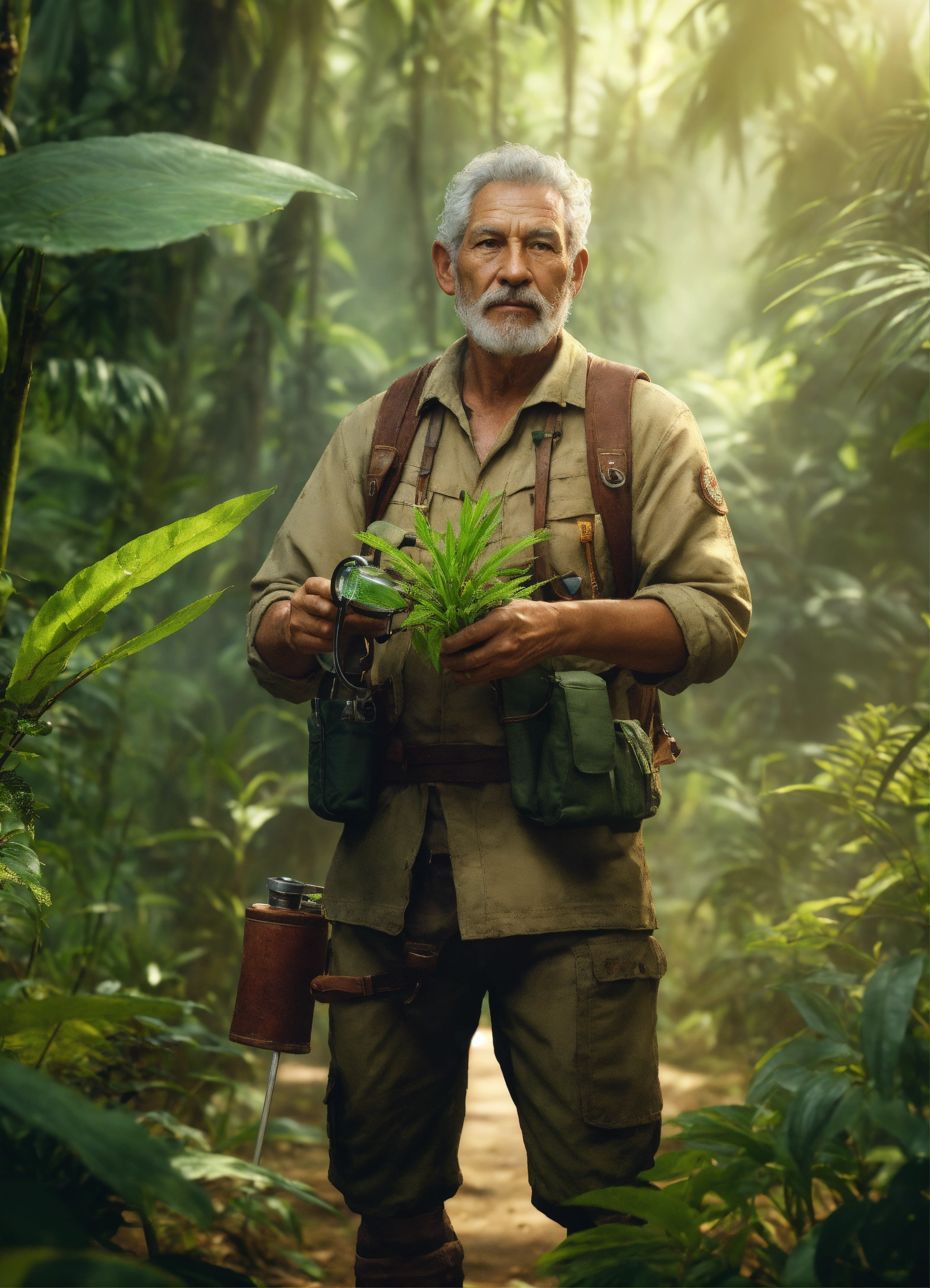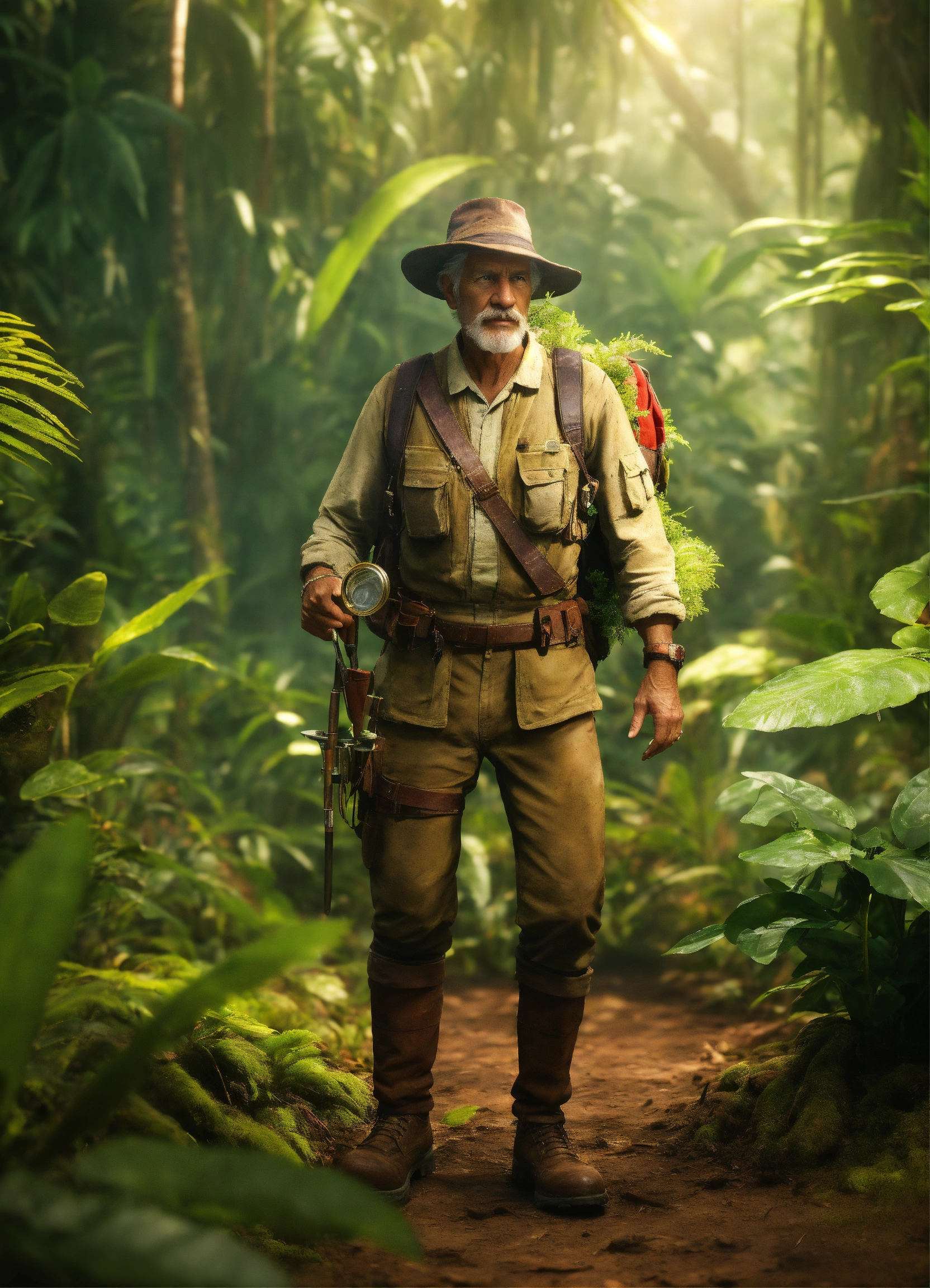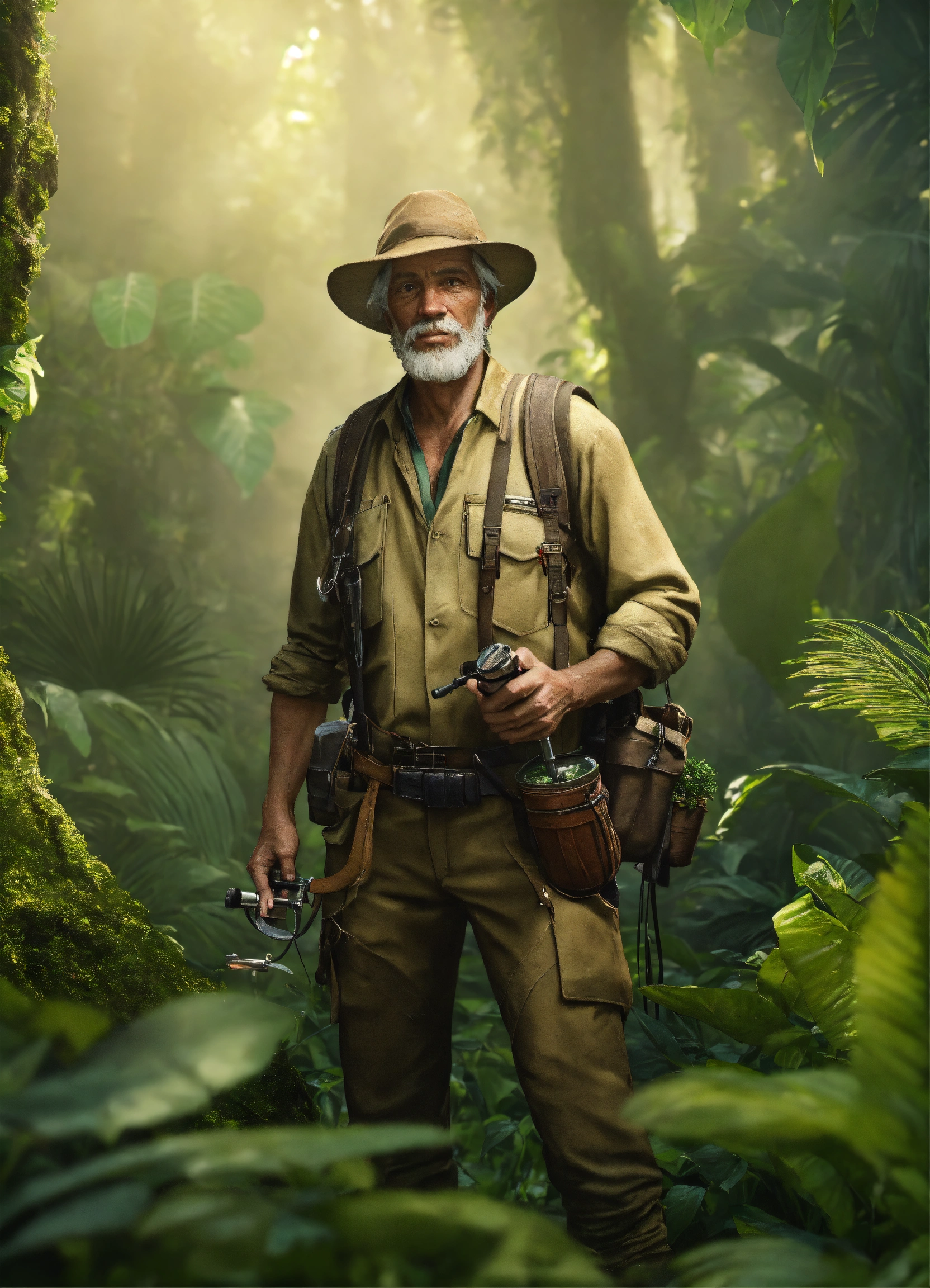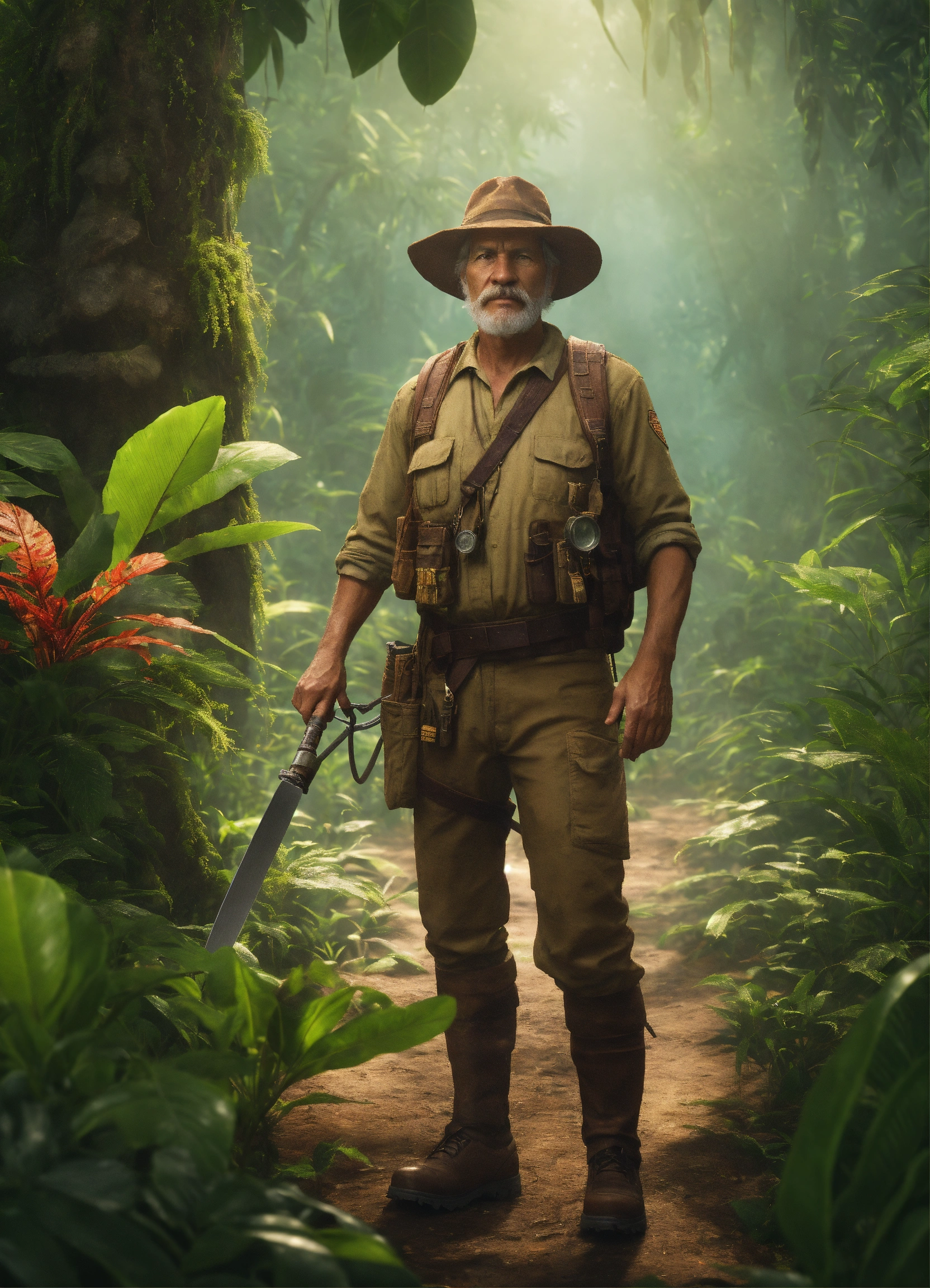 Establishing shot of a front view of a 60 year old botanist, who discovers a rare plant, in a humid jungle.detailed tenue, with in expedition clothing, with a jumanji video game look. detailed image with vintage 3d adventure video game animation style, with natural lighting at dawn and high humidity atmosphere. detailed character, with a standing position, with in his right hand which hold a botanical magnifying glass, with his left hand which hold a survival machete. detailed discover, with a rare plant in next to the character.