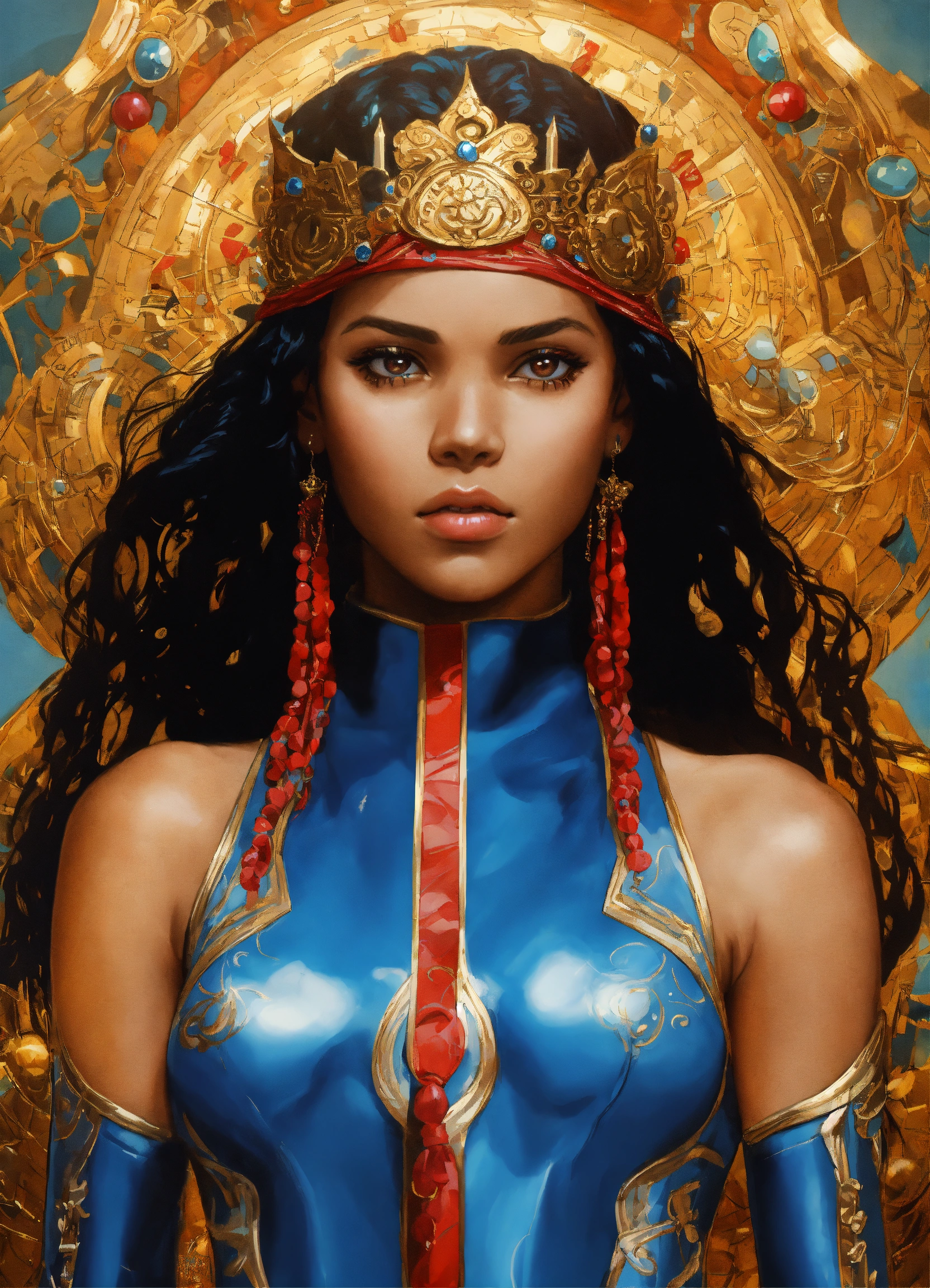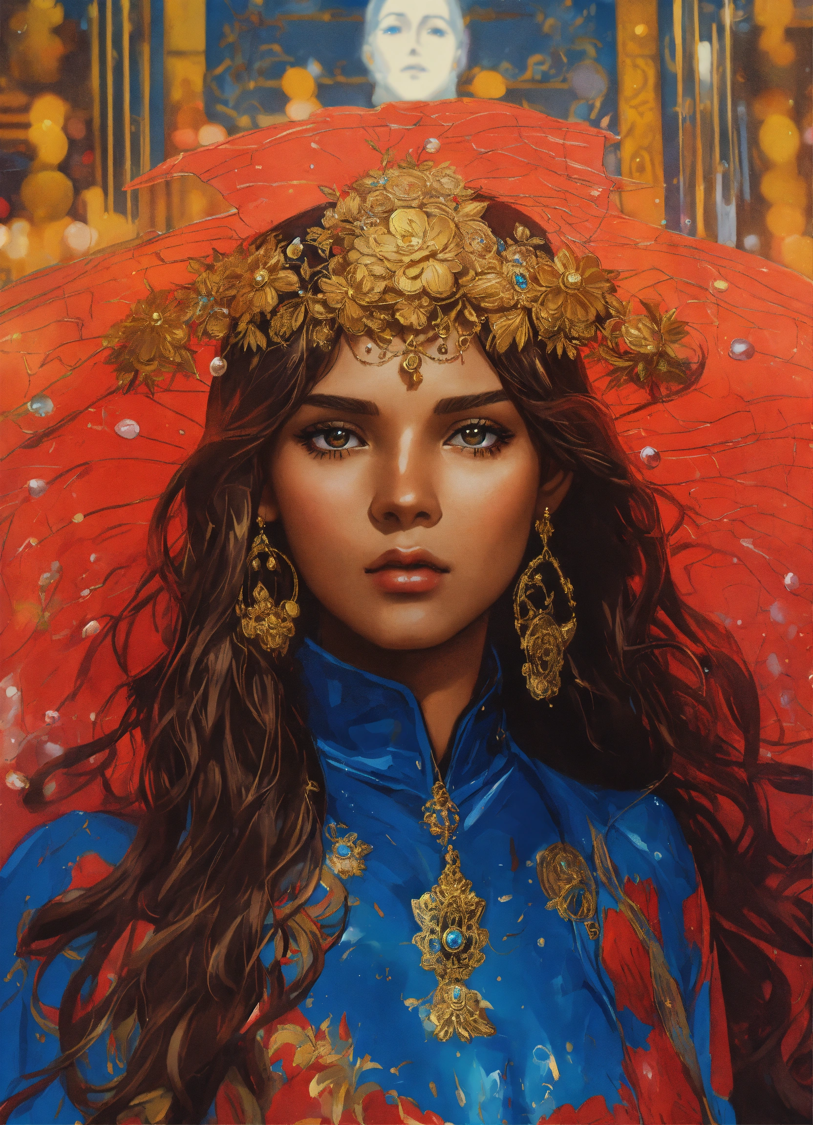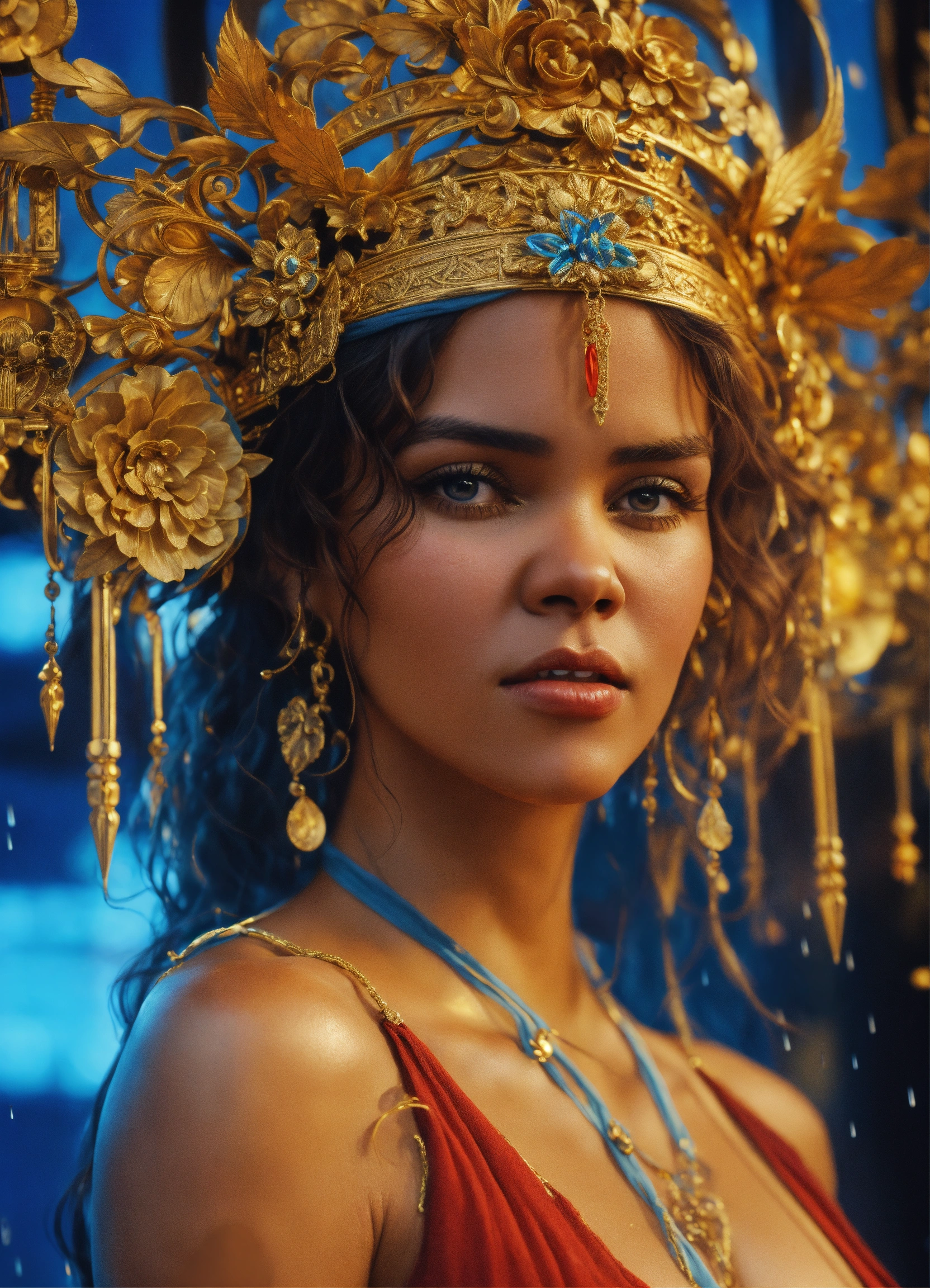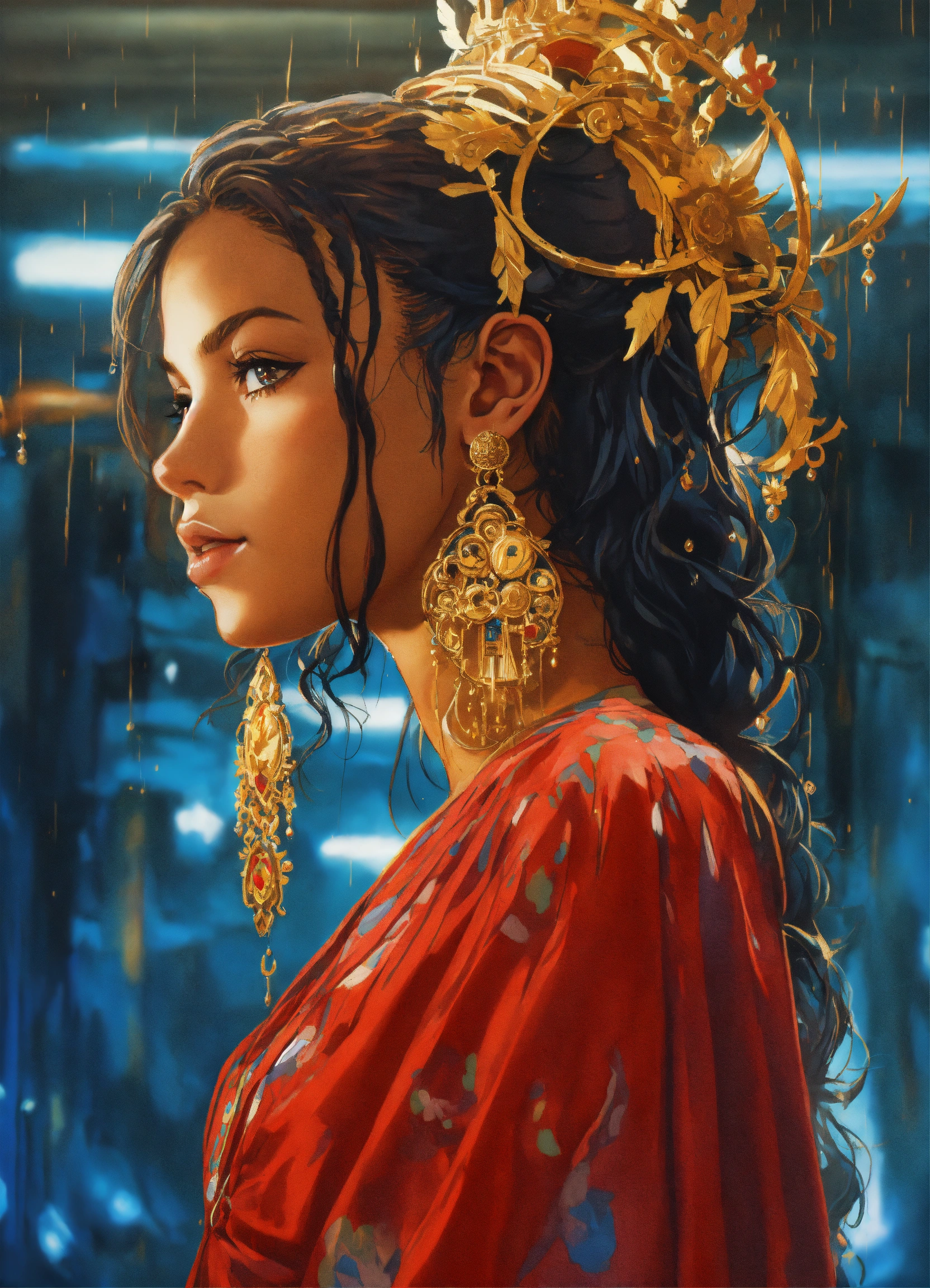 Vintage 90's anime artwork. beautiful revealed metis girl with long wavy hair, far perspective intricate, sharp focus, fantasy, soft natural lighting, other worldy, surreal 8k photo, blue dress, gold crown, gold head ornament, long hair with cute face of halle berry with long hair, anime art of ghost in the shell, detailed scene, red, perfect face, intricately detailed photorealism, trending on artstation, rainy day.