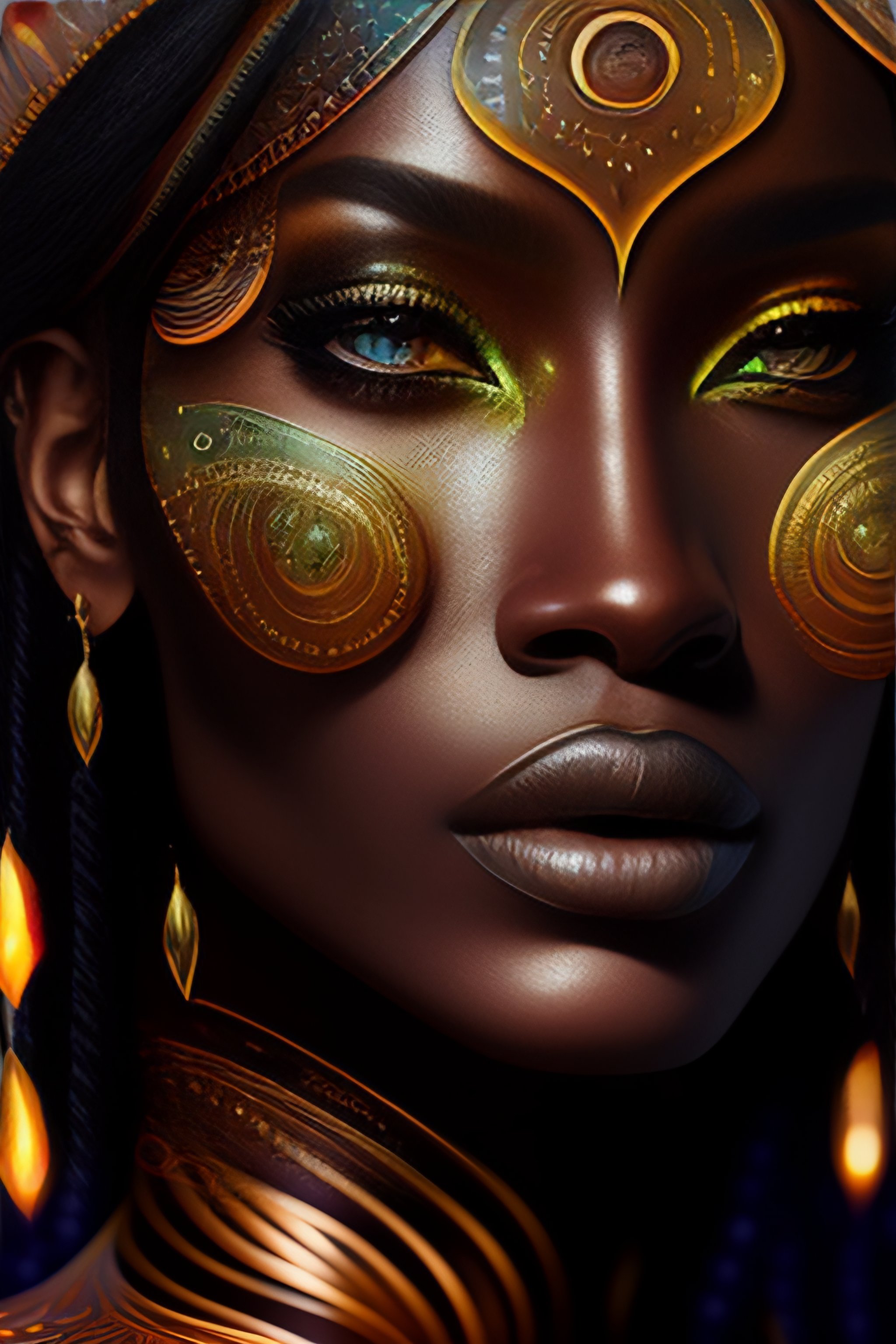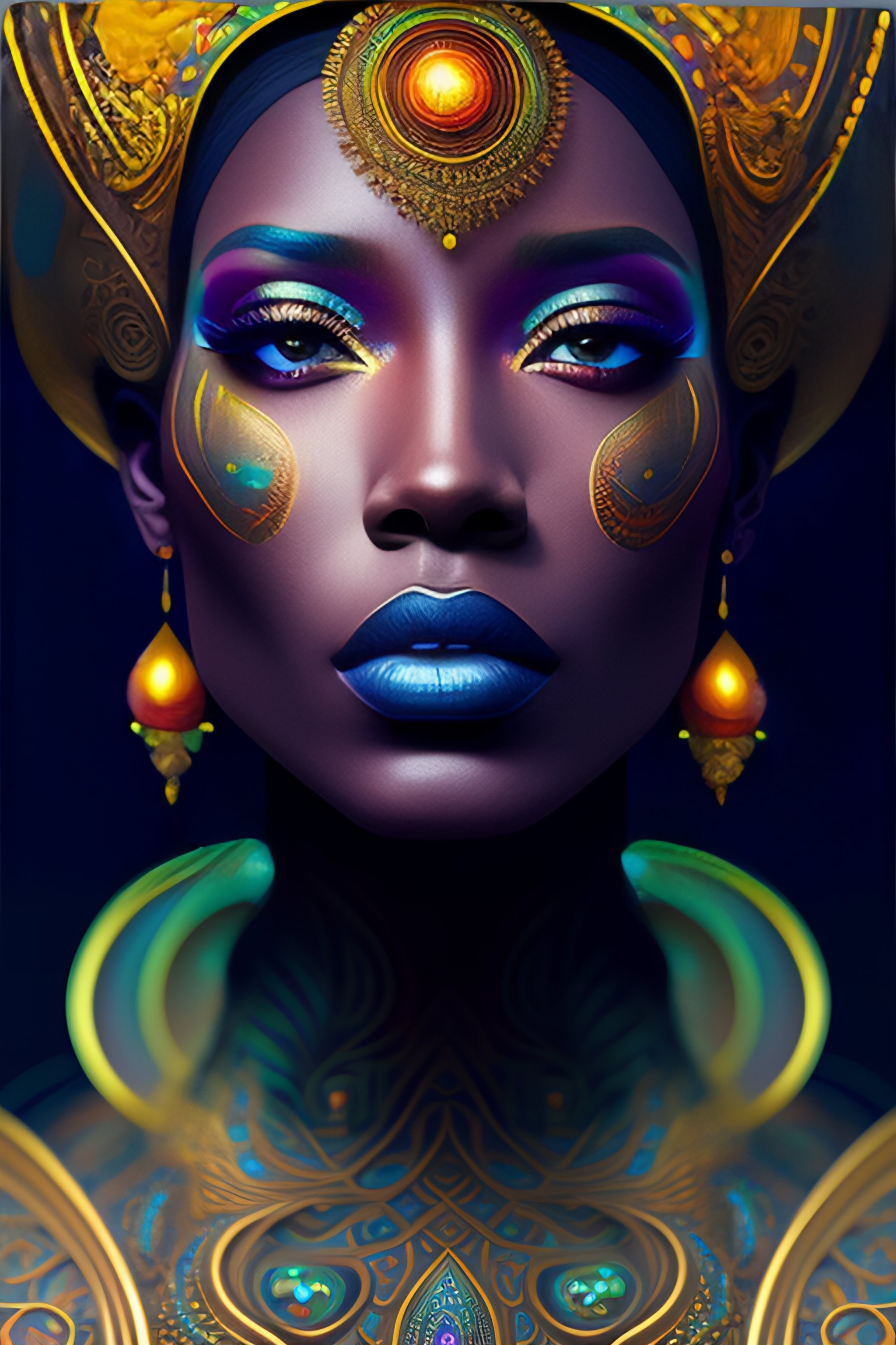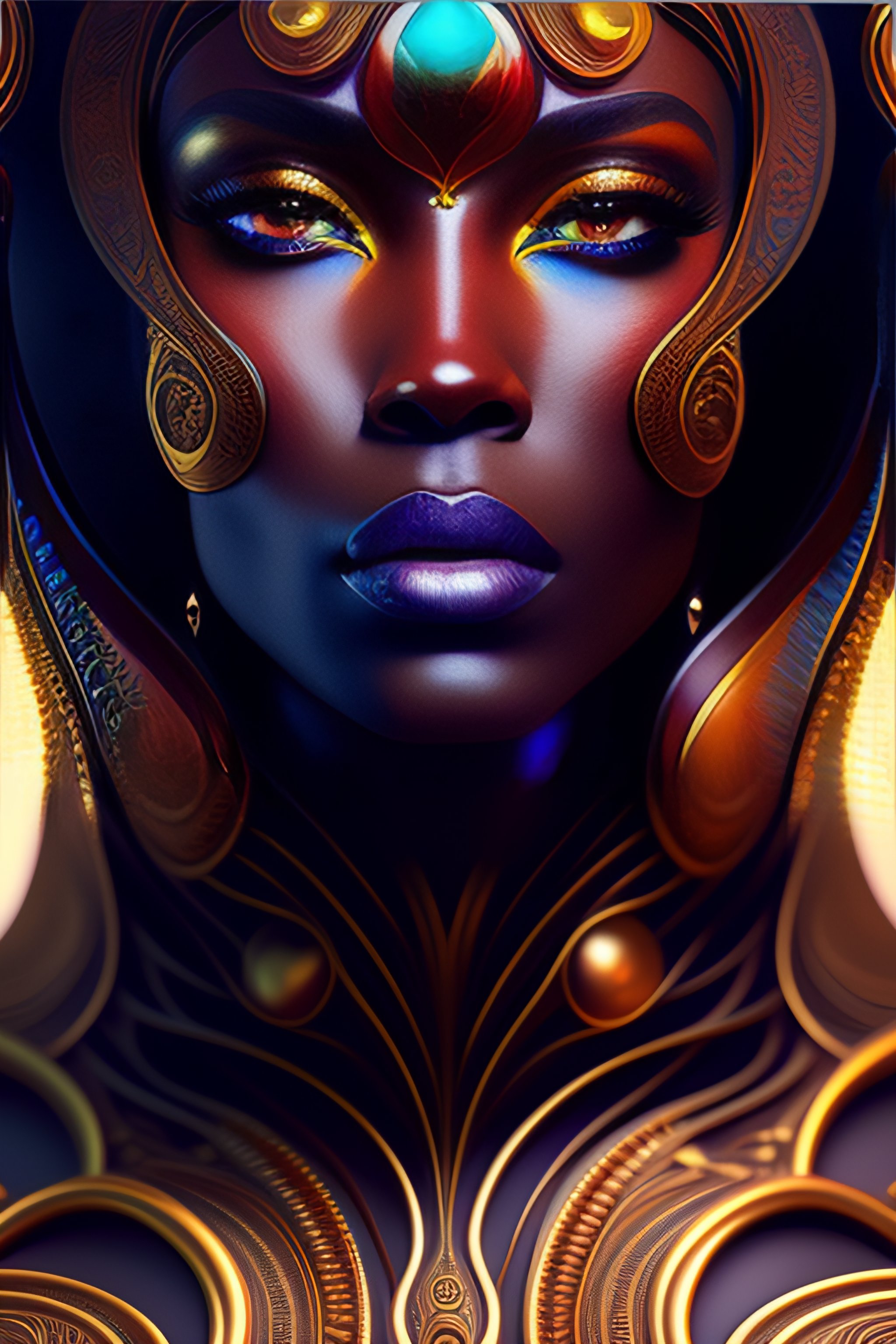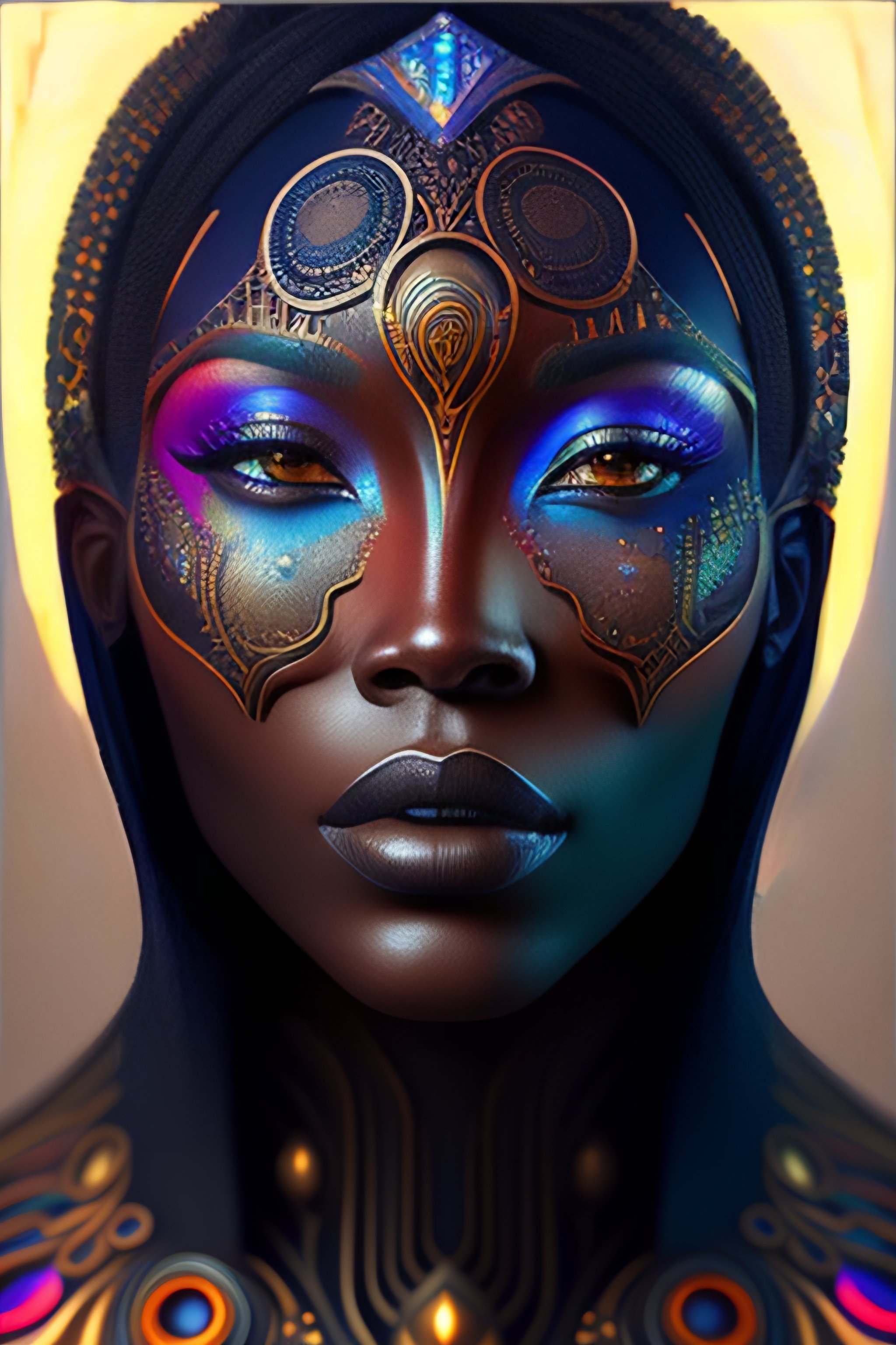 Digital painting of a woman's face, psychedelic organic cyborg, intricate wlop, beautiful biomechanical djinn, intricate transhuman, intricate futurism, composition by igor goryunov stylized by tomasz alen kopera, intricate digital painting, hyper - detailed visionary art, detailed fantasy digital art, intricate fantasy painting, goddess. extremely high detail, psytrance artwork a close up of a face in a frame, digital art by beeple, zbrush central contest winner, afrofuturism, symmetrical portrait scifi, symmetical face, beeple art 8k inspired by aumegaart and luminokaya