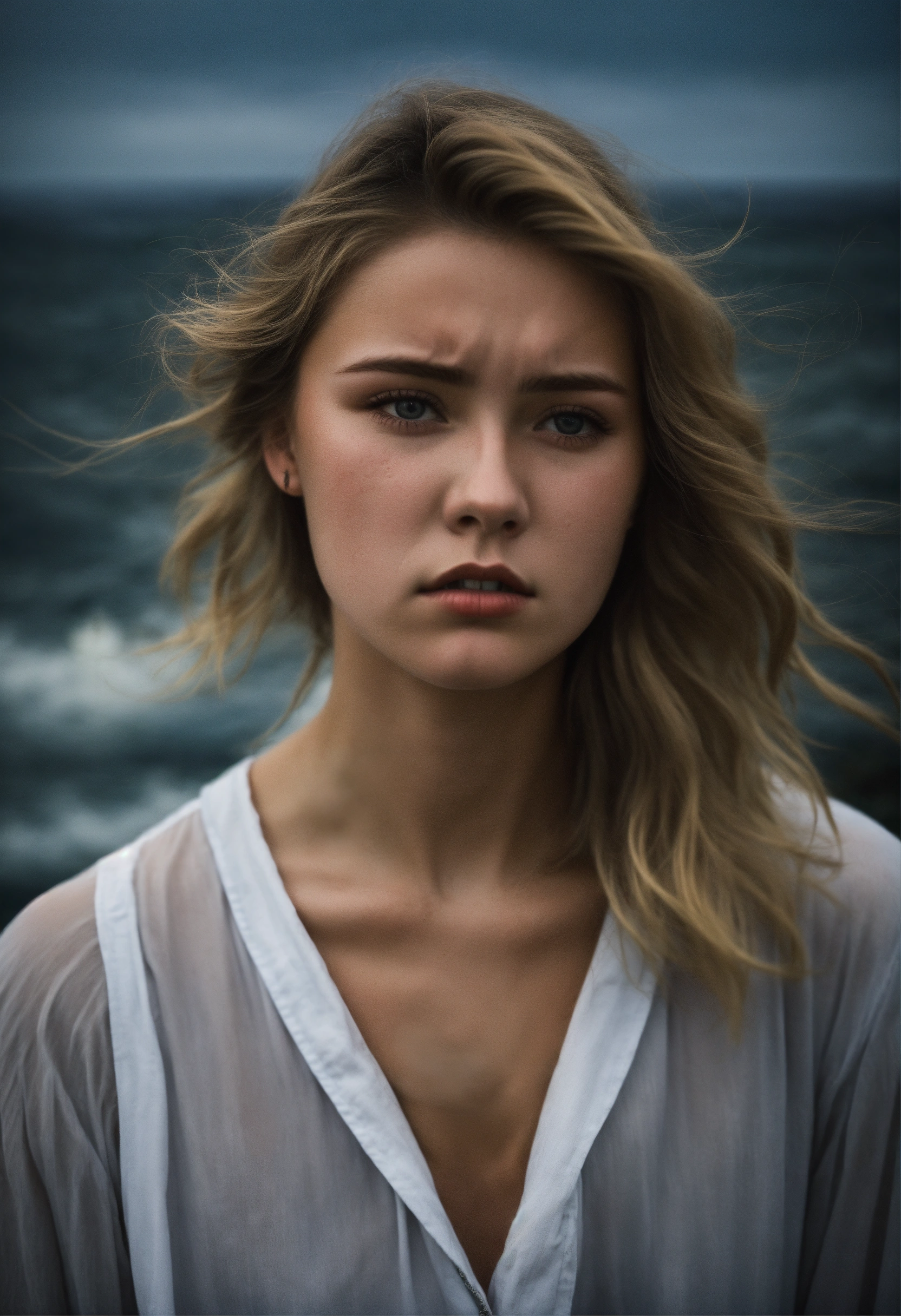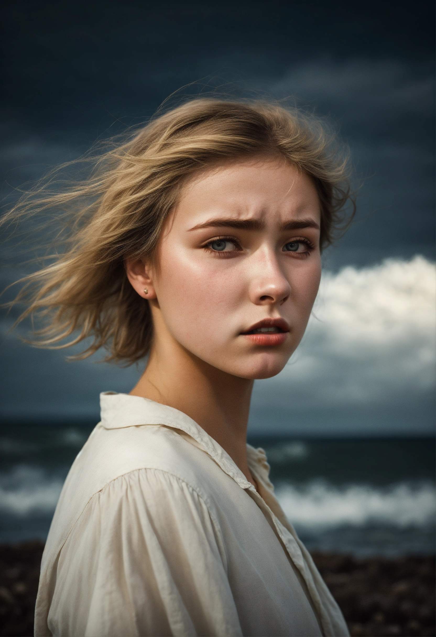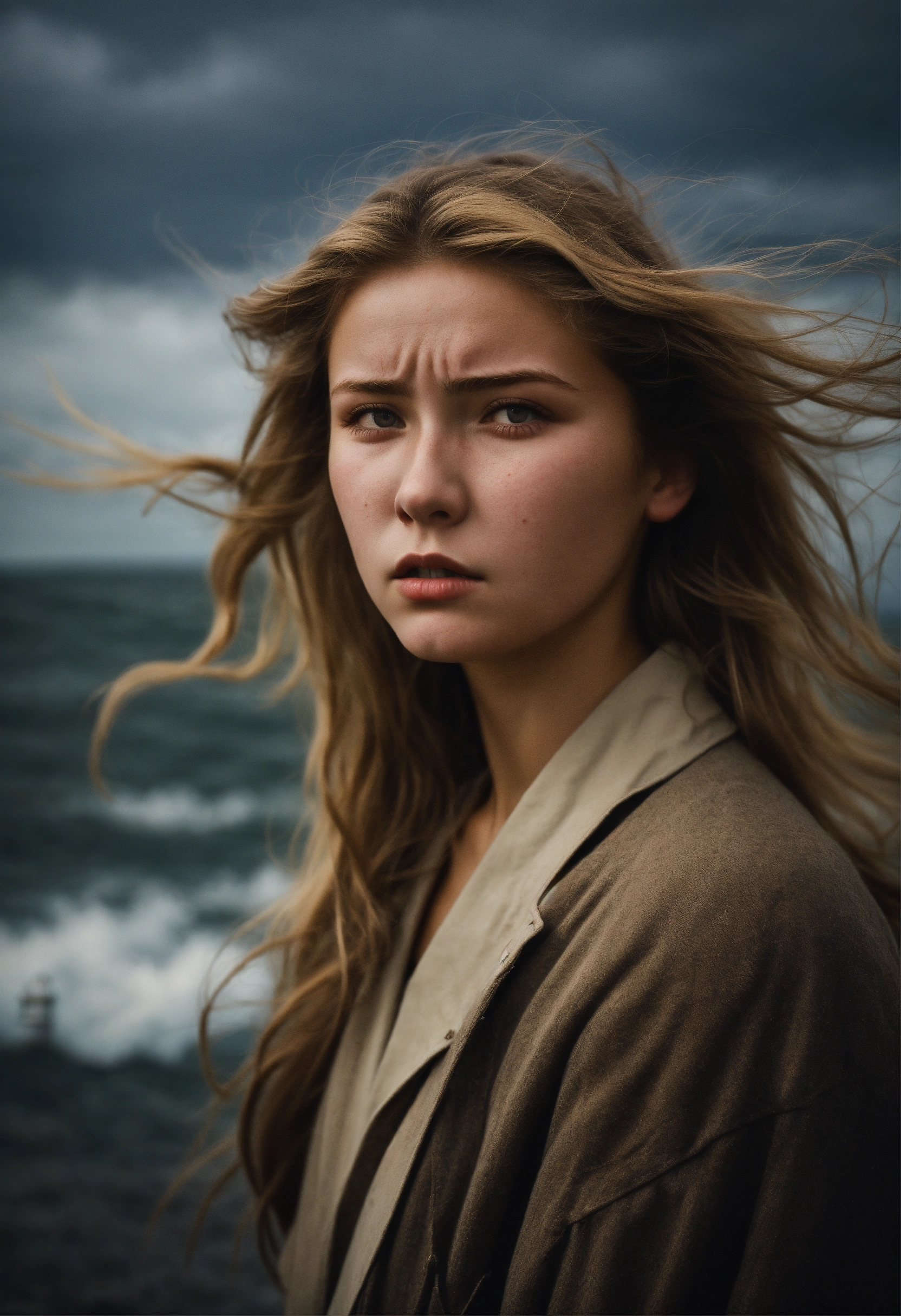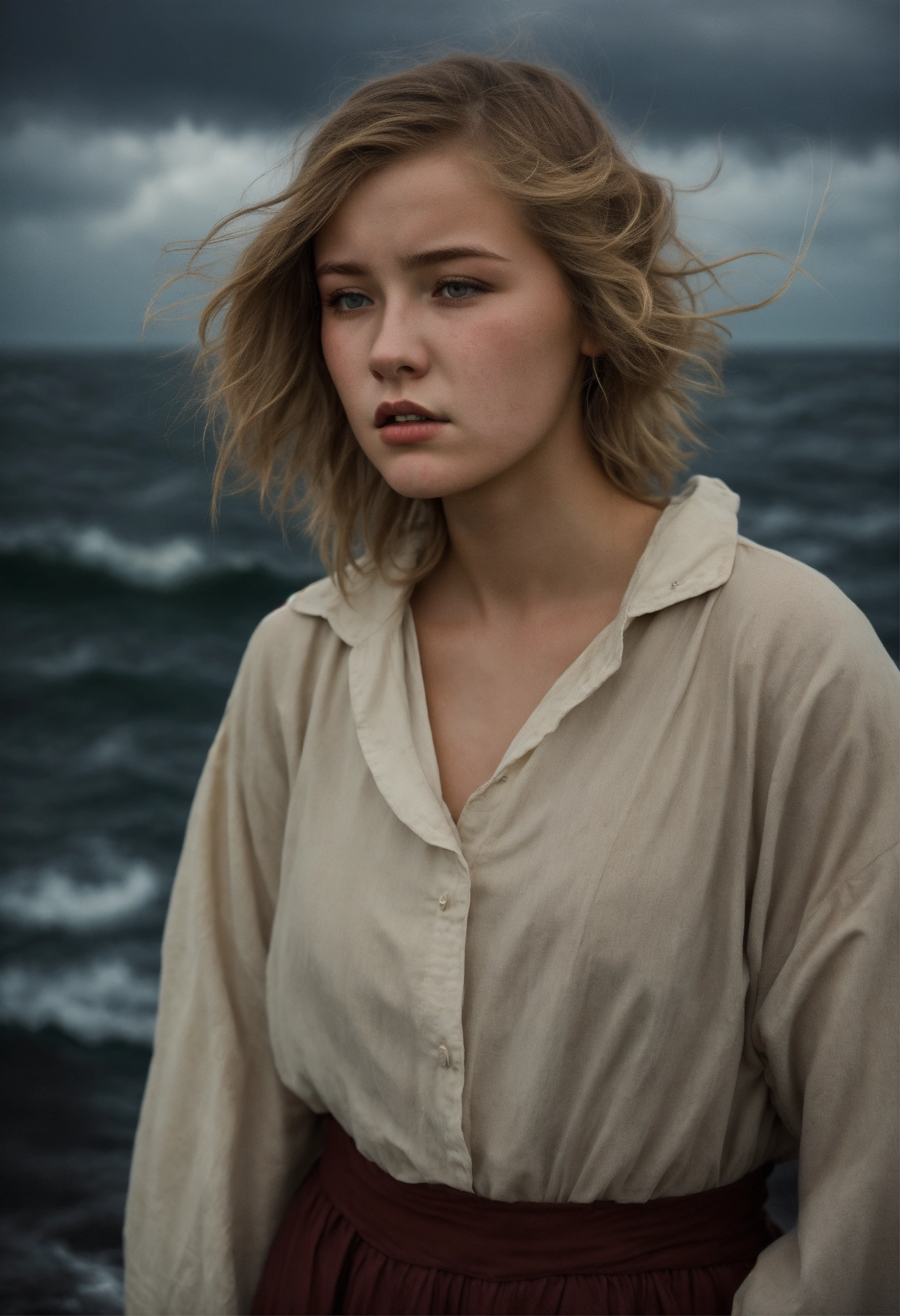 1910's 18 year old russian girl, worried face, brown eyes, short light blonde hair blowing in the wind, by the dark ocean, in storm, lighthouse