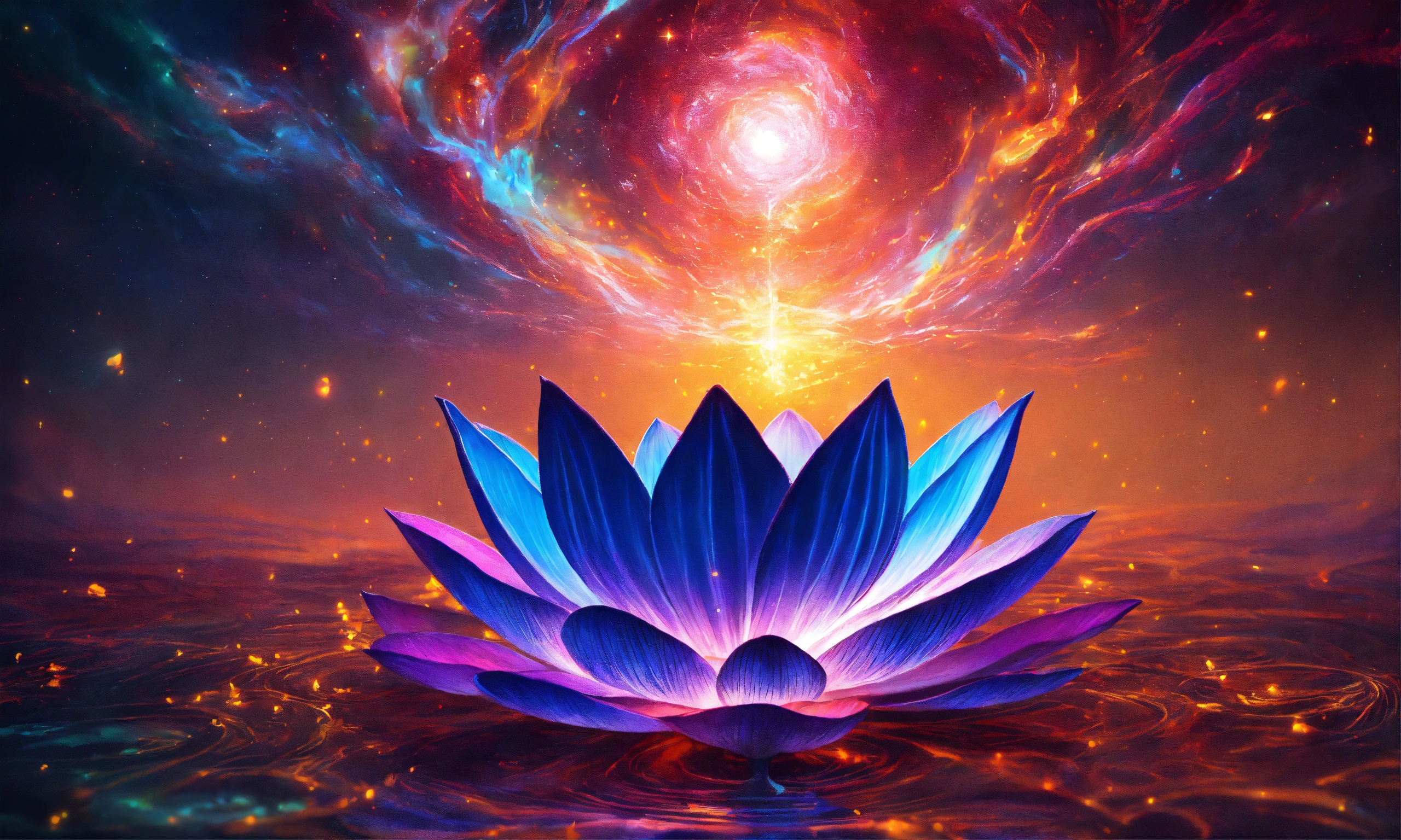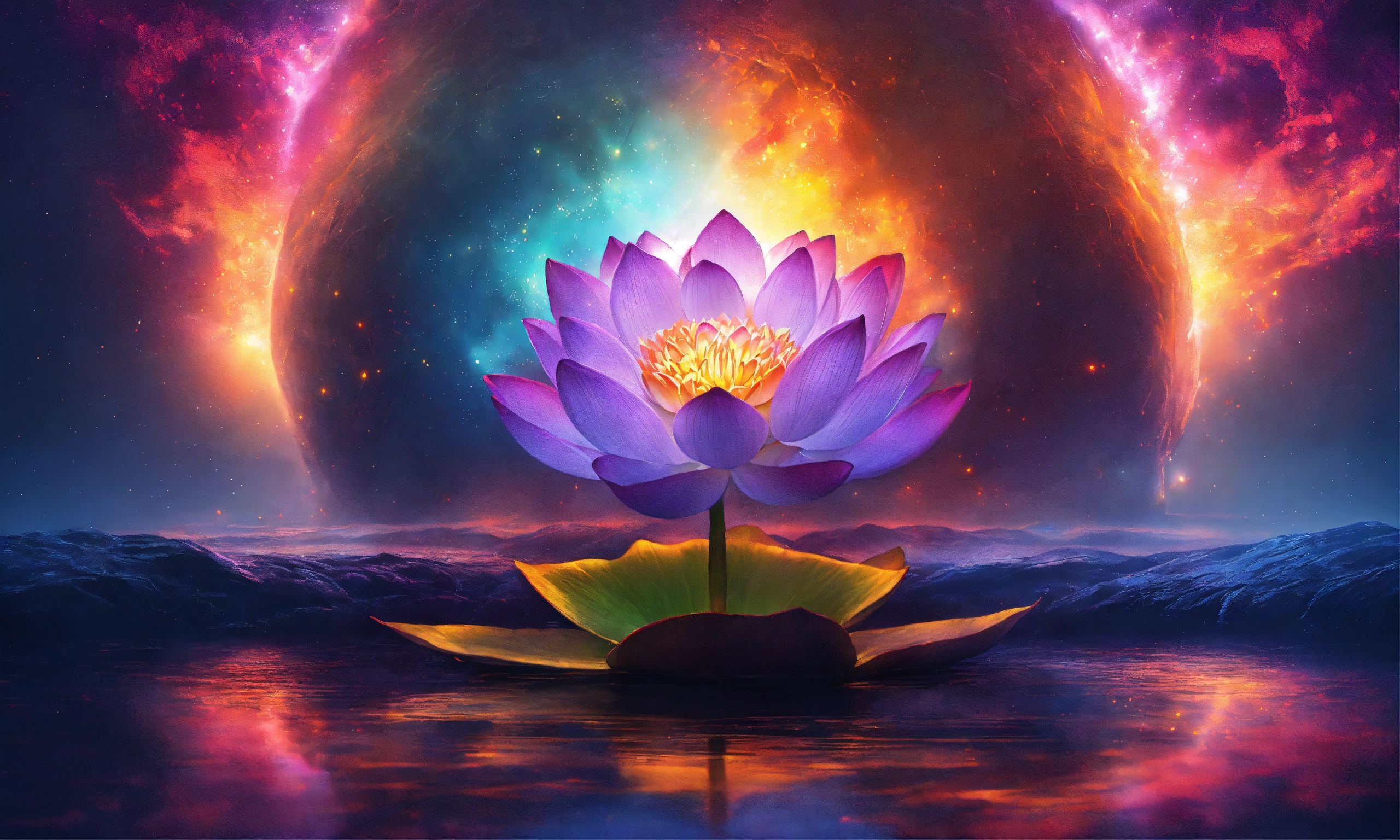 Brain is exuding magical light of vibrant colors, a vibrant lotus flower inside brain, a mesmerizing universe