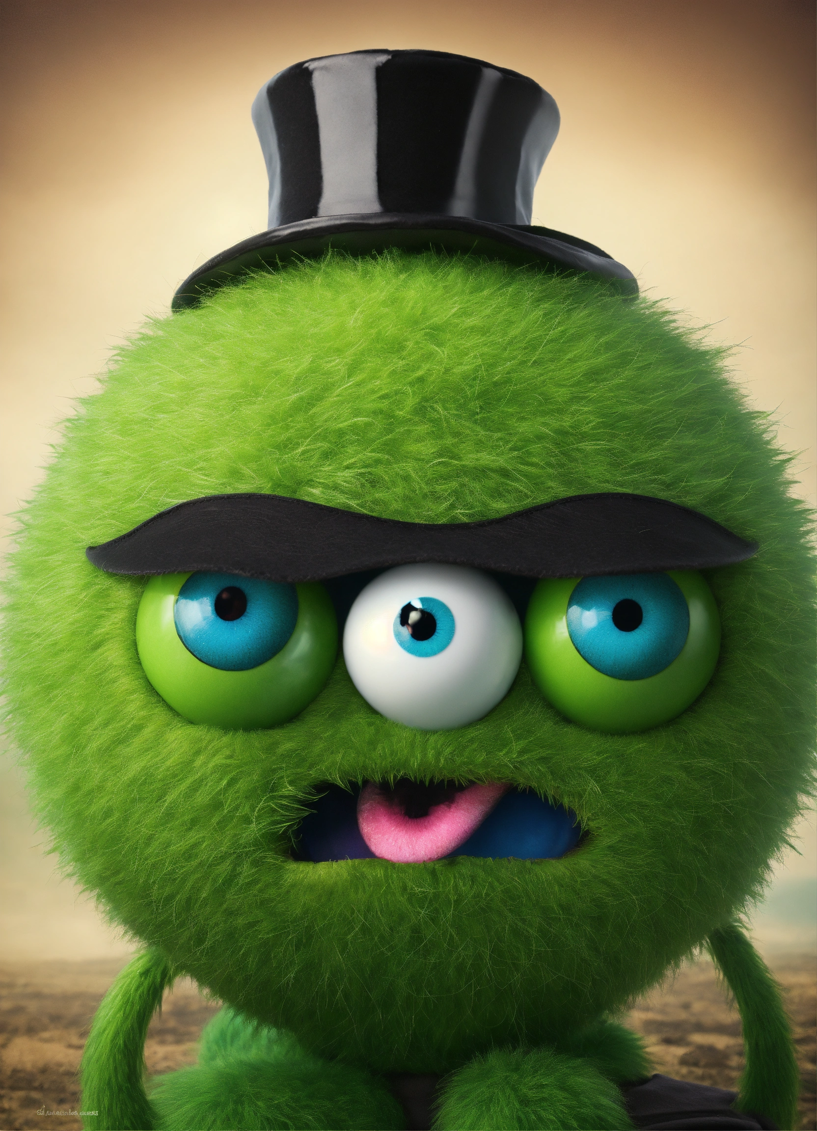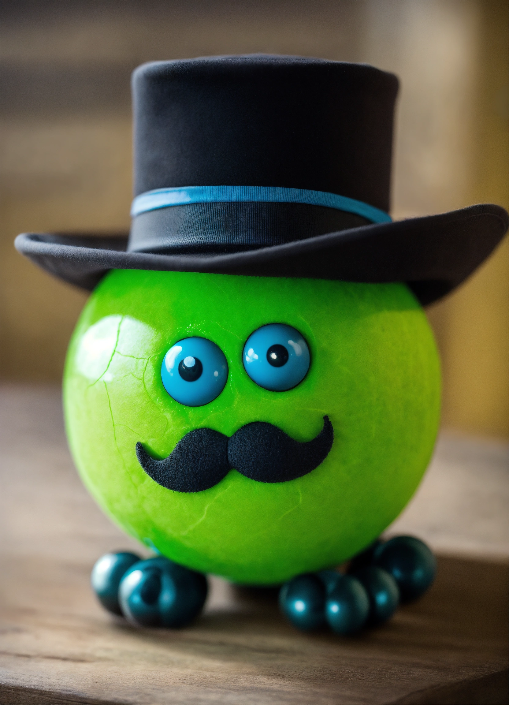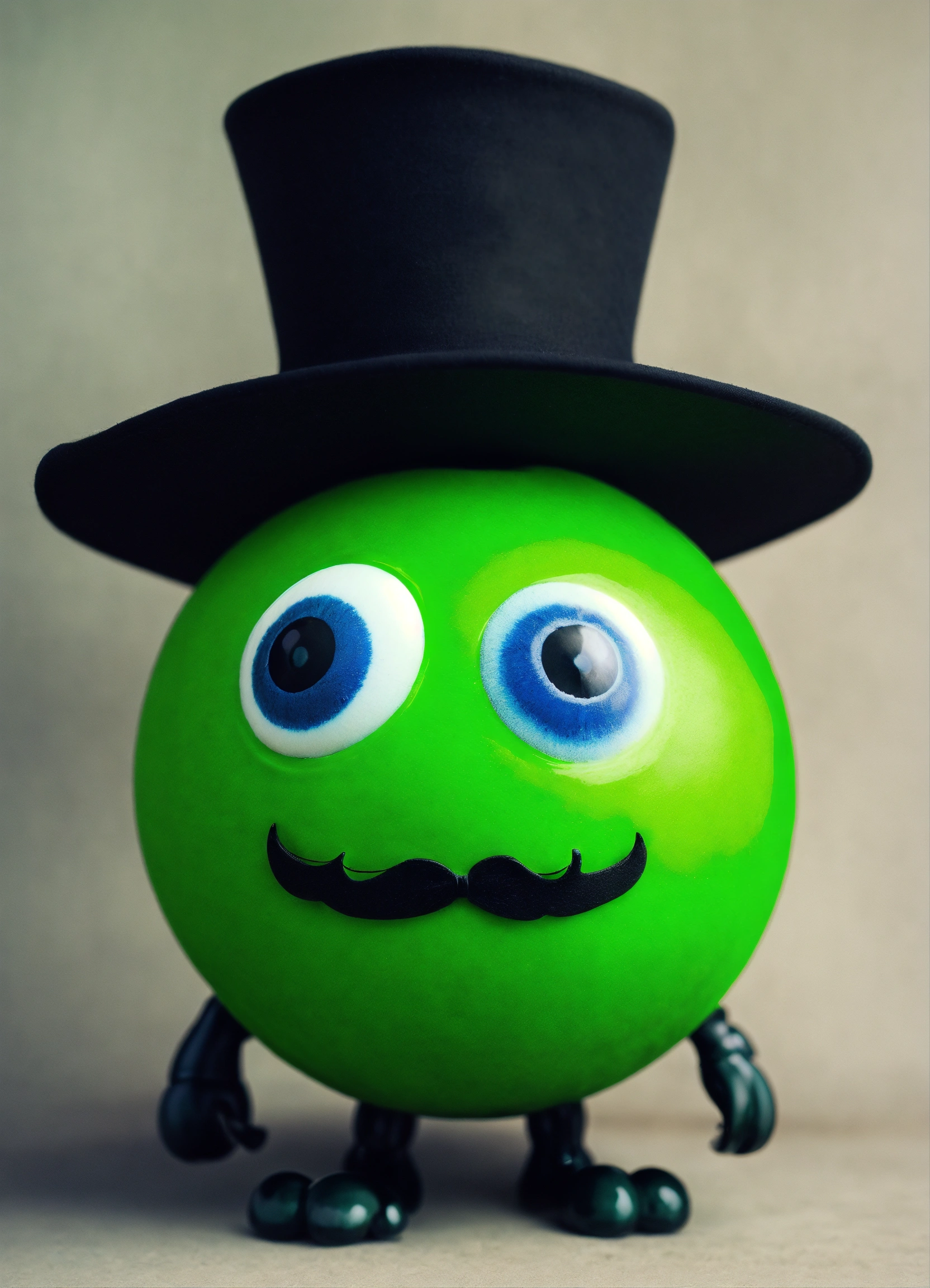 A green ball monster with a black mustache and a black hat