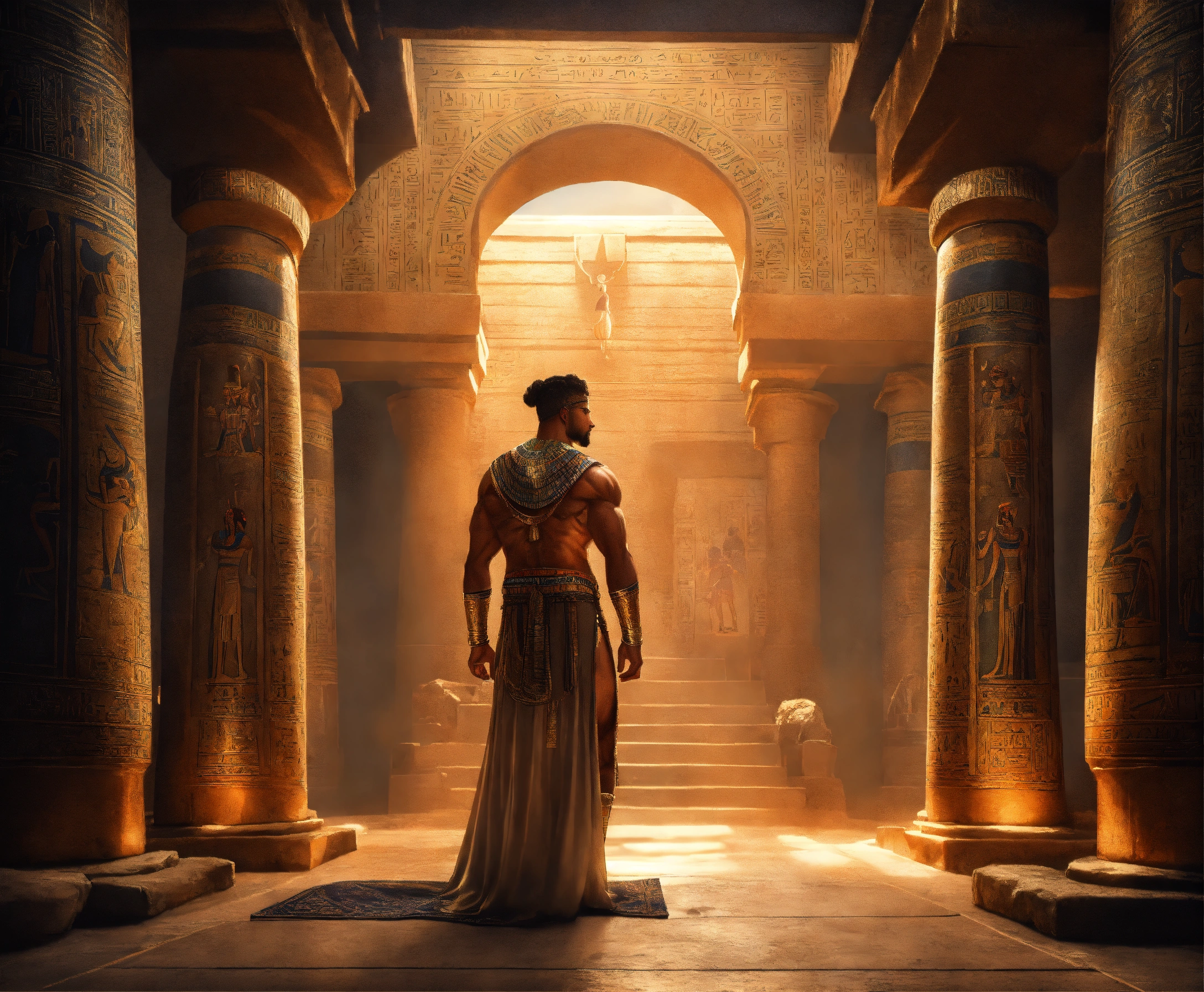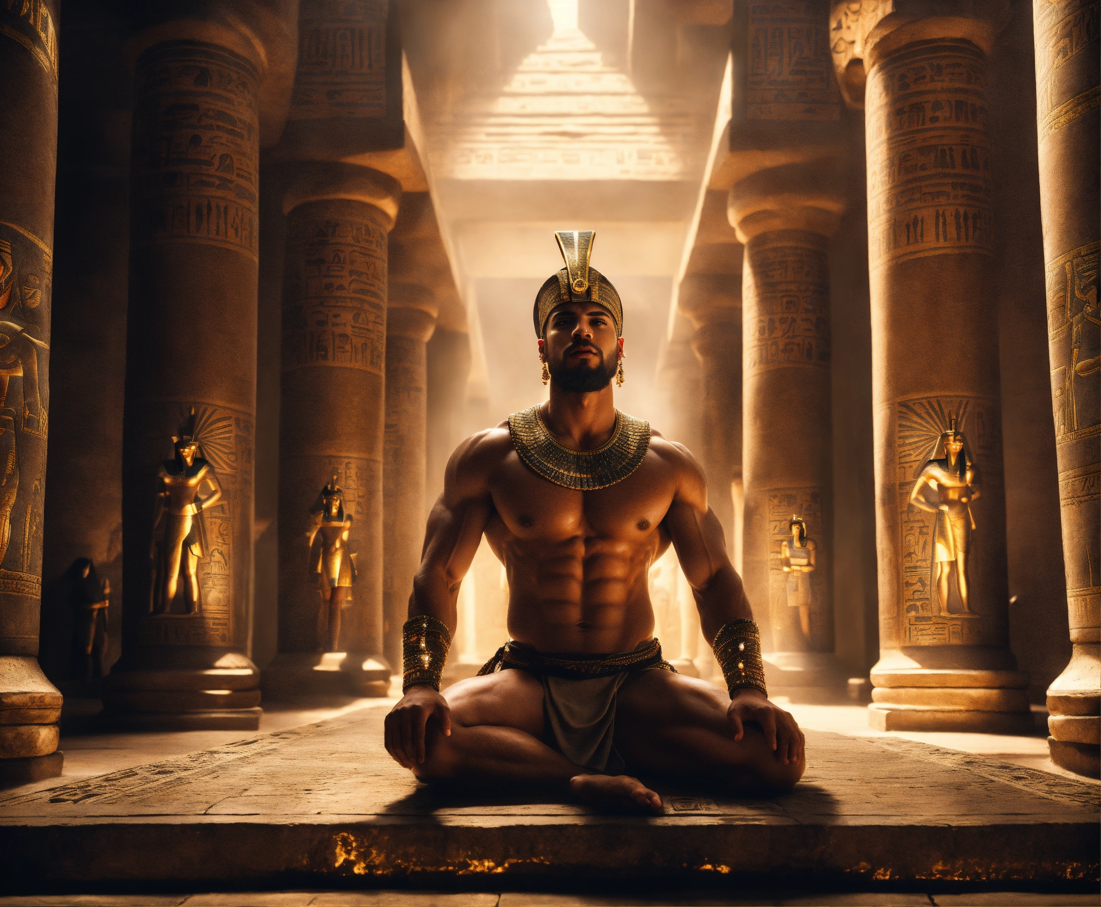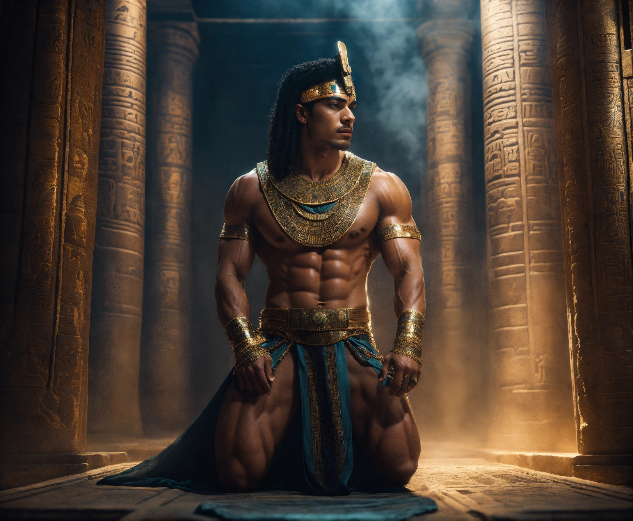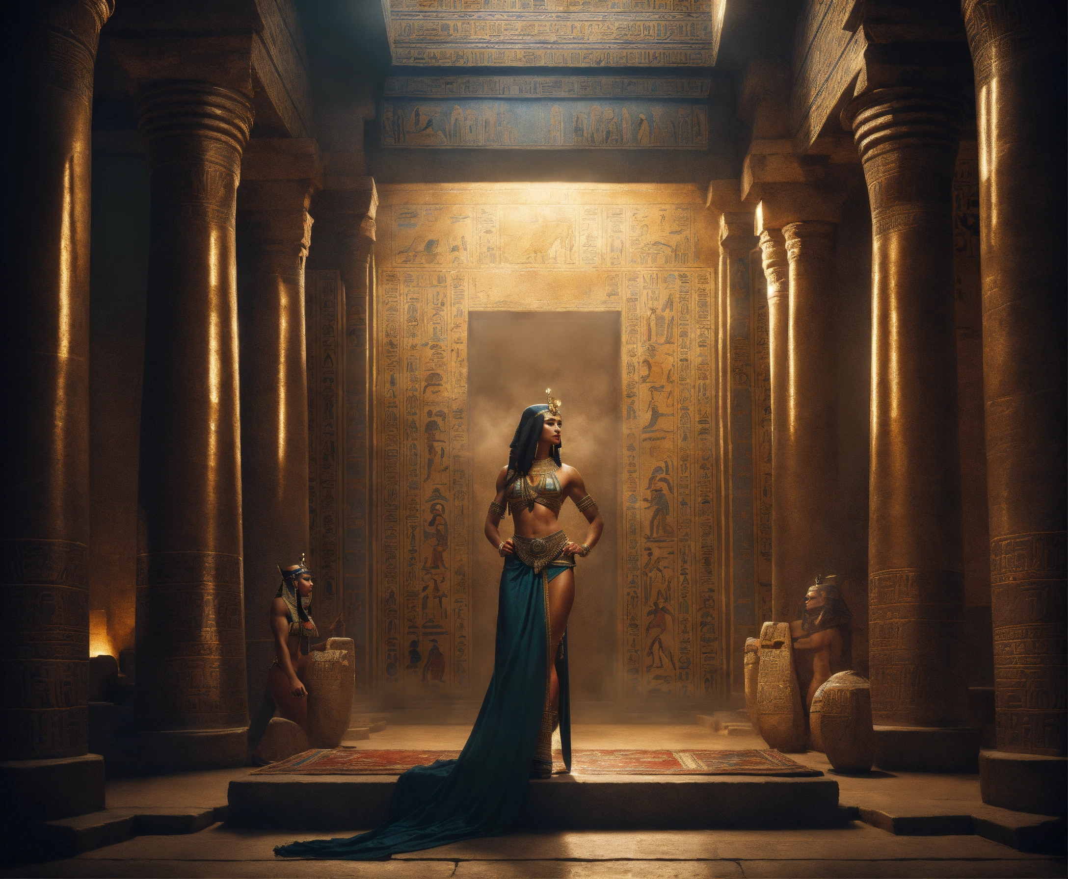 An epic fantasy scene in ancient egypt featuring four muscular males captured a gorgeous and beautiful egyptian odalisque in attractive outfit in a dark vault, misty and mysterious atmosphere, cinematic view, sharp detail