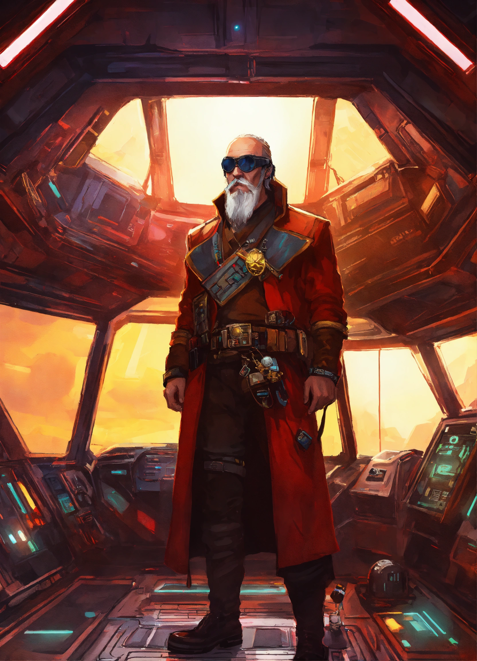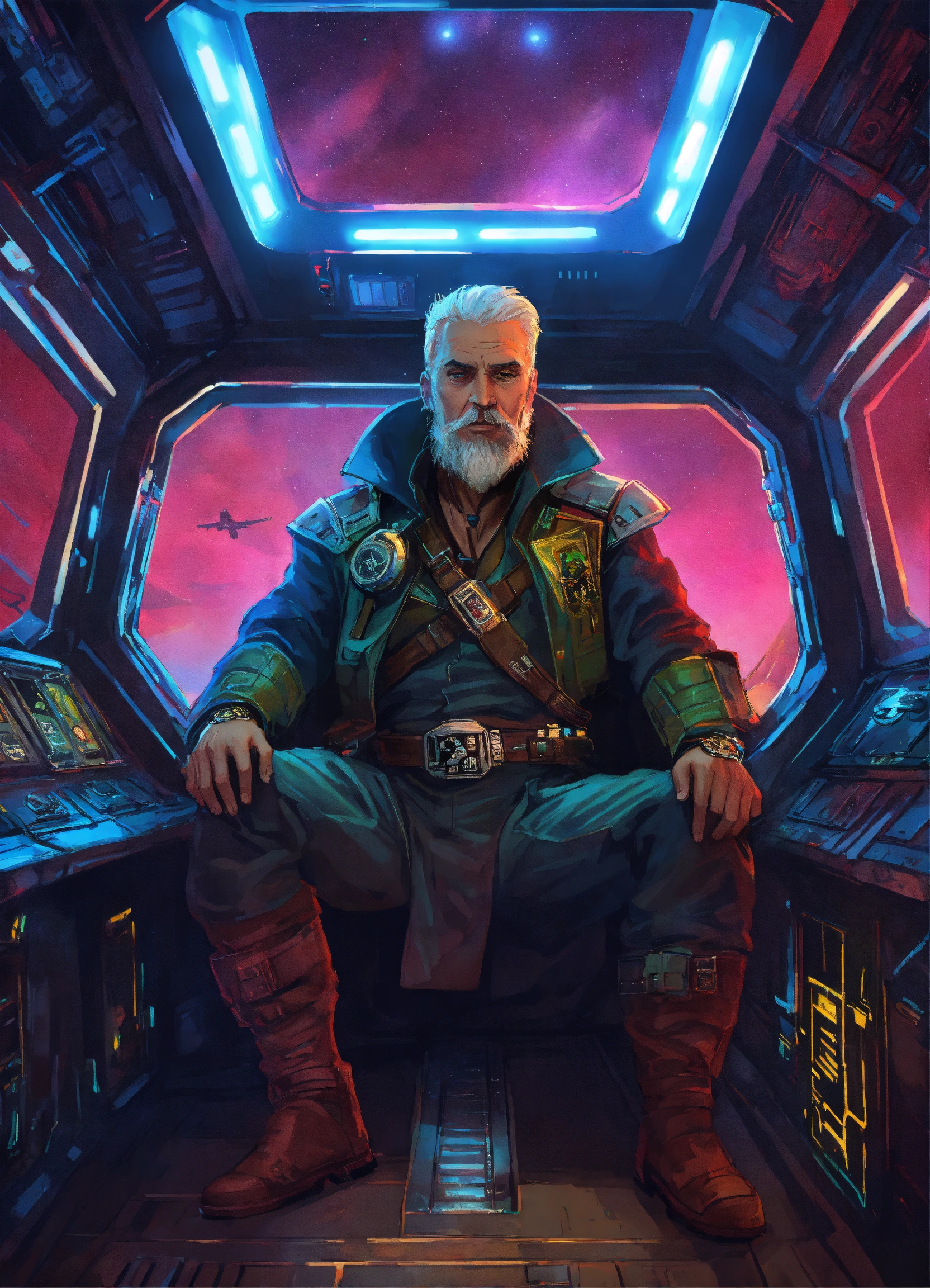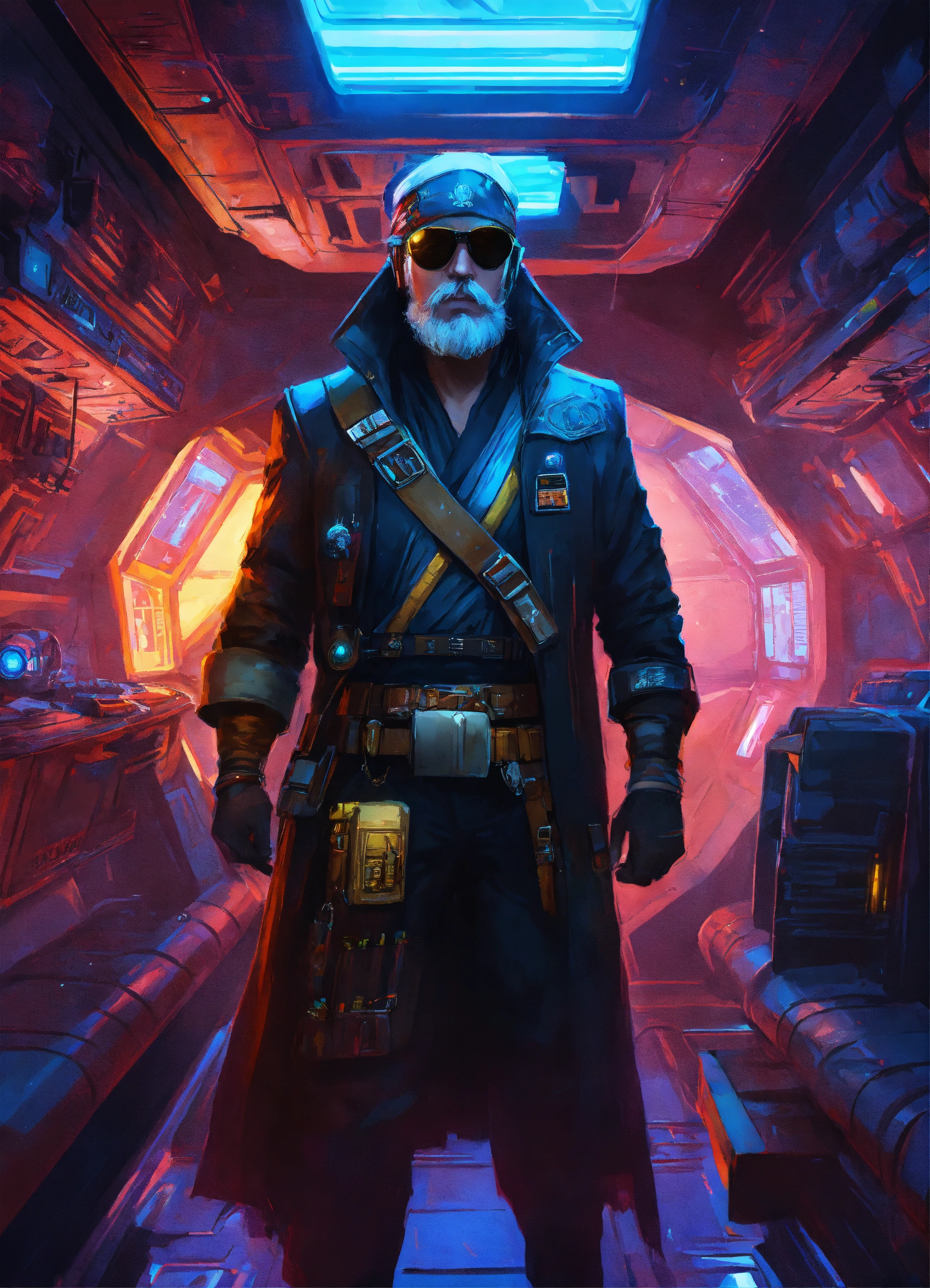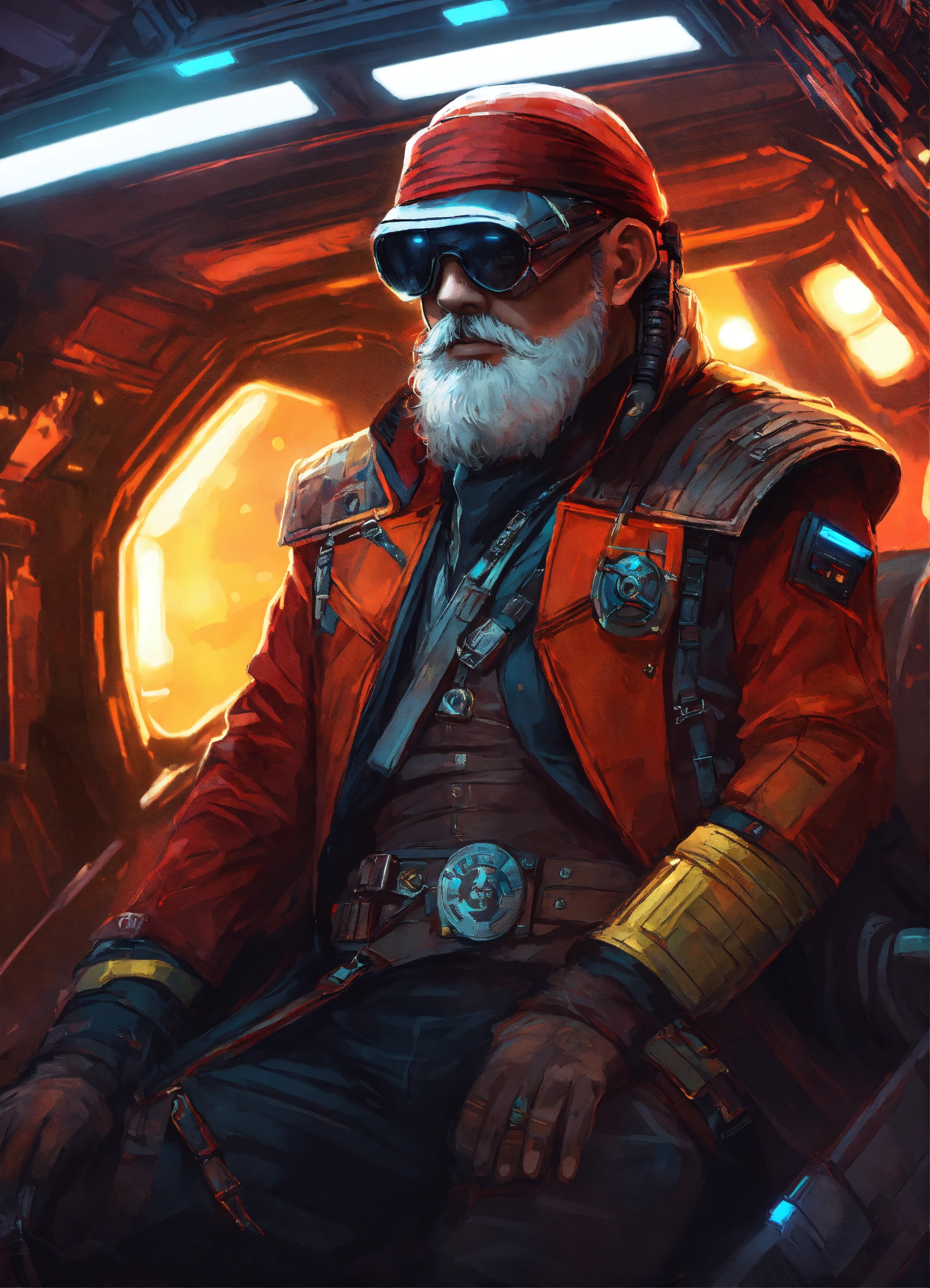 Digital art of an old cyberpunk pirate captain in a star wars spaceship