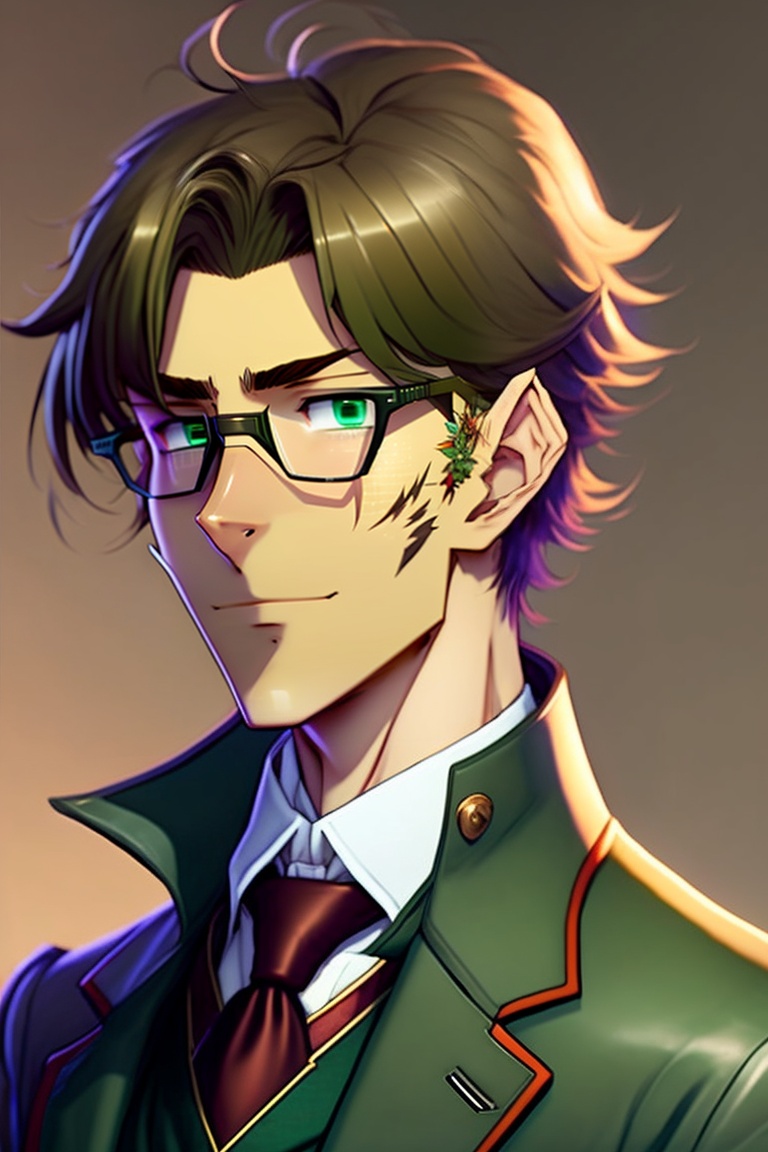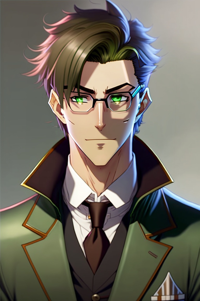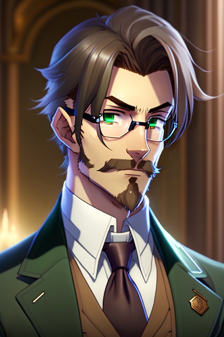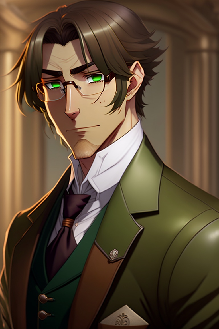 Maes hughes wearing glasses, from fullmetal alchemist, he is an investigator, with dark green eyes, brown jacket, white shirt, black tie, medieval fantasy, messy deep dark short hair, very short beard