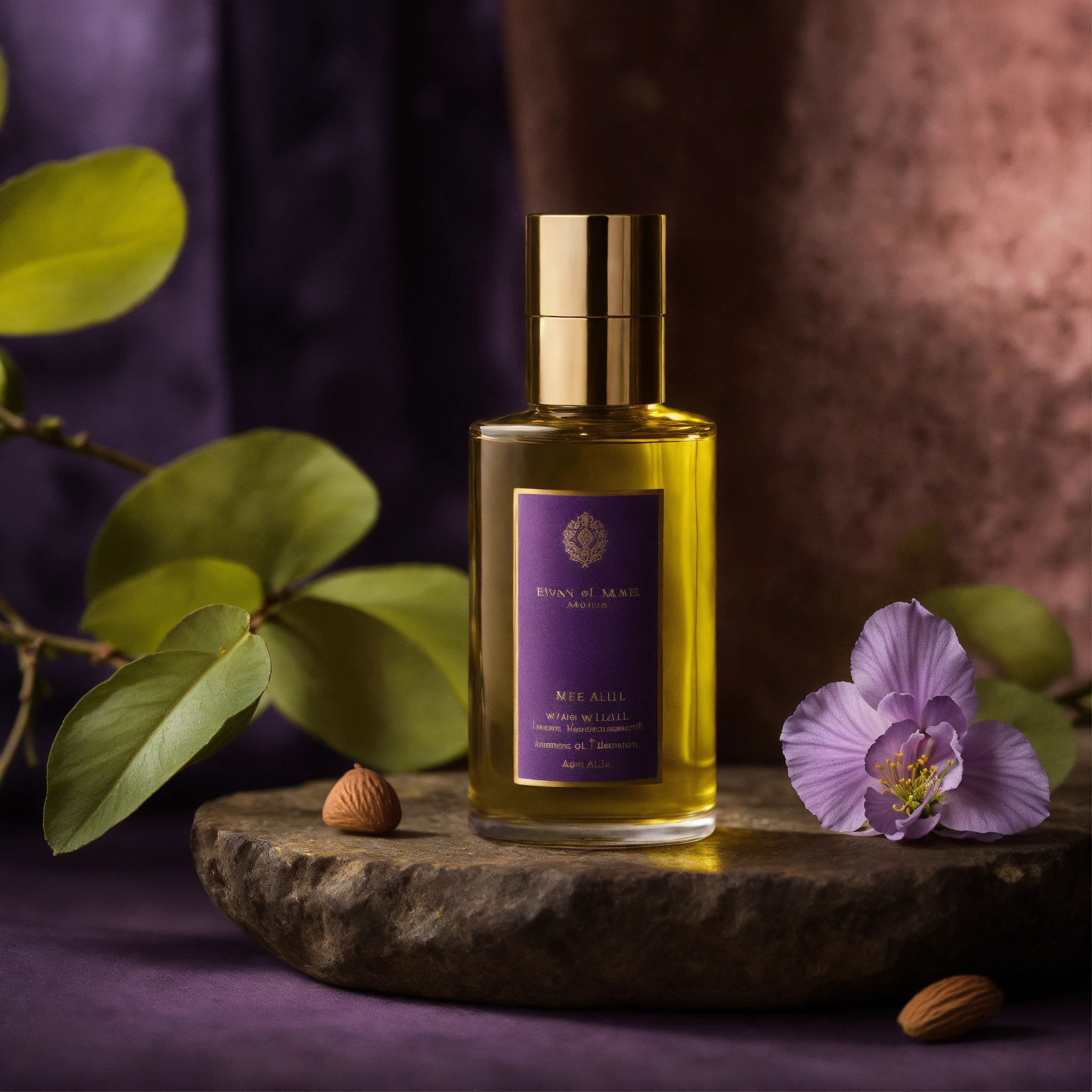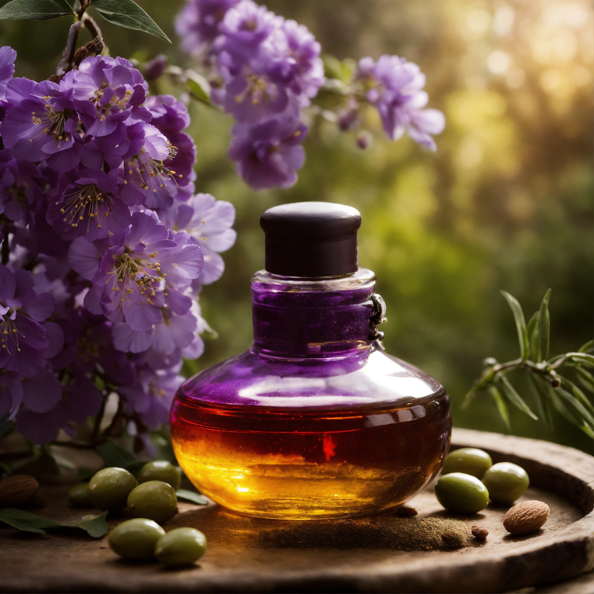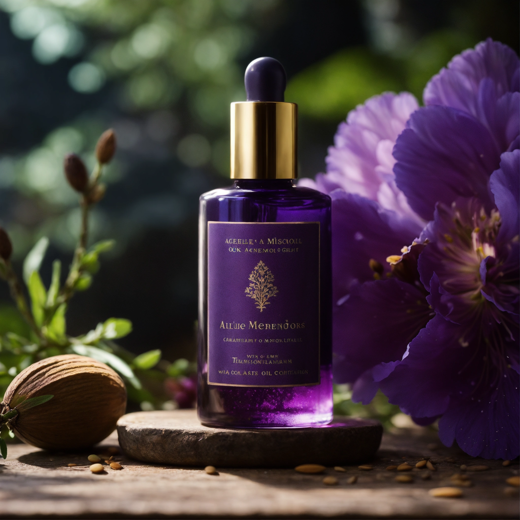 "envision a potion that carries whispers from ancient groves and tales from moonlit meadows - that is our skincare gem, a confluence of nature's oils and a serene purple embrace. your mission is to transcend mere product photography; this is about capturing soul. reflect upon the ageless stories that oils from olives, almonds, or evening primrose might tell. now, pair that with the luxurious mystique of royal purple - the hue of emperors, poets, and dreamers. with every click of your shutter, seek to unravel the allure of this potion, its promise, and its poetic journey from nature's heart to modern-day vanity.