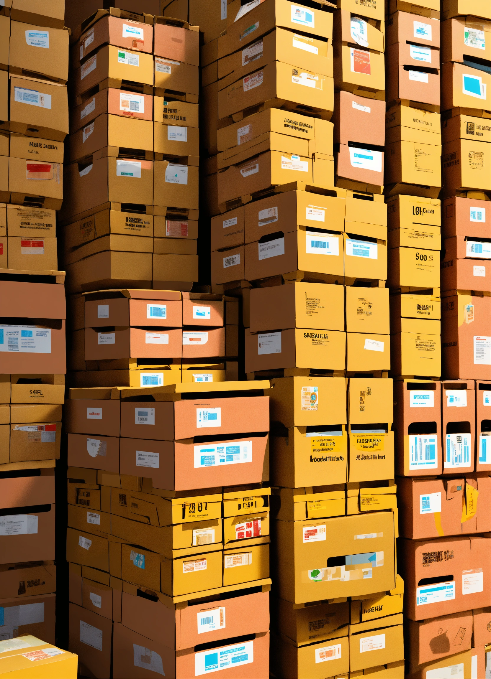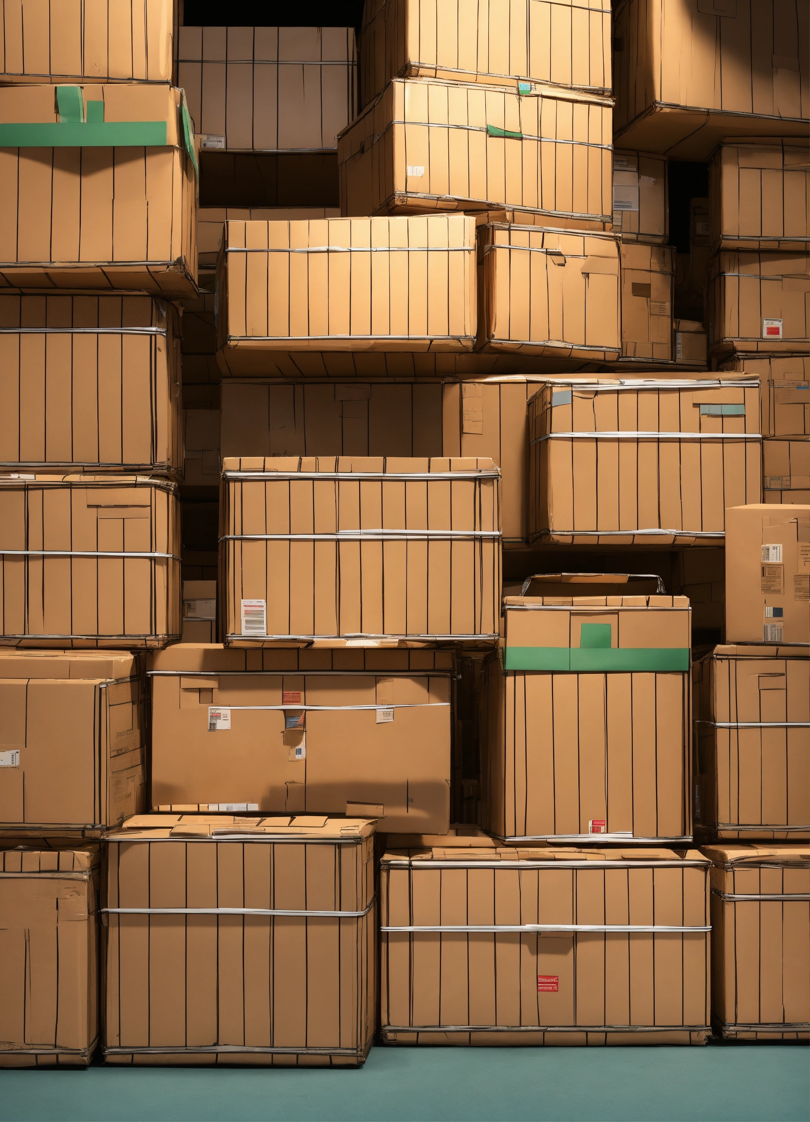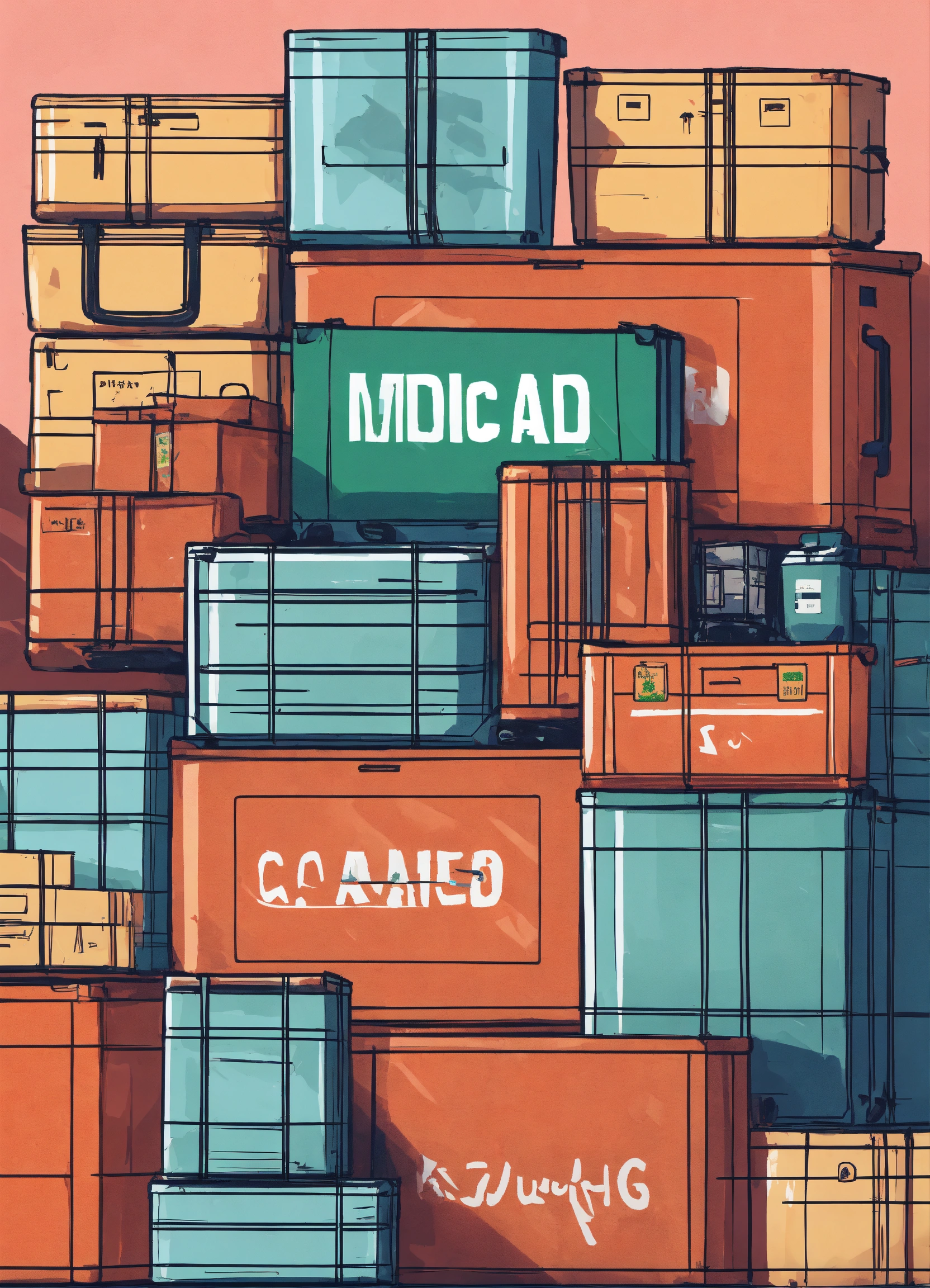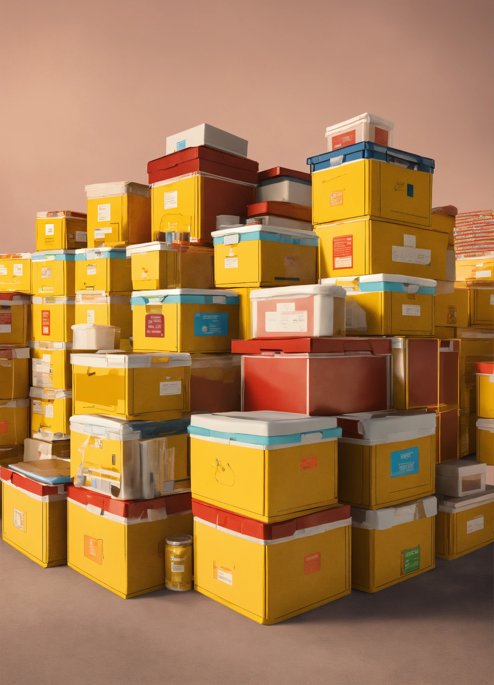 Numerous relief boxes stacked neatly on top of each other, containing aid supplies such as medicine, food, and medical equipment rendered as an illustration.