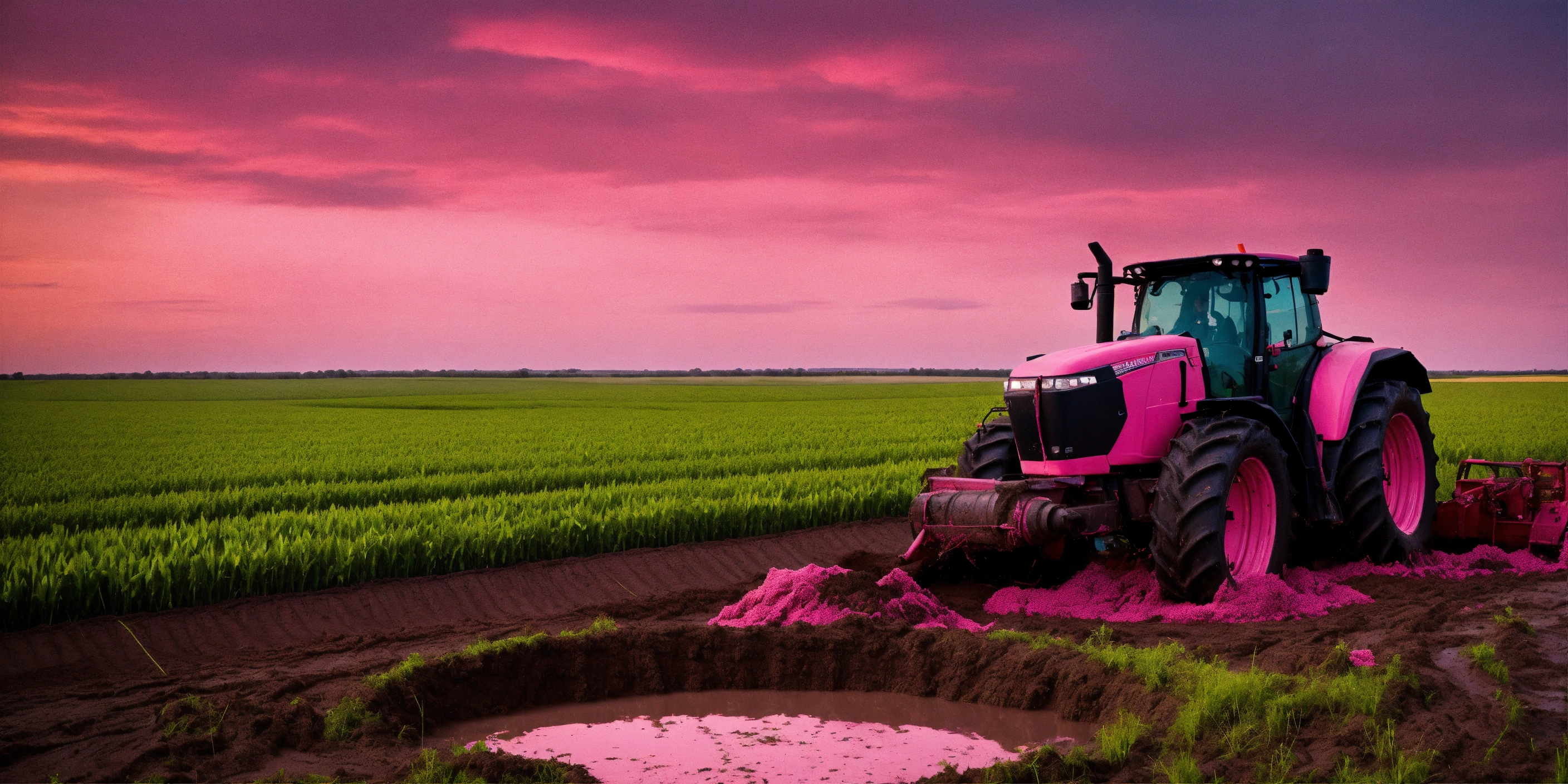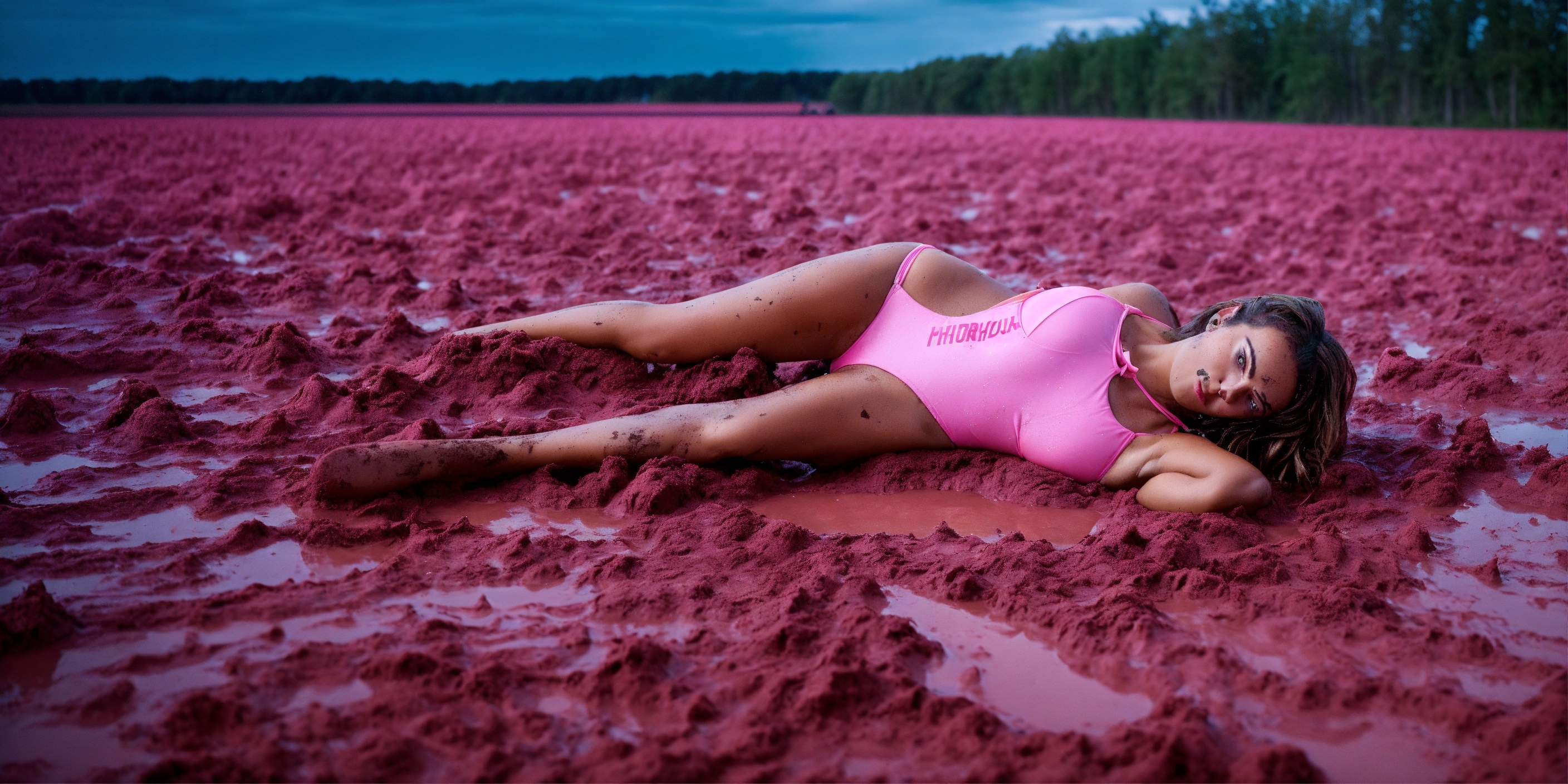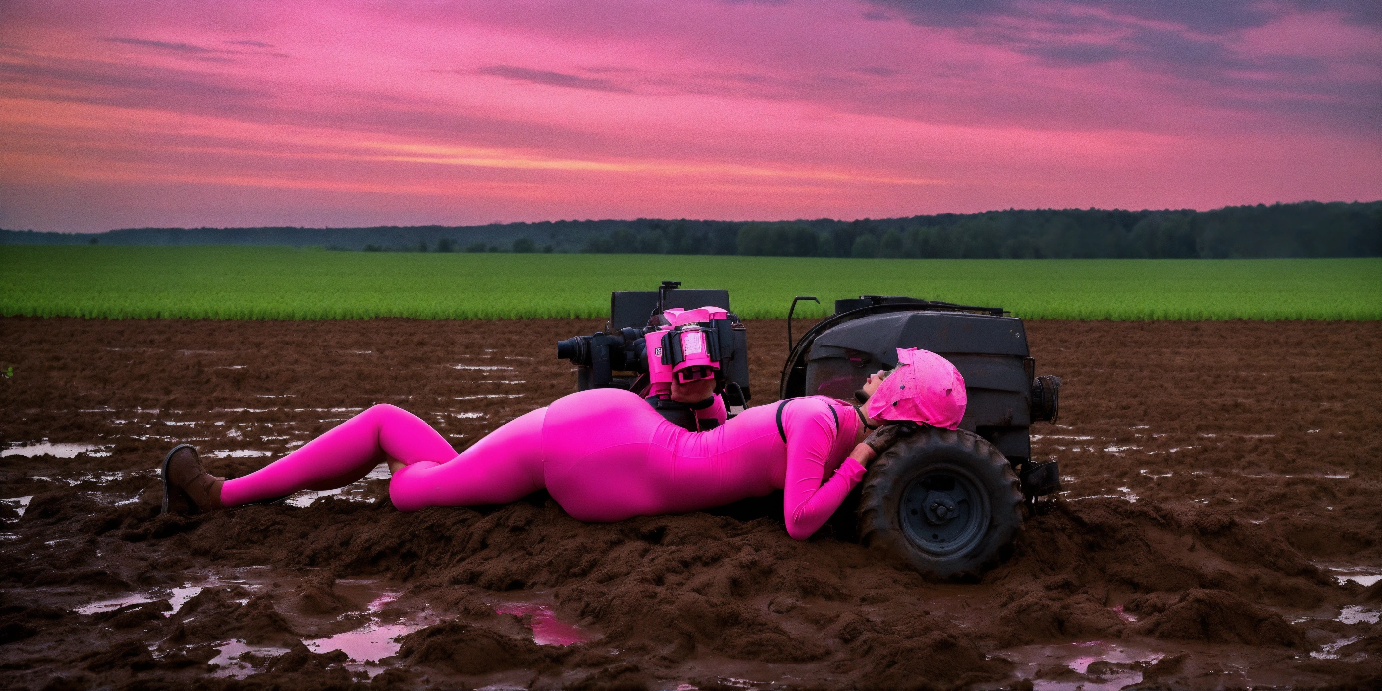 At night, a woman clad in a pink swimsuit and with her face camouflaged in matching pink, lies concealed in the mud. through her binoculars, she secretly watches combines and tractors in a faraway field