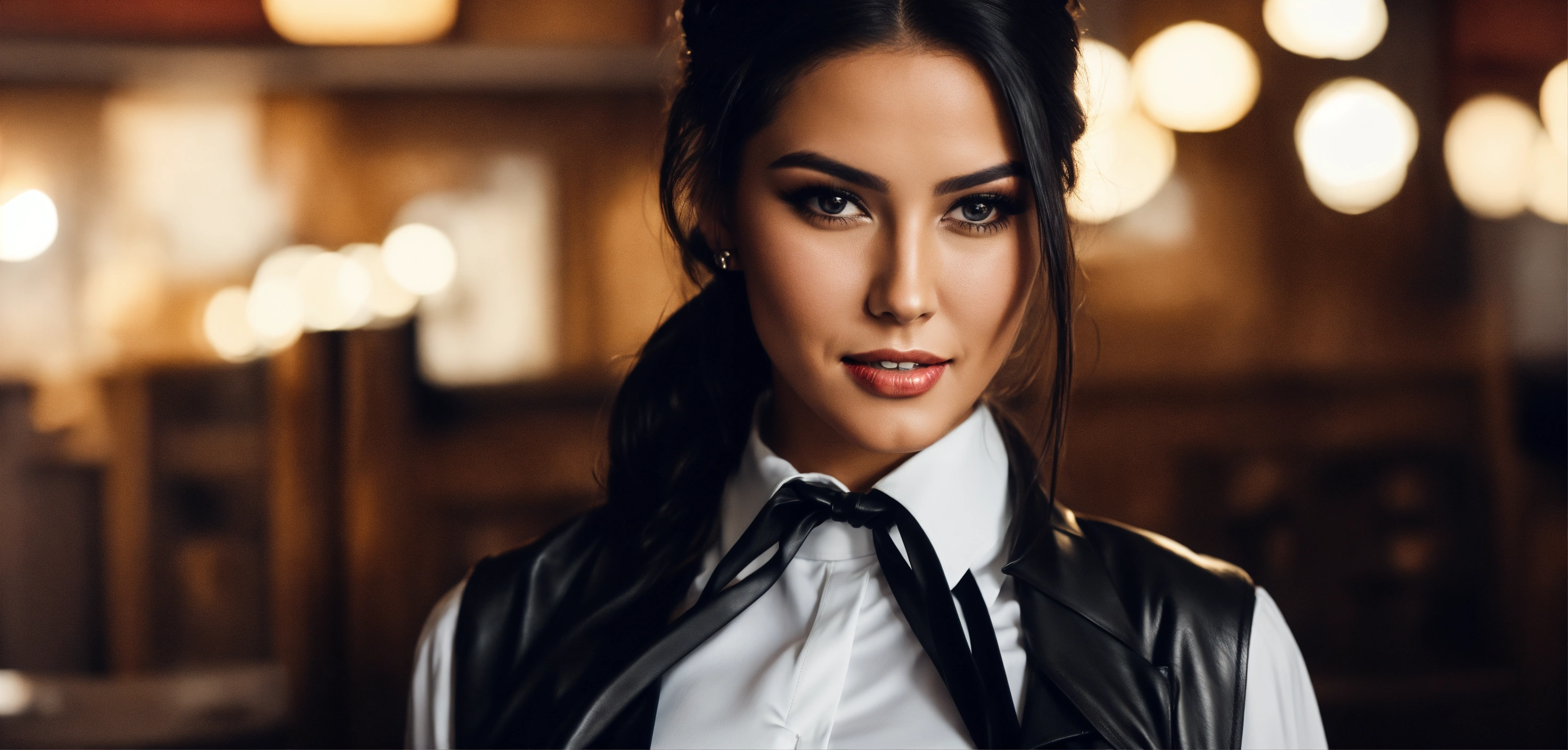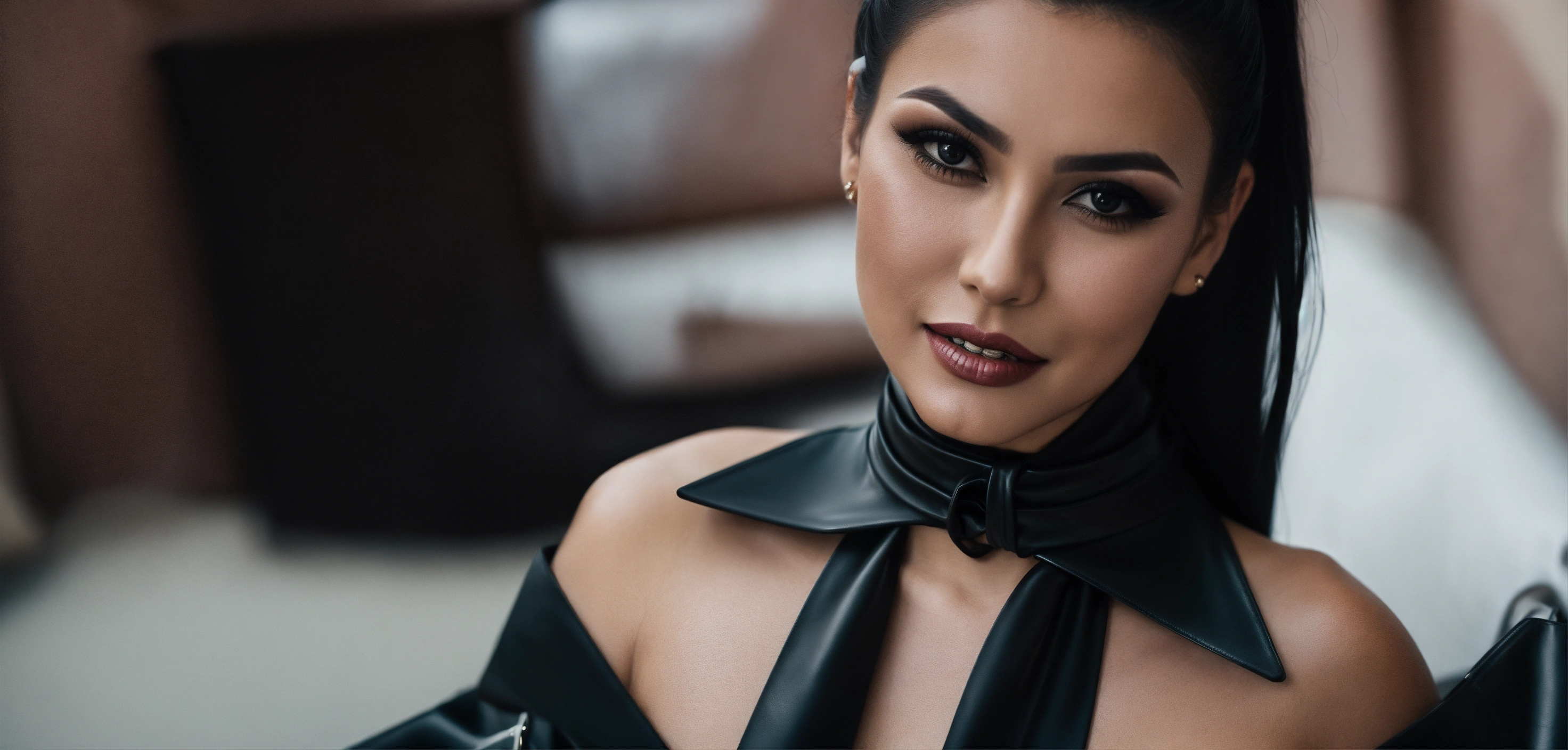 Cinematic look, stunning arab seductress women fashion model, arrogant evil smile from above, black straight hair high ponytail, black leather corset, white shirt with black necktie, black leather skirt