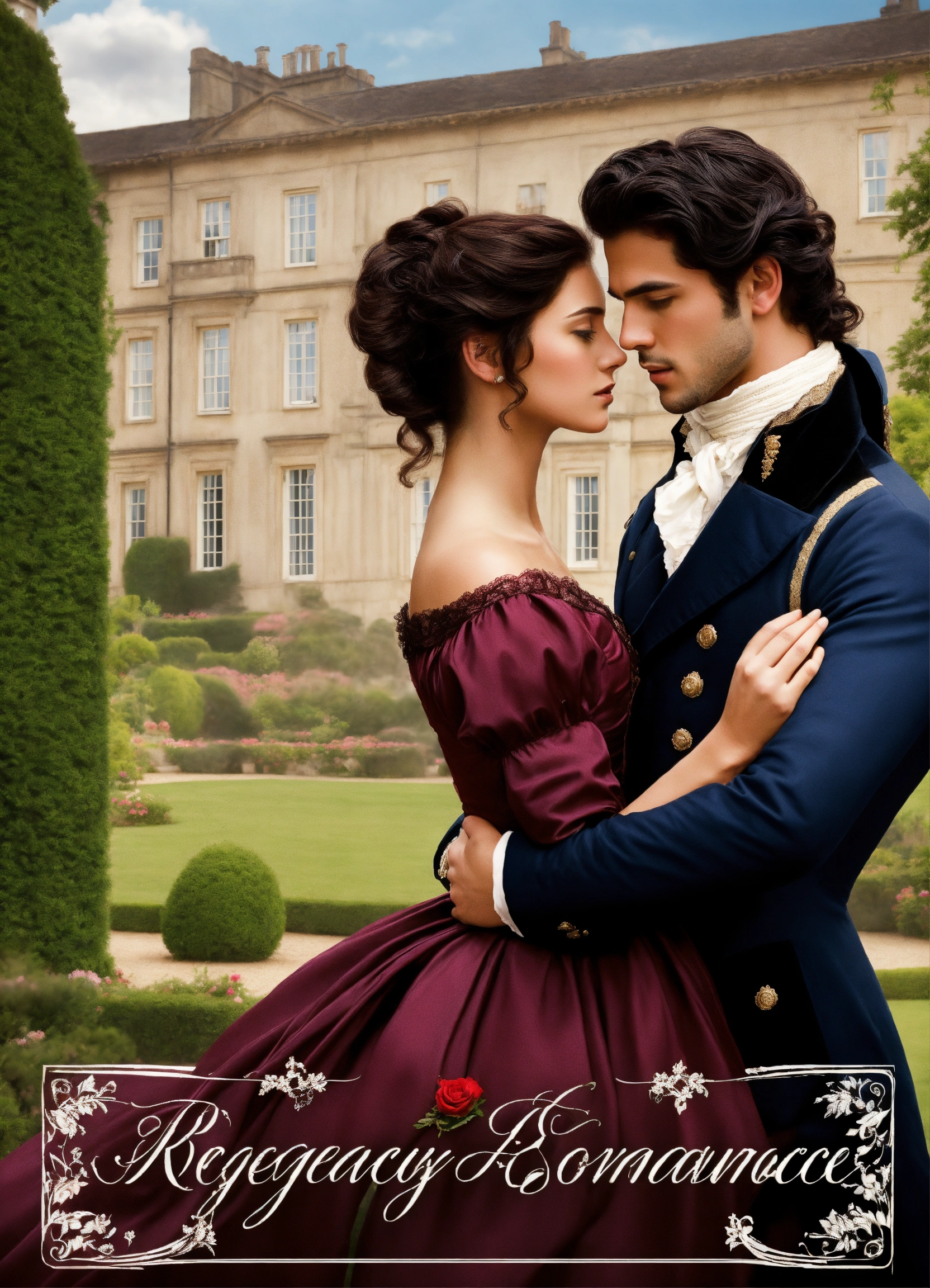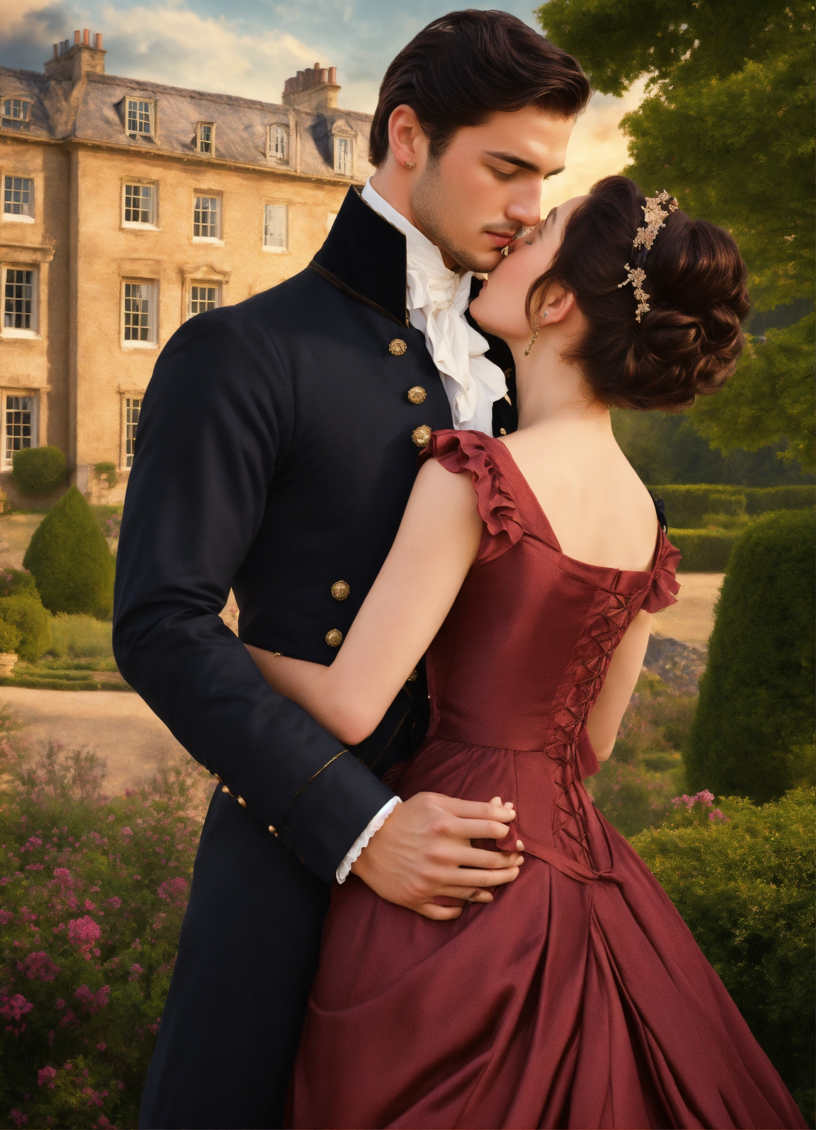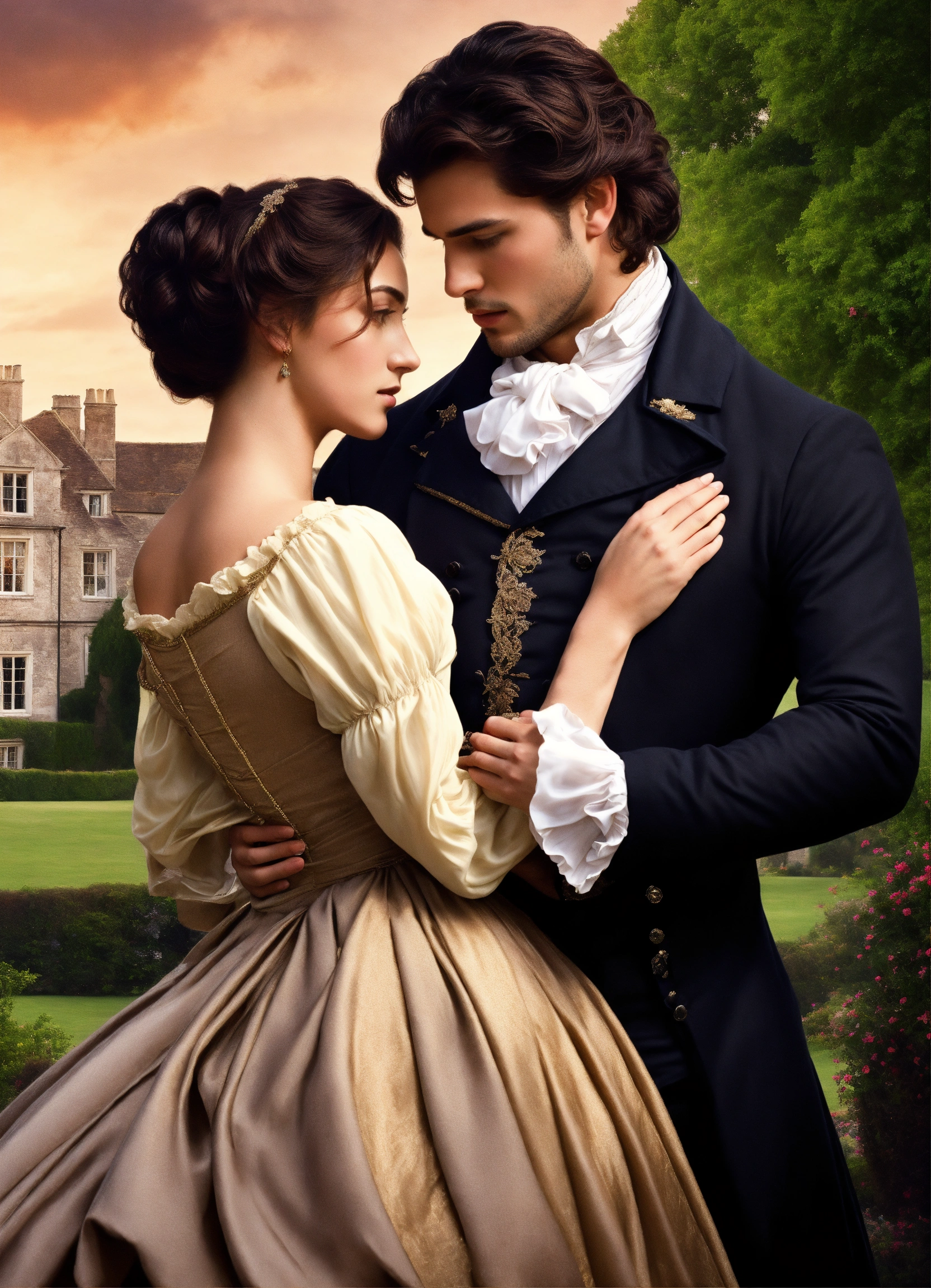 Regency romance cover, young attractive regency woman with brown hair pinned up and a handsome man with tousseled black hair, romantic embrace, romantic manor in the background