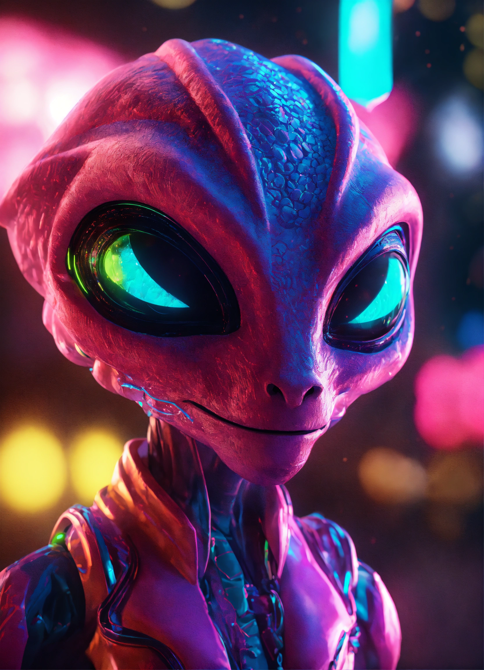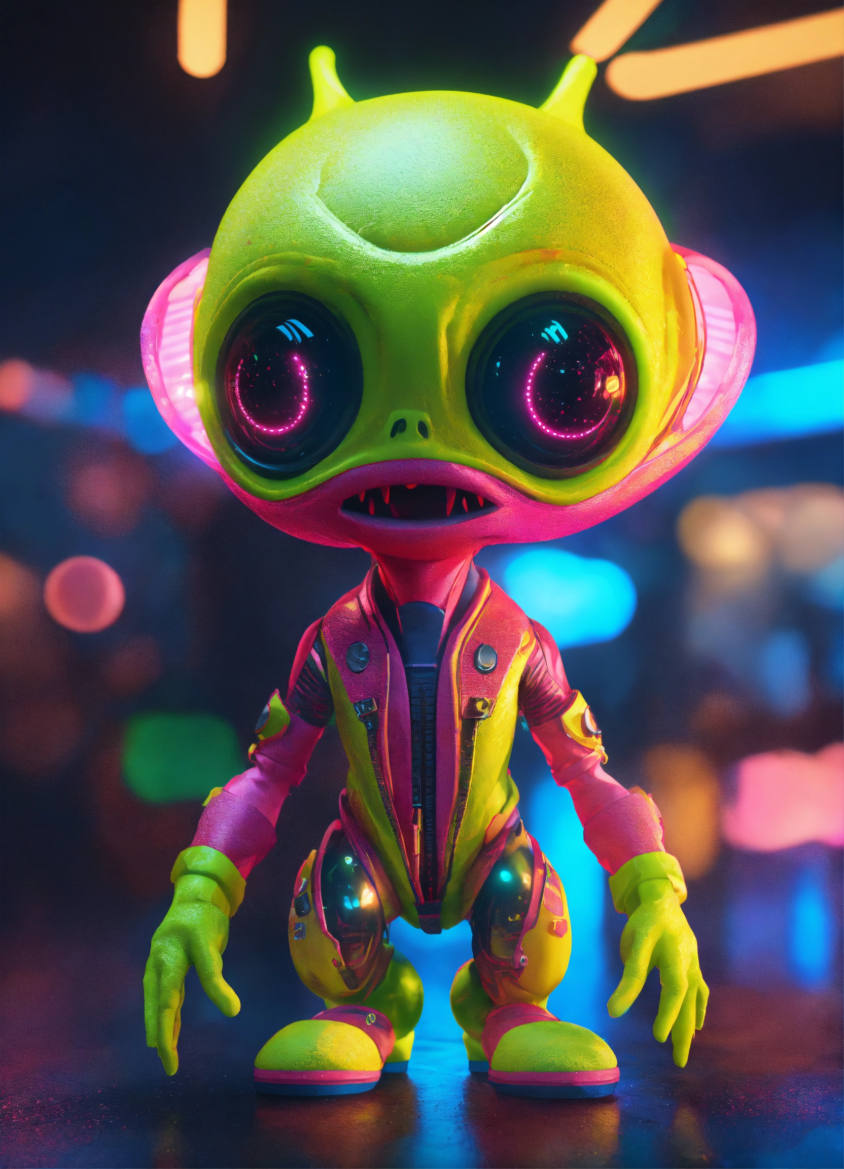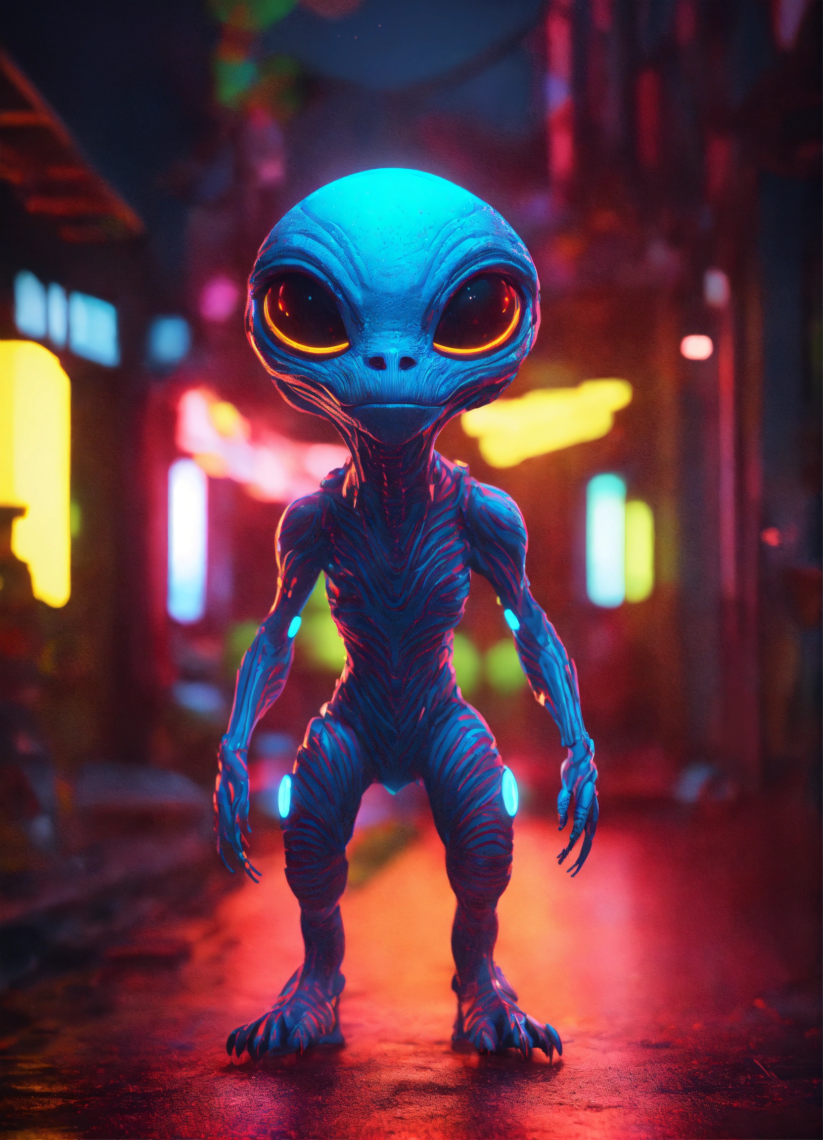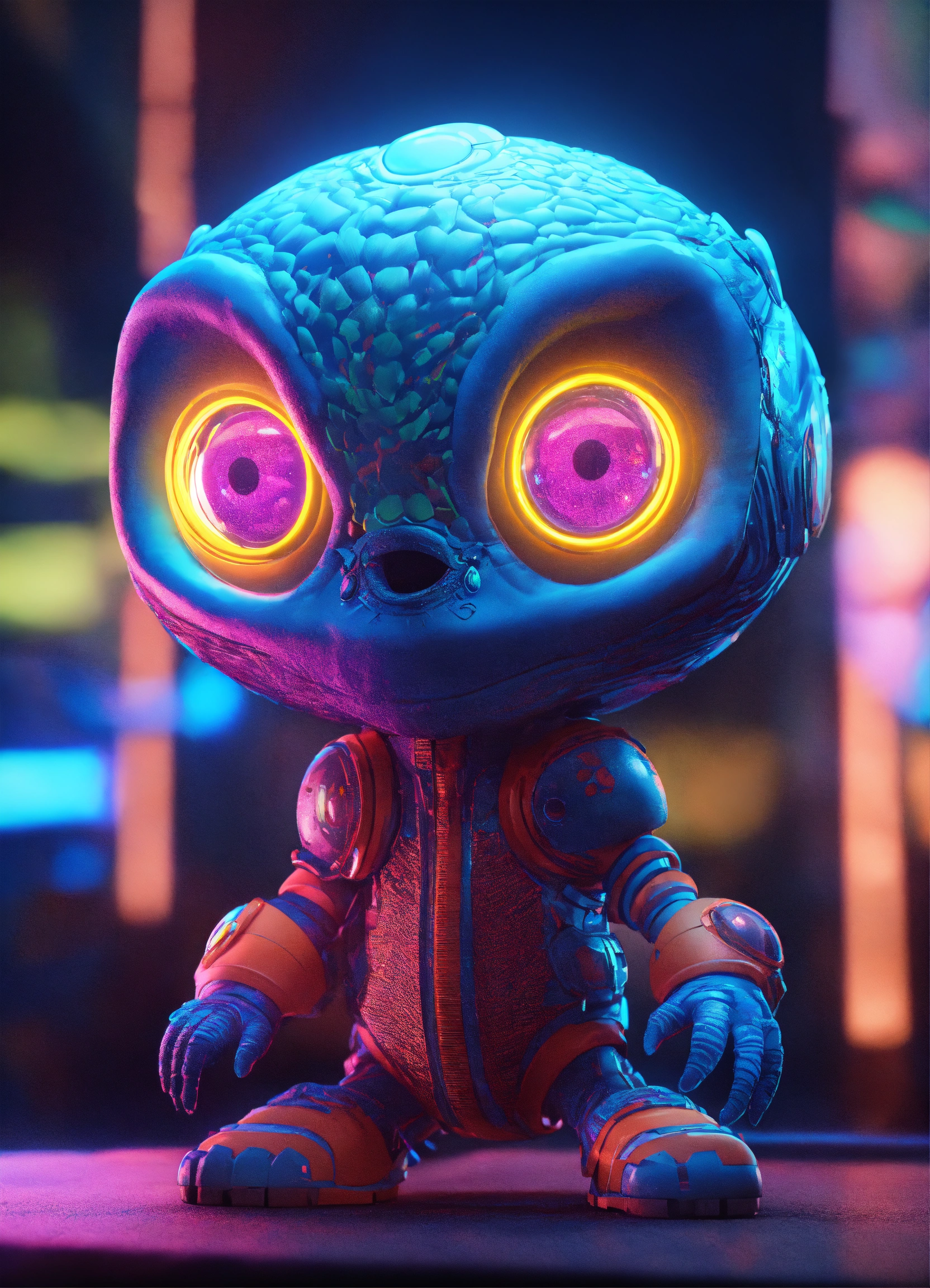 Cute alien monster, full-body, neon glow colors, highly intricate details, 3d, cgi, realistic light, trending on cgsociety, glowing eyes, facing camera, neon details, ultra realistic details, portrait, sci fi atmosphere, global illumination, shadows, octane render, 8 k, ultra sharp