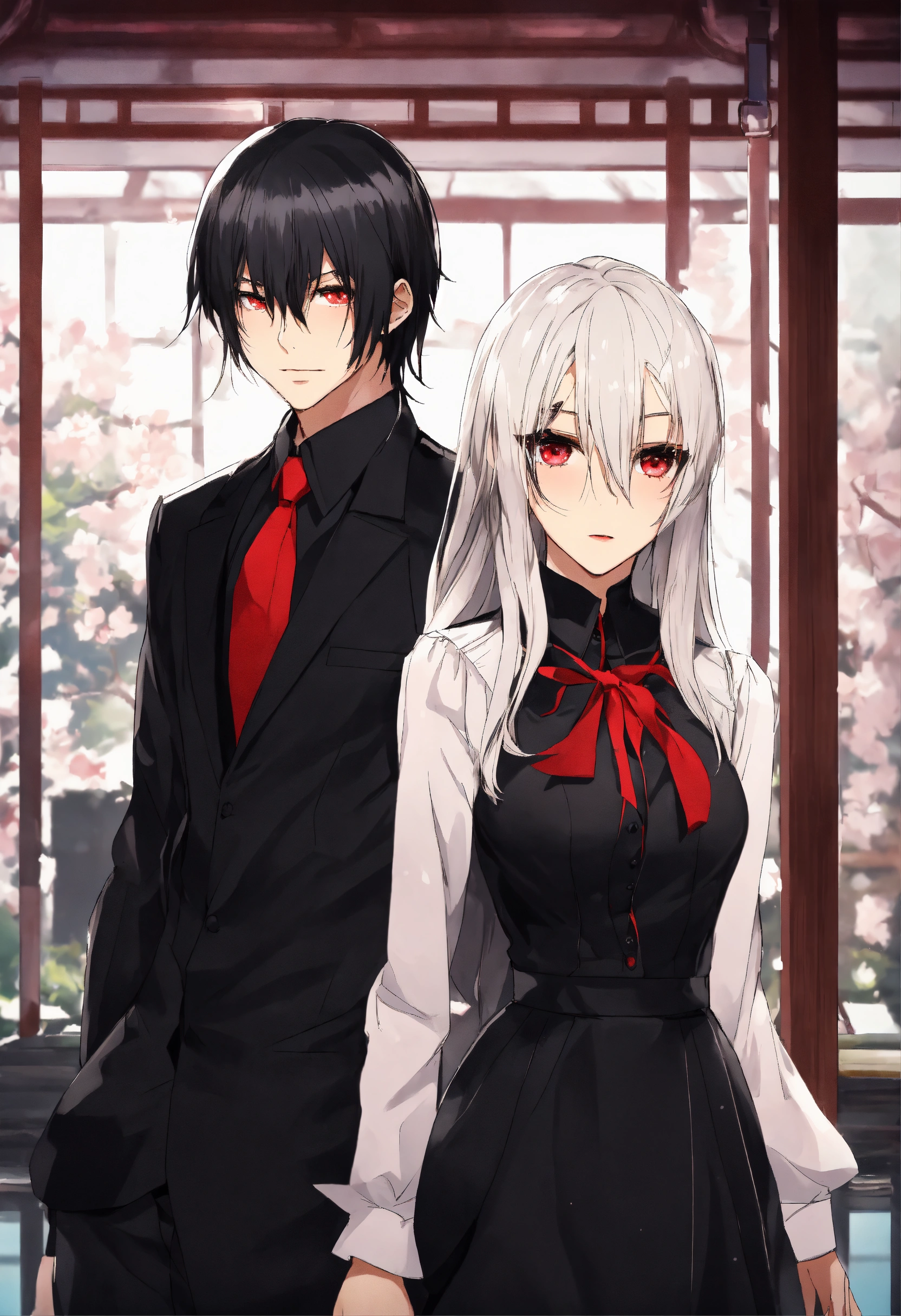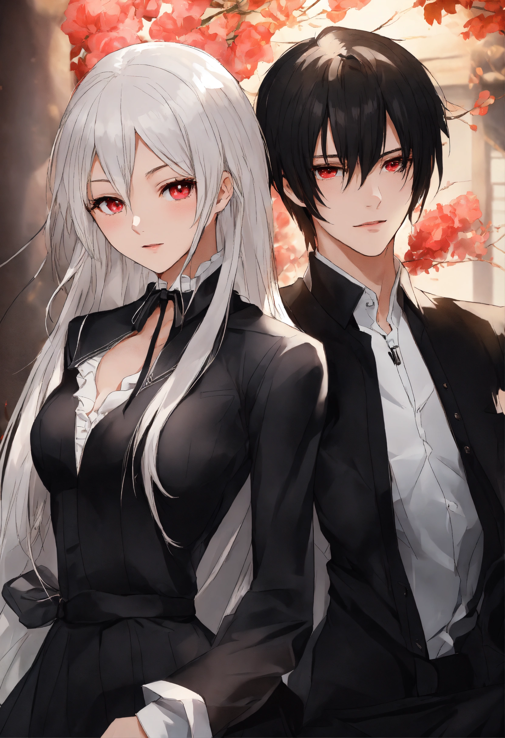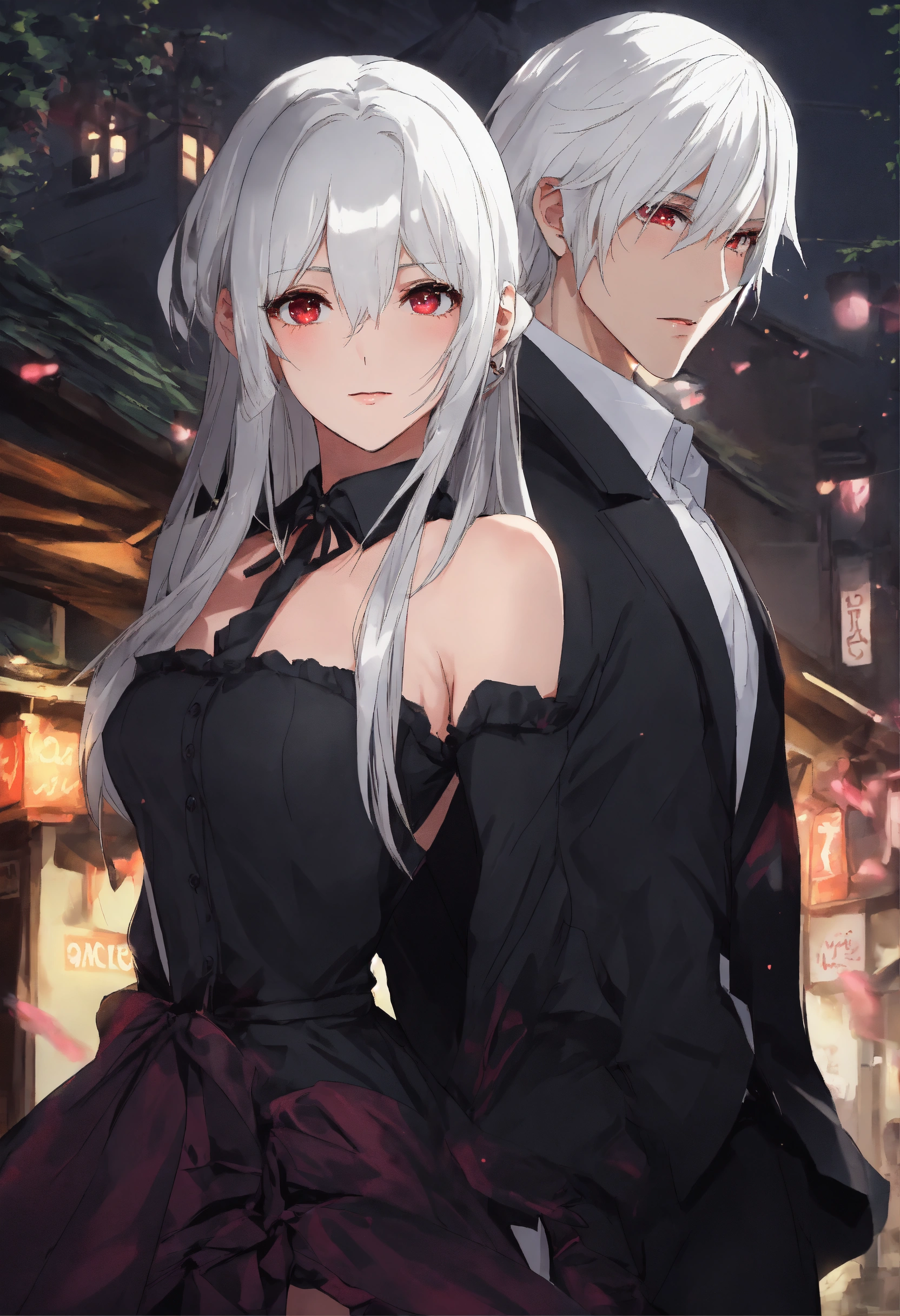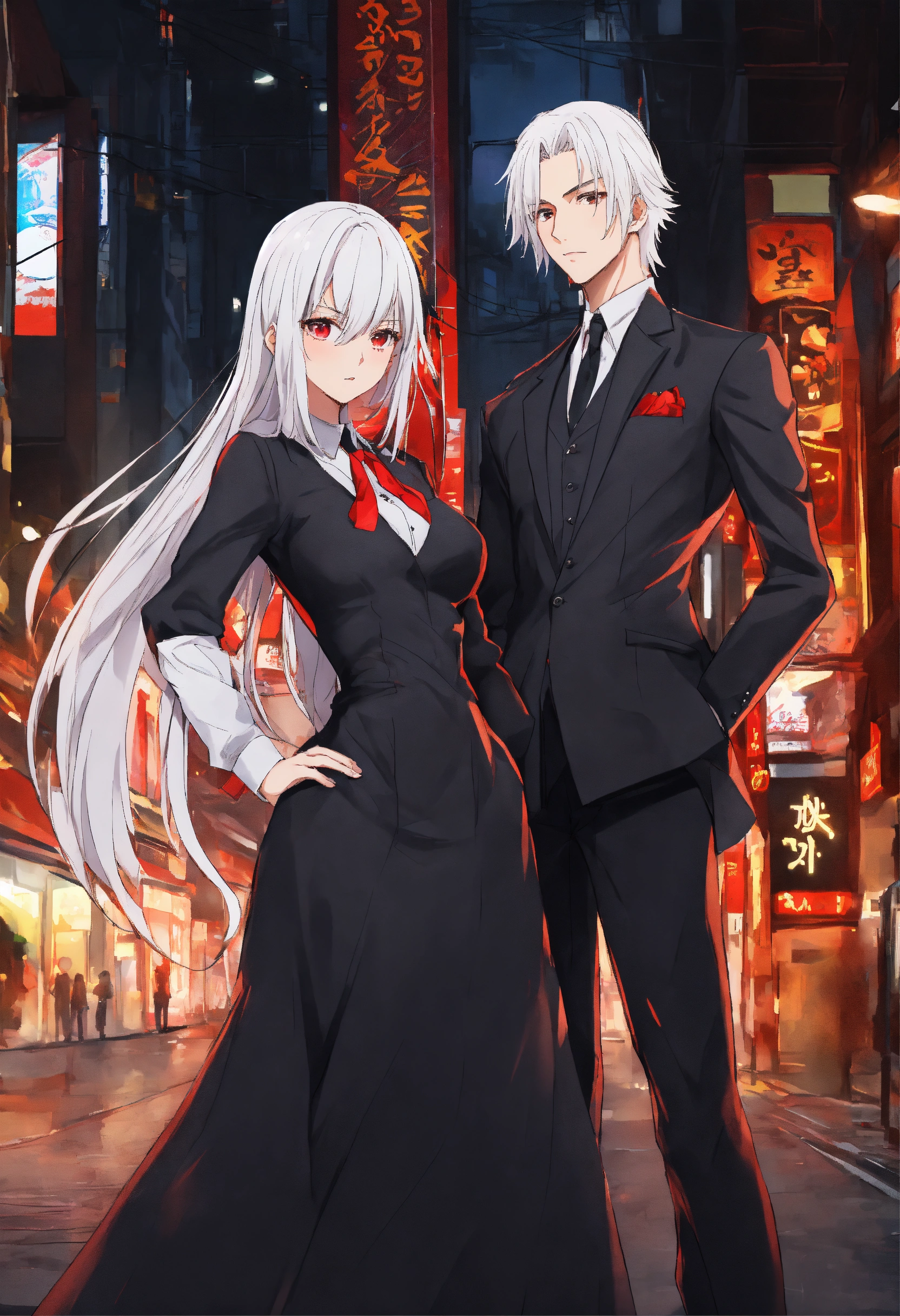 Guy and girl 20 years old. twins. the girl has white long straight hair. the guy has white short straight hair. sharp, cruel facial features. scarlet eyes. height 180 cm guy. girl height 175. anime reskin style. the guy is wearing a black formal shirt. the girl is dressed in a black dress. background black