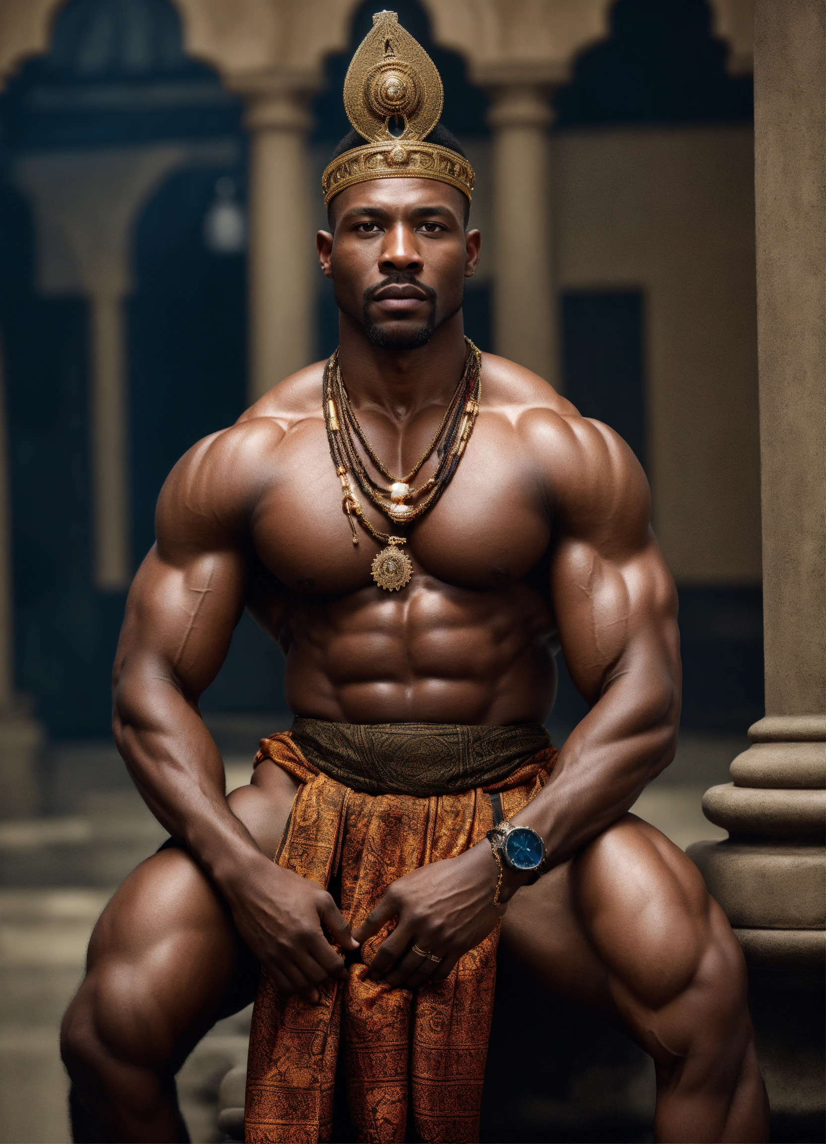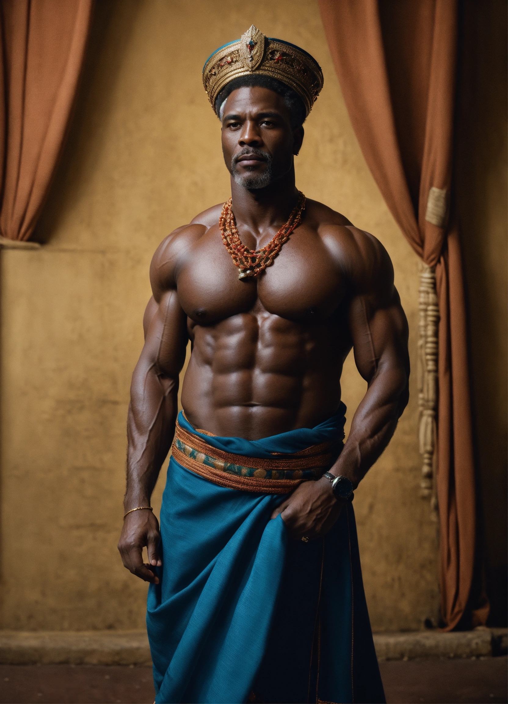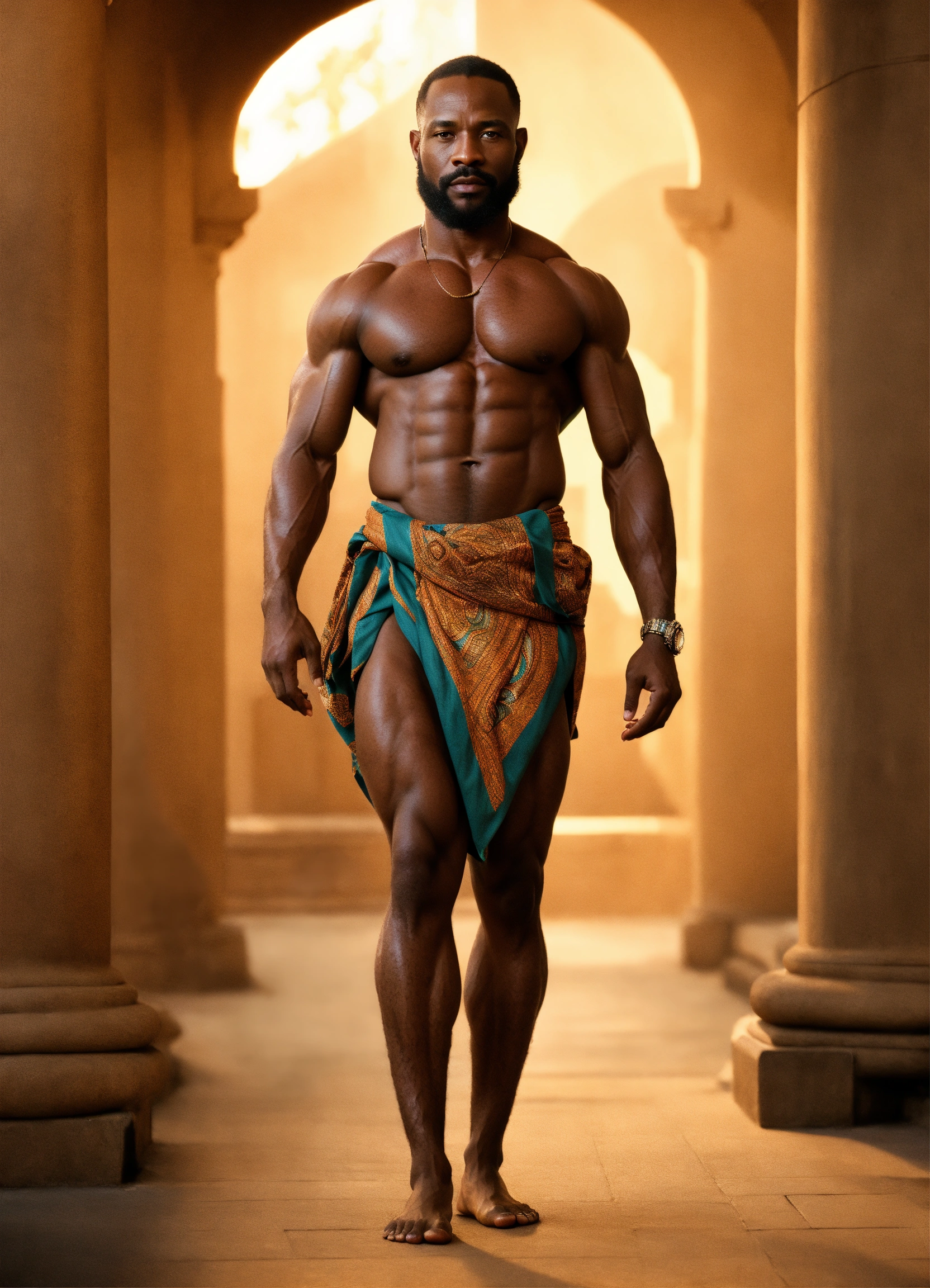 Portrait of a stunningly beautiful middle age african king in soft light, mister olympia anatomy, broad muscle legs, big delts, ripped, intricate, elegant, depth of field, zeiss lens, detailed, symmetrical, centered, fashion photoshoot, by annie leibovitz and steve mccurry, david lazar, jimmy nelsson, breathtaking, 8 k resolution, extremely detailed, beautiful, establishing shot, artistic, hyperrealistic, beautiful face, octane render, dressed in sarong