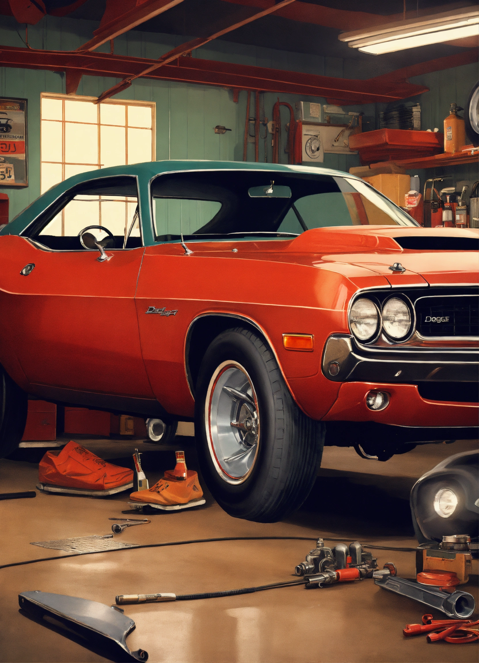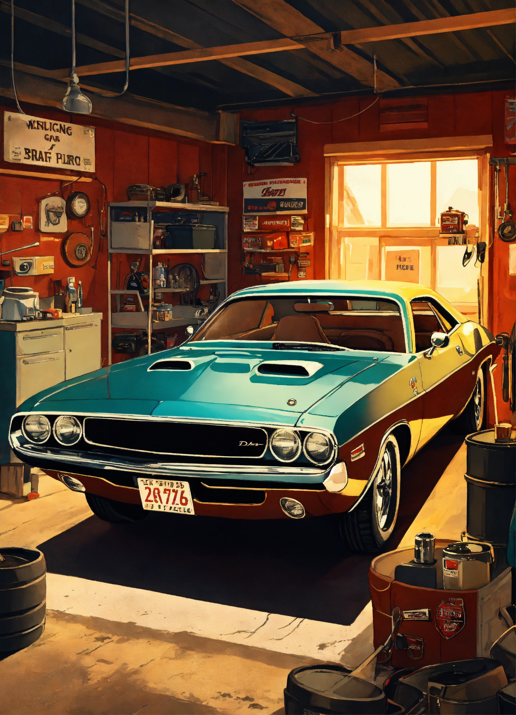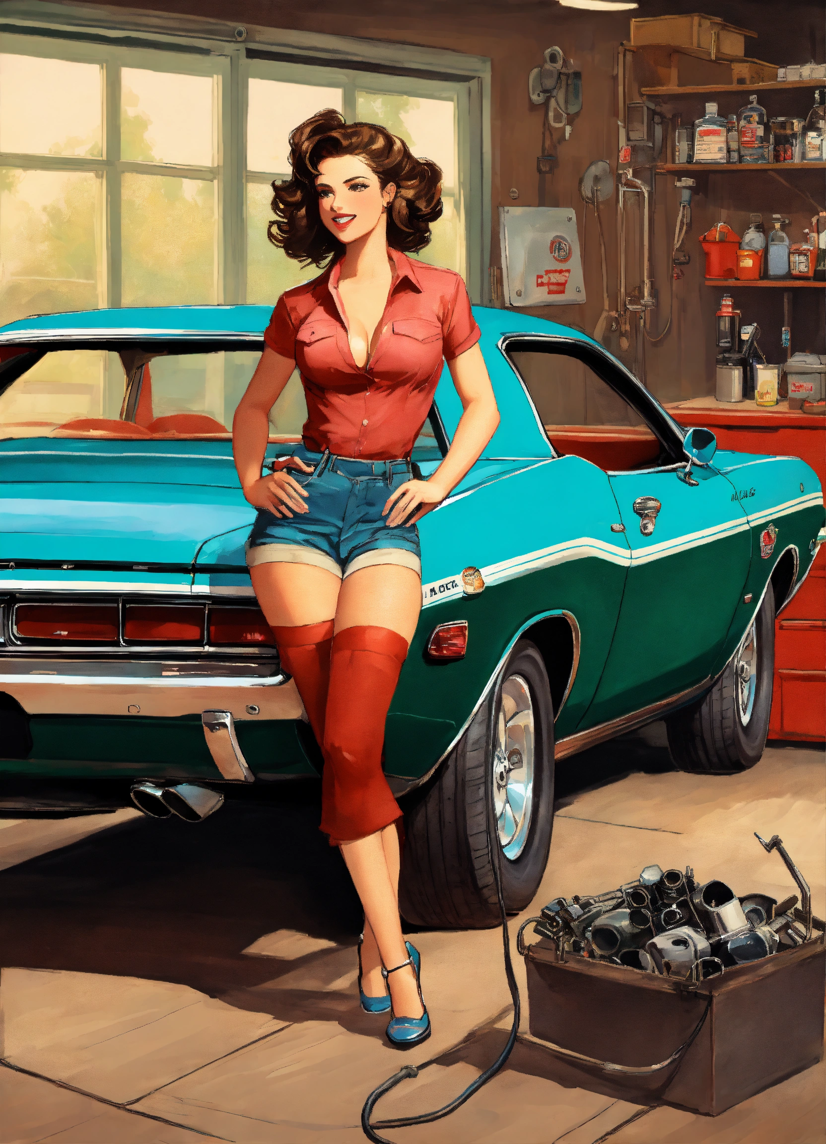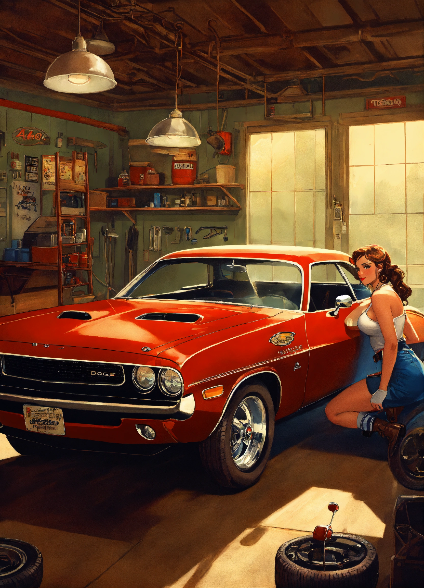 Illustration mechanic's garage scene, vintage atmosphere, with a dodge challenger, mechanic, and pinup, --ar 45 --s 250 --style brut