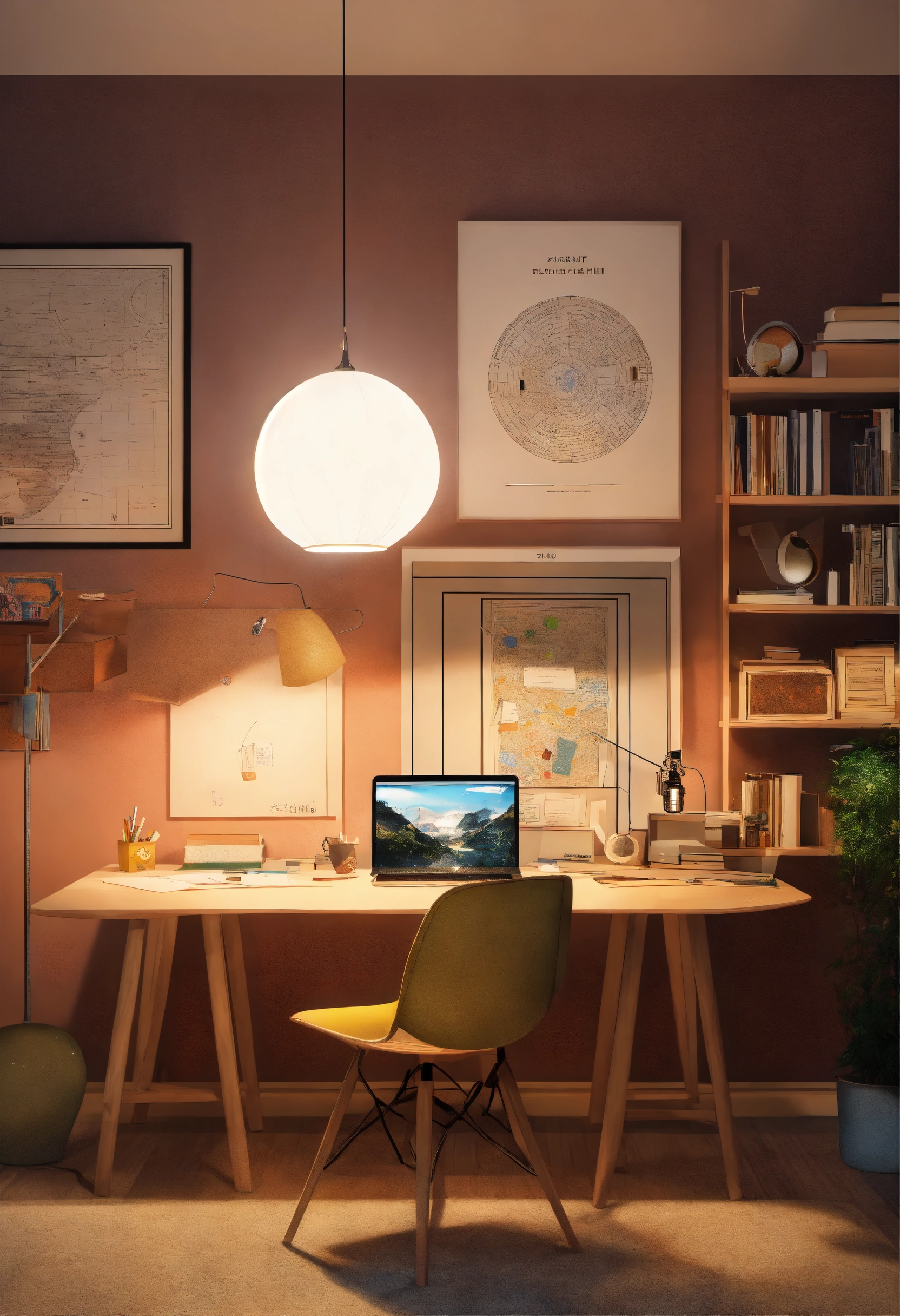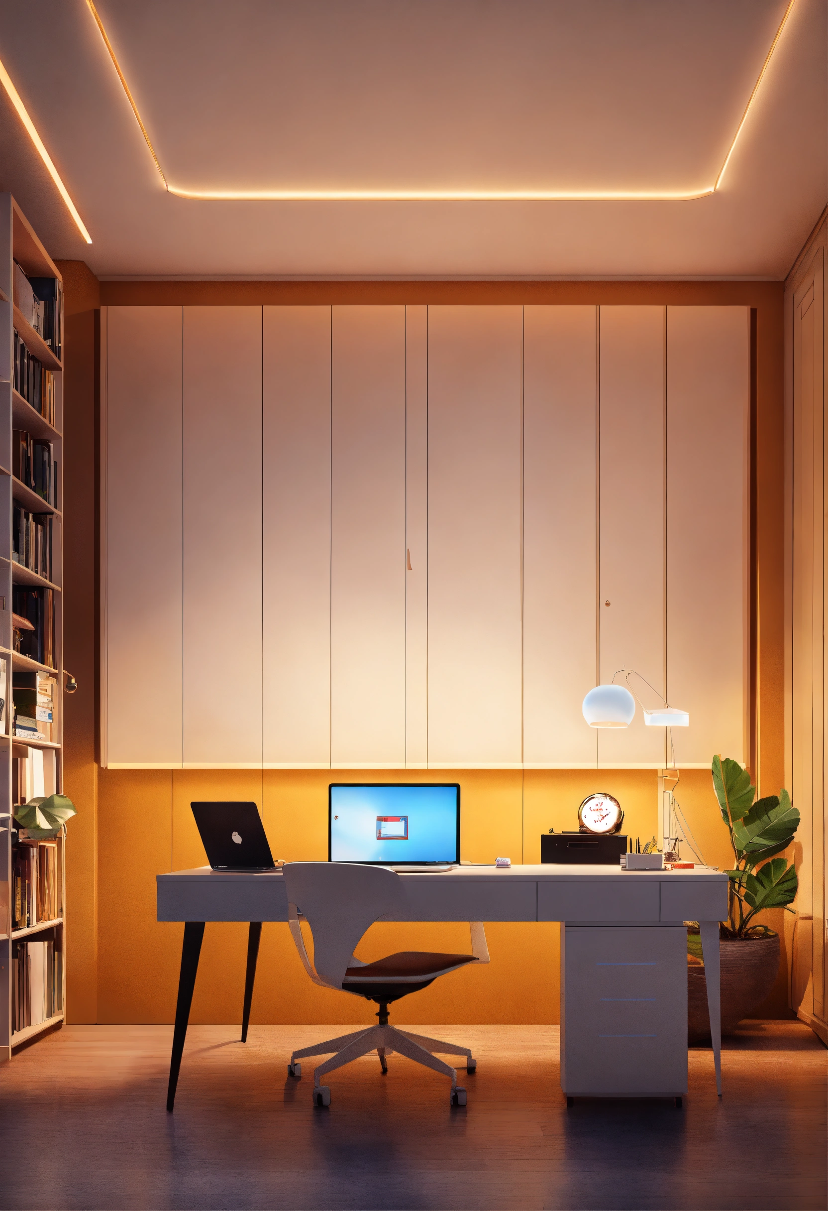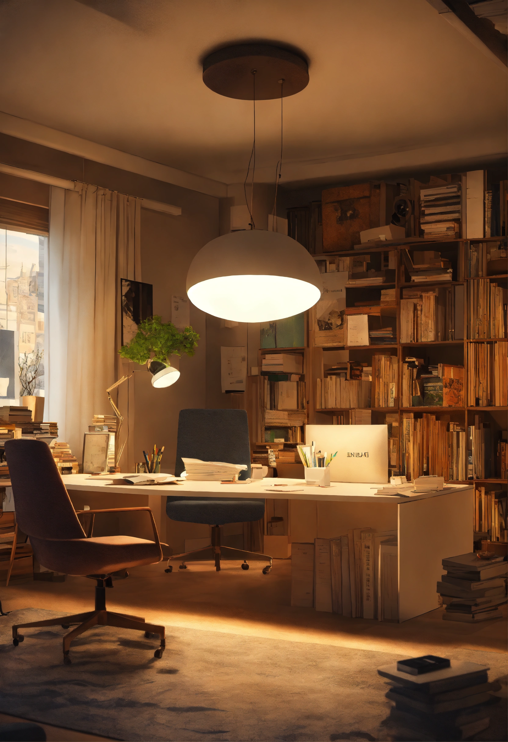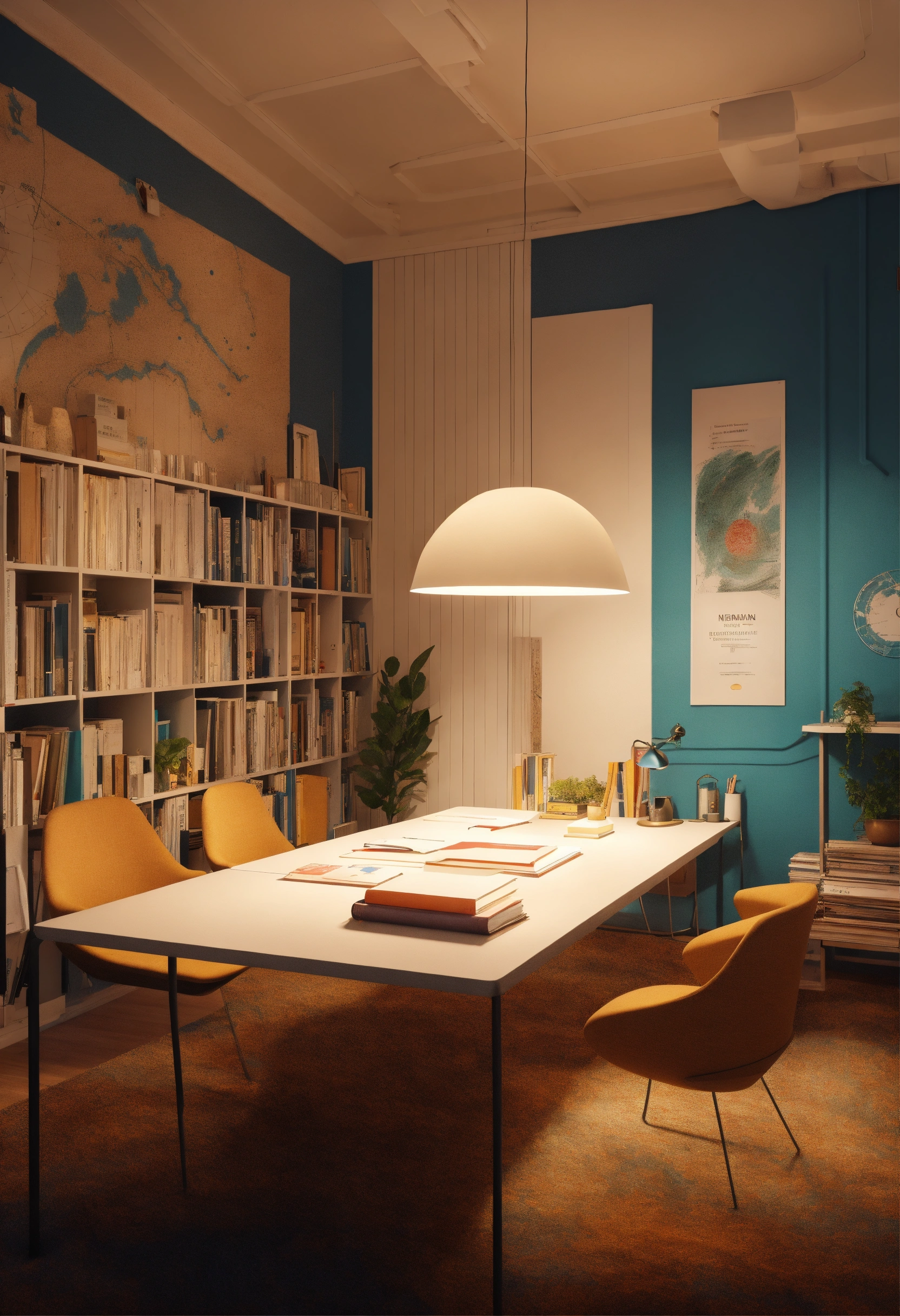A wild space of a governer's office, modern interior design, white wooden retangle shape table at the centre of the room, a lot of documents and stationery on the table surface, a lamp in round shape hanging from the ceilings, an abstract style drawing on the wall, a bookshell on the back, night, pixar, 4k