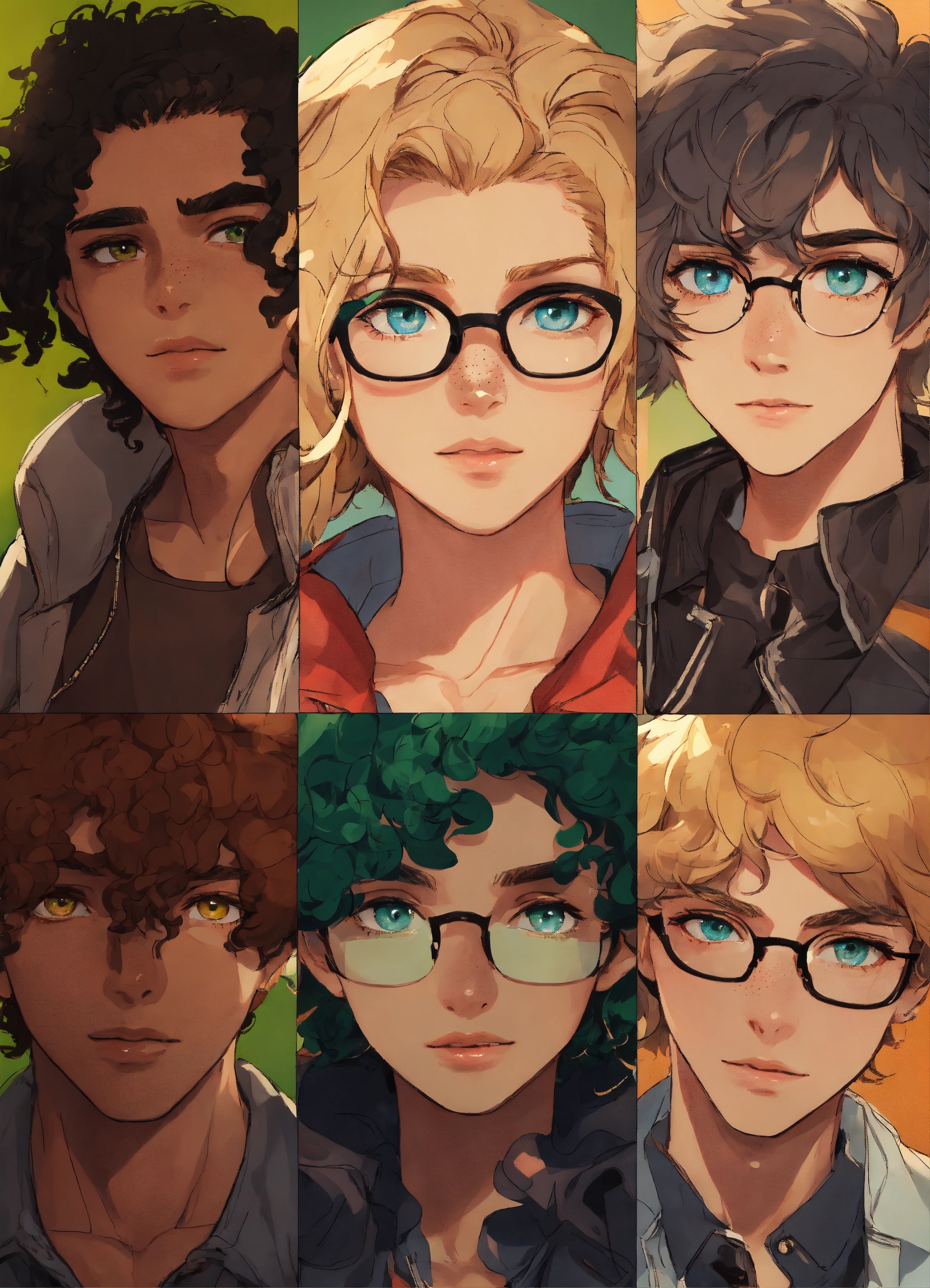 A group of 7 young adults. 1) is an 18-year-old girl with blond long hair, blue eyes and glasses. 2) is a 22-year-old man with dark brown hair, grey eyes and late 70s aesthetics. 3) is a black girl with long, dark hair, blue hair strands and bells in her hair, with amber eyes. 4) fourth is an 18-year-old boy with red, curly and short hair and green eyes, latino skin. 5) is a 19-year-old boy with short, black hair and dark blue eyes, aristocrat gothic aesthetics. 6) is a tall 25-year-old man with dark blond, long, wavy hair, freckles, stublles and green eyes. 7) is a 25-year-old woman with dark blond, short hair, freckles and green eyes. digital art, 8k