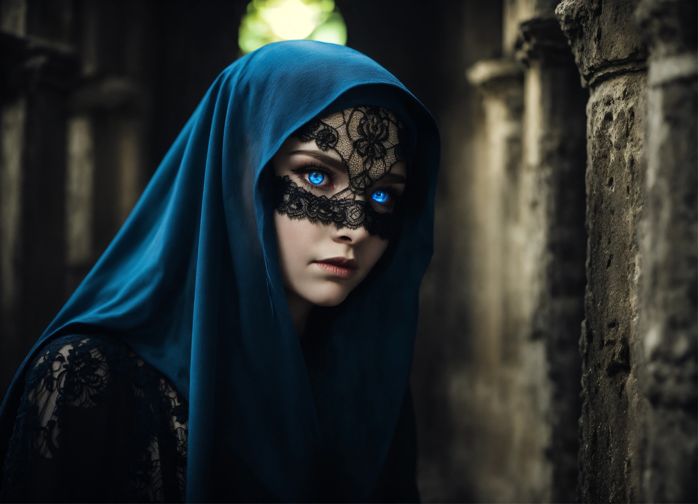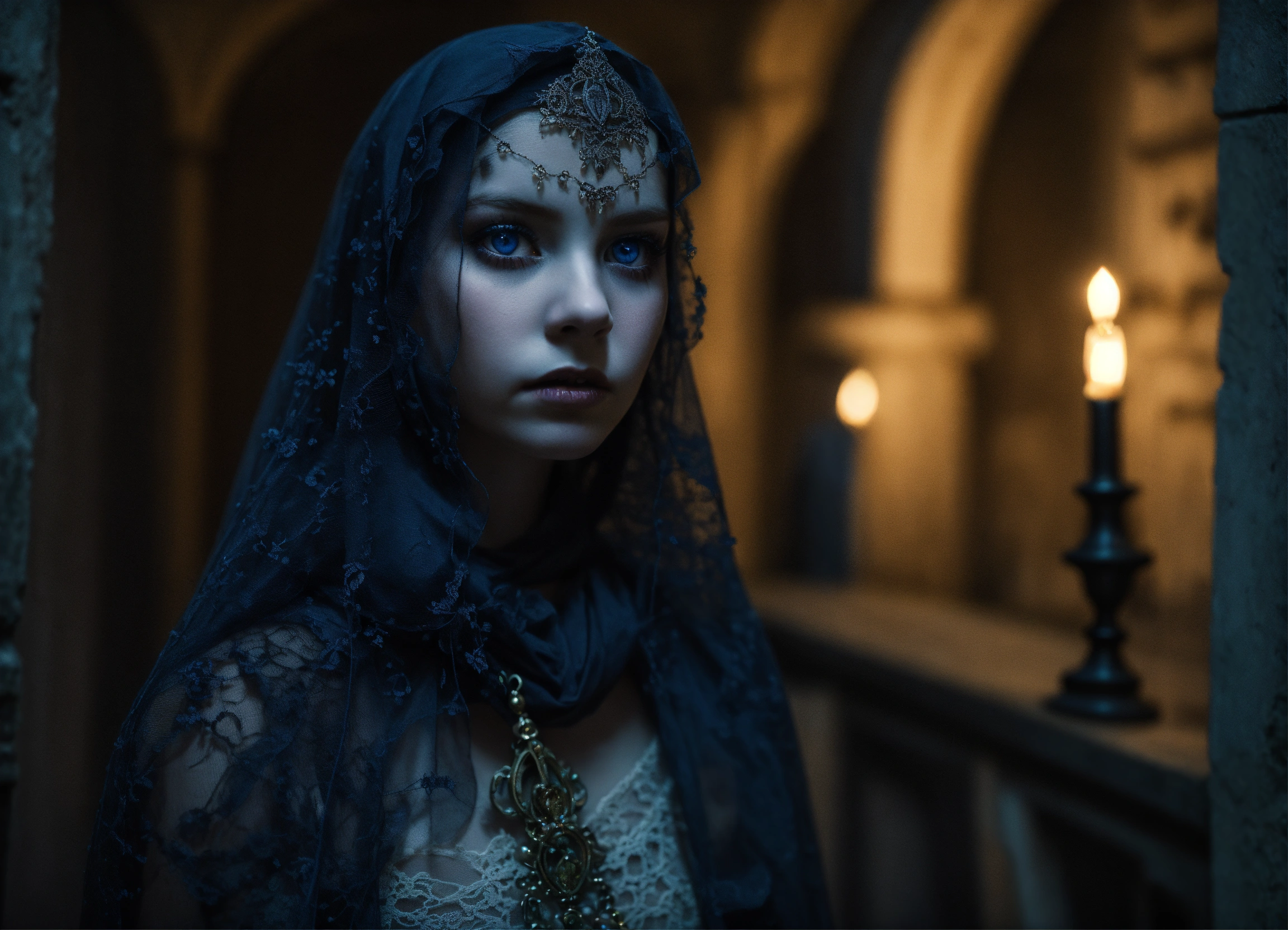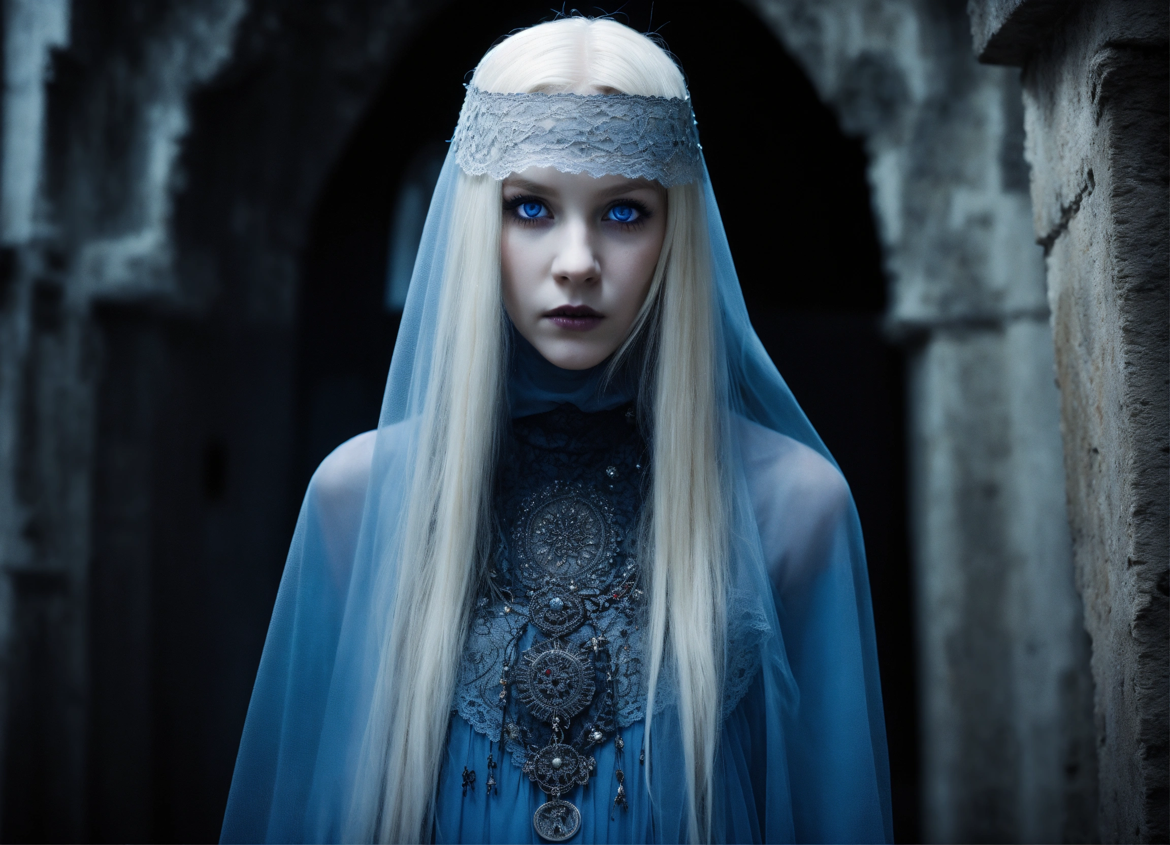 Body portrait of a very childish deadly pale ultra slim twelve year old female child, she is a ultra skinny goth necromancer with waist long silverwhite hair, lace niqab, face veil, narrow clothing, ultra skinny, ultra slim body, ultra emaciated body, completely emaciated, ultra narrow face, alabaster skin, pale as a corpse, glowing blue eyes, ultra slim face, innocent looking, in a gloomy crypt, lasziv, kindlich, unschuldig, childlike, graceful, wispy, glowing blue eyes, ghostly, dead, evil, demonic, undead, darkness, grotesque, mysterious, dark, cold ambient lighting, extremely detailed, fantasy, medieval setting
