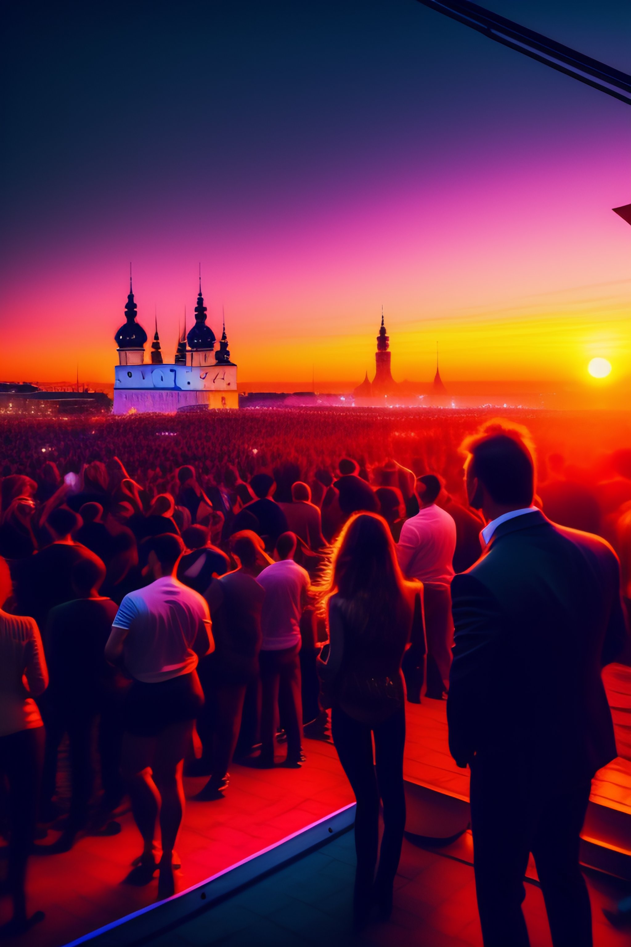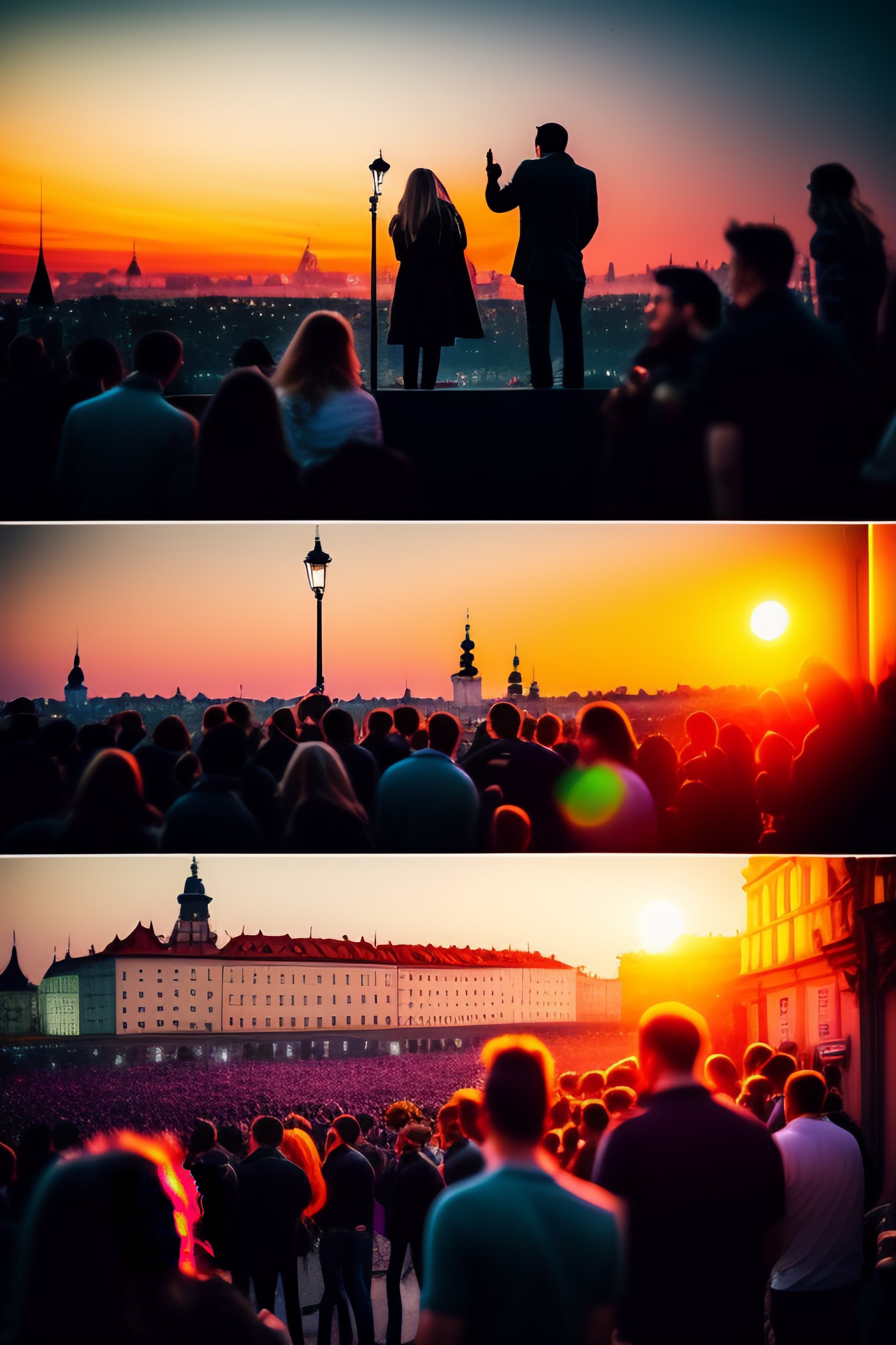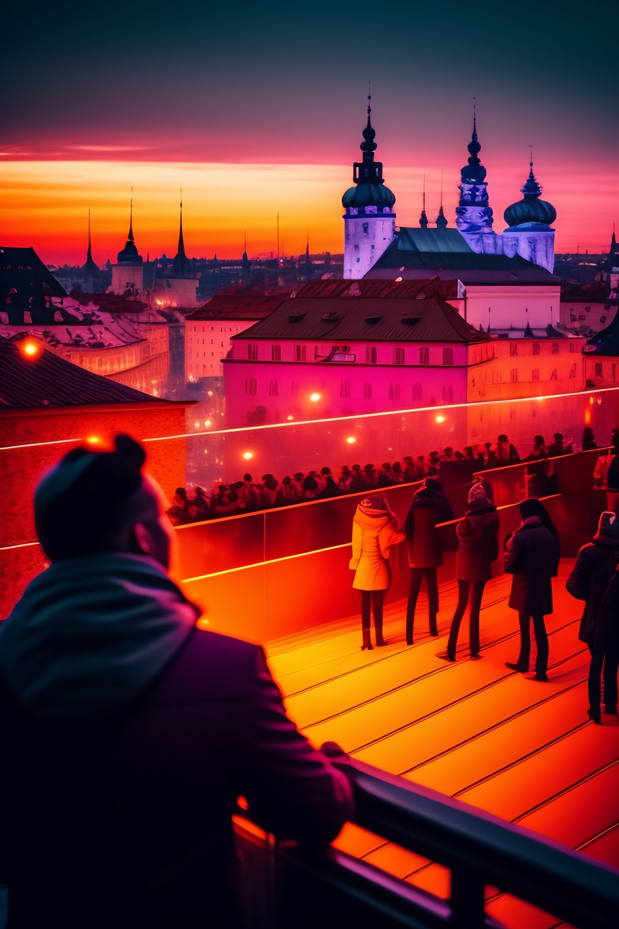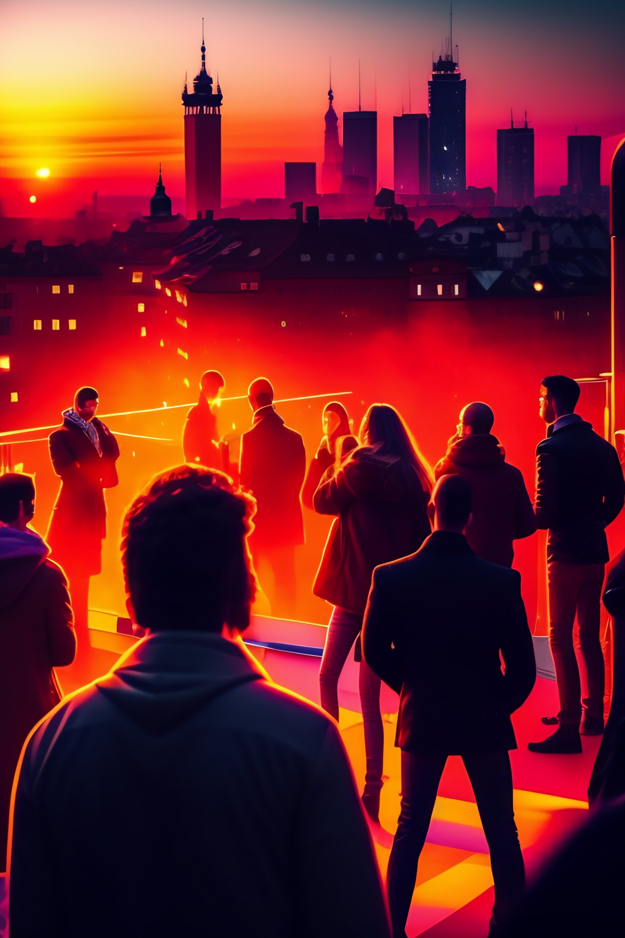 Party on the roof, people dancing to the music, against the backdrop of the city of krakow and the sunset, in cyberpunk style