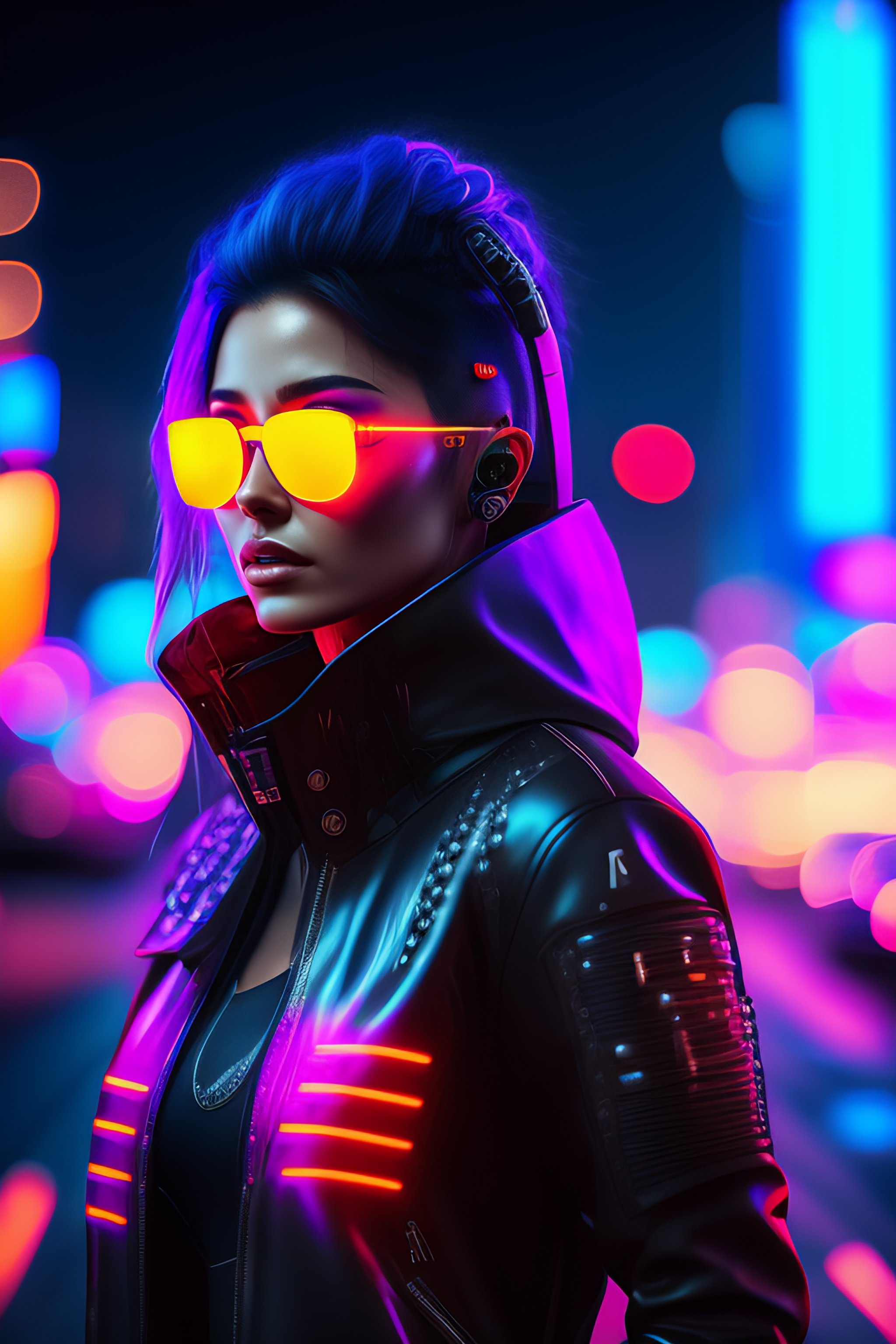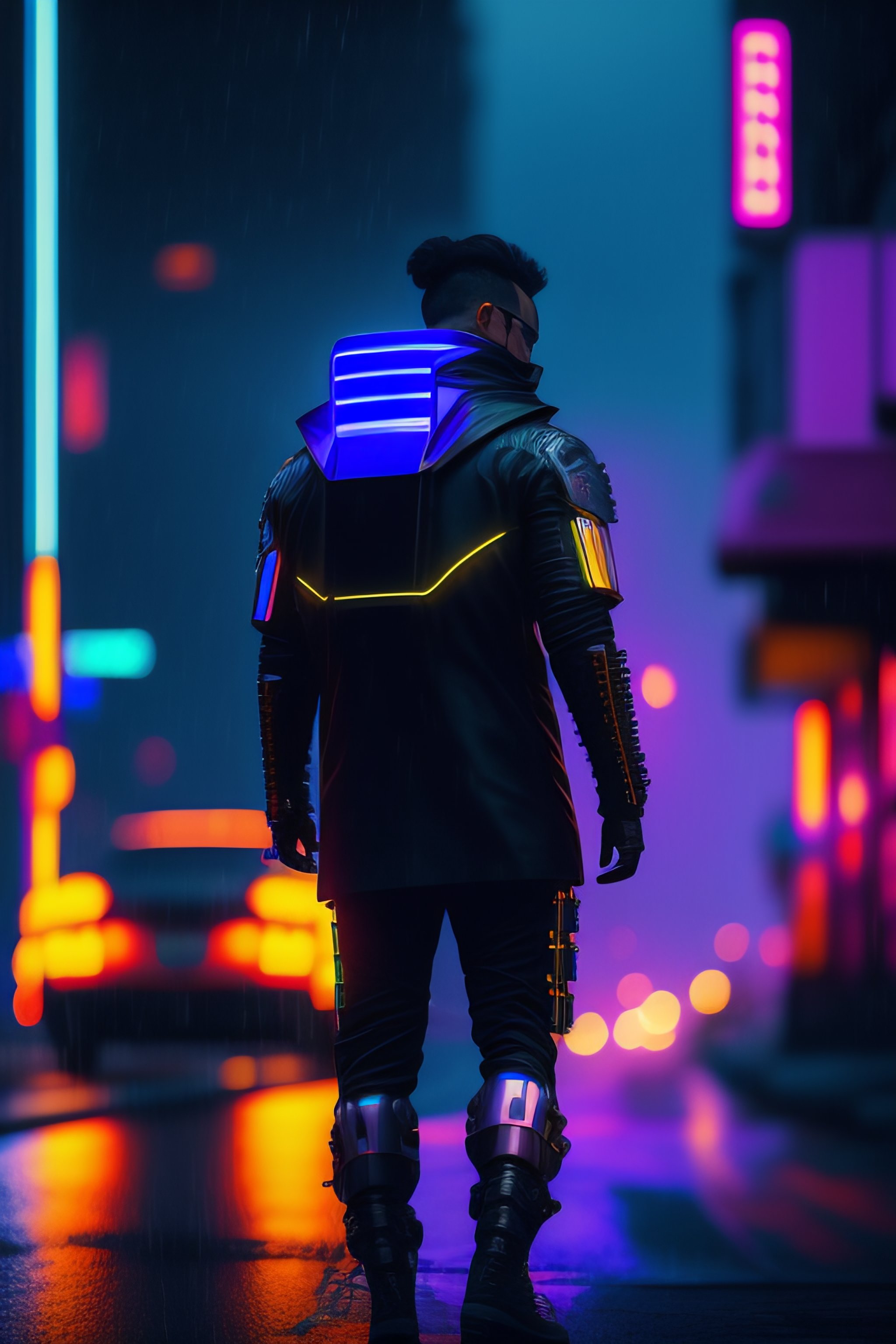 Futuristic cyberpunk guitar player, half cyborg, full body, in heavy rain, open road, neon lights, cyberpunk city, hyper realistic, unreal engine