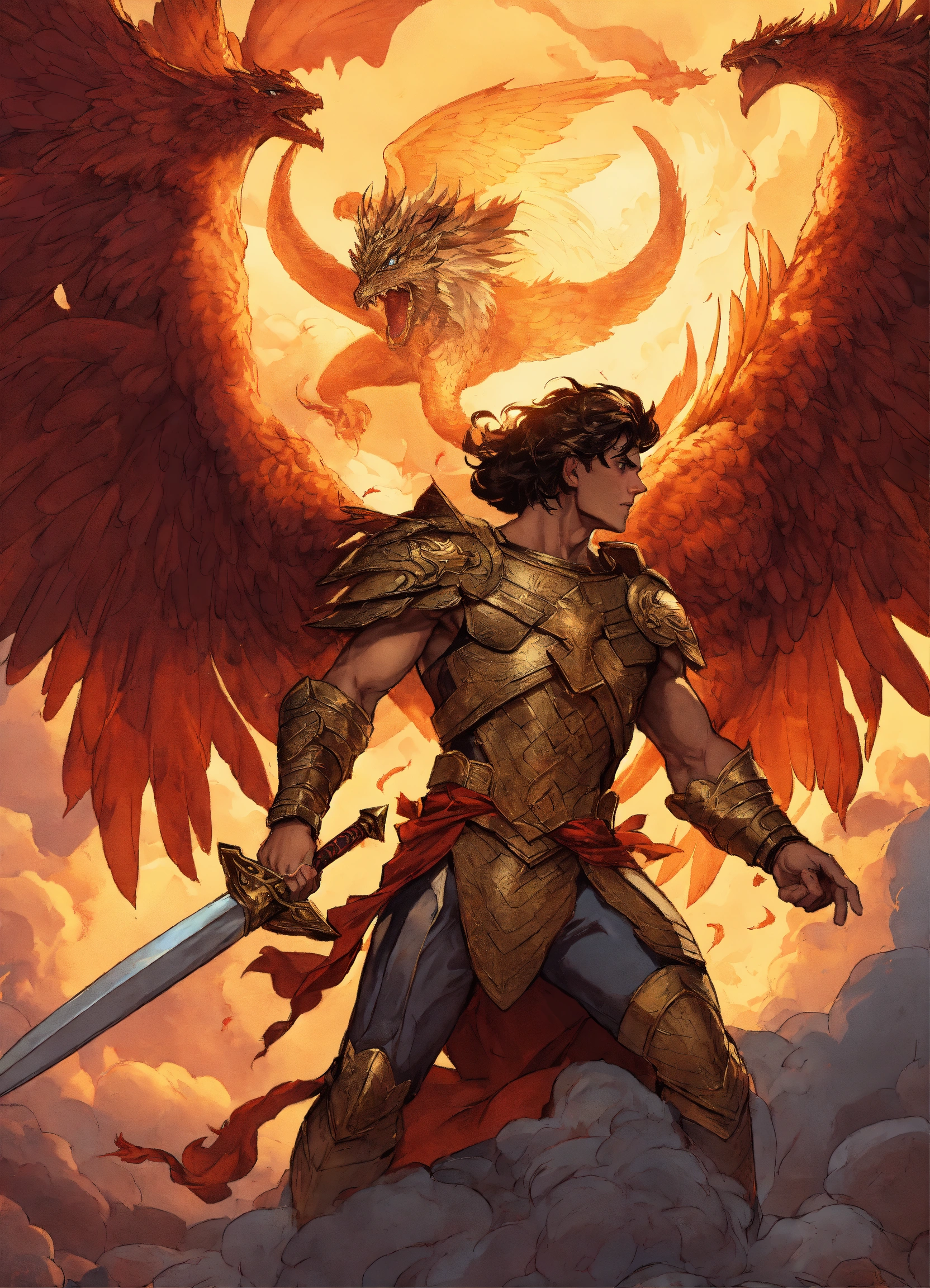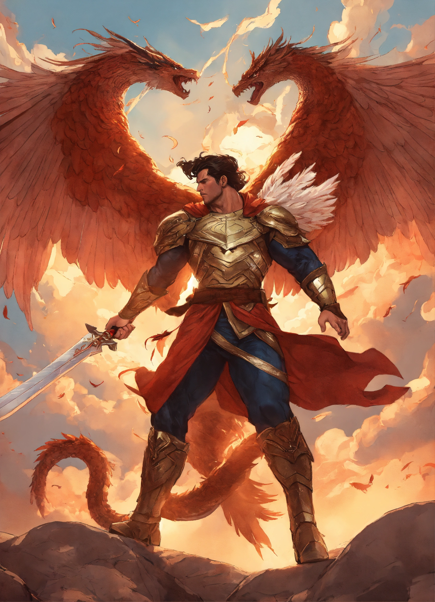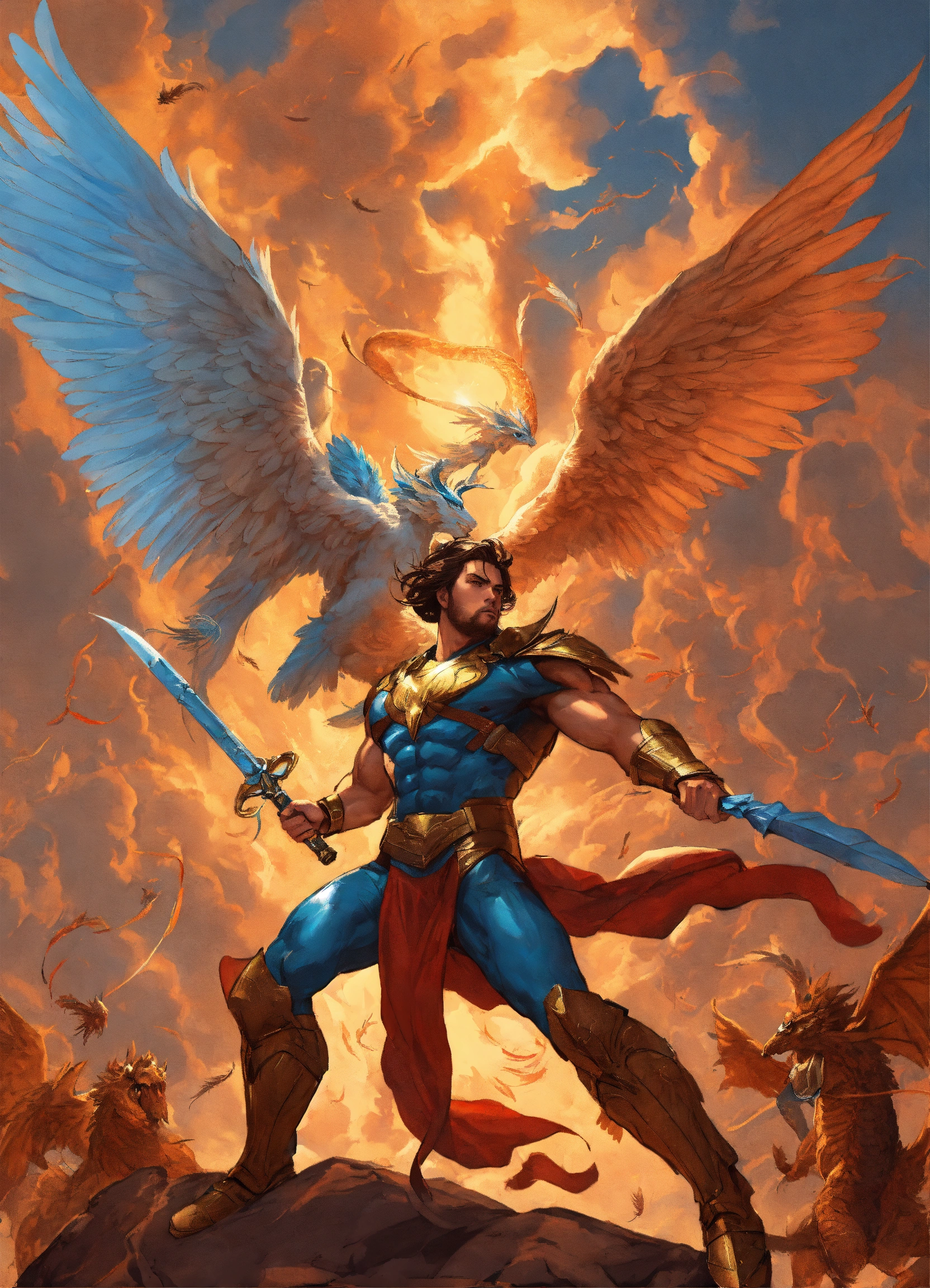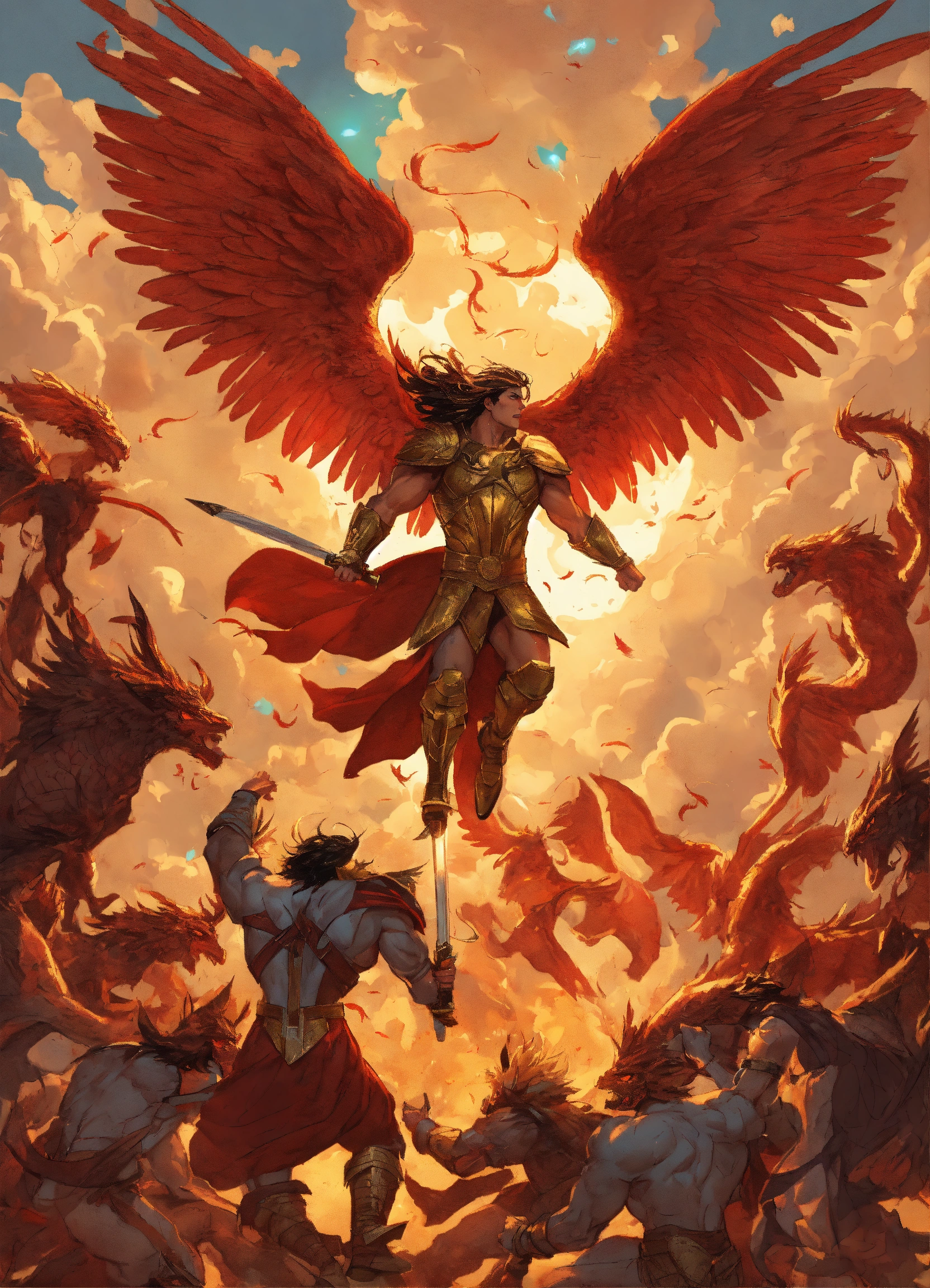 Fight scene, in the style of marvel comics, an angel warrior with feather wings fighting with a dragon with 7 heads in the sky