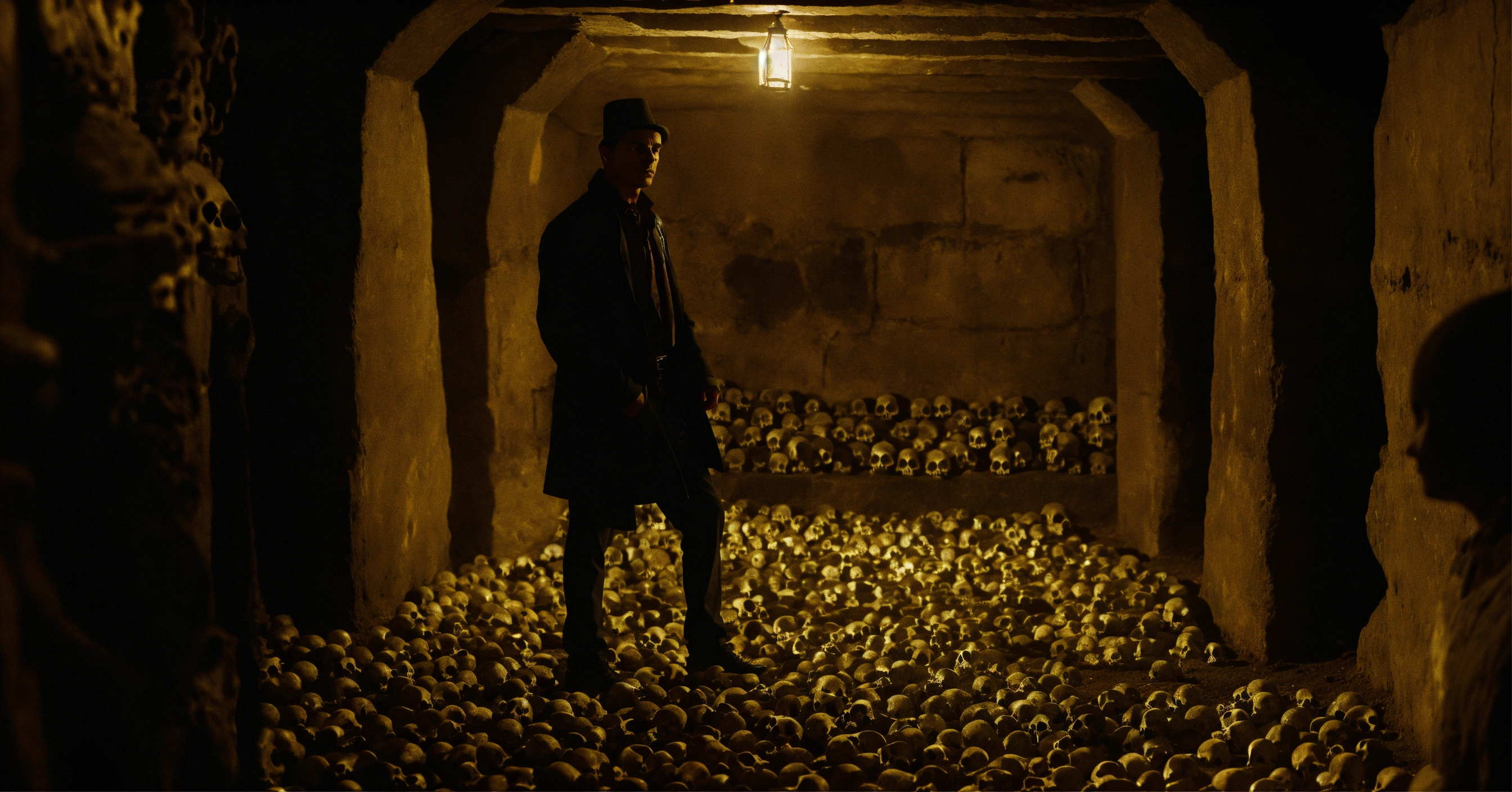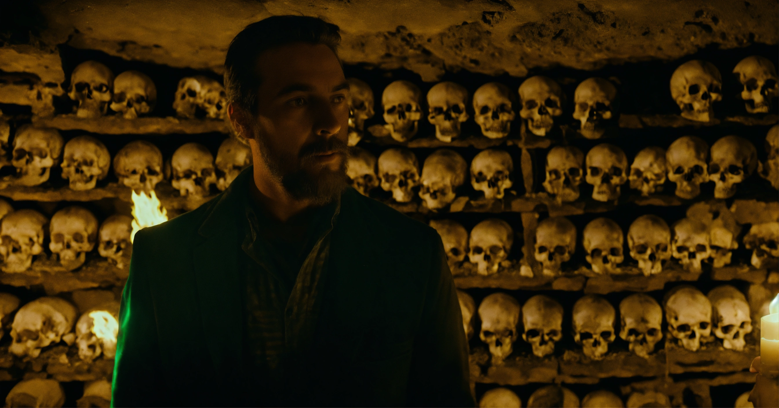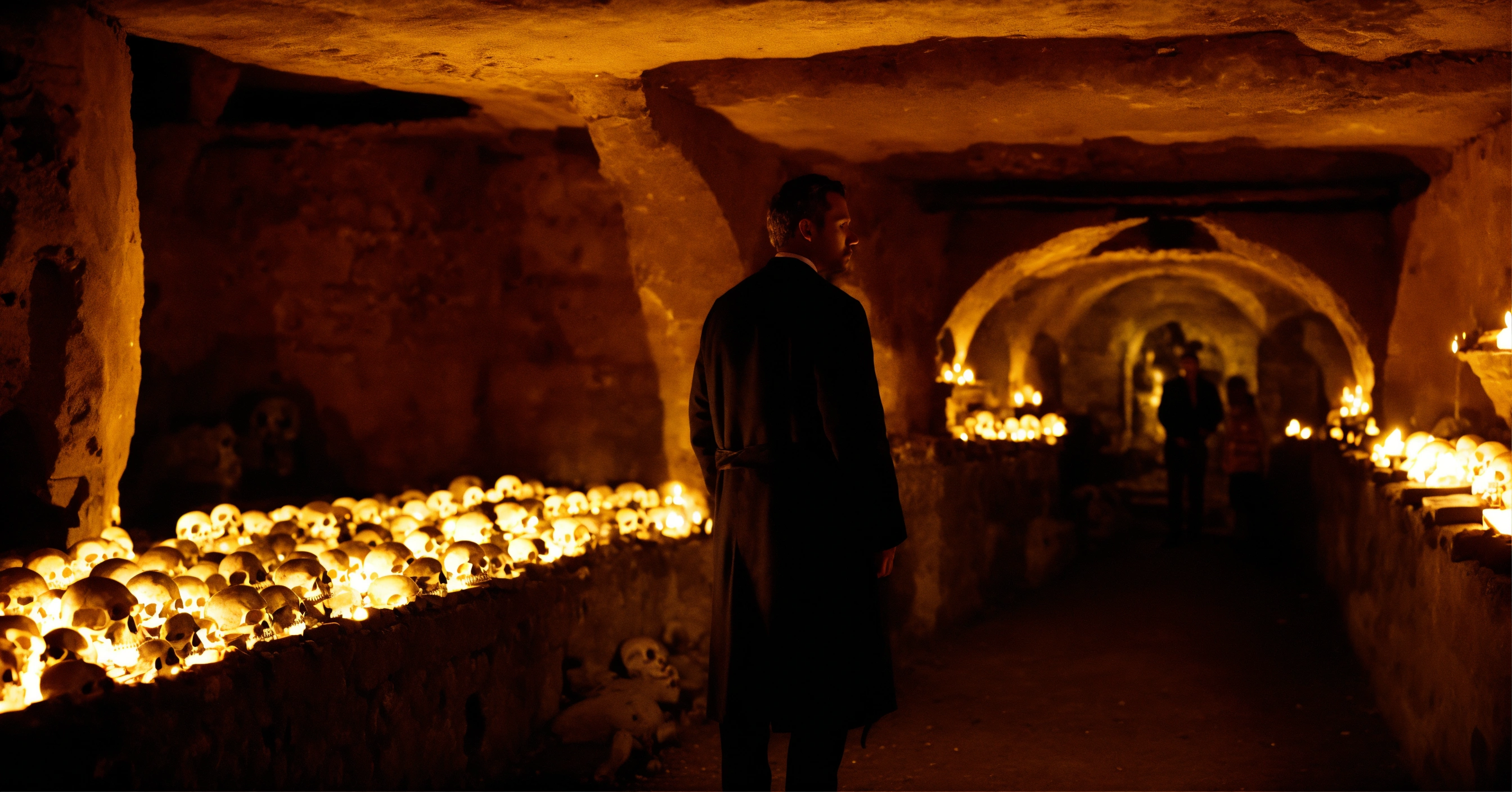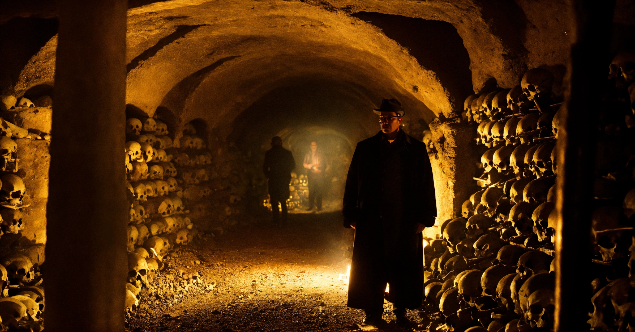 A very realistic, photographic quality picture of a man's glowing ghostly presence in the paris catacombs, surrounded by skulls and bones