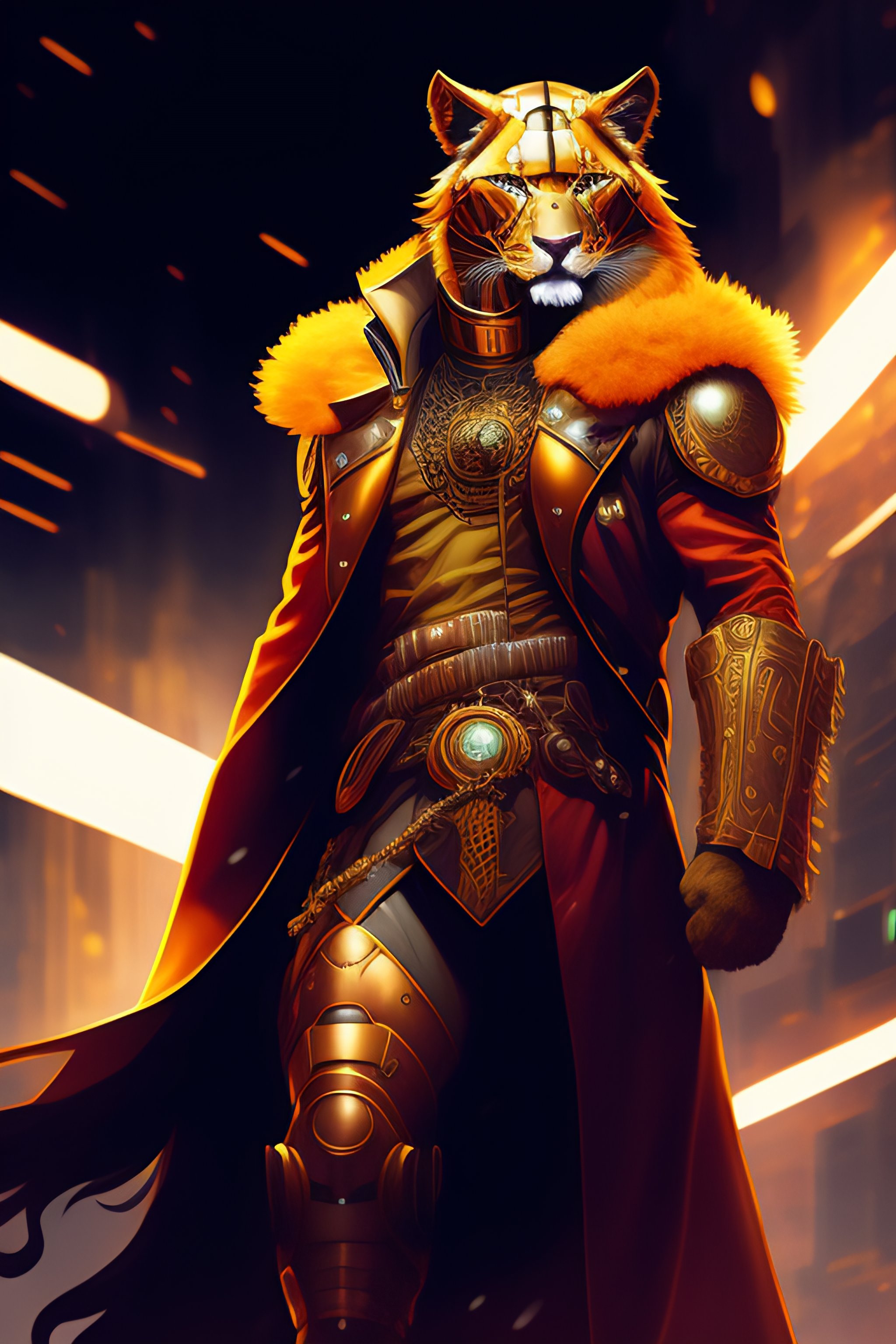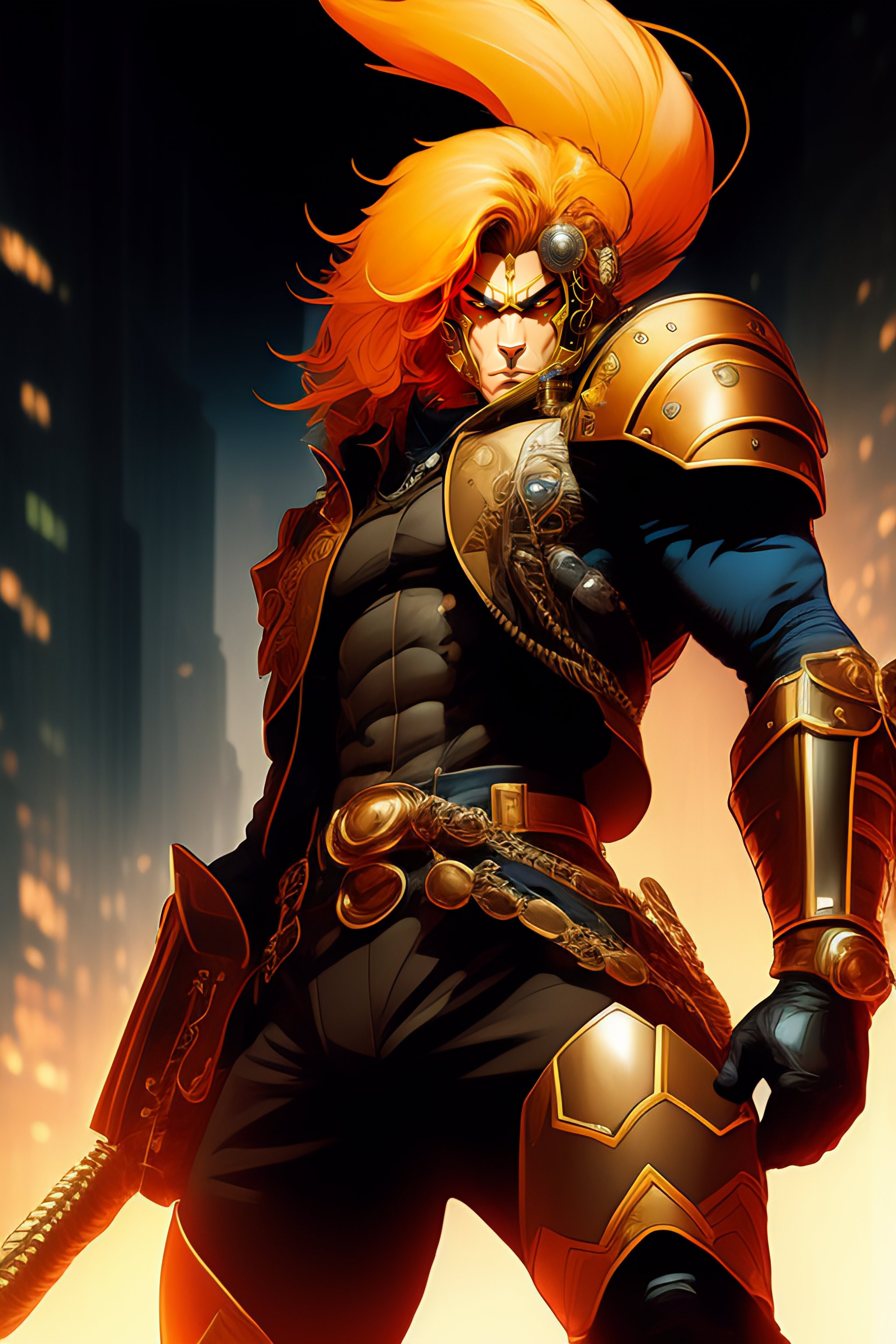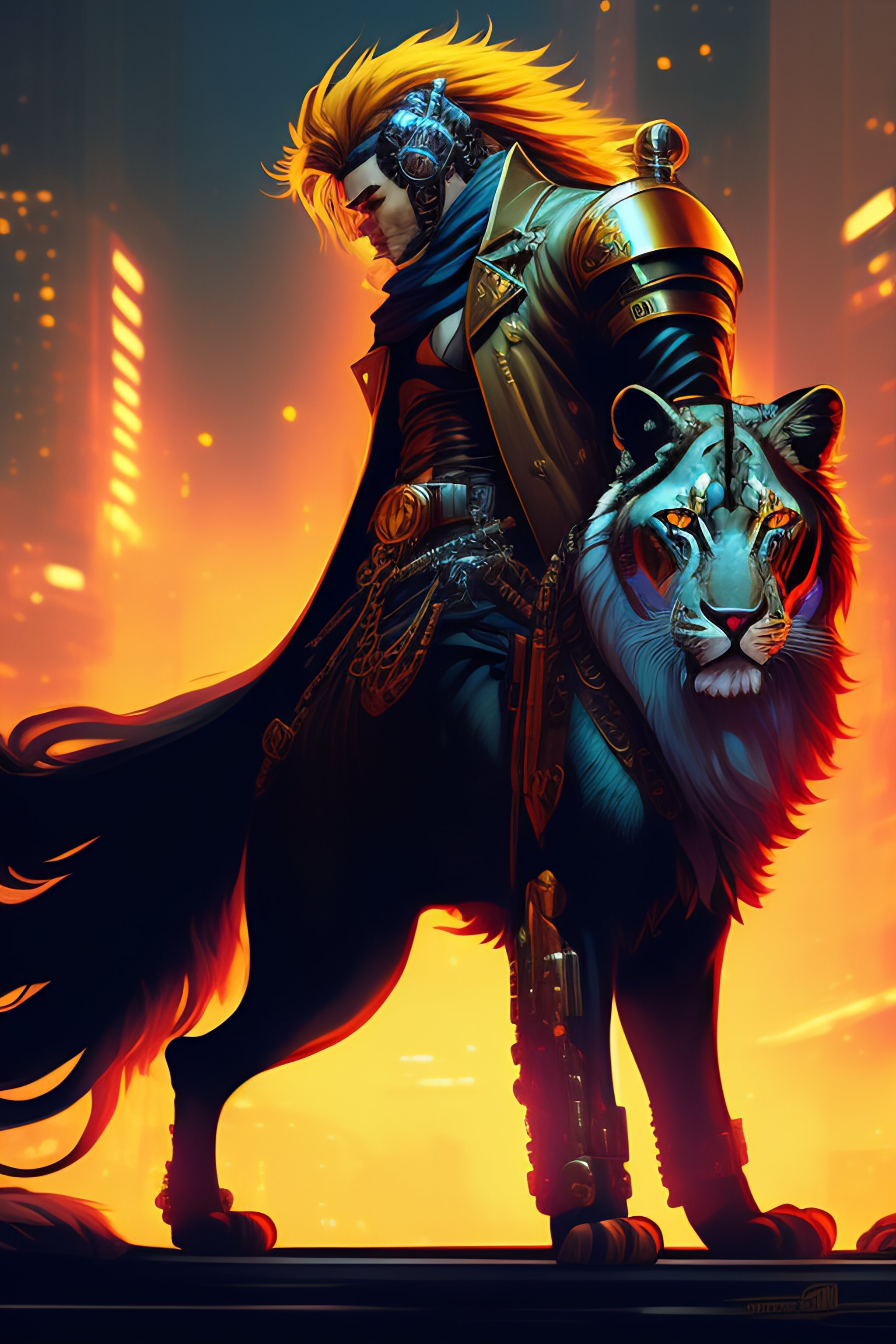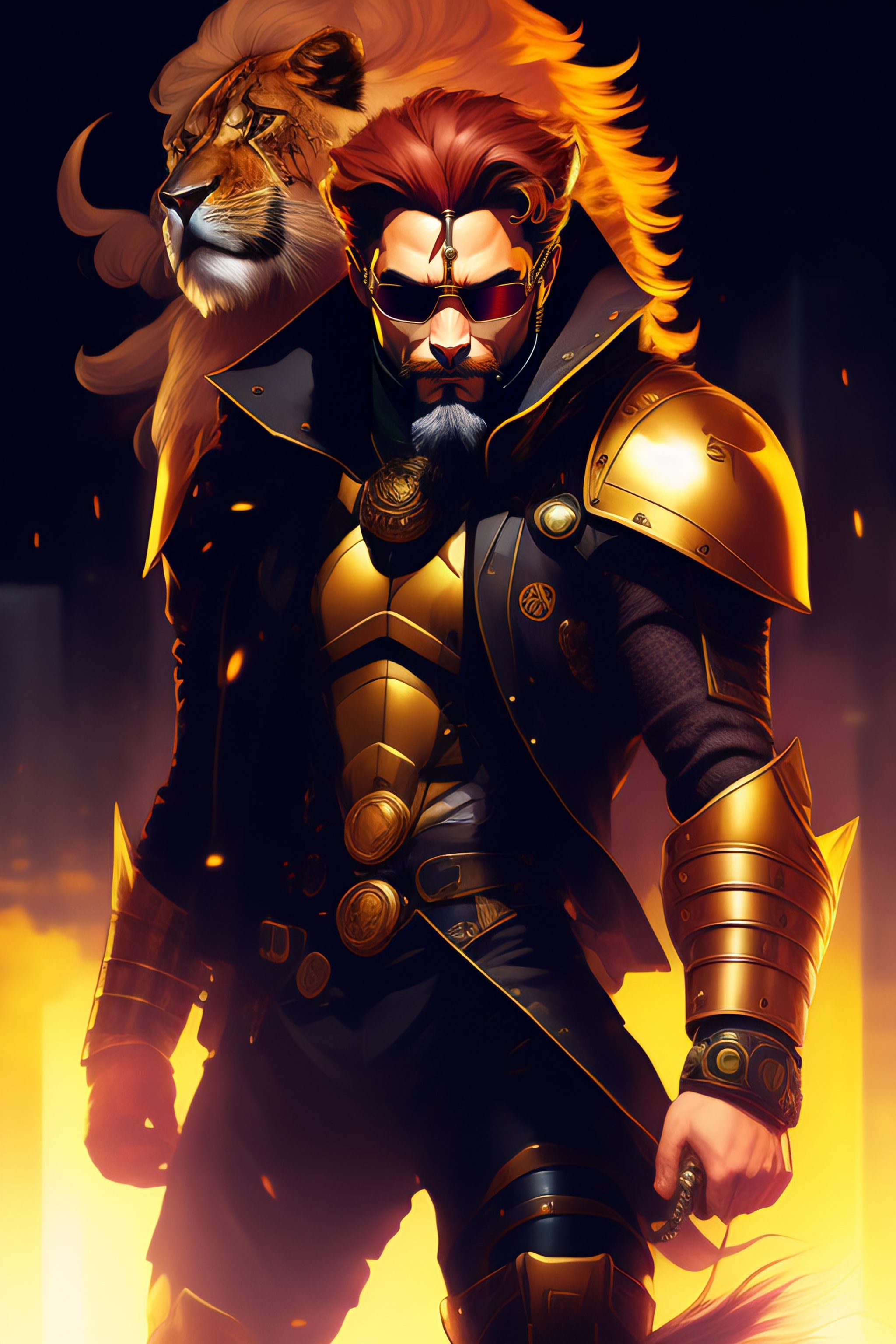 An anthropomorphic cybernetic/steampunk man with a lion's face and mane in a dynamic action pose, dynamic comic book drawing, comic book art, flat vector, clean lines, eugene delacroix, yoji shinkawa, image comics