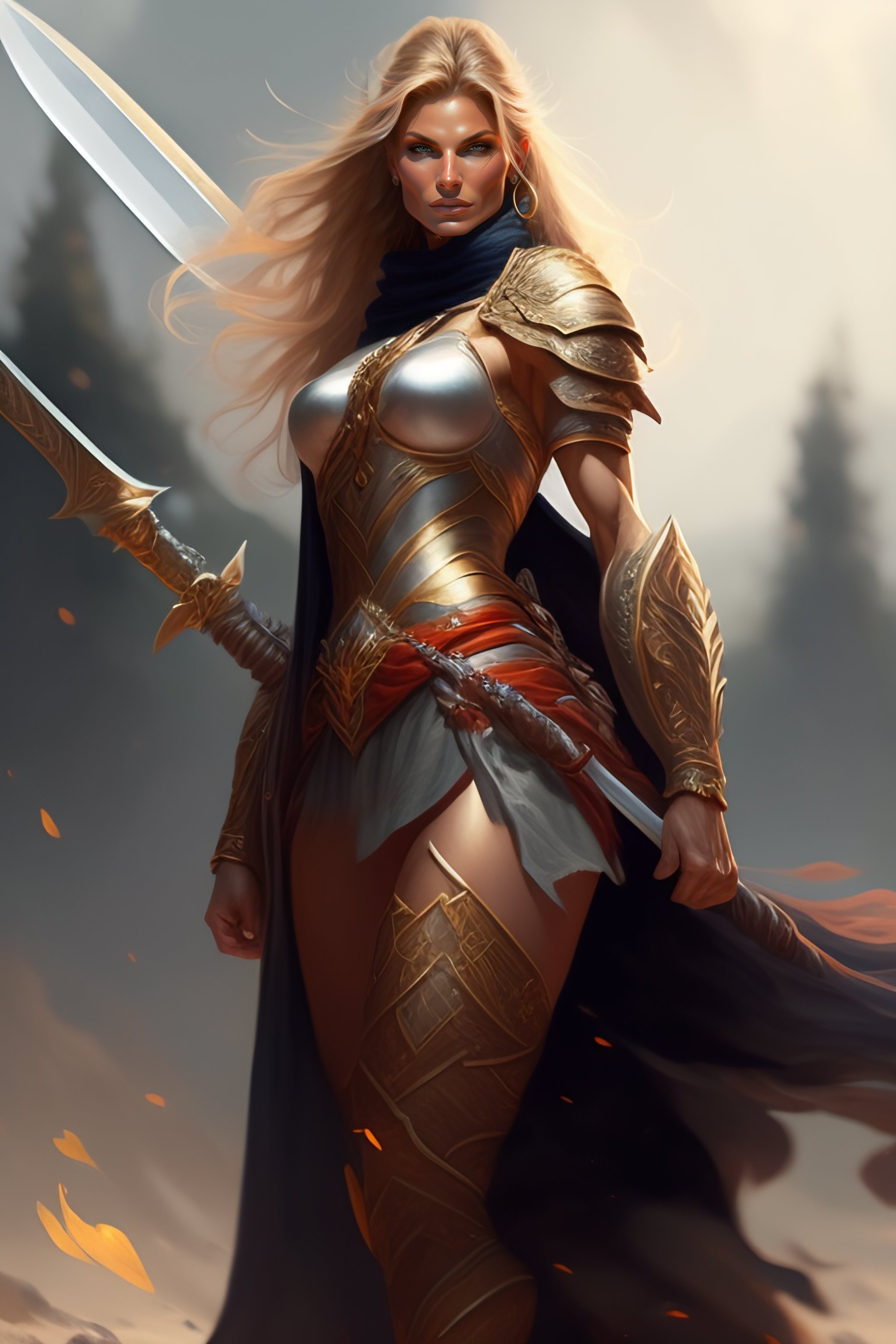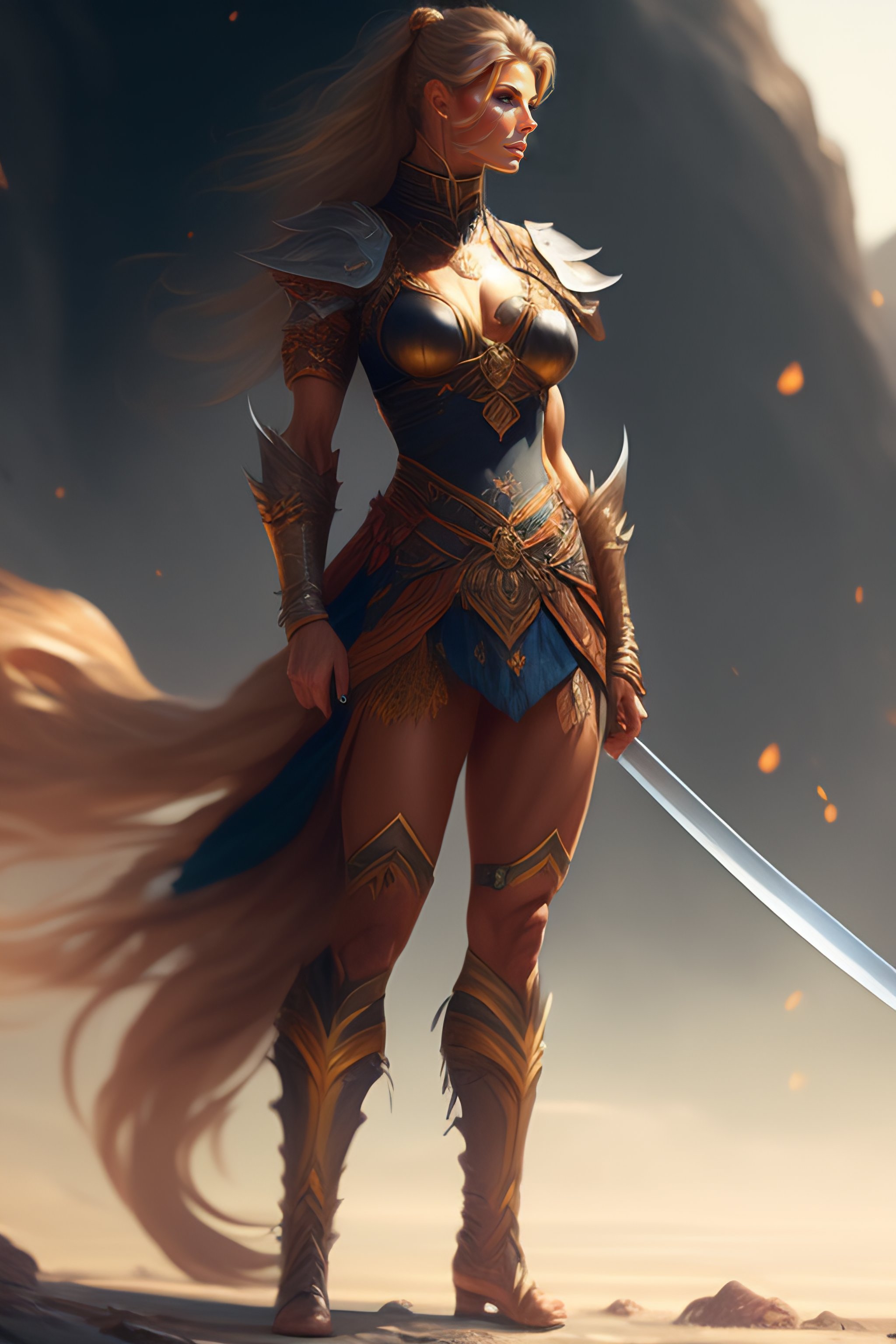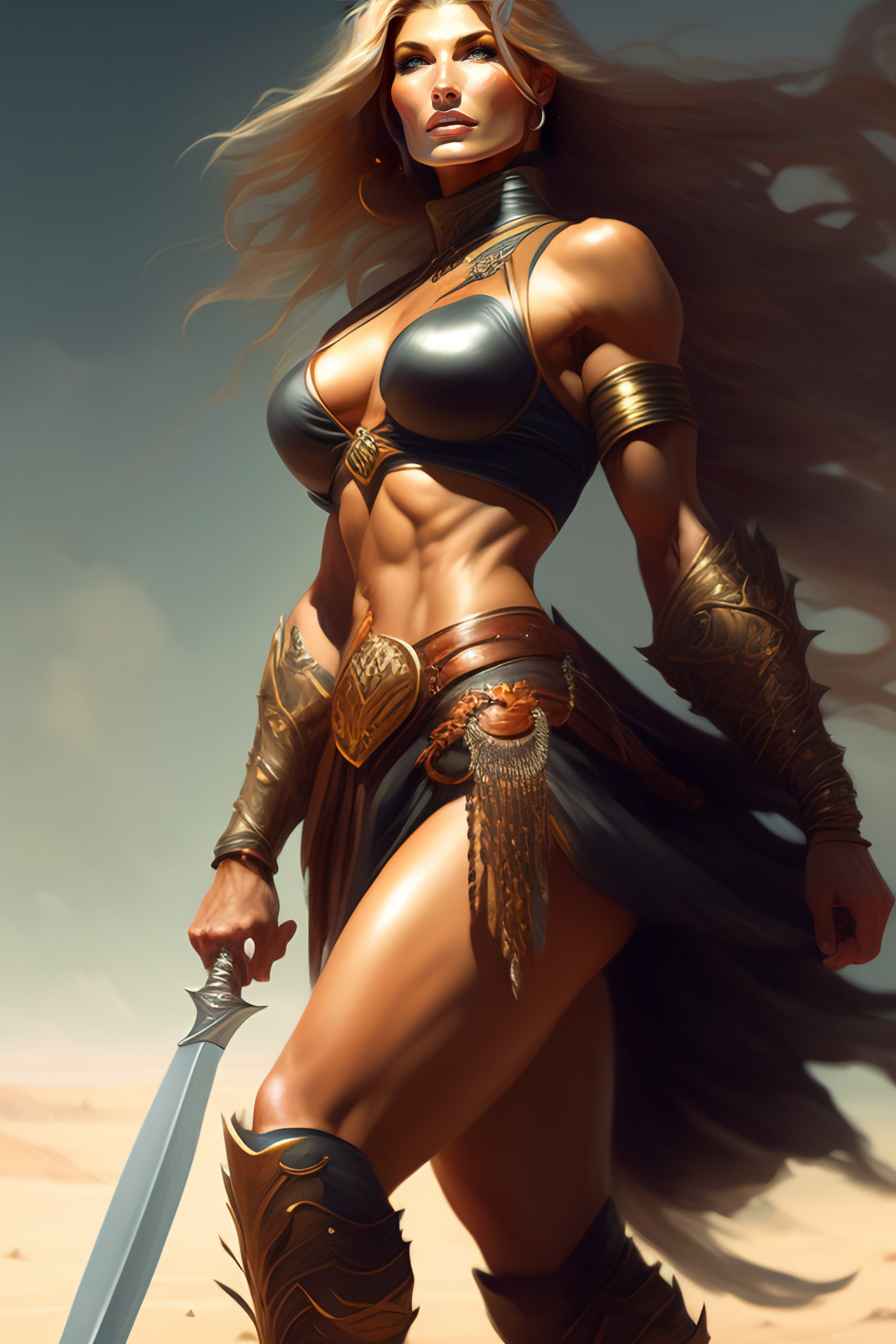 Full body potrait of muscular marisa miller as rugged warrior sparying sword in air, muscular legs and six abs, highly detailed, digital painting, artstation, concept art, smooth, sharp focus, illustration, art by tian zi and wlop and alphonse mucha