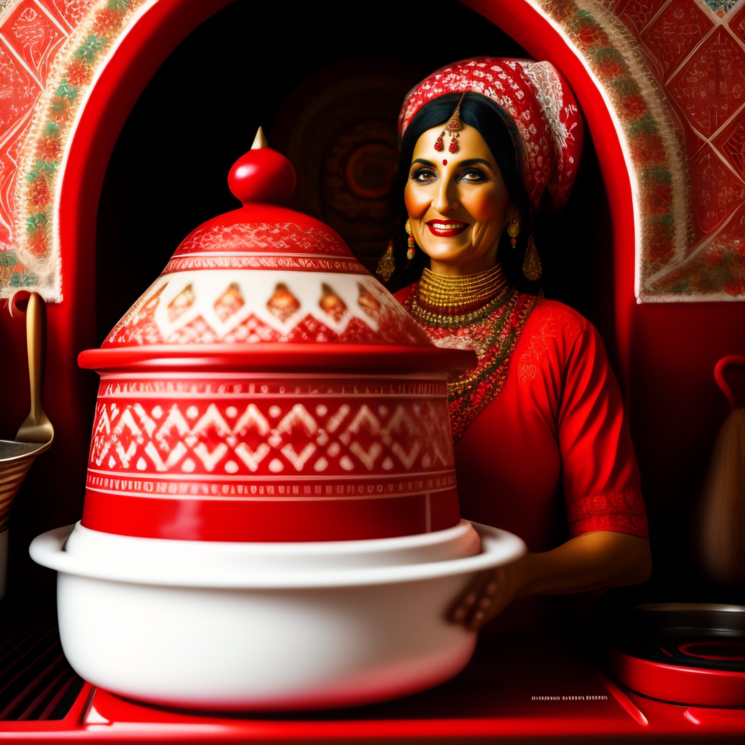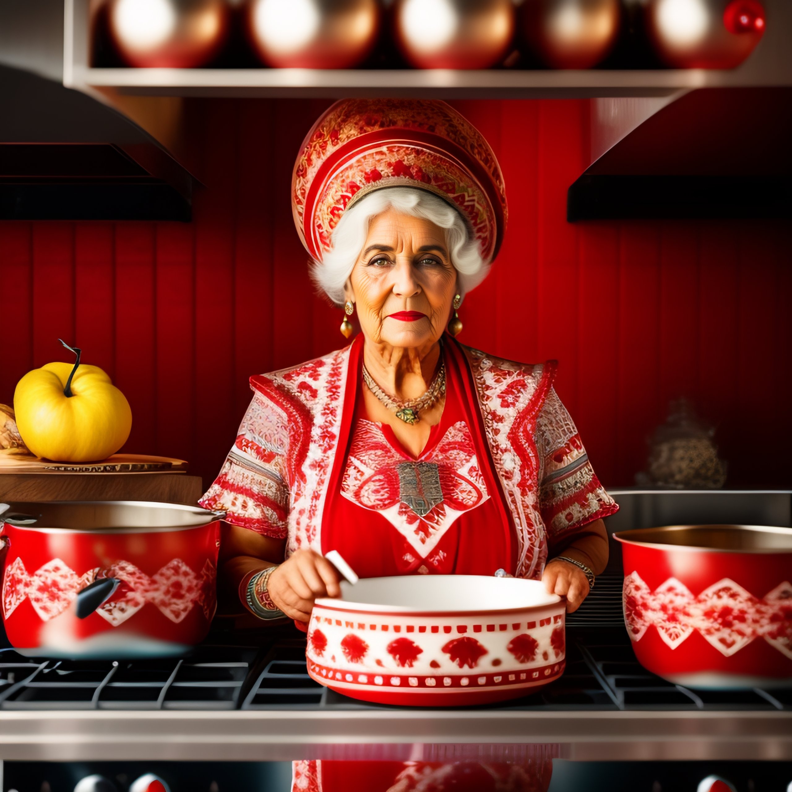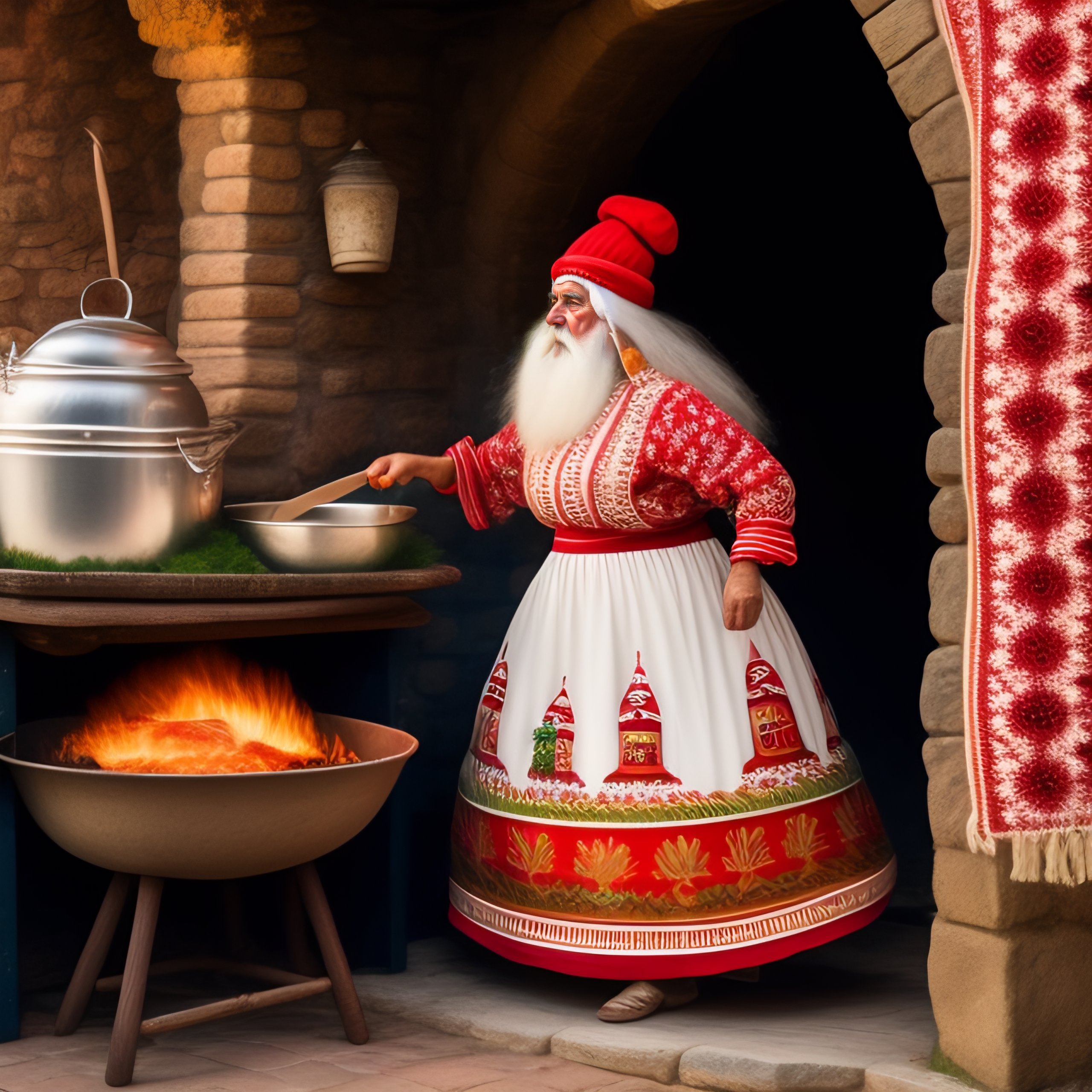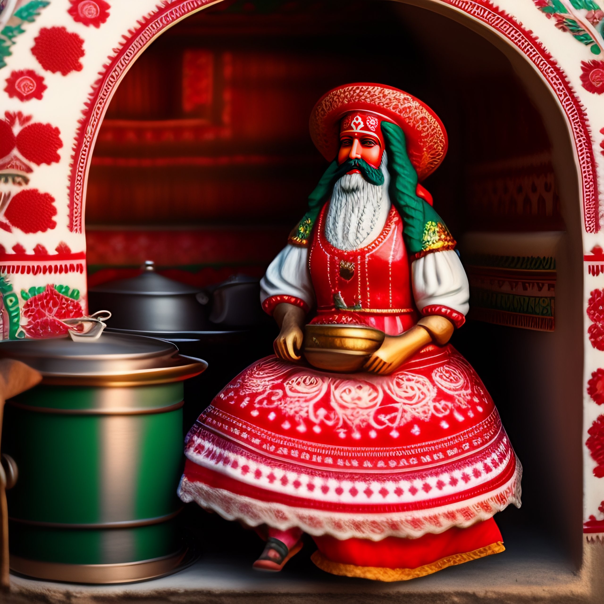 Bulgarian baba yaga wearing clothes in balkan style patterns in red and white