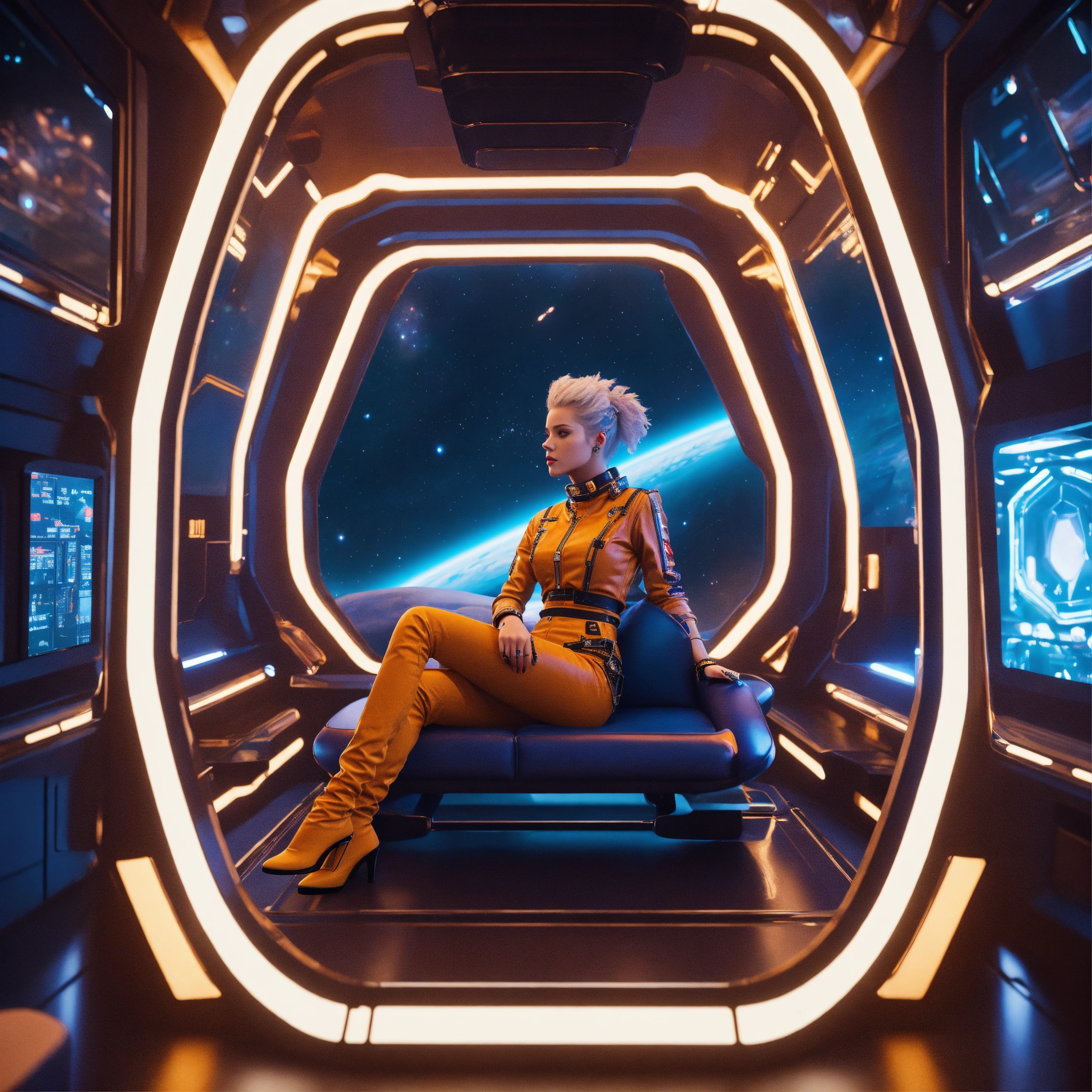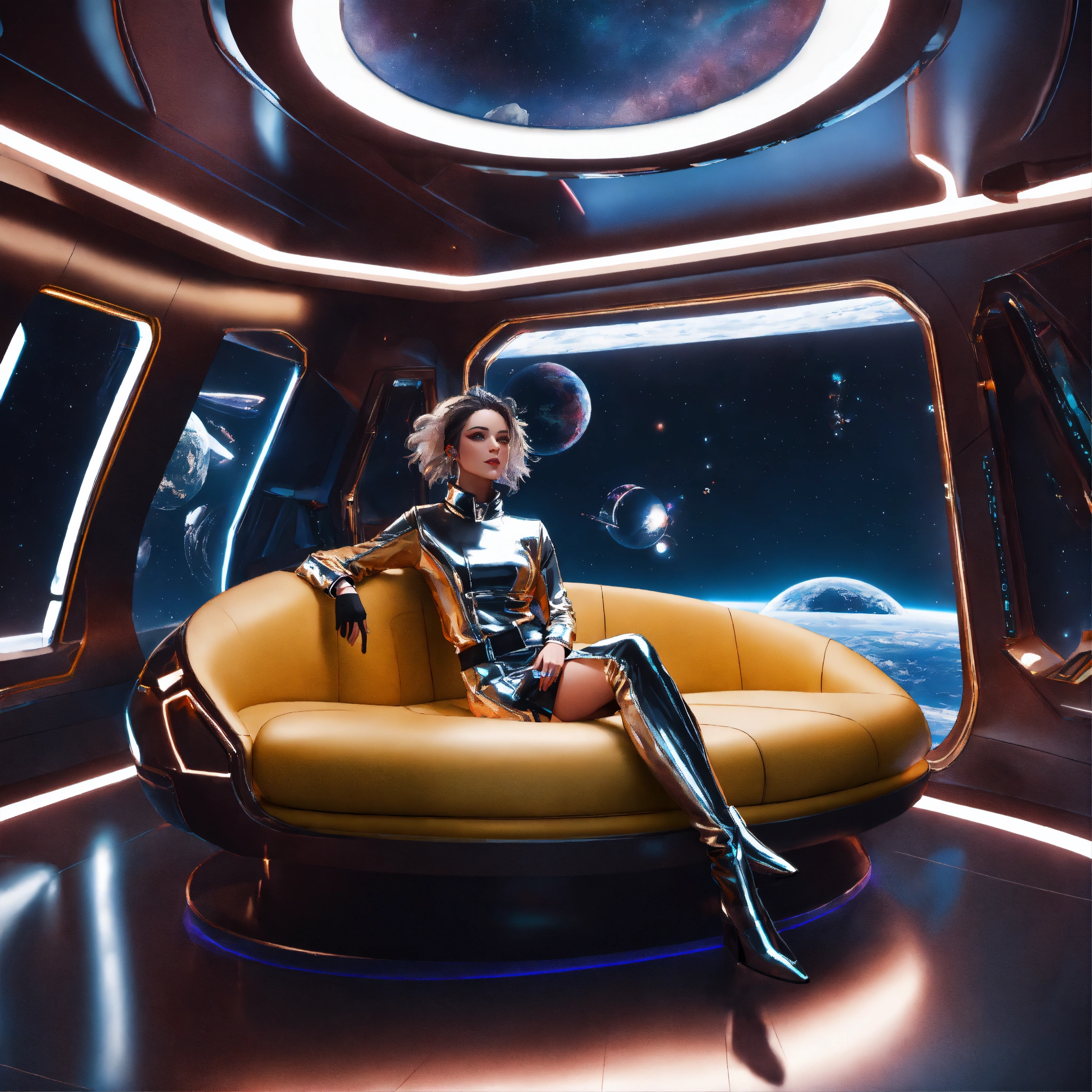 Zoom out from a female rockstar wearing cool space fashion is lounging in a luxurious futuristic space yacht, realistic, futuristic, sci-fi, 8k, unreal engine