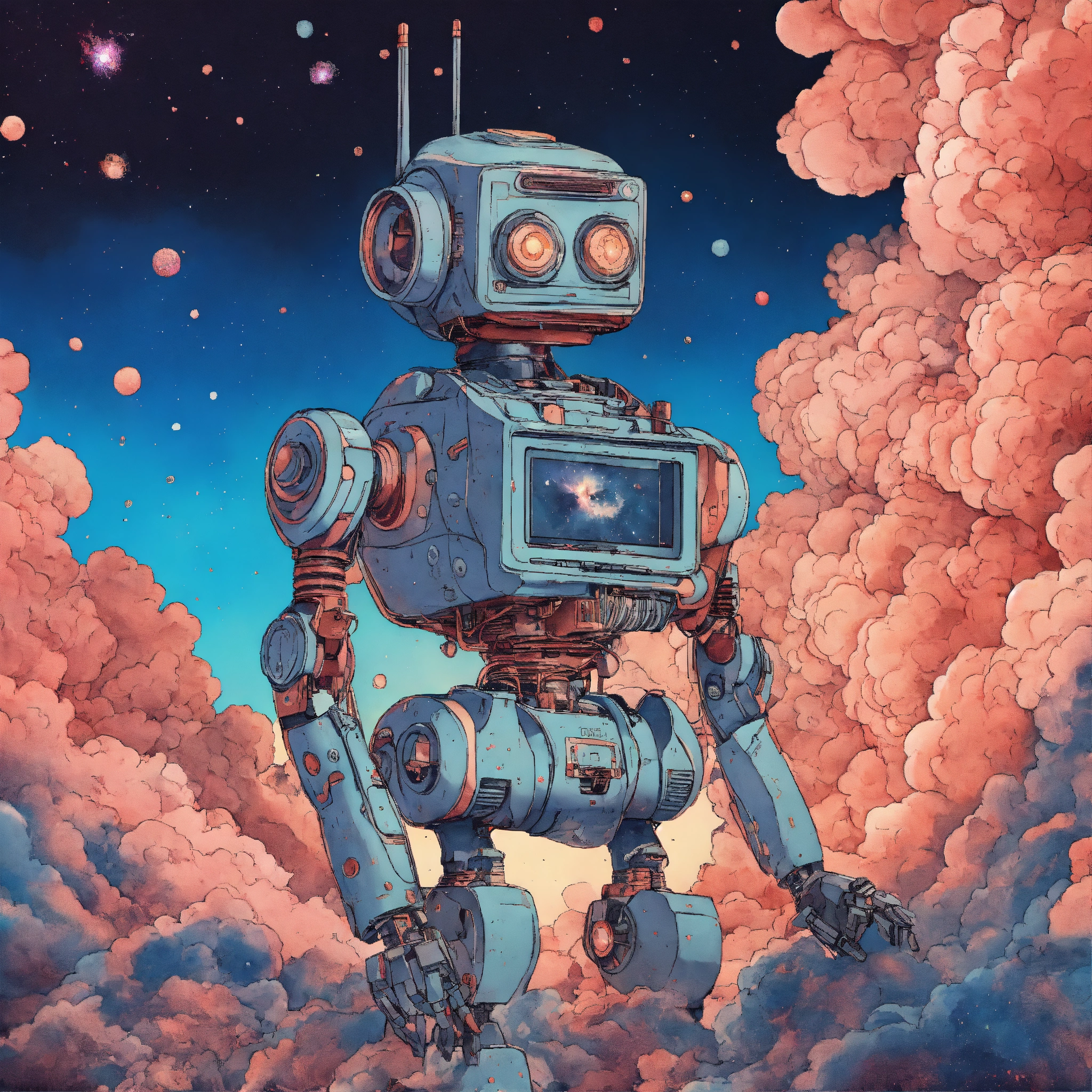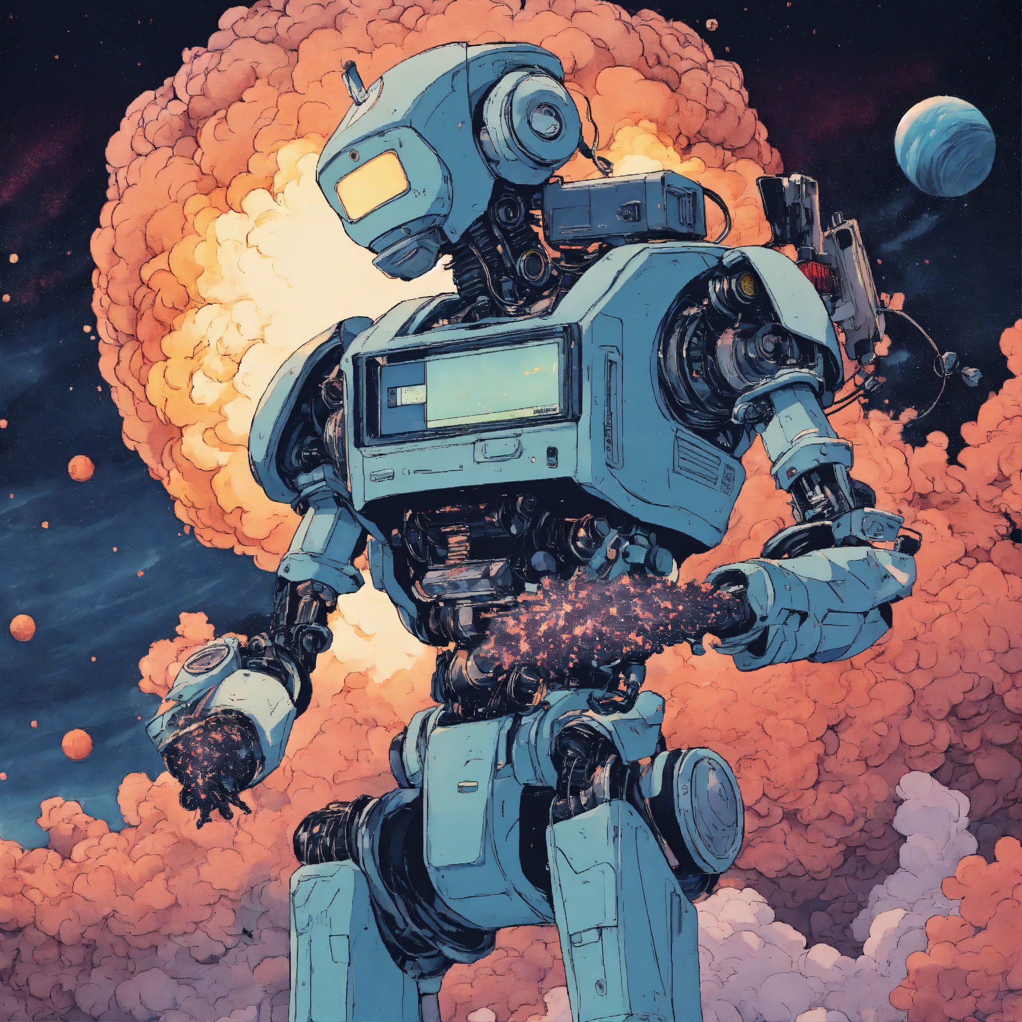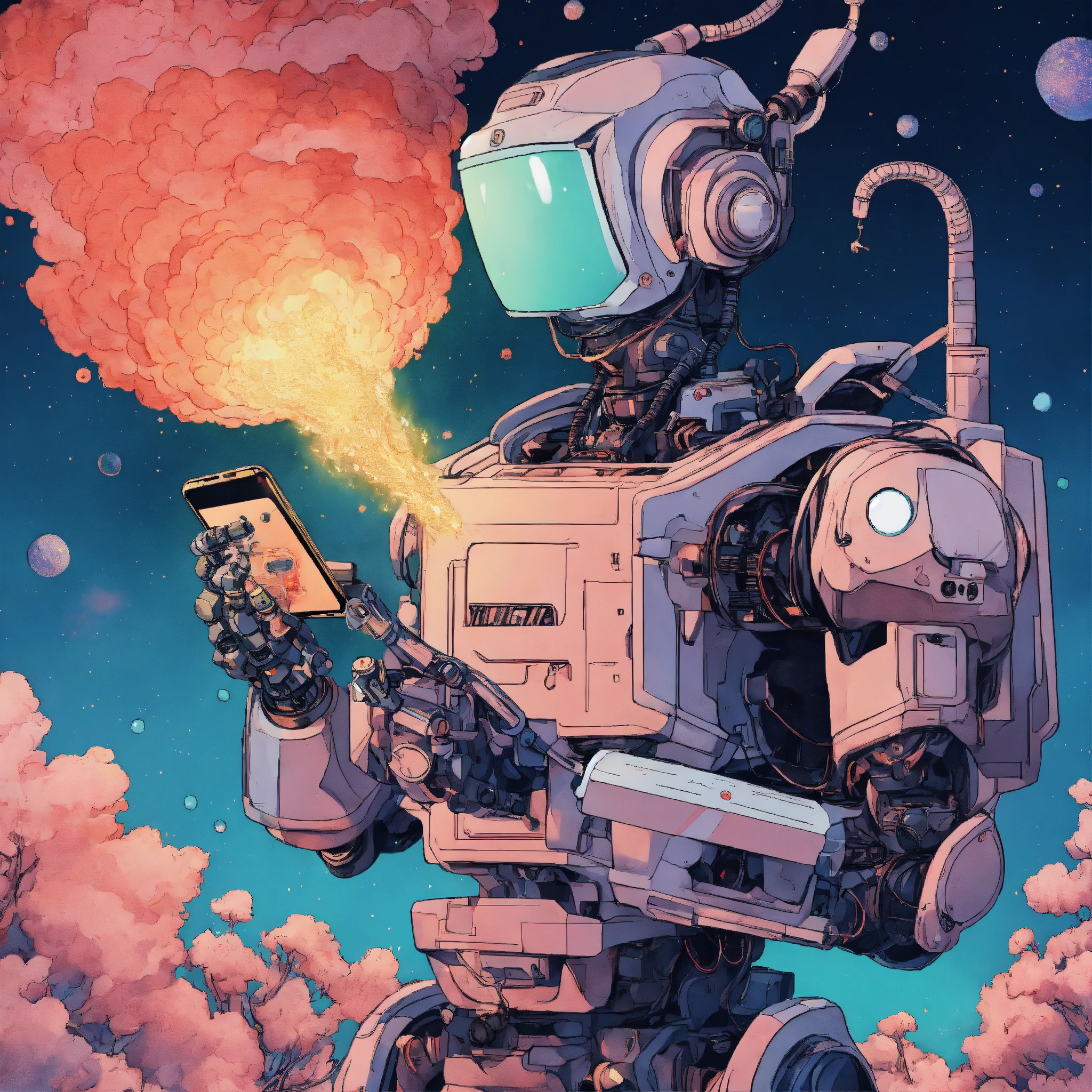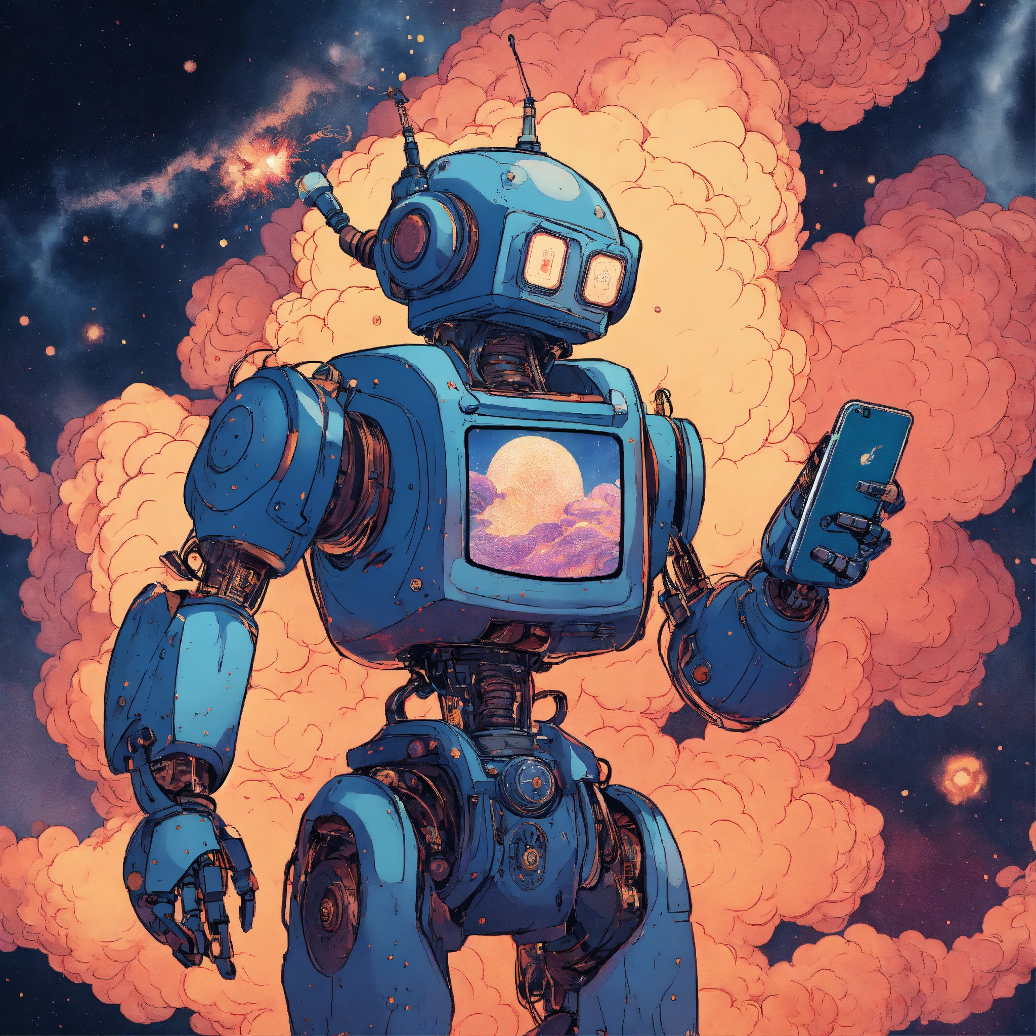 Robot holding smartphone in hand, style of 90's vintage anime, hokusai style, human like face, surrealism, akira style, detailed line art, fine details, inside an exploding nebula