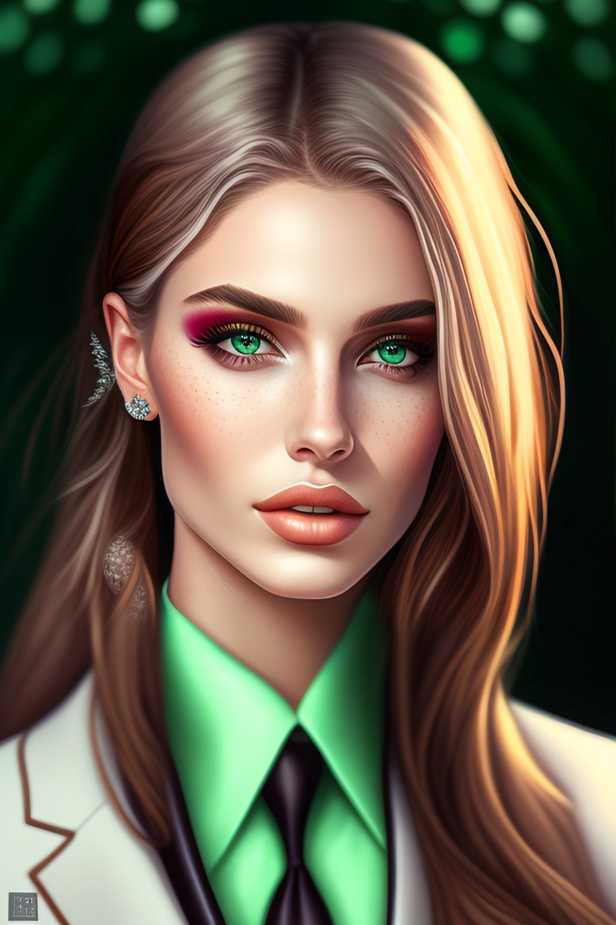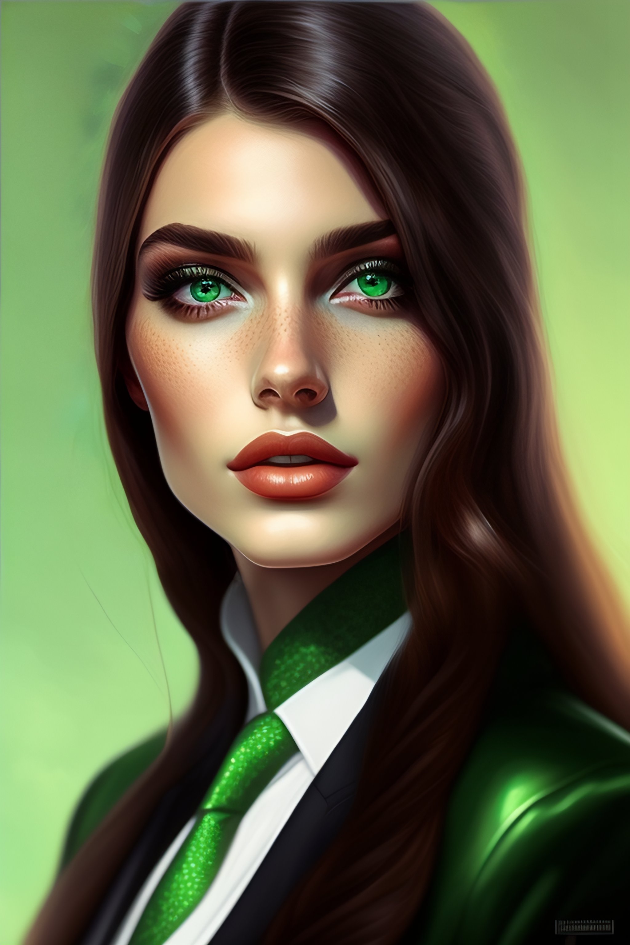Hungarian, e-girl, aesthetic, medium length straight hair, brown hair, light green eyes, black and white fitted suit, beautiful eyes, beautiful lips, gothic, full body, slim, stylish, freckles, 8k, high detail, highly detailed, digital painting, digital art