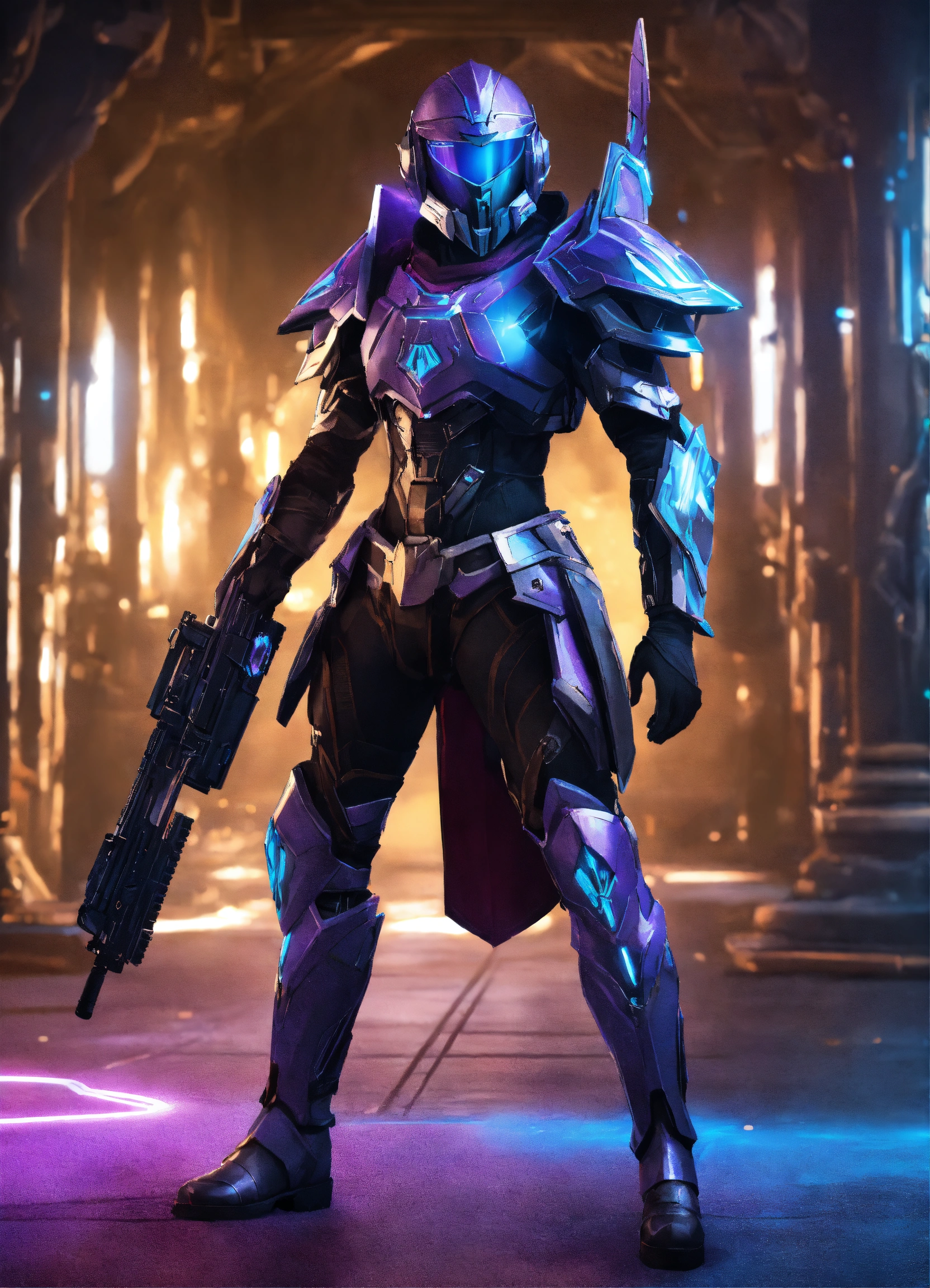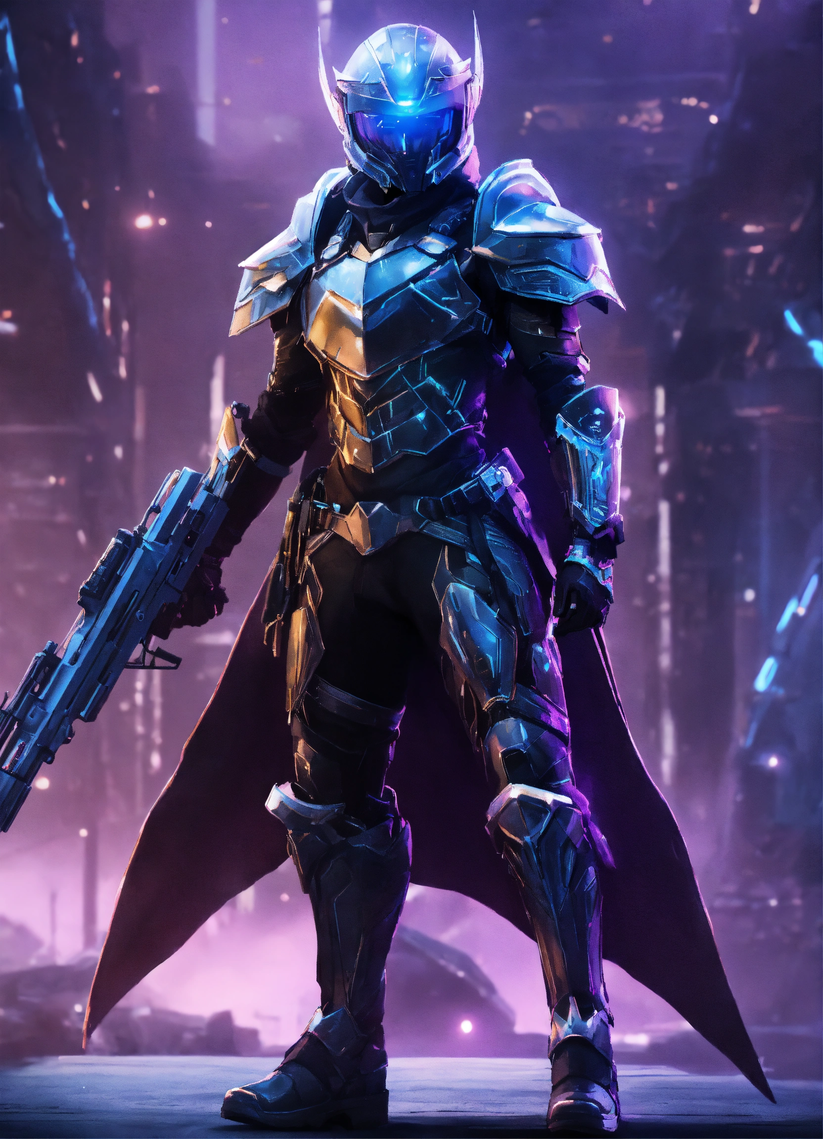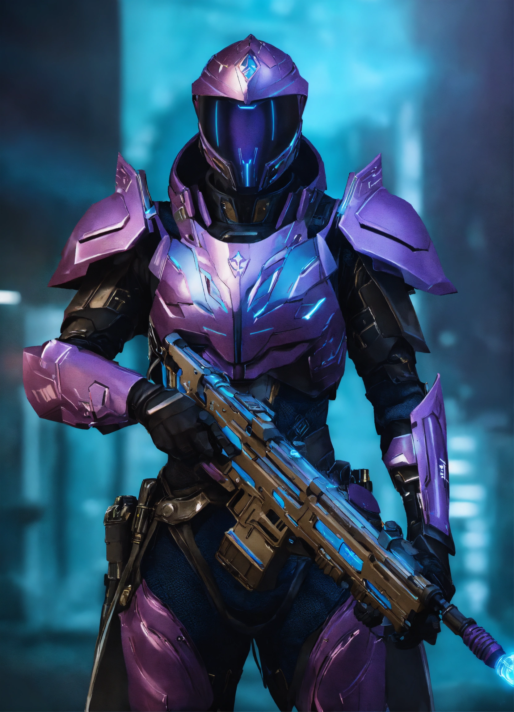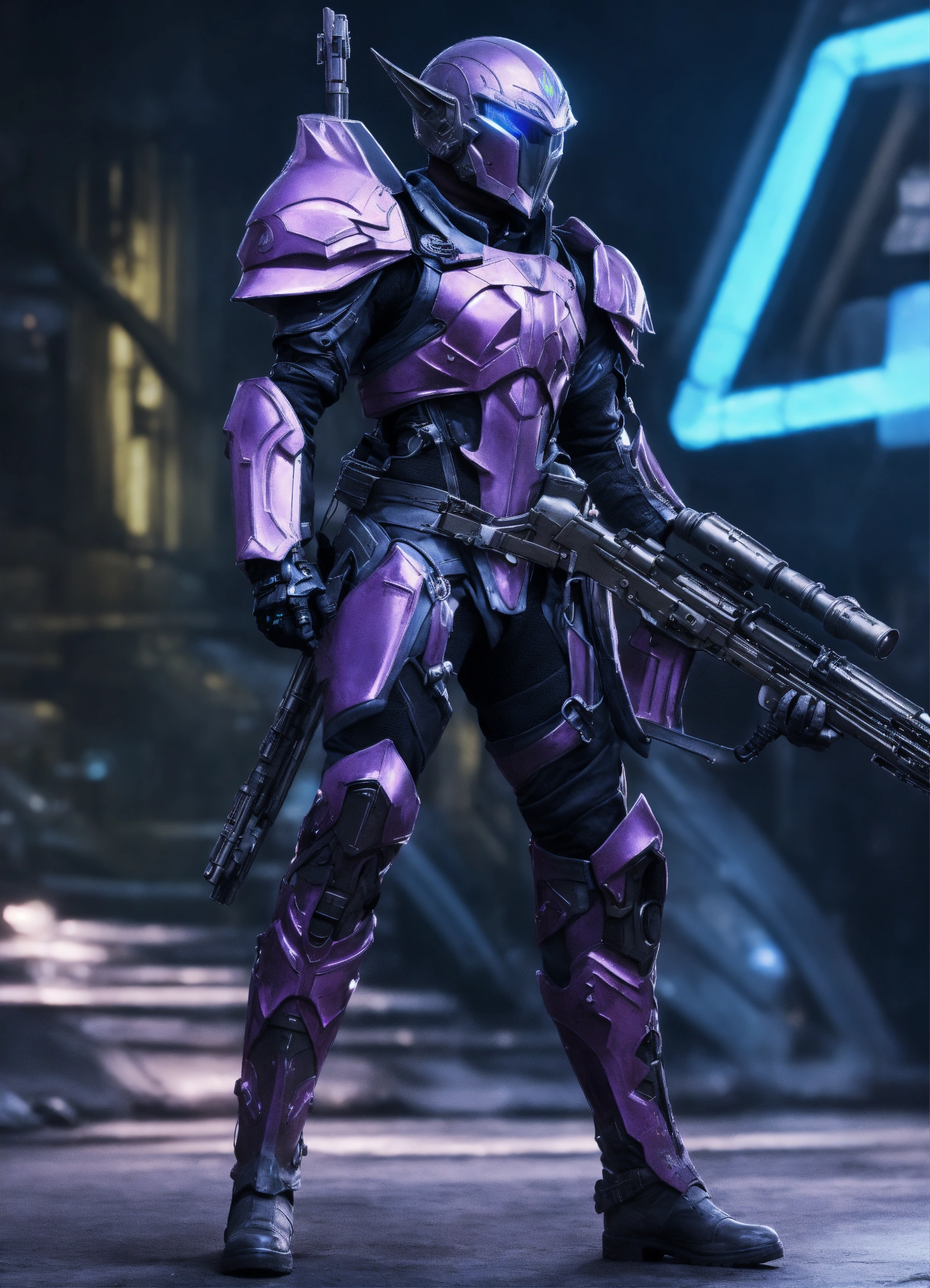 Full body of a high elf sci fi soldier wearing heavy sci fi elven armor, cybernetic black and purple and light blue armor and helmet, boots, male, holding a light machine gun, full body, hd