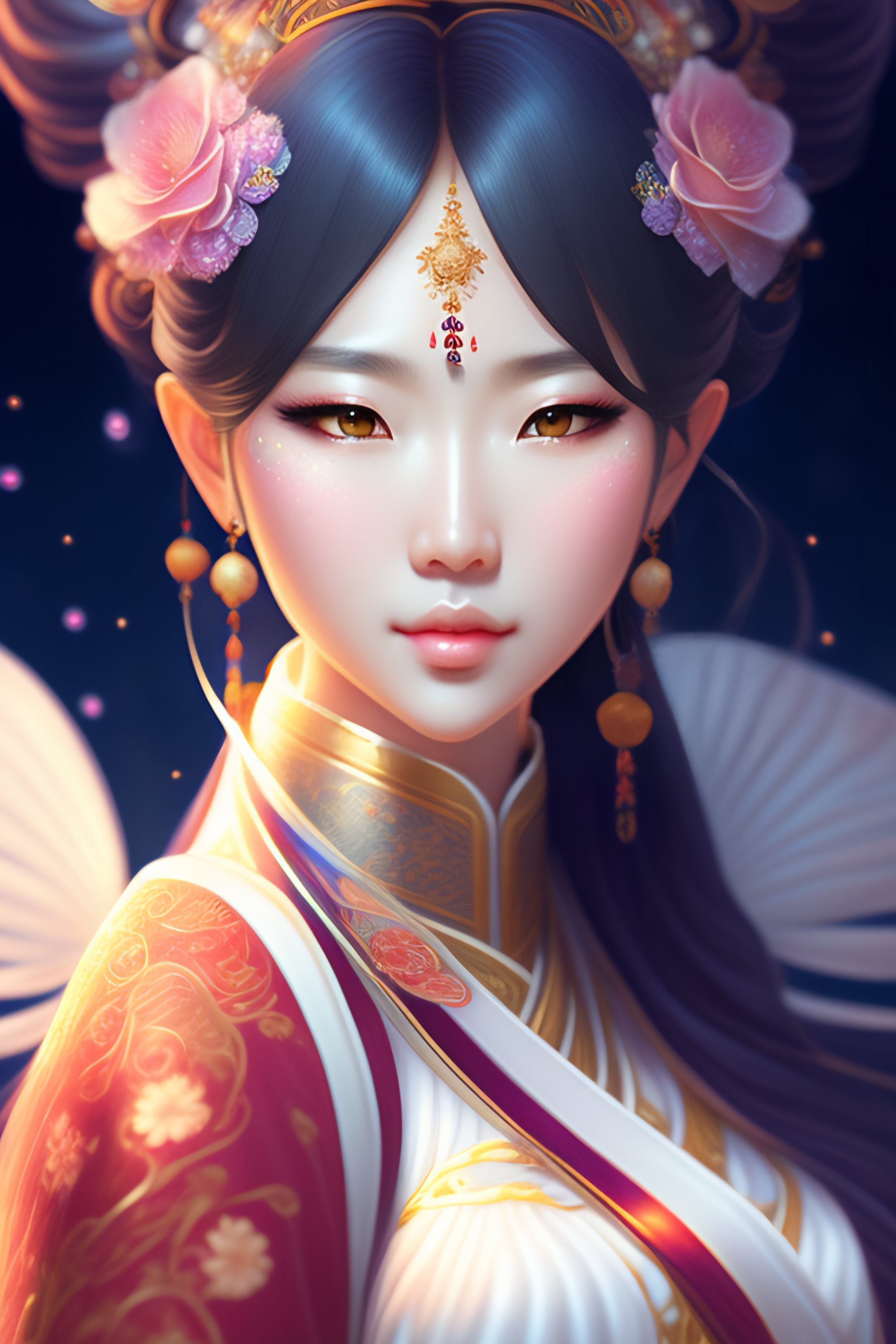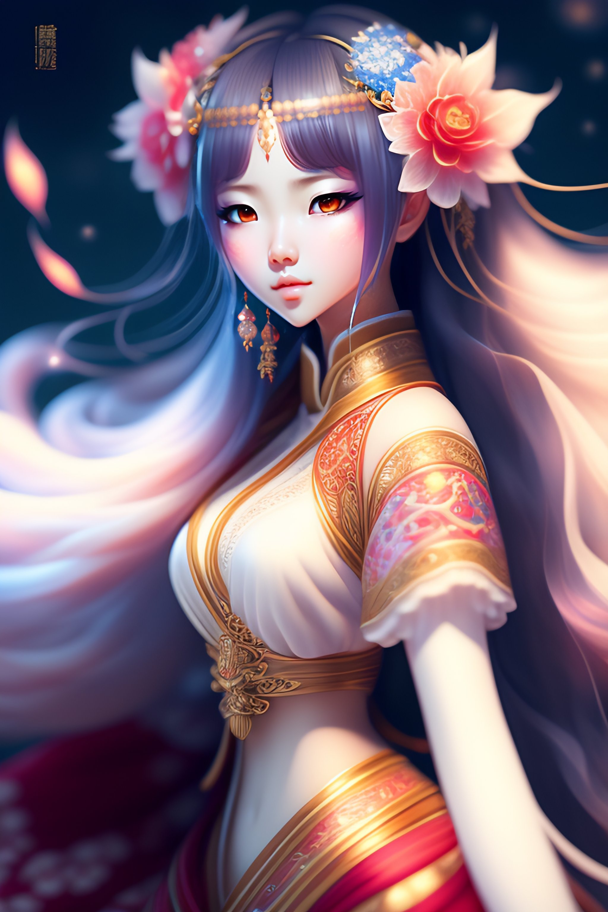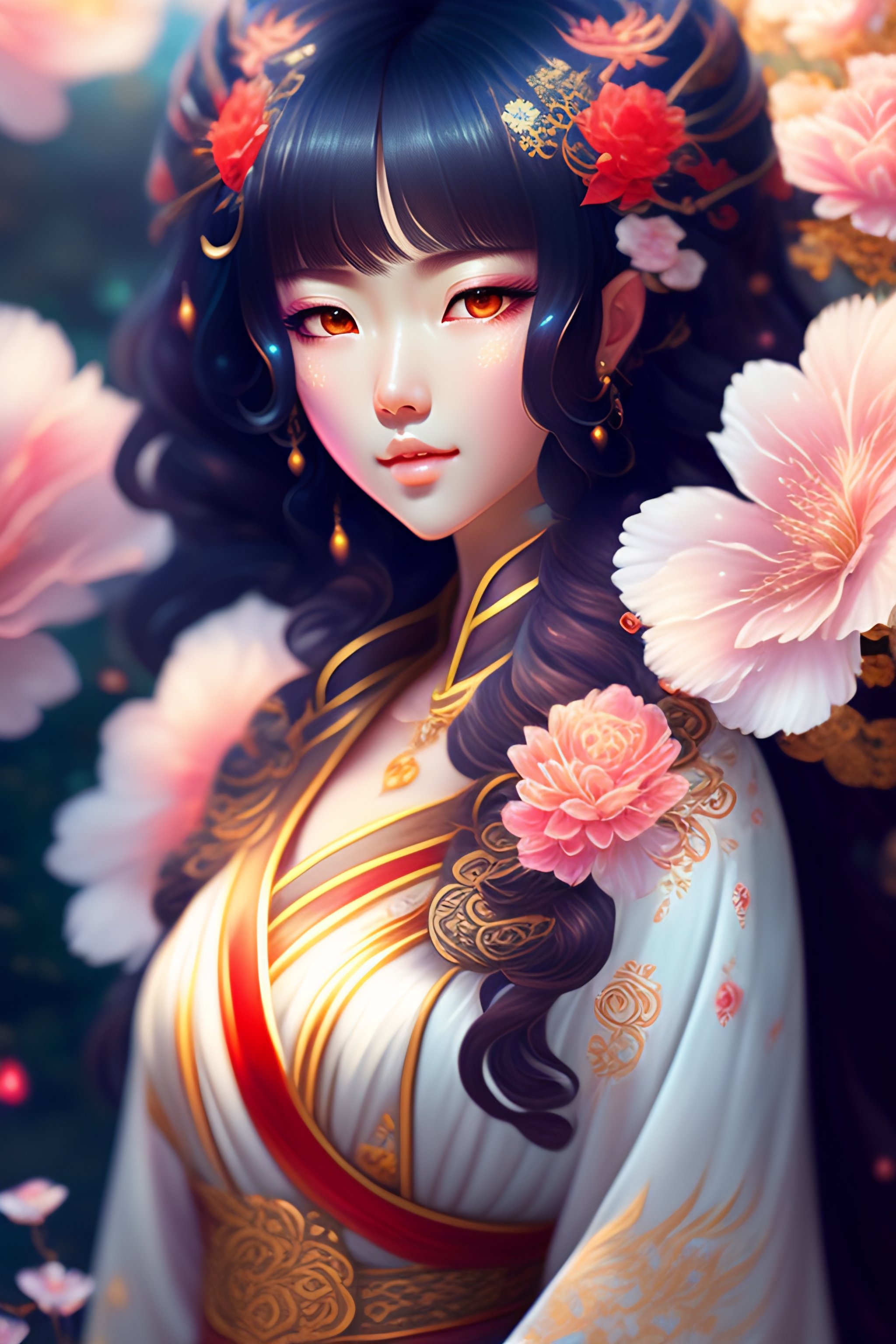 Illustrated beautiful portrait cute anime japanese ninfa with red kimono, beautiful intricately detailed, organic filigree, big curly hair, white blue colors by victo gnai, luminescence white light, volumetric lighting, dynamic lighting, digital art, esthetically art by by huang guangjian, fenghua zhong, ran jia, xin jin and wei chang.