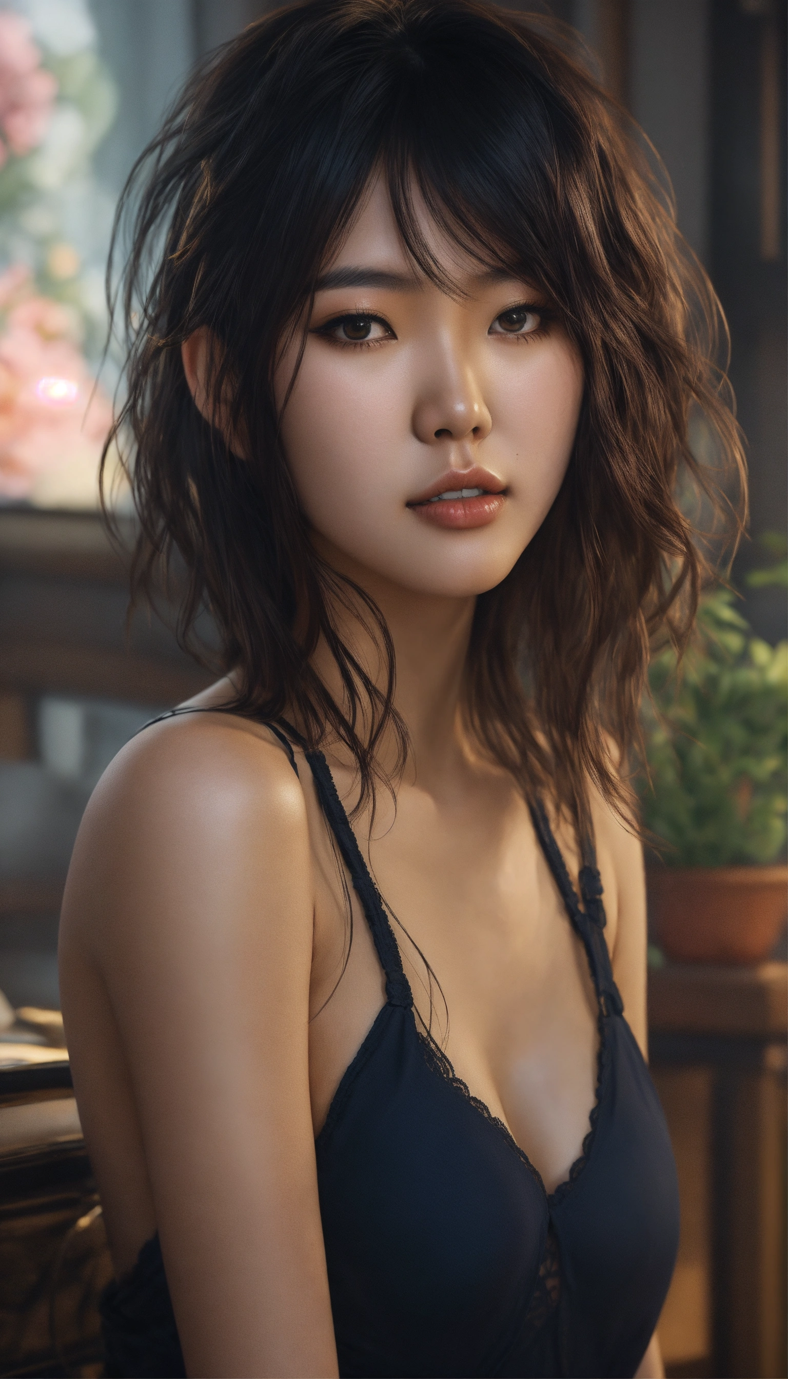 A beautiful asian girl, soft skin, messy hair, thin legs, black bra, monet range murata artgerm katsuhiro otomo, highly detailed intricately sharp focus, bedroom eyes trending on pinterest vogue italia unreal engine 5, 4 k uhd image