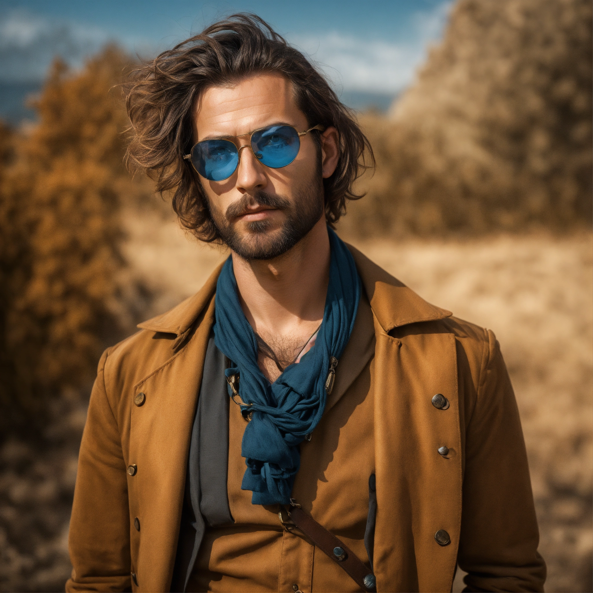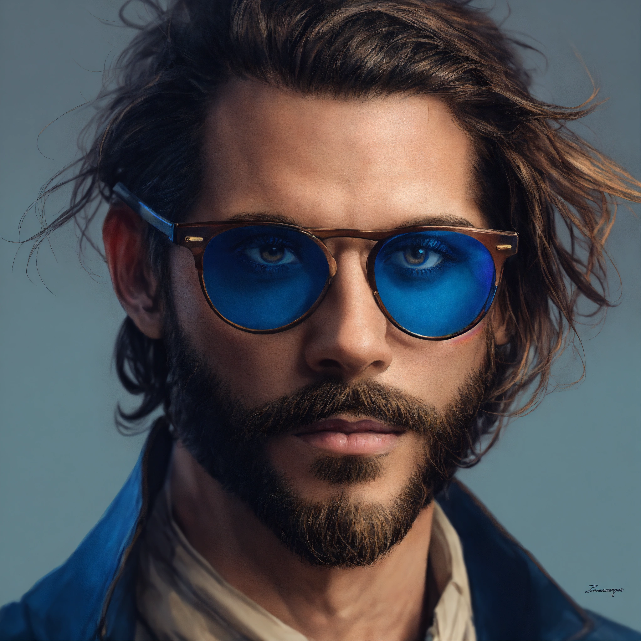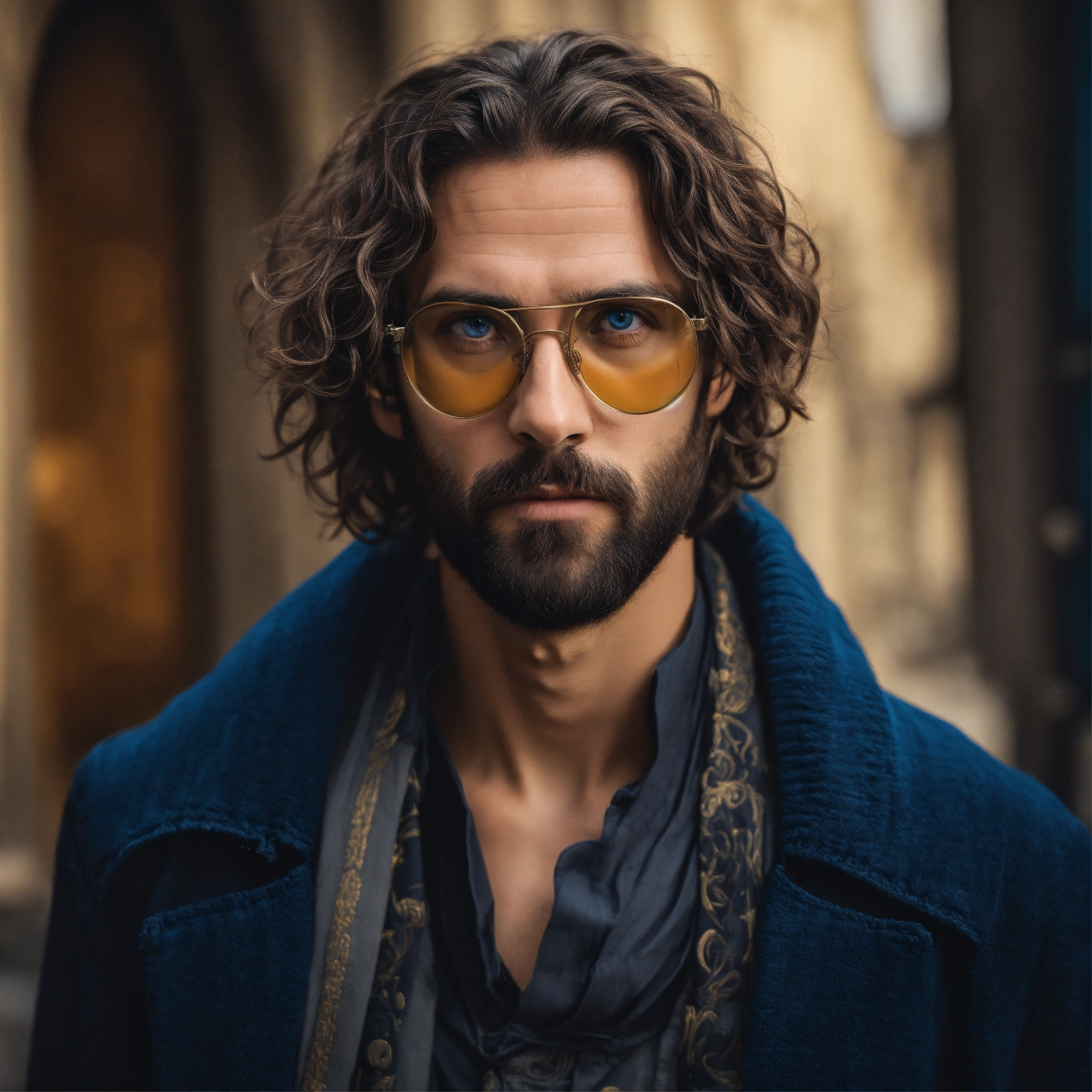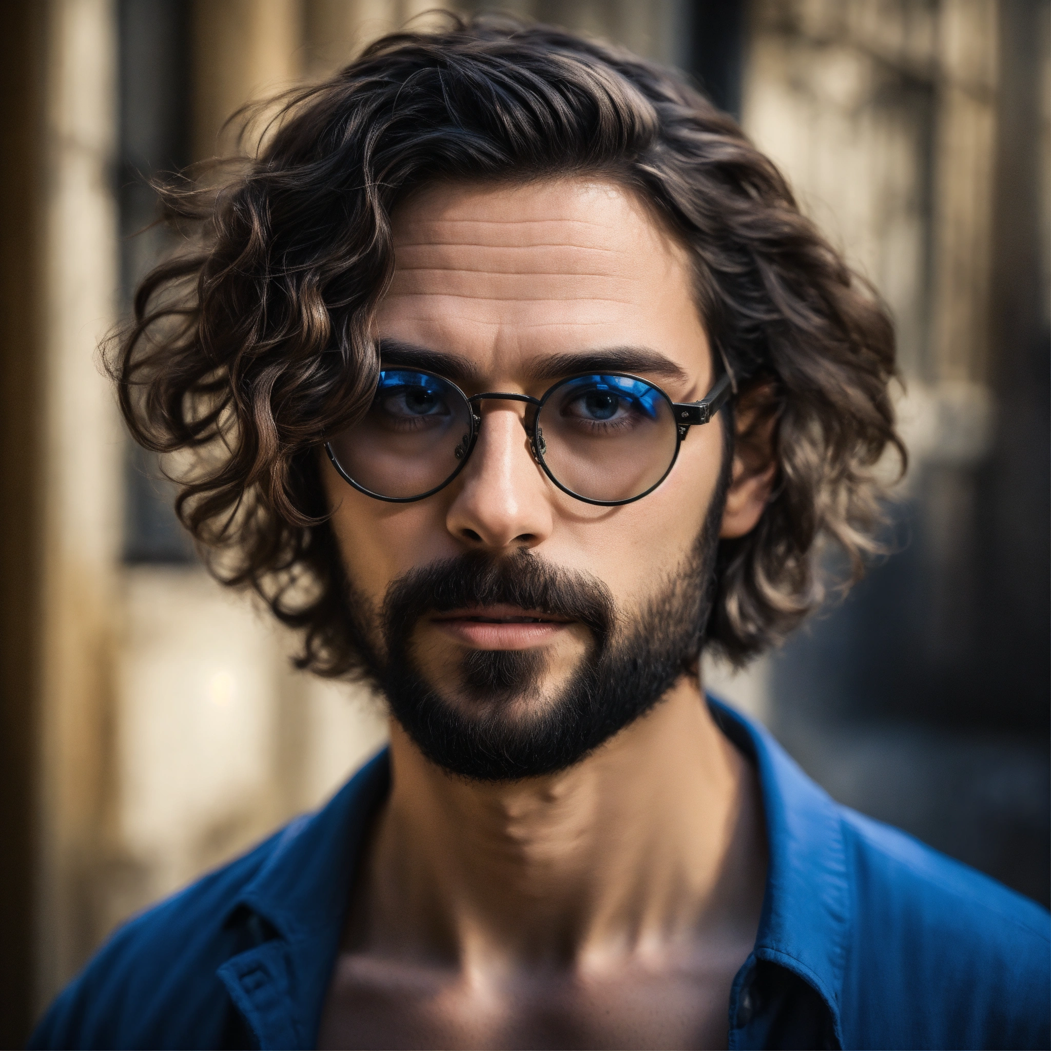 Portrait homme cheveux long chatain, tempes grisonnantes, 42 ans, lunettes, yeux bleus, fantasy style