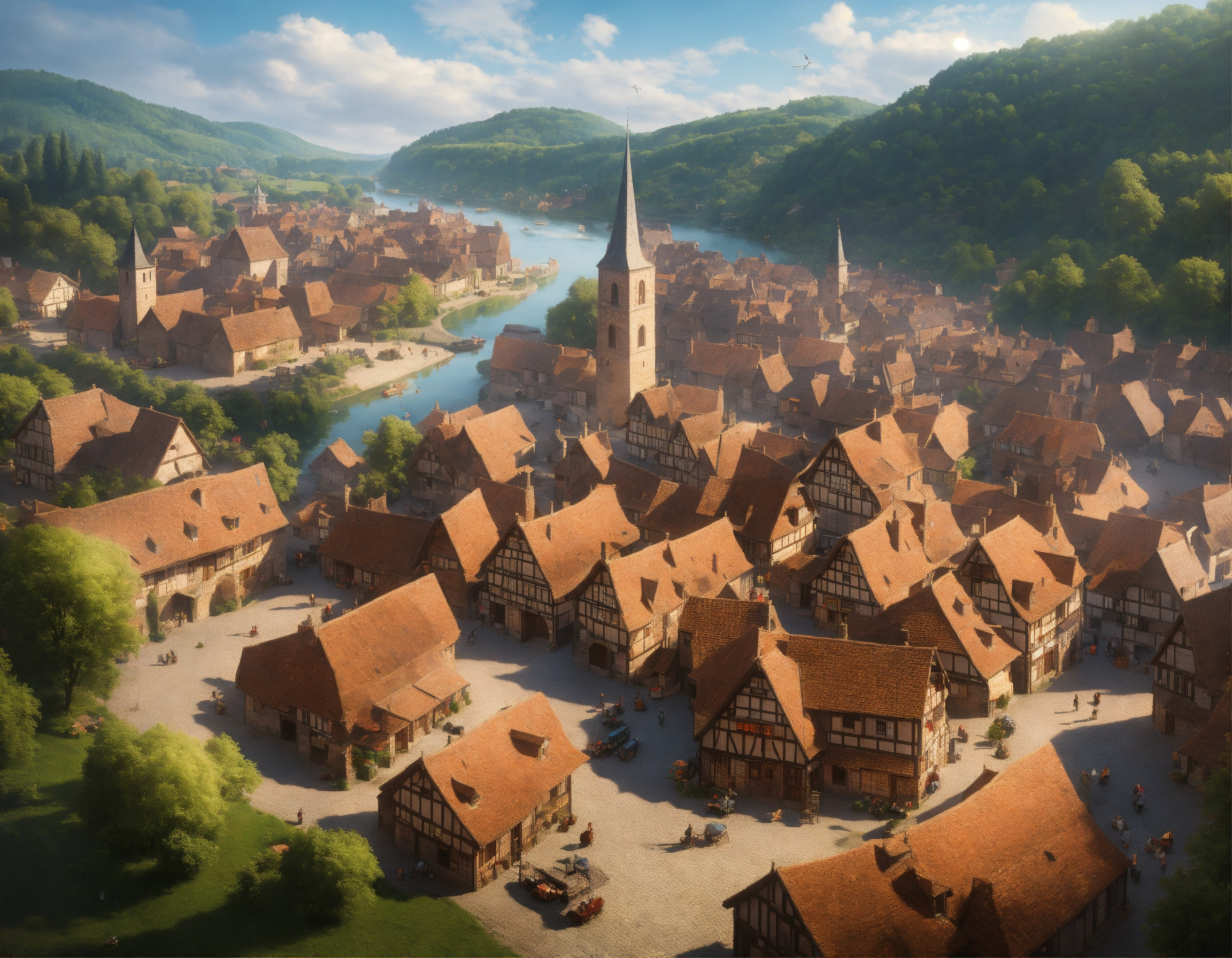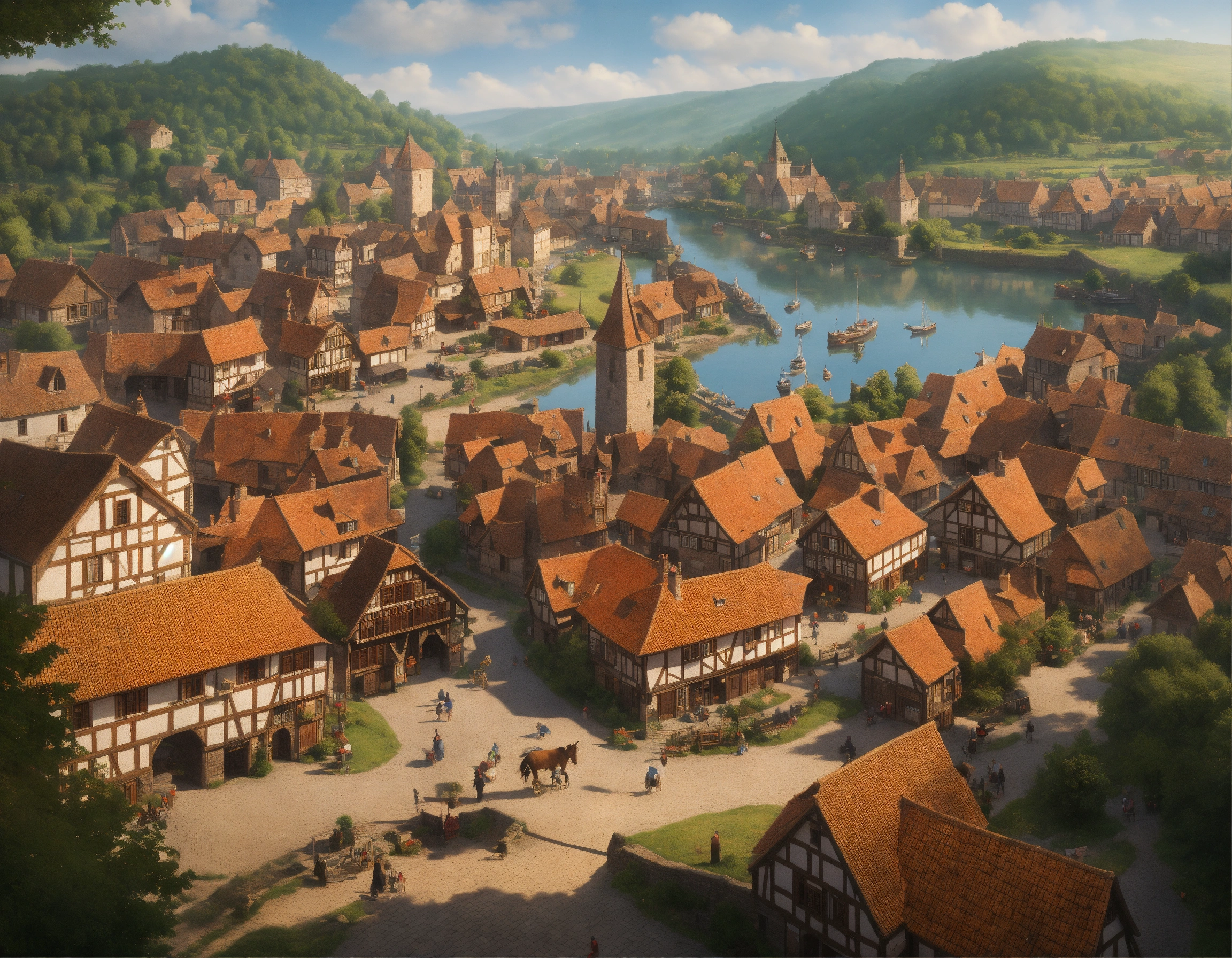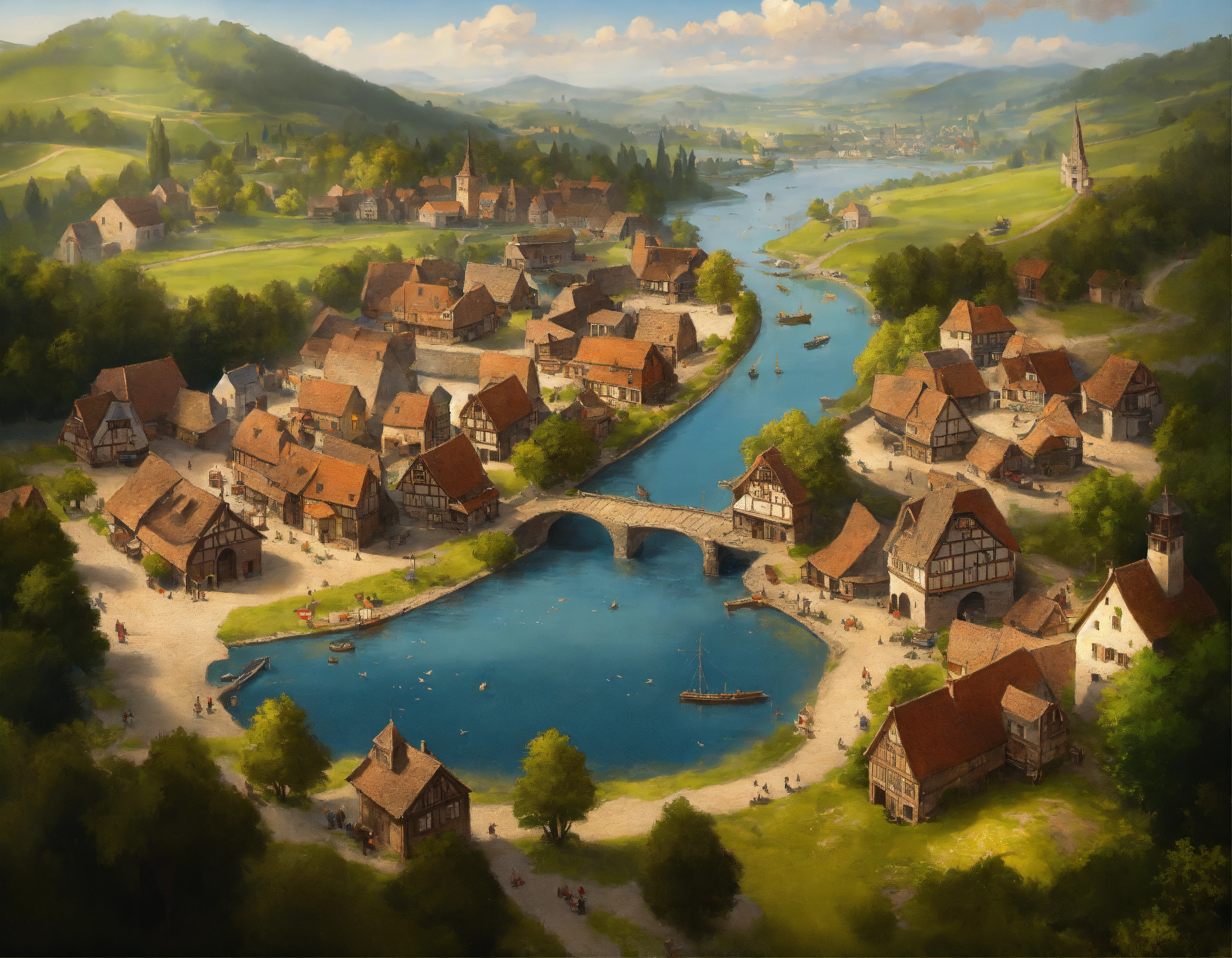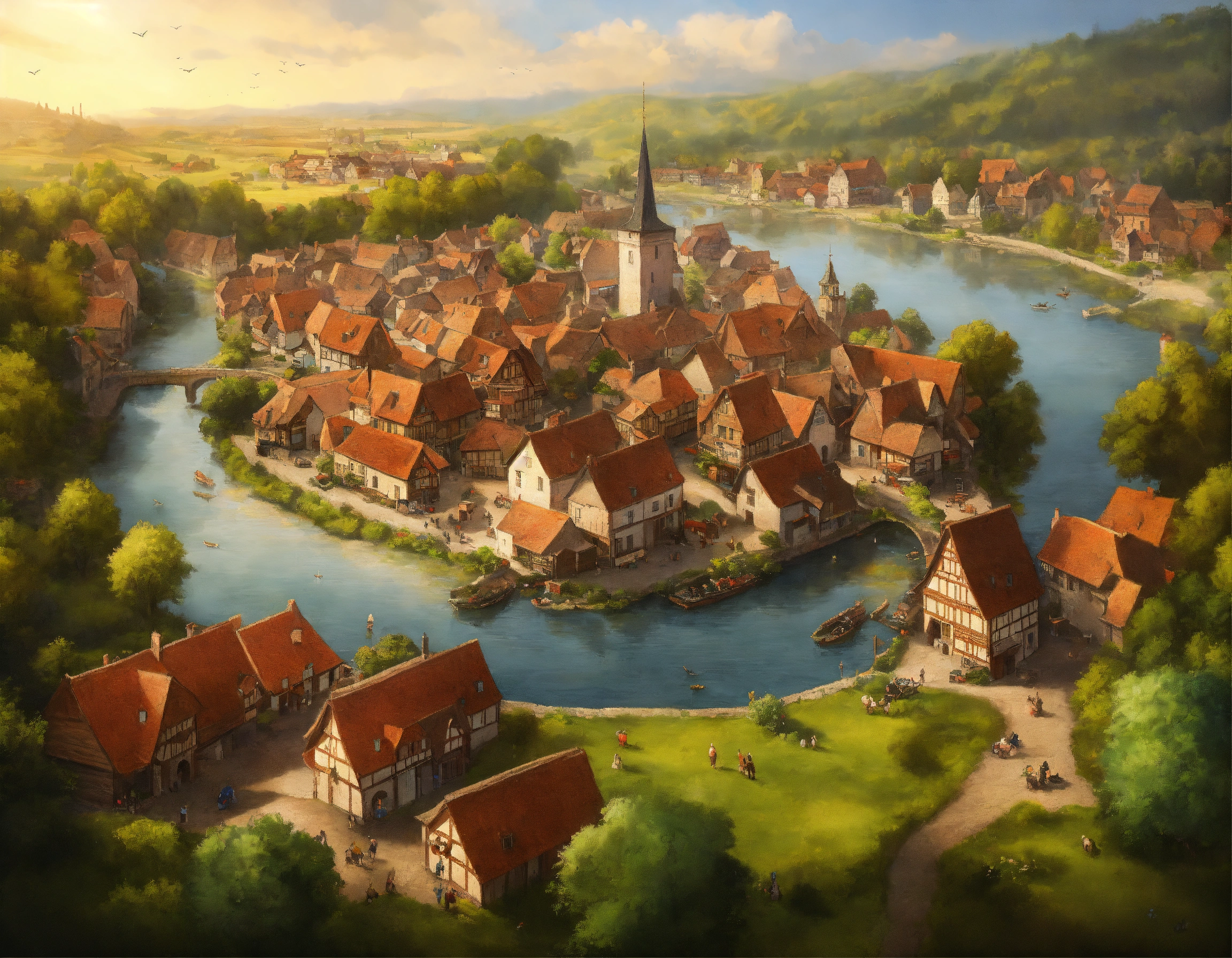 Highly realistic, photography, bird's eye view of a medieval town with 500 inhabitants, one-storey and two-storey wooden houses, half-timbered houses and a few stone houses, no dense building, large open market square in the town center, fortified small jetty with drift, in front of the town runs a small river, a trade route runs through the town, individual farms and homesteads lie around the town, densely wooded rolling hills behind the town, highly detailed, oil painting, ornamented, in the style of nicolas poussin, sharp contours, detailed, morning light, 8k, fantasy