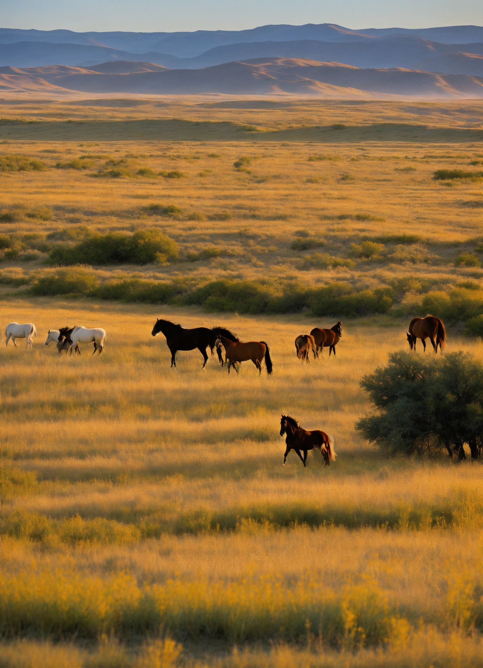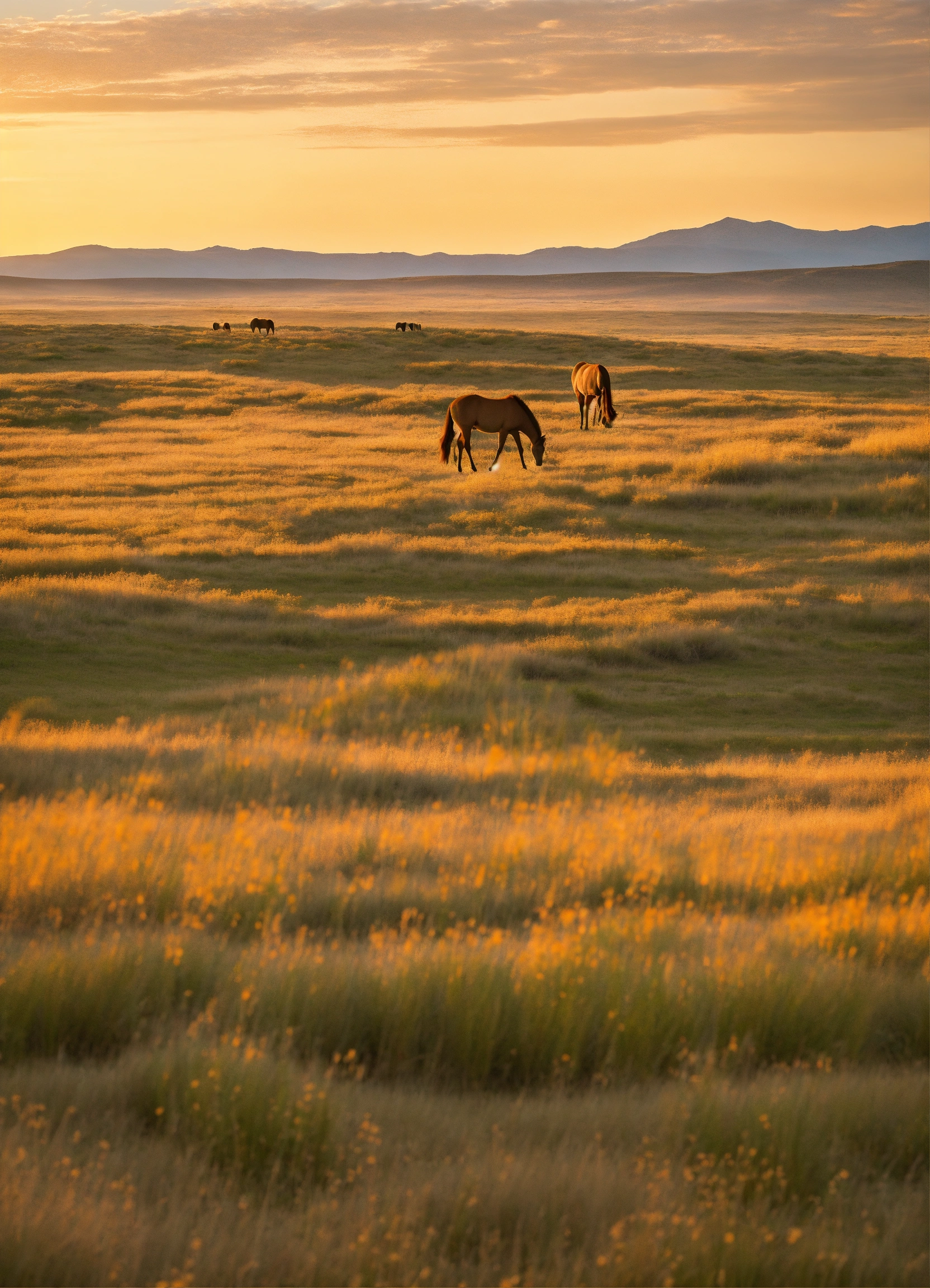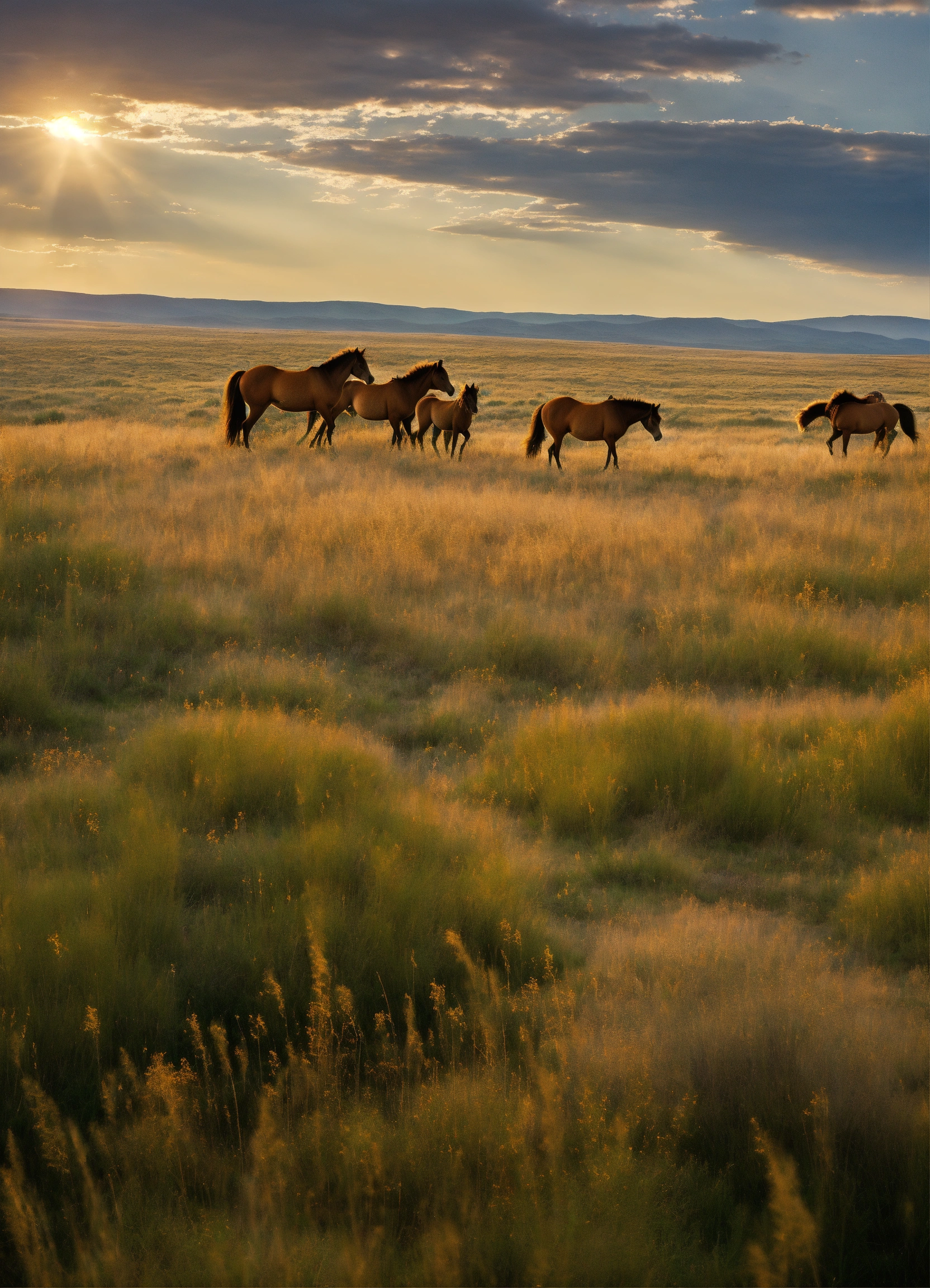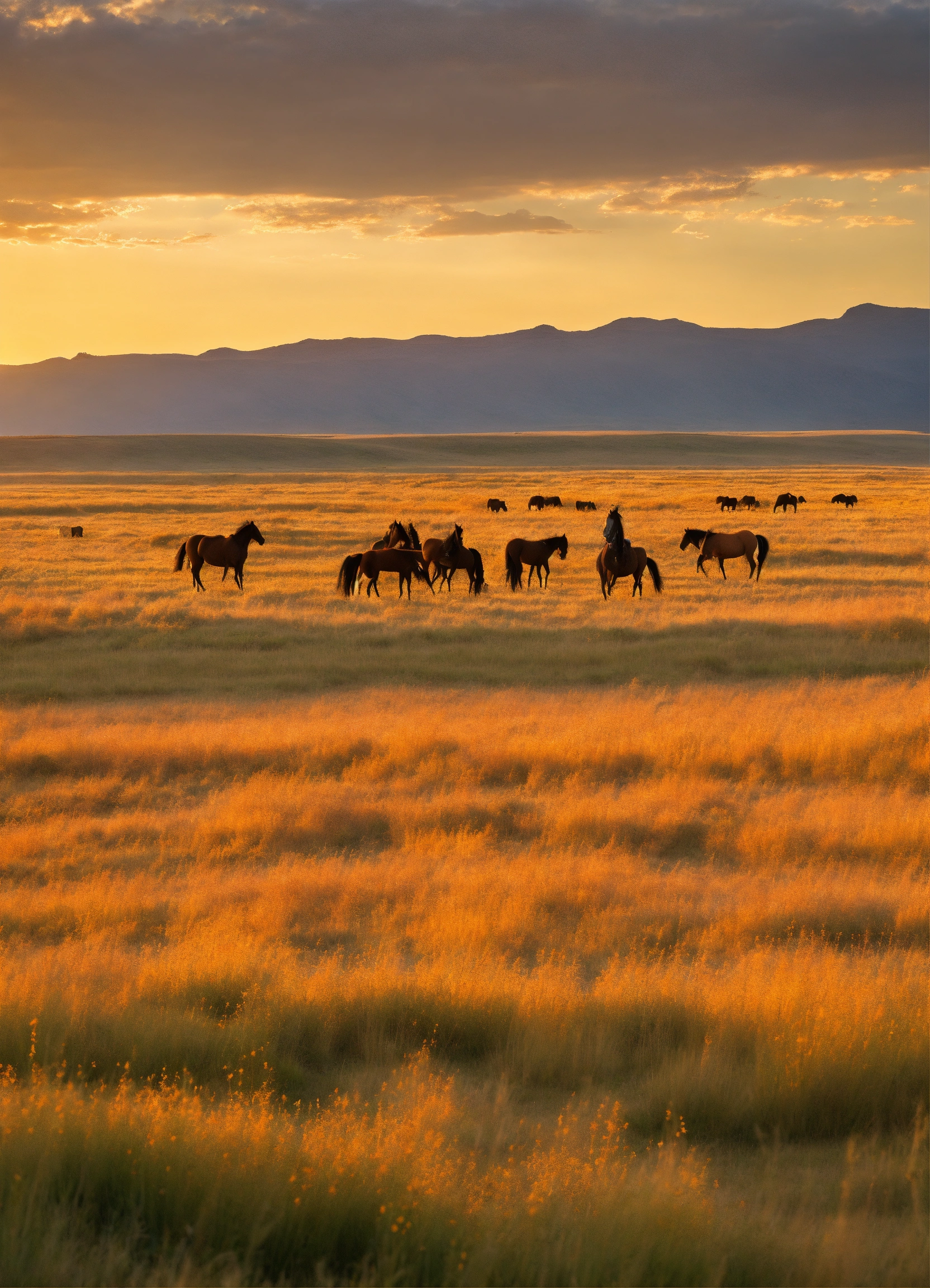 Craft an image of an expansive, rolling prairie, where the golden grasses sway in the breeze, and herds of wild mustangs roam freely beneath an endless, open sky.