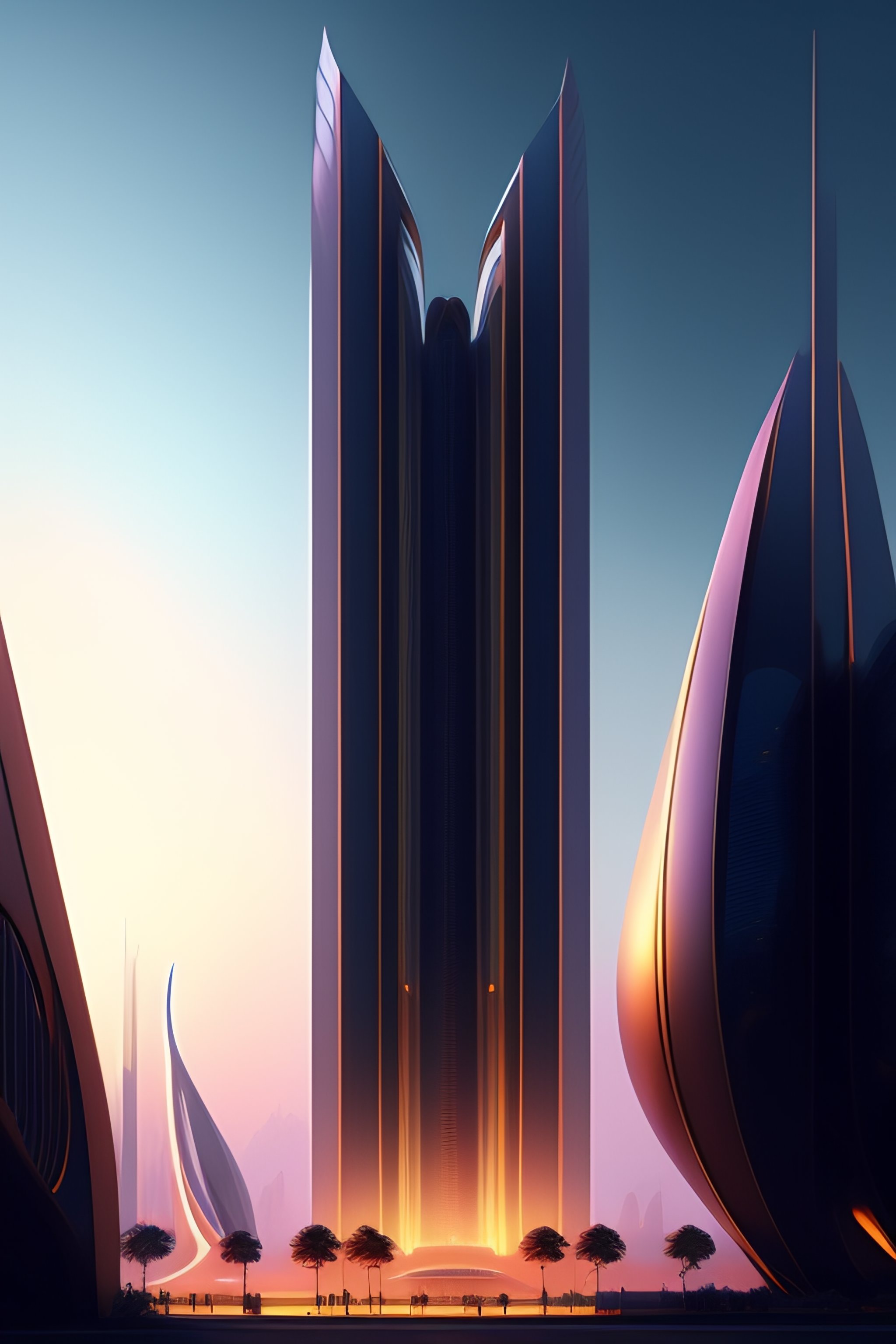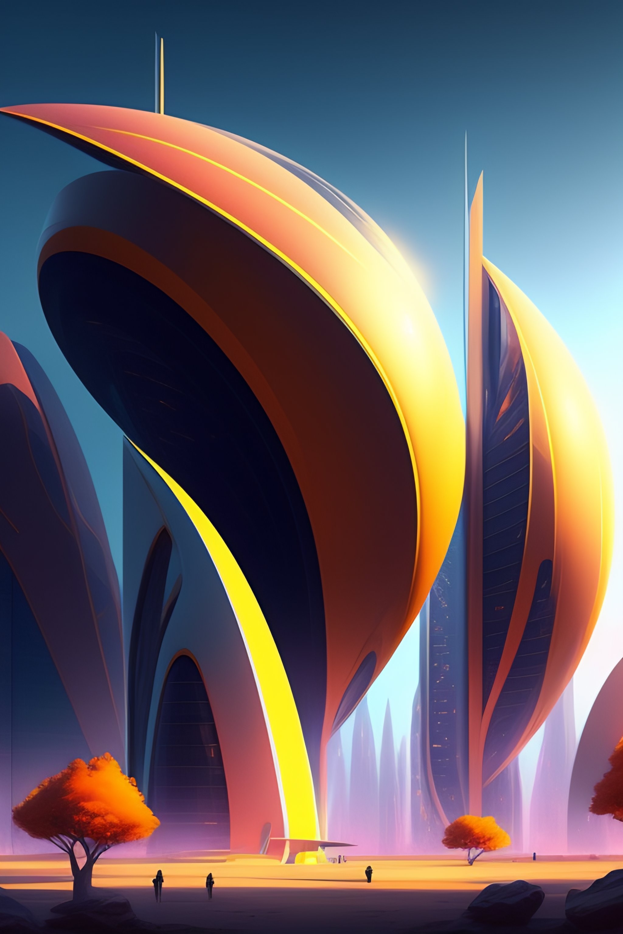 Tall, futuristic buildings with bold design and clean lines, realistic, cinematic, disney concept artists landscape style